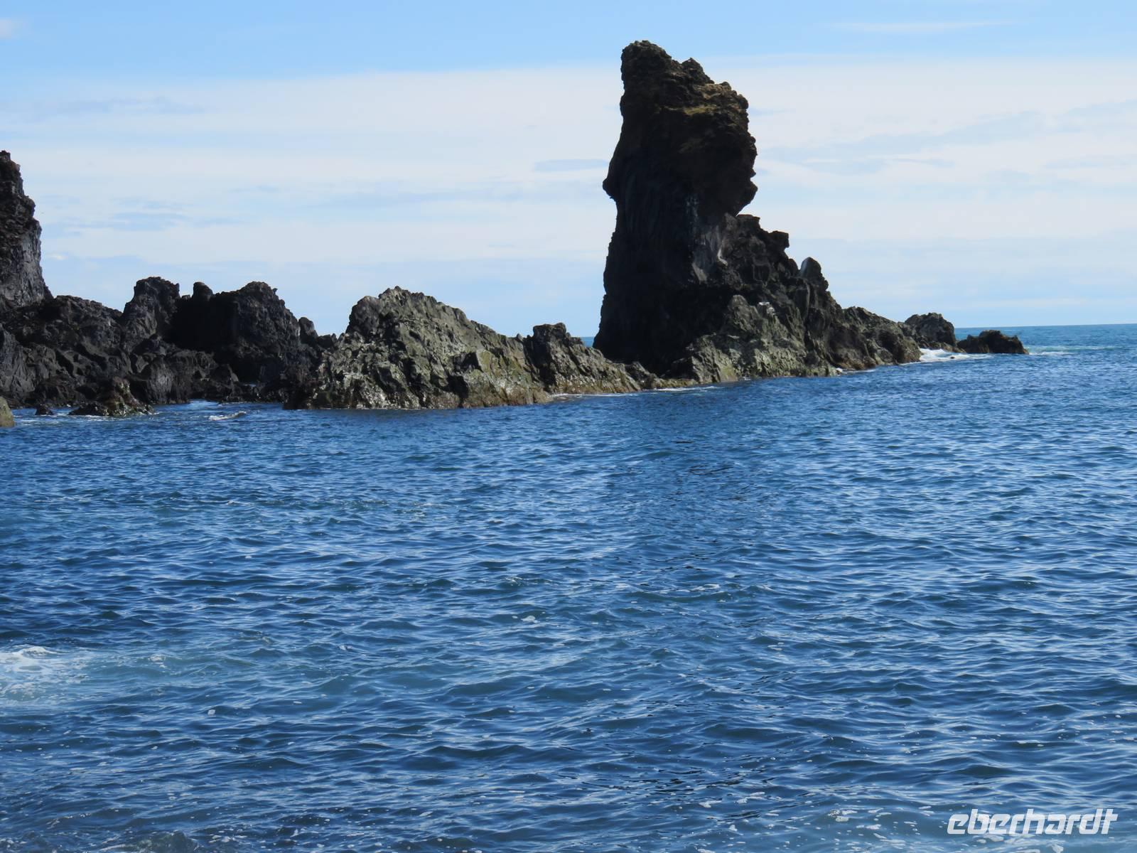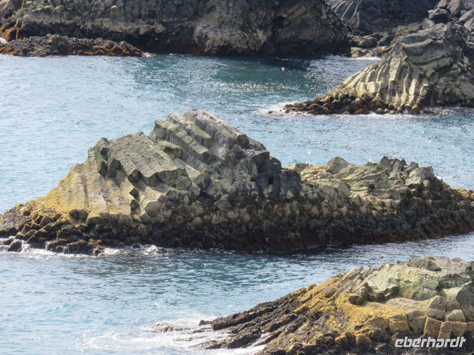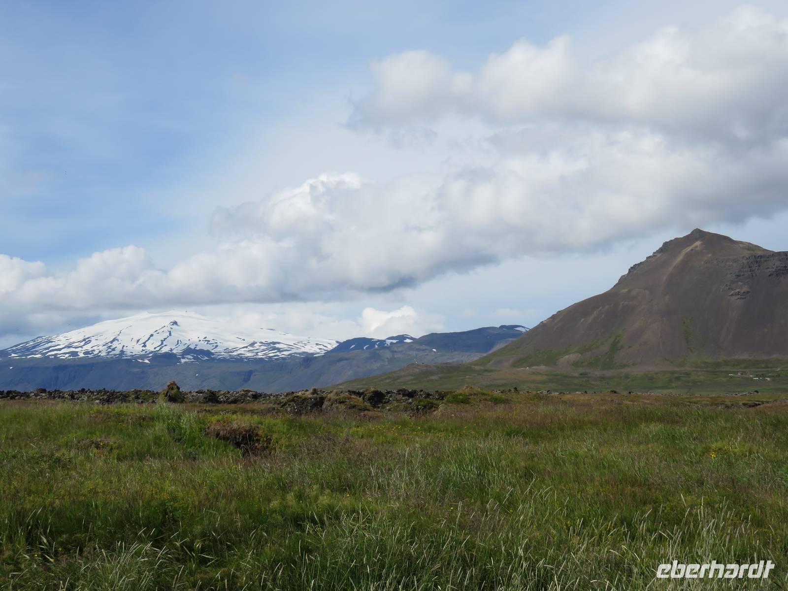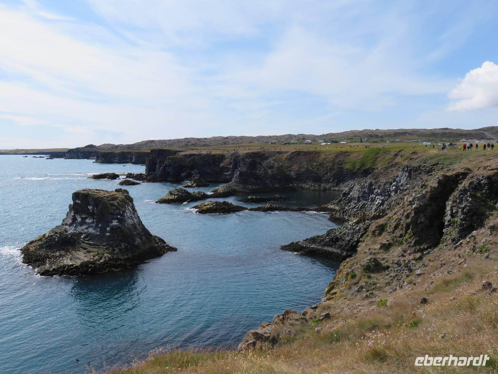 Am Morgen verließen wir Reykjavík. Zunächst kauften wir uns für die Mittagspause alle etwas in einer Bäckerei. Danach setzten wir unsere Tour nach Borgarnes fort. Die Fahrt führte uns durch die wunderschöne Landschaft auf die Halbinsel Snaefellsnes. Nach einem weiteren kurzen Stopp, erreichten wir eine kleine Kirche. Von hier eröffnete sich uns ein herrlicher Blick auf den vergletscherten Vulkan Snaefellsjökull, der der Halbinsel seinen Namen gab. Snaefellsjökull bedeutet so viel wie Schneeberg. Wir unternahmen einen kleinen Spaziergang zum Strand und sahen die erstarrten Lavaformationen. Es ging weiter nach Arnastapi an der Steilküste im Süden der Halbinsel. Wir wanderten am Rand der Steilküste entlang und waren beeindruckt von den einzigartigen verschiedensten Vulkangesteinsformen, die wir entdecken konnten. Basaltsäulen ragten in verschiedenen Varianten aus dem Meer oder bildeten die Steilküste. Lavaformationen waren zu erkennen, wie sie sich einst ihren Weg ins Meer gebahnt hatten. Das Meer hatte riesige Löcher in die Küste gearbeitet an deren Wänden Möwen nisteten. Bei schönstem Sonnenschein genossen wir die Aussicht. Nach einer ausgiebigen Pause setzten wir unsere Fahrt fort. Bei Dritvik Djupalonssandur unternahmen wir nochmals eine kleine Wanderung hinunter zum Meer. Einige probierten sich an den Kraftsteinen, mit denen in früheren Zeiten die Männer ihre Kräfte maßen. Am Strand lagen noch Teile eines Schiffswraks, welches 1948 hier strandete. Auch hier sahen wir, mit welchen Kräften das Wasser die Gesteinsformationen formte und bis heute formt. Auf dem Rückweg entdeckenden wir sogar noch versteinerte Trolle. Wir sahen einen Troll, einen Bär und einen Hund. Nun legten wir unsere letzte Etappe bis zum kleinen Ort Stykkisholmur. Wir erreichten unser Hotel und nach einem schmackhaften Abendessen, erkundeten wir den kleinen Ort. Wir sahen die moderne Kirche, welche erst im Jahr 1990 erbaut wurde, den Hafen und einige erklommen den Felsen mit dem Leuchtturm. Ihnen eröffnete sich eine fantastische Sicht auf den Ort und zu den Vulkanen.