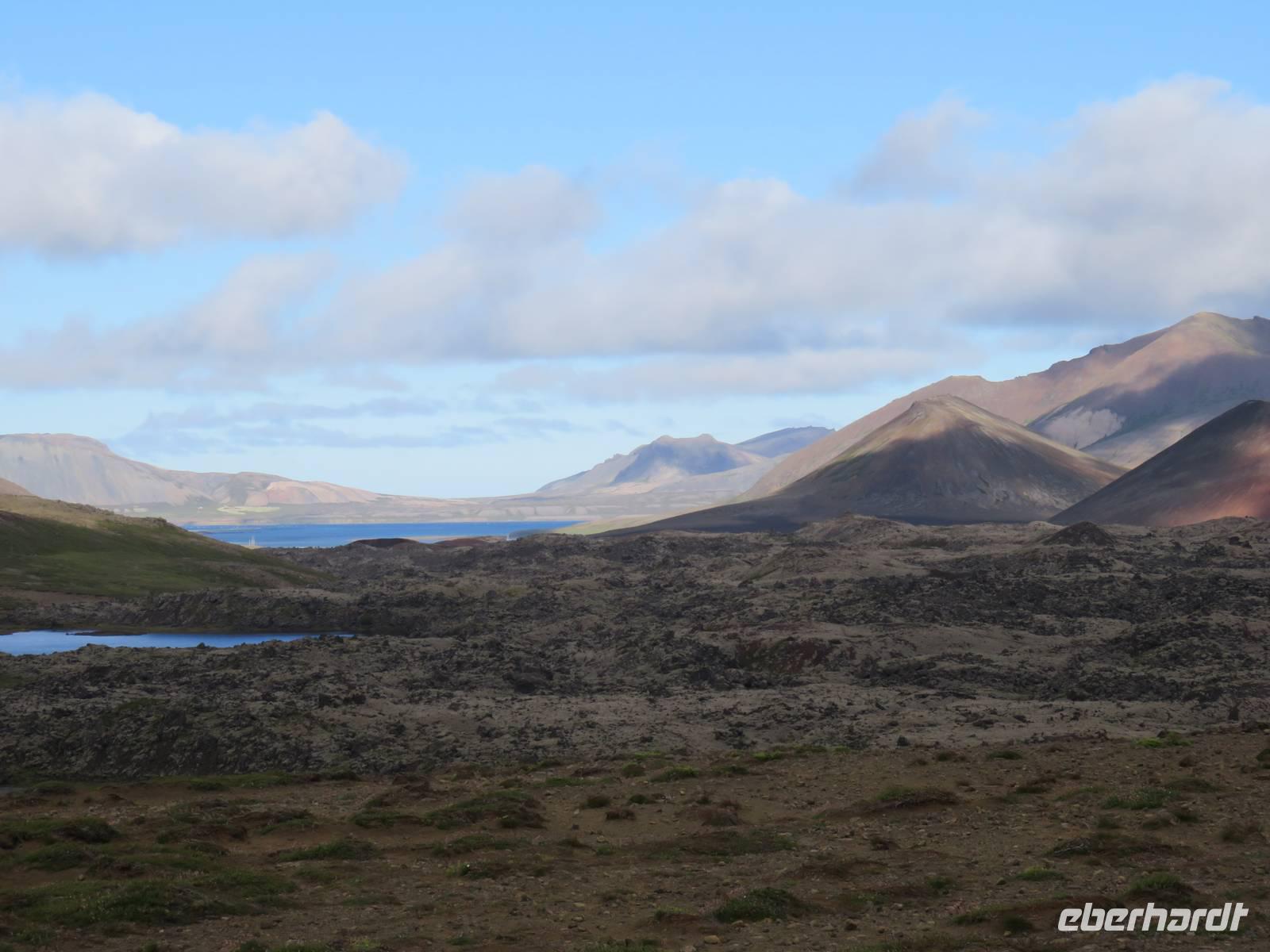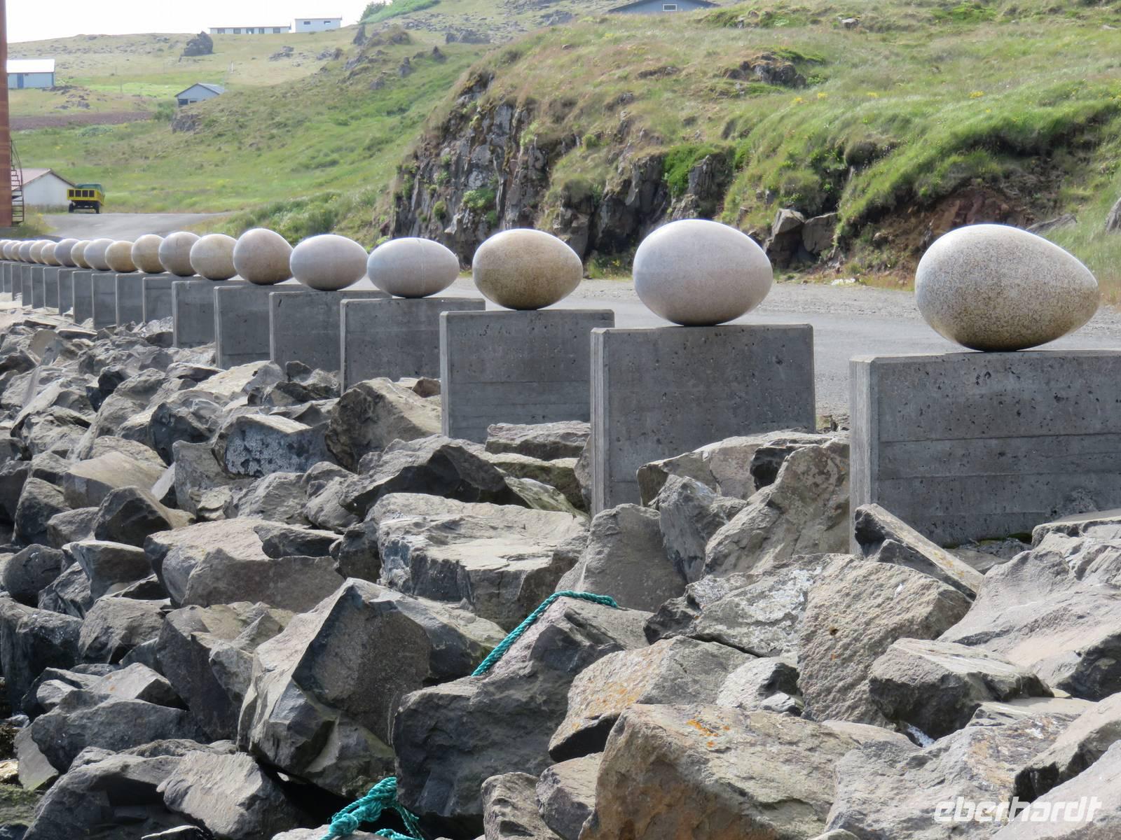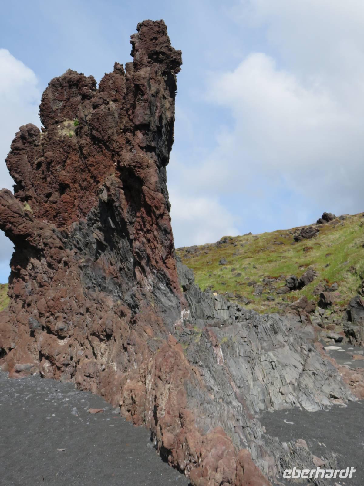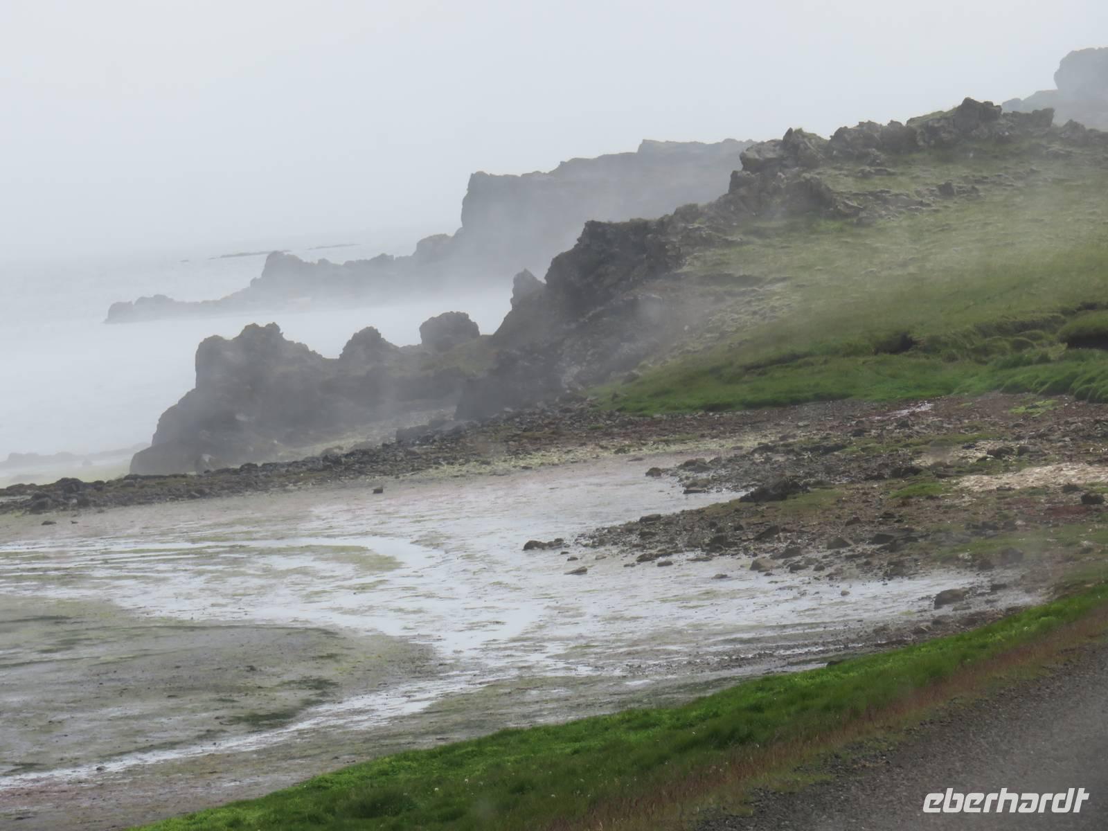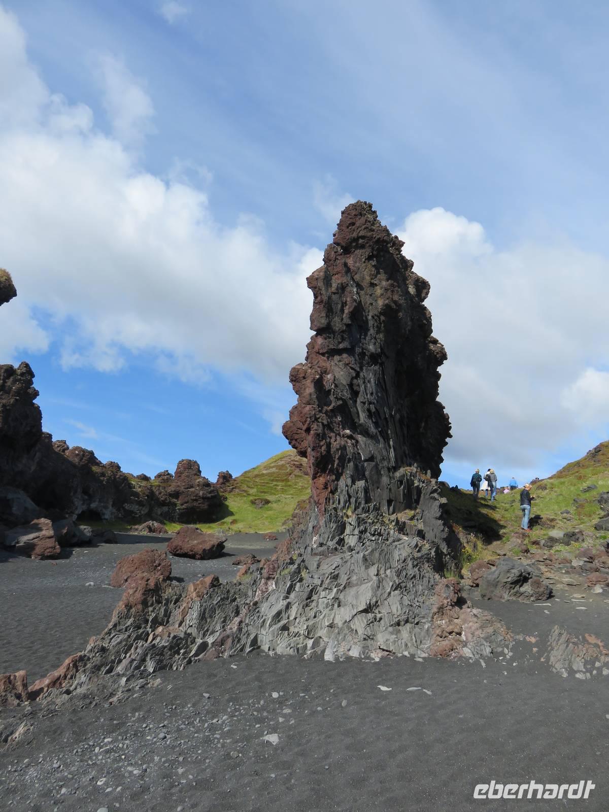 Am Morgen verließen wir Reykjavík. Zunächst kauften wir uns für die Mittagspause alle etwas in einer Bäckerei. Danach setzten wir unsere Tour nach Borgarnes fort. Die Fahrt führte uns durch die wunderschöne Landschaft auf die Halbinsel Snaefellsnes. Nach einem weiteren kurzen Stopp, erreichten wir eine kleine Kirche. Von hier eröffnete sich uns ein herrlicher Blick auf den vergletscherten Vulkan Snaefellsjökull, der der Halbinsel seinen Namen gab. Snaefellsjökull bedeutet so viel wie Schneeberg. Wir unternahmen einen kleinen Spaziergang zum Strand und sahen die erstarrten Lavaformationen. Es ging weiter nach Arnastapi an der Steilküste im Süden der Halbinsel. Wir wanderten am Rand der Steilküste entlang und waren beeindruckt von den einzigartigen verschiedensten Vulkangesteinsformen, die wir entdecken konnten. Basaltsäulen ragten in verschiedenen Varianten aus dem Meer oder bildeten die Steilküste. Lavaformationen waren zu erkennen, wie sie sich einst ihren Weg ins Meer gebahnt hatten. Das Meer hatte riesige Löcher in die Küste gearbeitet an deren Wänden Möwen nisteten. Bei schönstem Sonnenschein genossen wir die Aussicht. Nach einer ausgiebigen Pause setzten wir unsere Fahrt fort. Bei Dritvik Djupalonssandur unternahmen wir nochmals eine kleine Wanderung hinunter zum Meer. Einige probierten sich an den Kraftsteinen, mit denen in früheren Zeiten die Männer ihre Kräfte maßen. Am Strand lagen noch Teile eines Schiffswraks, welches 1948 hier strandete. Auch hier sahen wir, mit welchen Kräften das Wasser die Gesteinsformationen formte und bis heute formt. Auf dem Rückweg entdeckenden wir sogar noch versteinerte Trolle. Wir sahen einen Troll, einen Bär und einen Hund. Nun legten wir unsere letzte Etappe bis zum kleinen Ort Stykkisholmur. Wir erreichten unser Hotel und nach einem schmackhaften Abendessen, erkundeten wir den kleinen Ort. Wir sahen die moderne Kirche, welche erst im Jahr 1990 erbaut wurde, den Hafen und einige erklommen den Felsen mit dem Leuchtturm. Ihnen eröffnete sich eine fantastische Sicht auf den Ort und zu den Vulkanen.