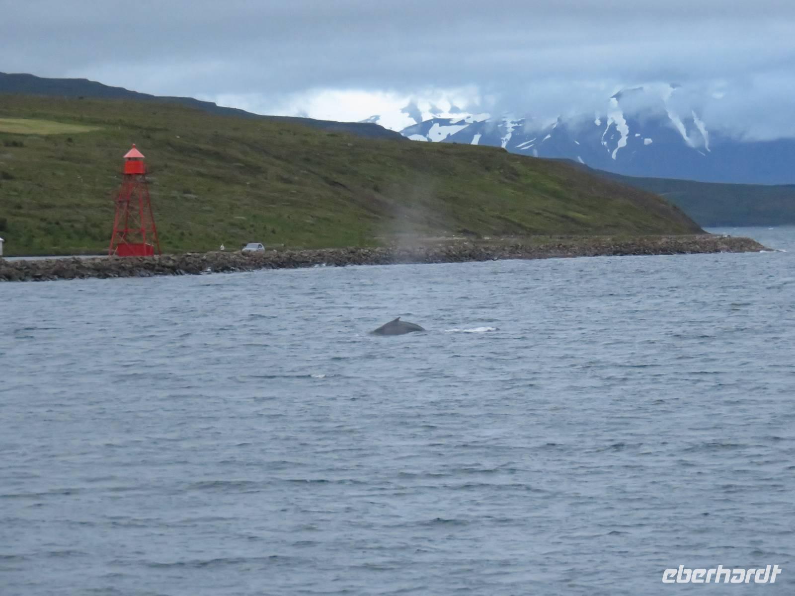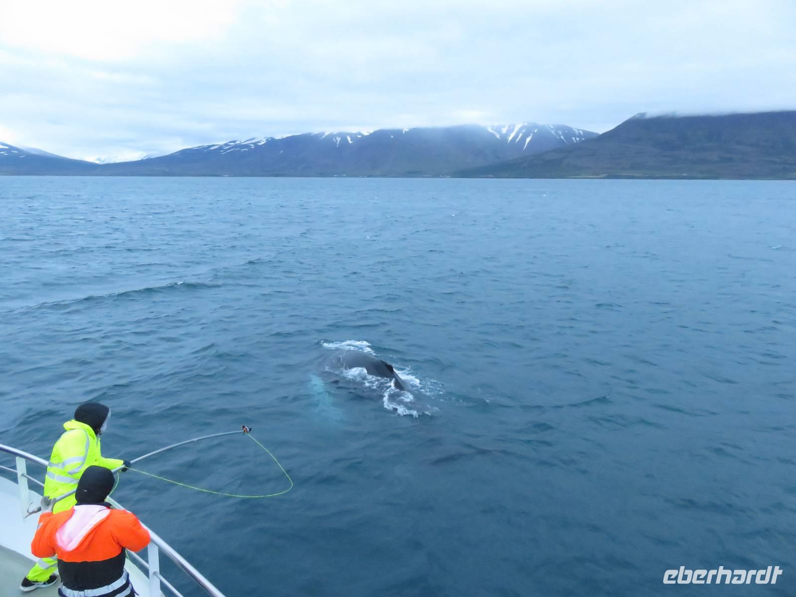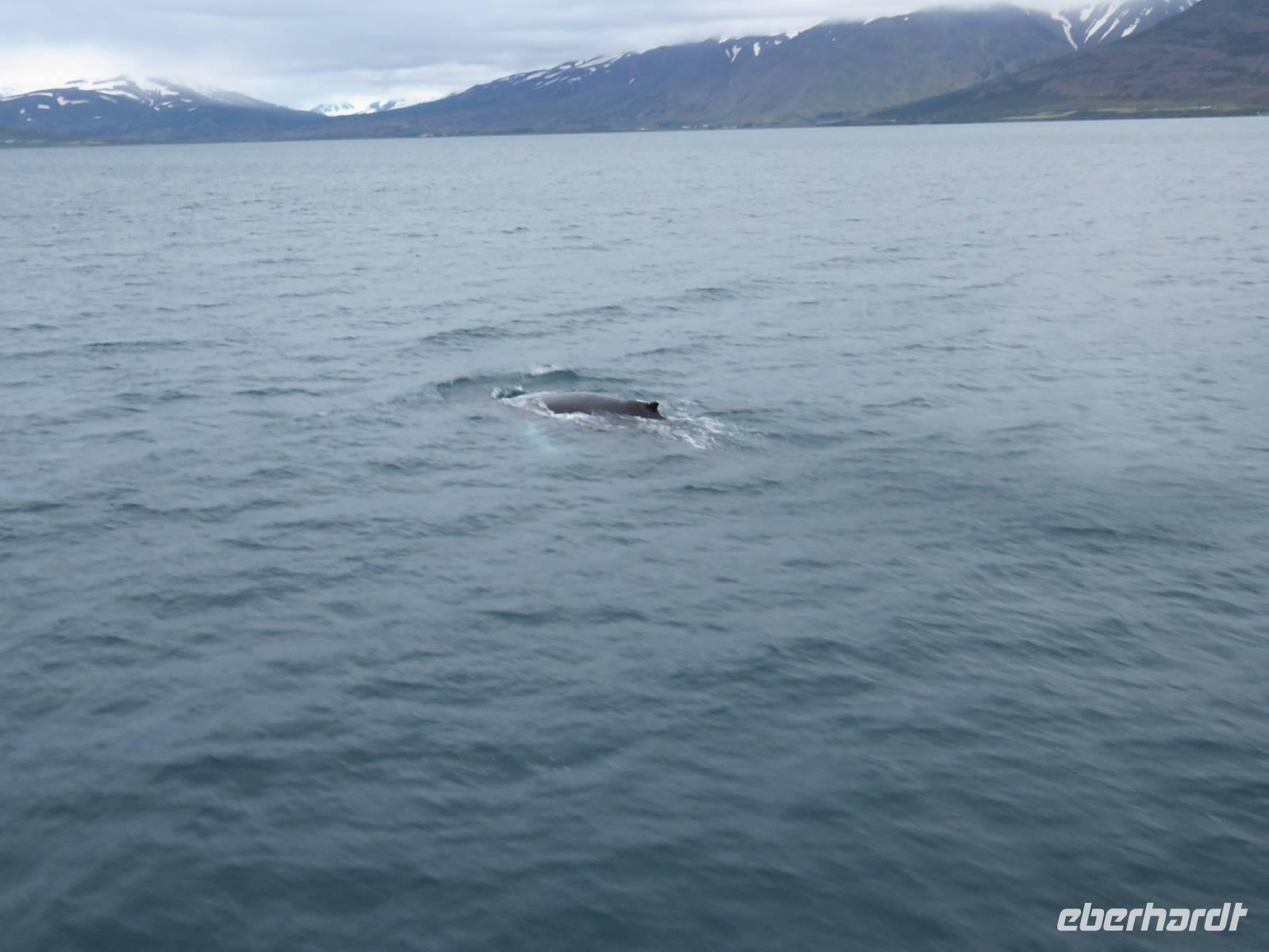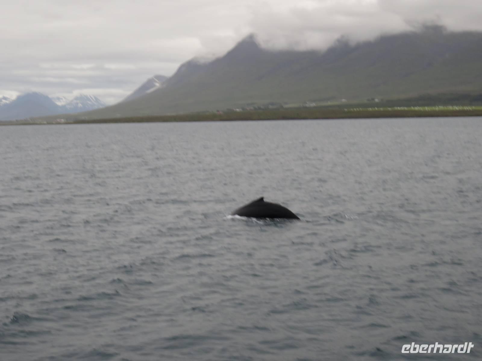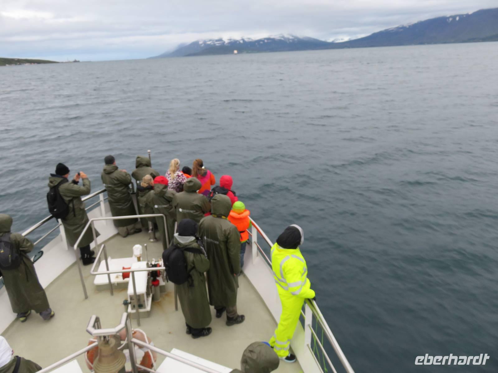 Am Morgen verließen wir Stykkisholmur und fuhren wieder zurück bis Borgarnes. Nach einer kurzen Pause führte uns unsere Route in Richtung Norden. Unser erstes Ziel war der Krater Grabrok. Auf diesen erloschenen Krater eines Spaltenausbruchs konnten wir hinaufsteigen. Wir sahen sehr schön, wie ein erloschener Vulkankrater aussieht und umrundeten seine Krone. Uns eröffnete sich eine tolle Sicht in die Landschaft mit vielfältigsten Gesteins- und Vulkanformationen. Anschließend brachte uns der Bus über die Hochebene Holtavörduheidi durch wiederum ganz unterschiedliche Landschaftsabschnitte. Rosa verkürzte uns die Busfahrt mit Erzählungen von Islandsagas und dem Vortragen einiger Volkslieder. Nach unserer Mittagspause erreichten wir am Nachmittag den Pferdehof Flugumyri. Hier besichtigten wir zunächst den Stall und Anna, die Besitzerin, erläuterte uns die Besonderheiten der Islandpferde. Die Wikinger brachten im 9. Jahrhundert die Pferde mit und daraus entwickelte sich die ganz besondere Rasse der Islandpferde. Sie sind kleiner als normale Pferde, aber sehr robust und intelligent. Sie wachsen die ersten vier Jahre völlig frei in den Bergen auf und erst danach wird mit dem Training der Pferde begonnen. Sie sind sehr gutmütig und haben einen starken Charakter. Islandpferde beherrschen neben den üblichen Gangarten Schritt, Trab, Galopp auch noch Tölt und Rennpass. Anschließend zeigten uns die Kinder von Anna die unterschiedlichen Gangarten der Islandpferde. Nun setzten wir unsere Fahrt nach Akureyri fort. Wir bezogen zunächst im Icelandair Hotel unsere Zimmer und nahmen unser Abendessen ein. Anschließend ging es zum nächsten großen Abenteuer. Fast alle Gäste hatten sich zur Teilnahme an der Walsafari entschieden. Dick eingepackt, denn es war recht kalt geworden, bestiegen wir das Boot mit dem wir in den Eyjafjord fuhren. Hier entdeckten wir schon nach kurzer Zeit einige Buckelwale. Immer wieder sahen wir die Fontänen, mit denen sie die Luft ausstießen, und dann die riesigen Tiere zum Luftholen kurz auftauchen. Es war für alle ein tolles Erlebnis. Kurz vor Mitternacht waren wir im Hotel zurück.