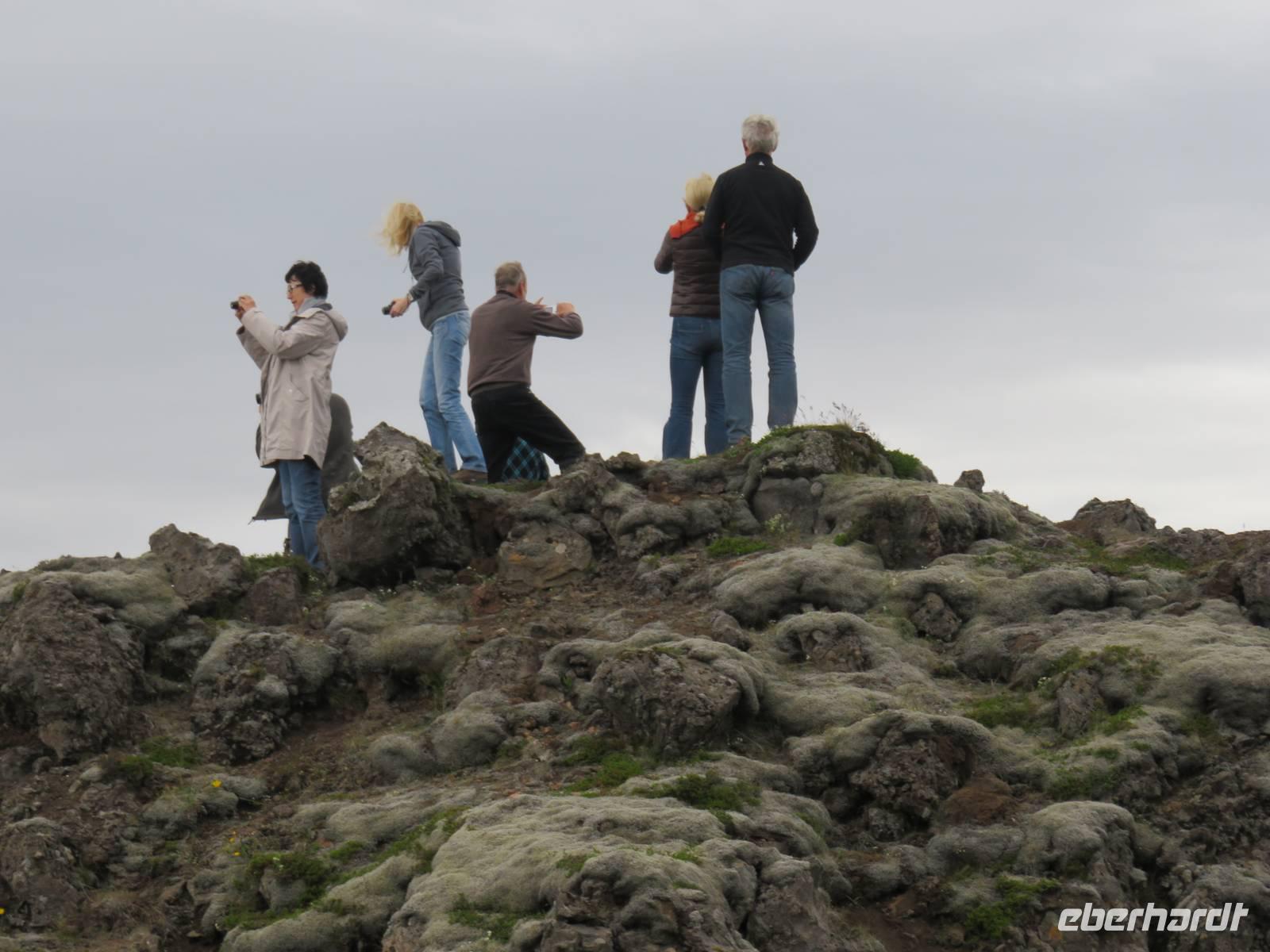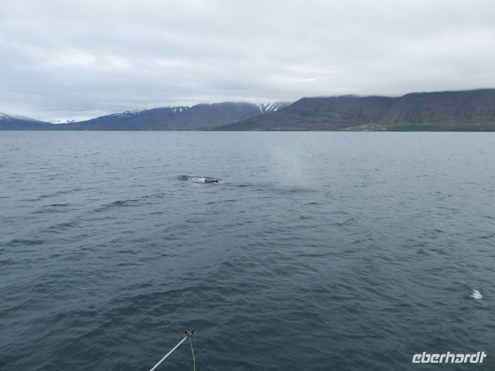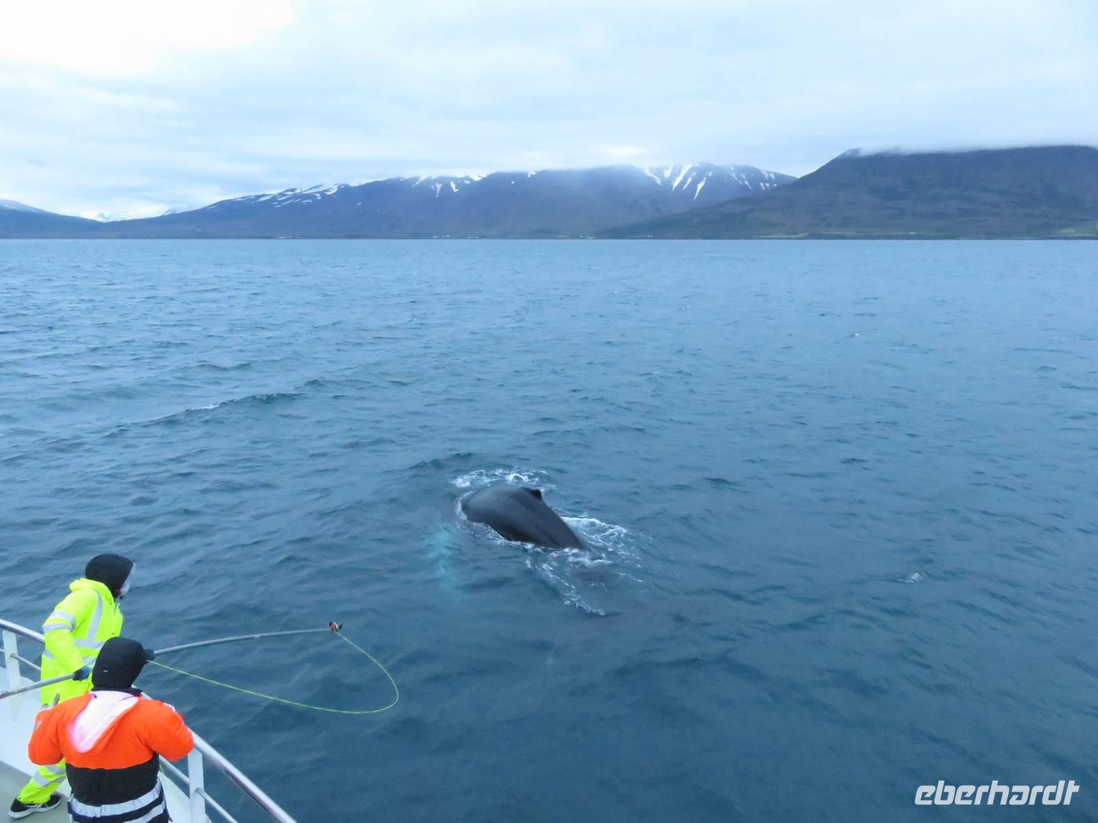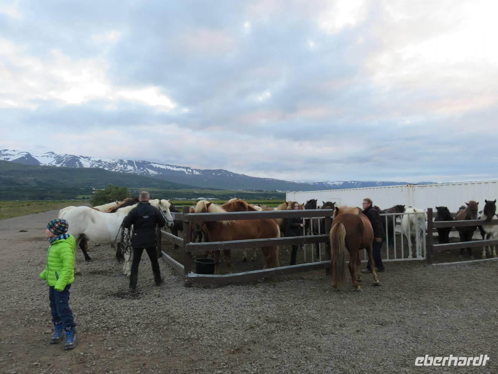 Am Morgen verließen wir Stykkisholmur und fuhren wieder zurück bis Borgarnes. Nach einer kurzen Pause führte uns unsere Route in Richtung Norden. Unser erstes Ziel war der Krater Grabrok. Auf diesen erloschenen Krater eines Spaltenausbruchs konnten wir hinaufsteigen. Wir sahen sehr schön, wie ein erloschener Vulkankrater aussieht und umrundeten seine Krone. Uns eröffnete sich eine tolle Sicht in die Landschaft mit vielfältigsten Gesteins- und Vulkanformationen. Anschließend brachte uns der Bus über die Hochebene Holtavörduheidi durch wiederum ganz unterschiedliche Landschaftsabschnitte. Rosa verkürzte uns die Busfahrt mit Erzählungen von Islandsagas und dem Vortragen einiger Volkslieder. Nach unserer Mittagspause erreichten wir am Nachmittag den Pferdehof Flugumyri. Hier besichtigten wir zunächst den Stall und Anna, die Besitzerin, erläuterte uns die Besonderheiten der Islandpferde. Die Wikinger brachten im 9. Jahrhundert die Pferde mit und daraus entwickelte sich die ganz besondere Rasse der Islandpferde. Sie sind kleiner als normale Pferde, aber sehr robust und intelligent. Sie wachsen die ersten vier Jahre völlig frei in den Bergen auf und erst danach wird mit dem Training der Pferde begonnen. Sie sind sehr gutmütig und haben einen starken Charakter. Islandpferde beherrschen neben den üblichen Gangarten Schritt, Trab, Galopp auch noch Tölt und Rennpass. Anschließend zeigten uns die Kinder von Anna die unterschiedlichen Gangarten der Islandpferde. Nun setzten wir unsere Fahrt nach Akureyri fort. Wir bezogen zunächst im Icelandair Hotel unsere Zimmer und nahmen unser Abendessen ein. Anschließend ging es zum nächsten großen Abenteuer. Fast alle Gäste hatten sich zur Teilnahme an der Walsafari entschieden. Dick eingepackt, denn es war recht kalt geworden, bestiegen wir das Boot mit dem wir in den Eyjafjord fuhren. Hier entdeckten wir schon nach kurzer Zeit einige Buckelwale. Immer wieder sahen wir die Fontänen, mit denen sie die Luft ausstießen, und dann die riesigen Tiere zum Luftholen kurz auftauchen. Es war für alle ein tolles Erlebnis. Kurz vor Mitternacht waren wir im Hotel zurück.