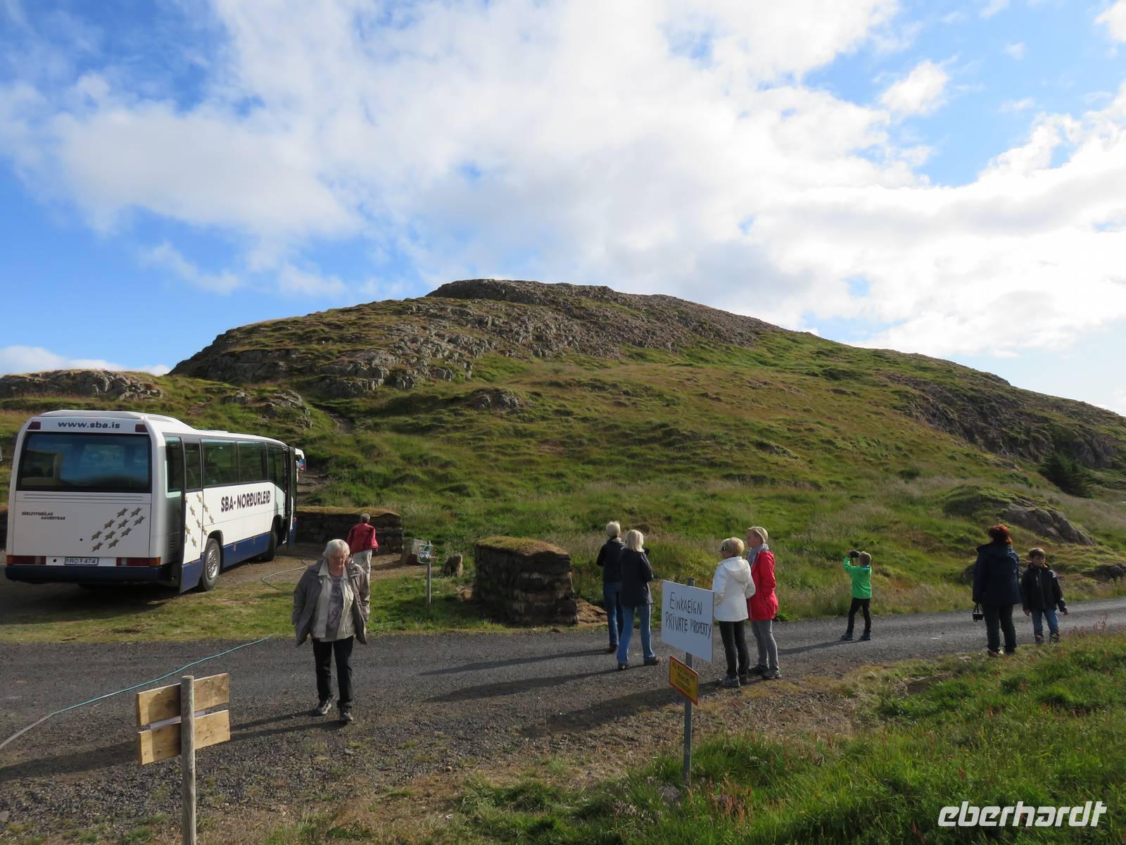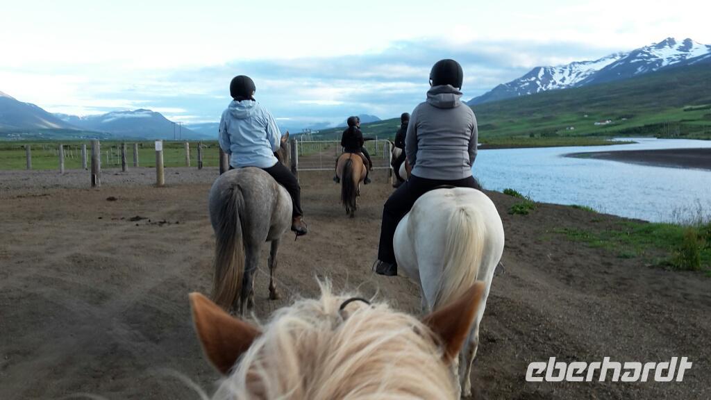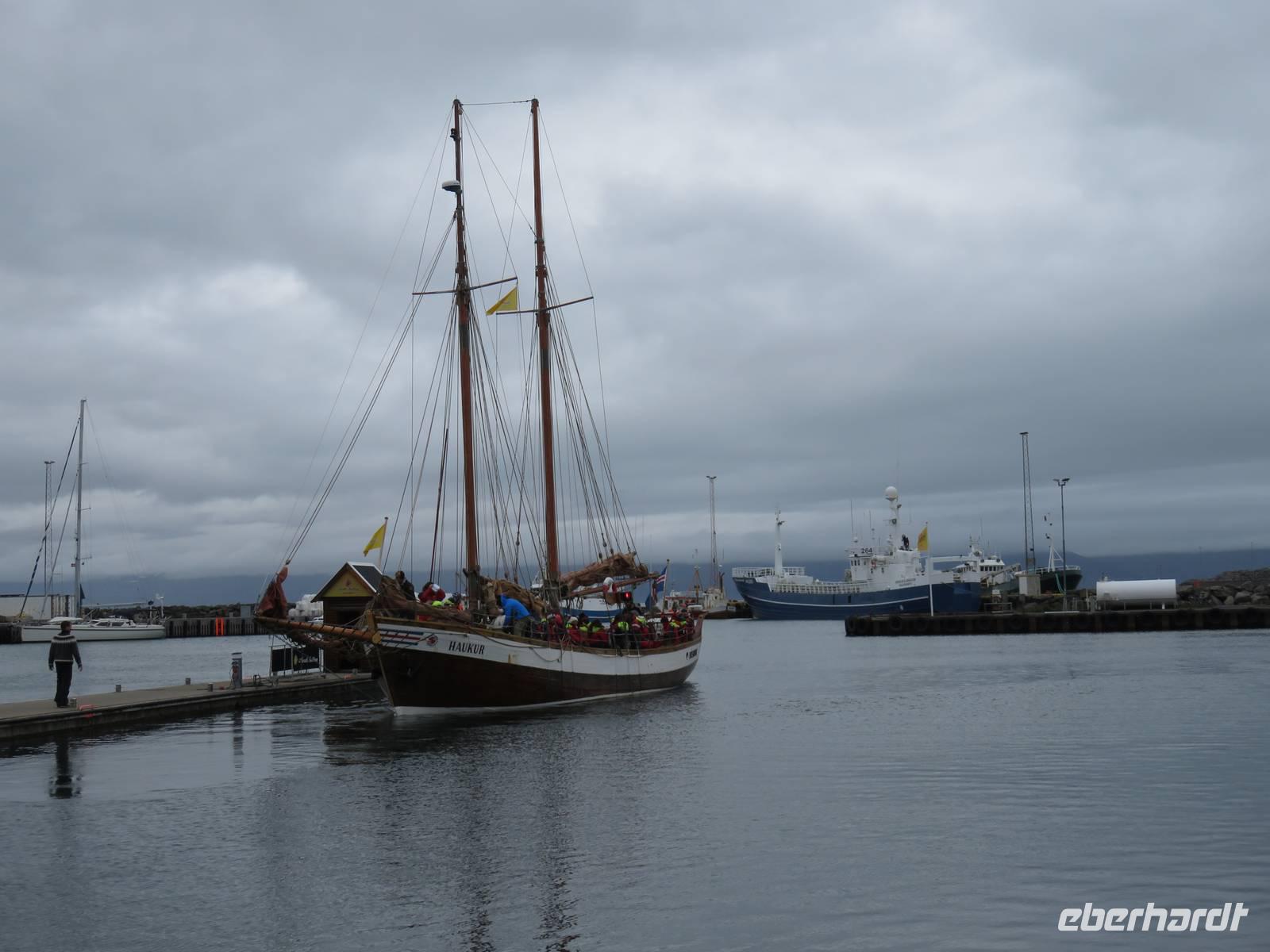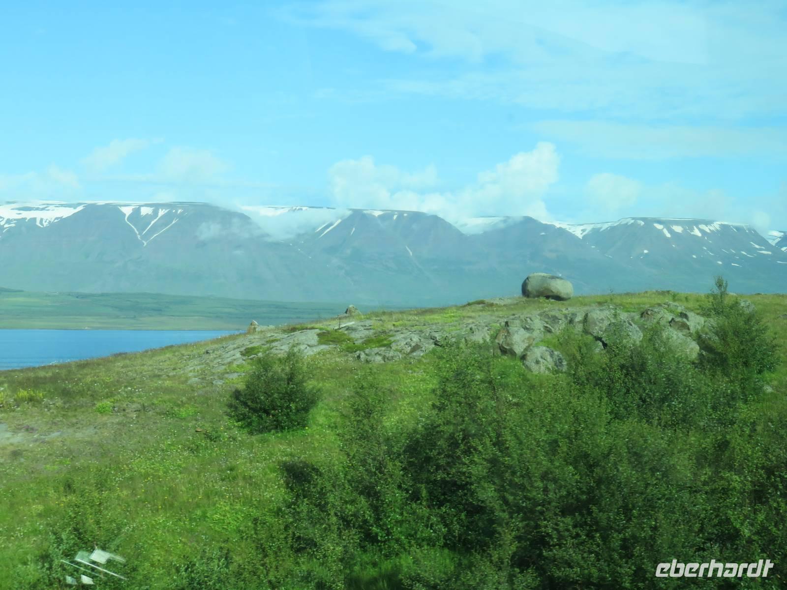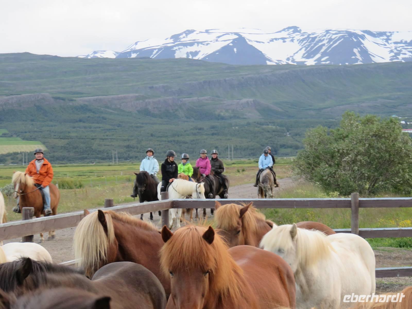 Am Morgen verließen wir Stykkisholmur und fuhren wieder zurück bis Borgarnes. Nach einer kurzen Pause führte uns unsere Route in Richtung Norden. Unser erstes Ziel war der Krater Grabrok. Auf diesen erloschenen Krater eines Spaltenausbruchs konnten wir hinaufsteigen. Wir sahen sehr schön, wie ein erloschener Vulkankrater aussieht und umrundeten seine Krone. Uns eröffnete sich eine tolle Sicht in die Landschaft mit vielfältigsten Gesteins- und Vulkanformationen. Anschließend brachte uns der Bus über die Hochebene Holtavörduheidi durch wiederum ganz unterschiedliche Landschaftsabschnitte. Rosa verkürzte uns die Busfahrt mit Erzählungen von Islandsagas und dem Vortragen einiger Volkslieder. Nach unserer Mittagspause erreichten wir am Nachmittag den Pferdehof Flugumyri. Hier besichtigten wir zunächst den Stall und Anna, die Besitzerin, erläuterte uns die Besonderheiten der Islandpferde. Die Wikinger brachten im 9. Jahrhundert die Pferde mit und daraus entwickelte sich die ganz besondere Rasse der Islandpferde. Sie sind kleiner als normale Pferde, aber sehr robust und intelligent. Sie wachsen die ersten vier Jahre völlig frei in den Bergen auf und erst danach wird mit dem Training der Pferde begonnen. Sie sind sehr gutmütig und haben einen starken Charakter. Islandpferde beherrschen neben den üblichen Gangarten Schritt, Trab, Galopp auch noch Tölt und Rennpass. Anschließend zeigten uns die Kinder von Anna die unterschiedlichen Gangarten der Islandpferde. Nun setzten wir unsere Fahrt nach Akureyri fort. Wir bezogen zunächst im Icelandair Hotel unsere Zimmer und nahmen unser Abendessen ein. Anschließend ging es zum nächsten großen Abenteuer. Fast alle Gäste hatten sich zur Teilnahme an der Walsafari entschieden. Dick eingepackt, denn es war recht kalt geworden, bestiegen wir das Boot mit dem wir in den Eyjafjord fuhren. Hier entdeckten wir schon nach kurzer Zeit einige Buckelwale. Immer wieder sahen wir die Fontänen, mit denen sie die Luft ausstießen, und dann die riesigen Tiere zum Luftholen kurz auftauchen. Es war für alle ein tolles Erlebnis. Kurz vor Mitternacht waren wir im Hotel zurück.