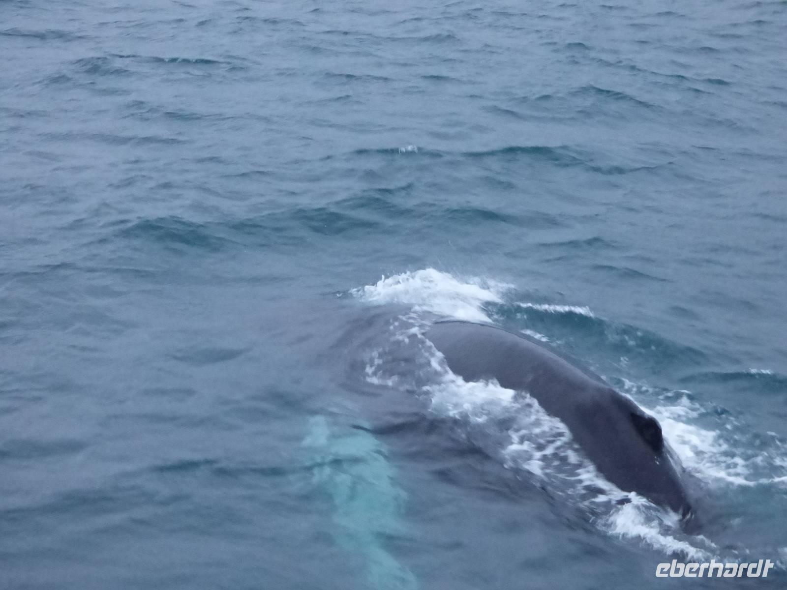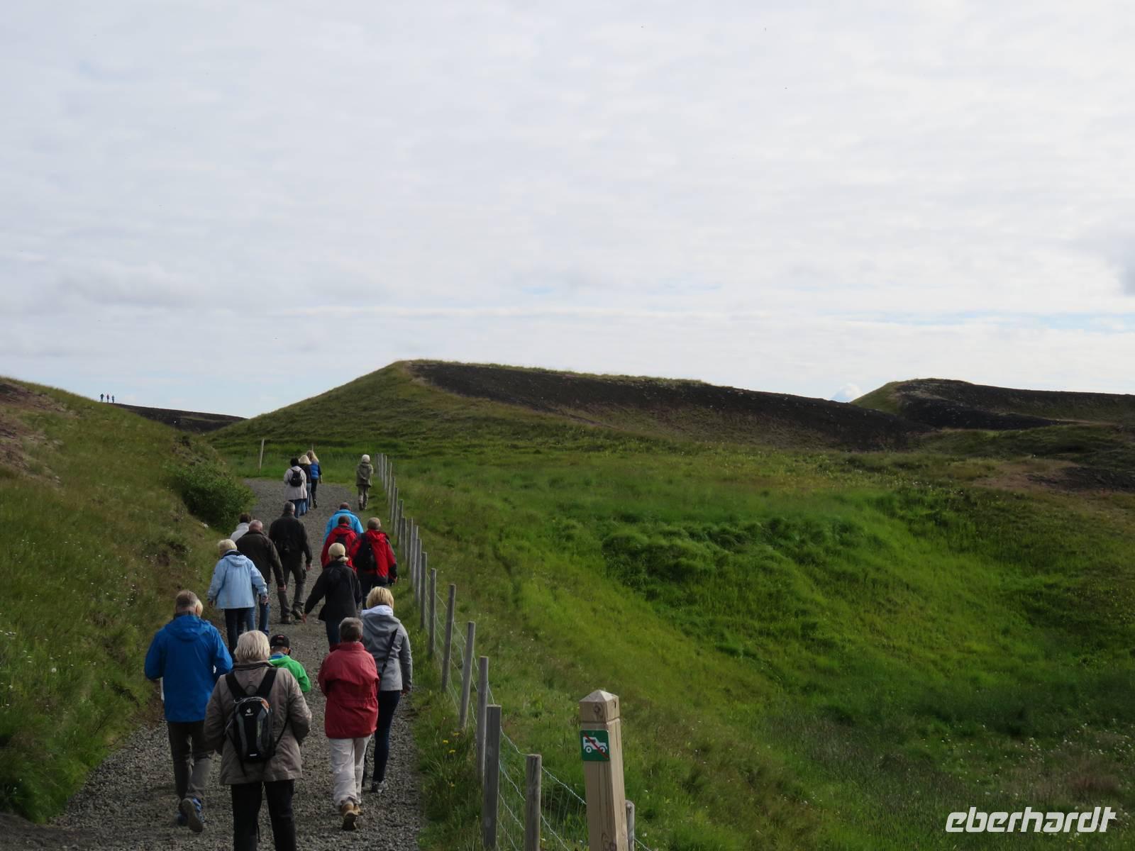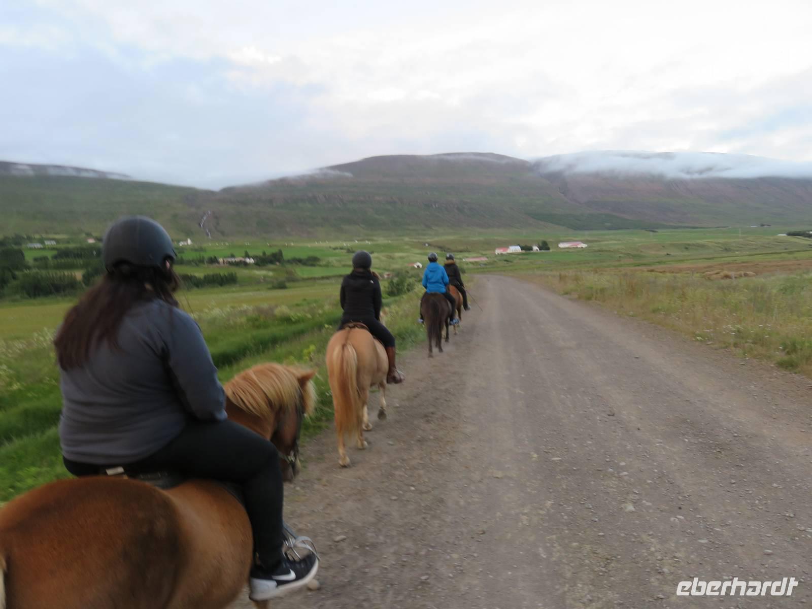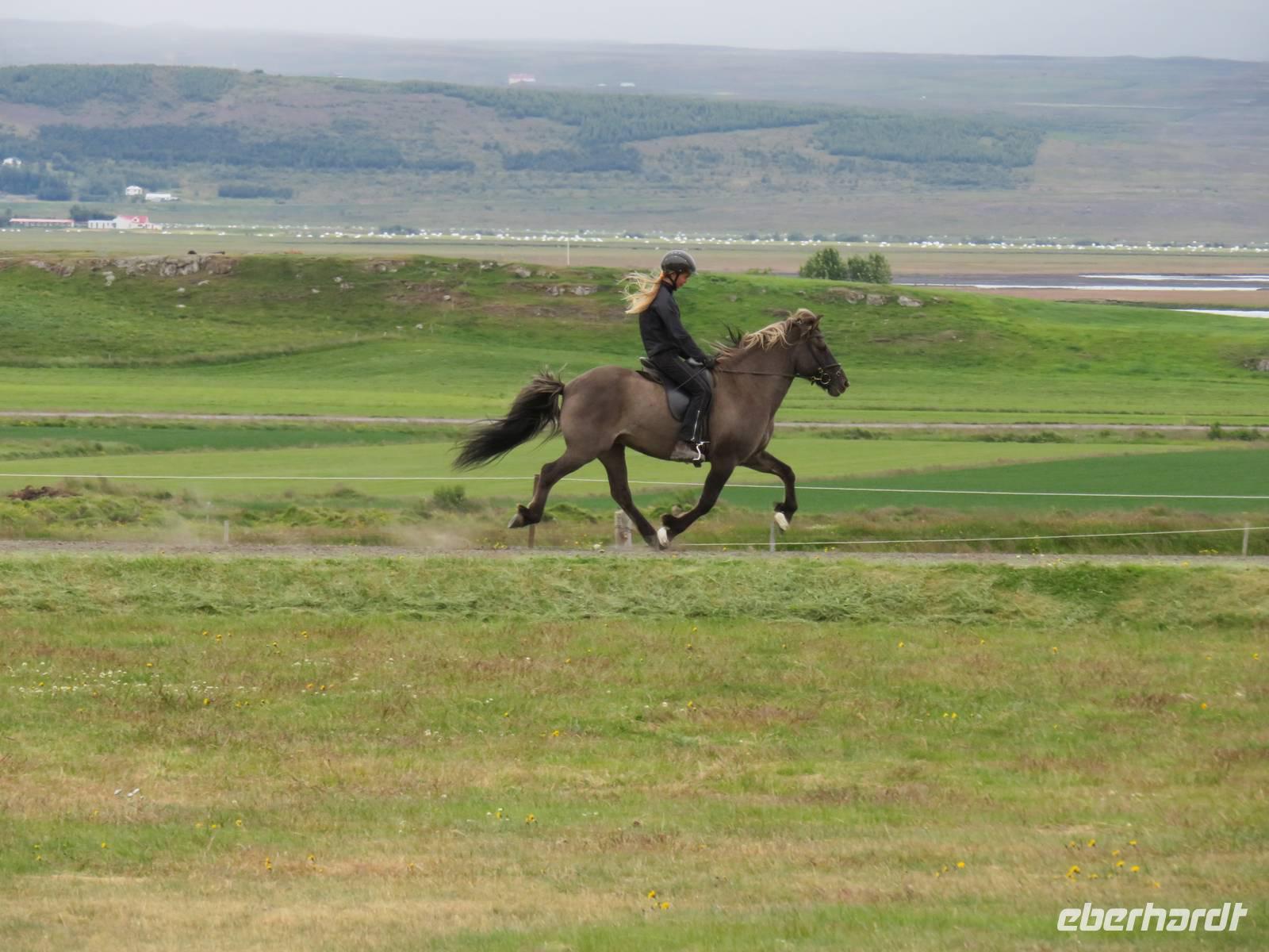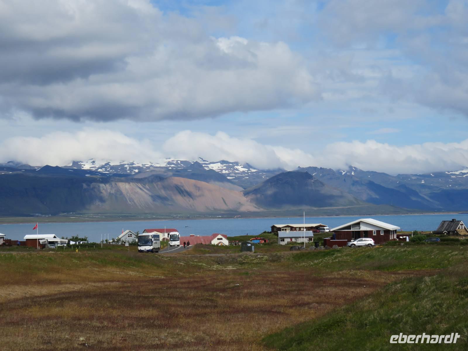 Am Morgen verließen wir Stykkisholmur und fuhren wieder zurück bis Borgarnes. Nach einer kurzen Pause führte uns unsere Route in Richtung Norden. Unser erstes Ziel war der Krater Grabrok. Auf diesen erloschenen Krater eines Spaltenausbruchs konnten wir hinaufsteigen. Wir sahen sehr schön, wie ein erloschener Vulkankrater aussieht und umrundeten seine Krone. Uns eröffnete sich eine tolle Sicht in die Landschaft mit vielfältigsten Gesteins- und Vulkanformationen. Anschließend brachte uns der Bus über die Hochebene Holtavörduheidi durch wiederum ganz unterschiedliche Landschaftsabschnitte. Rosa verkürzte uns die Busfahrt mit Erzählungen von Islandsagas und dem Vortragen einiger Volkslieder. Nach unserer Mittagspause erreichten wir am Nachmittag den Pferdehof Flugumyri. Hier besichtigten wir zunächst den Stall und Anna, die Besitzerin, erläuterte uns die Besonderheiten der Islandpferde. Die Wikinger brachten im 9. Jahrhundert die Pferde mit und daraus entwickelte sich die ganz besondere Rasse der Islandpferde. Sie sind kleiner als normale Pferde, aber sehr robust und intelligent. Sie wachsen die ersten vier Jahre völlig frei in den Bergen auf und erst danach wird mit dem Training der Pferde begonnen. Sie sind sehr gutmütig und haben einen starken Charakter. Islandpferde beherrschen neben den üblichen Gangarten Schritt, Trab, Galopp auch noch Tölt und Rennpass. Anschließend zeigten uns die Kinder von Anna die unterschiedlichen Gangarten der Islandpferde. Nun setzten wir unsere Fahrt nach Akureyri fort. Wir bezogen zunächst im Icelandair Hotel unsere Zimmer und nahmen unser Abendessen ein. Anschließend ging es zum nächsten großen Abenteuer. Fast alle Gäste hatten sich zur Teilnahme an der Walsafari entschieden. Dick eingepackt, denn es war recht kalt geworden, bestiegen wir das Boot mit dem wir in den Eyjafjord fuhren. Hier entdeckten wir schon nach kurzer Zeit einige Buckelwale. Immer wieder sahen wir die Fontänen, mit denen sie die Luft ausstießen, und dann die riesigen Tiere zum Luftholen kurz auftauchen. Es war für alle ein tolles Erlebnis. Kurz vor Mitternacht waren wir im Hotel zurück.