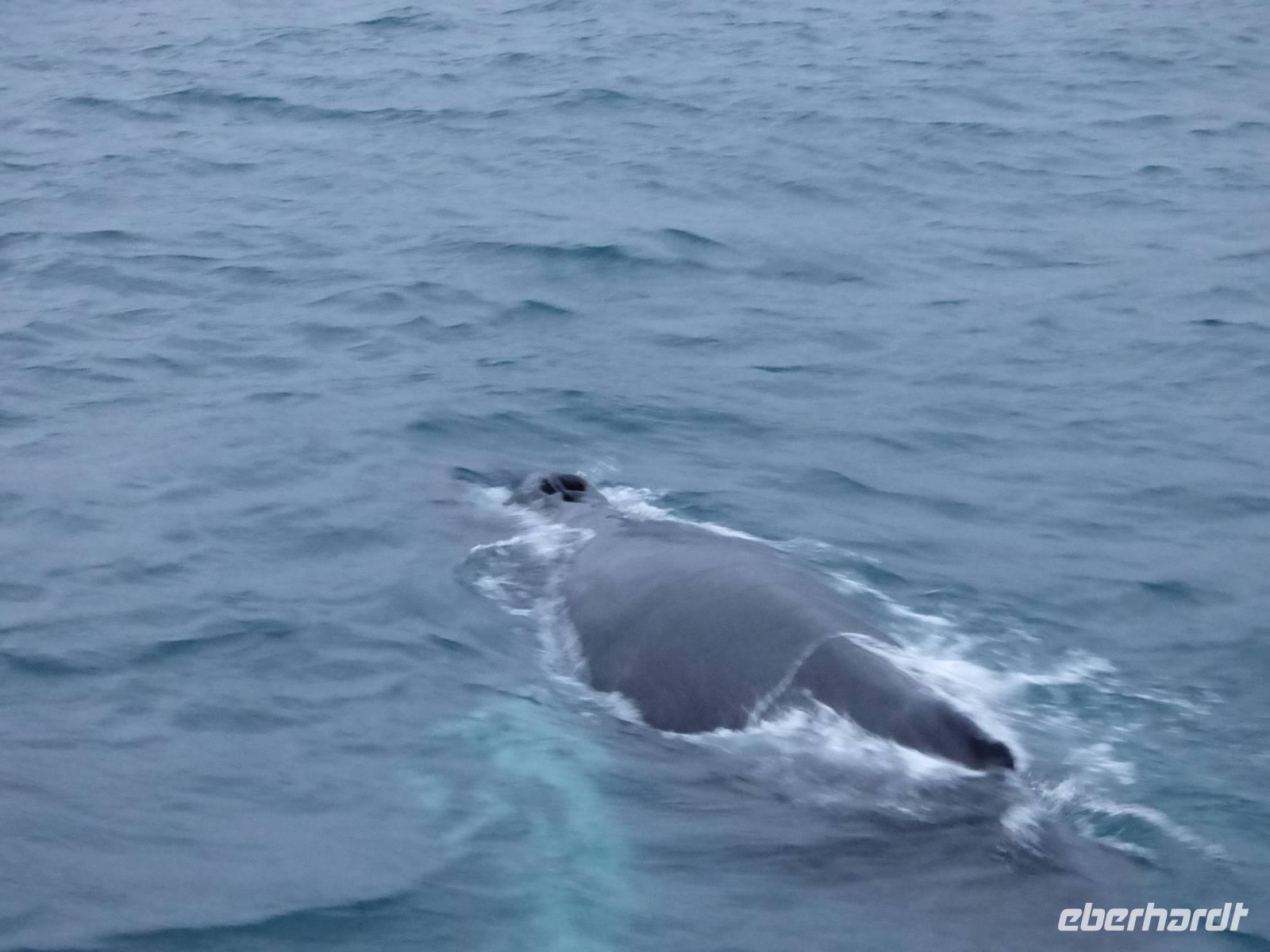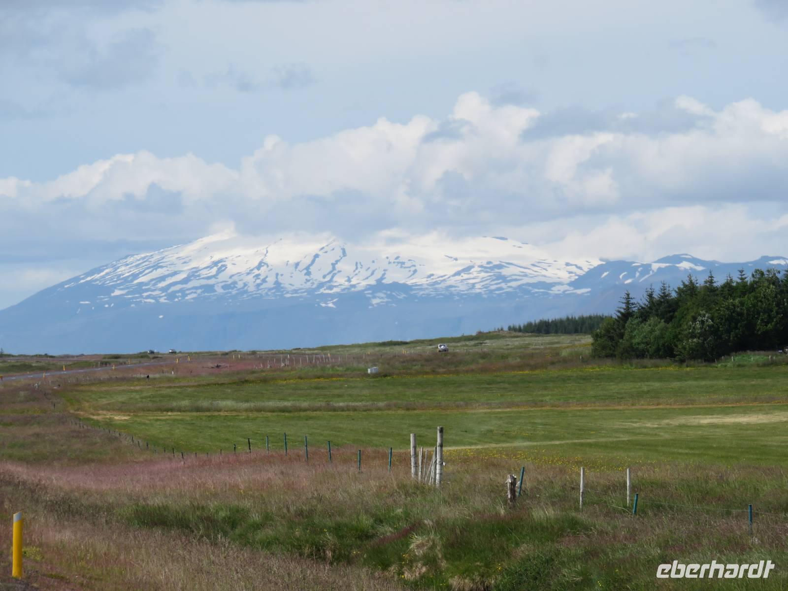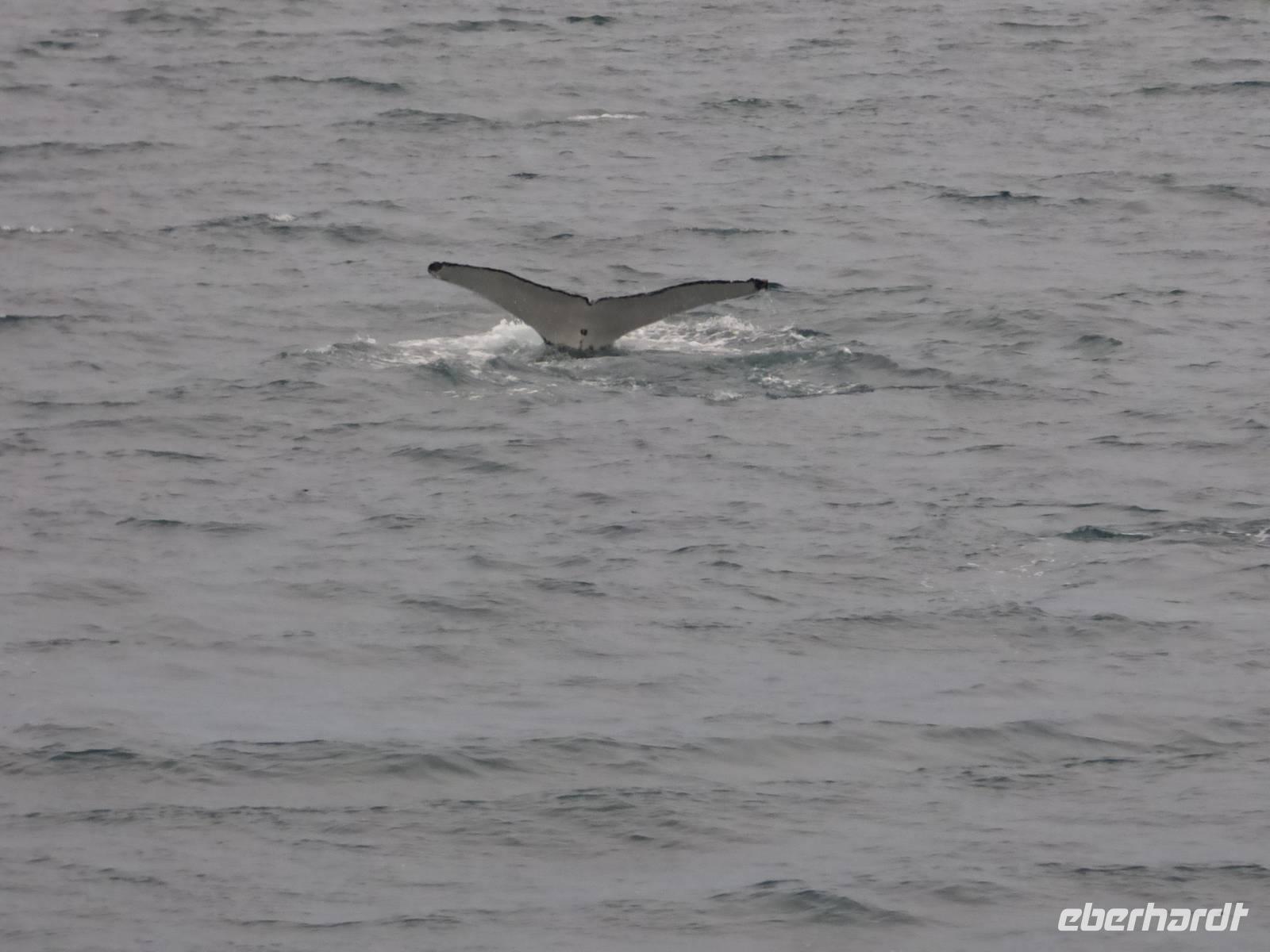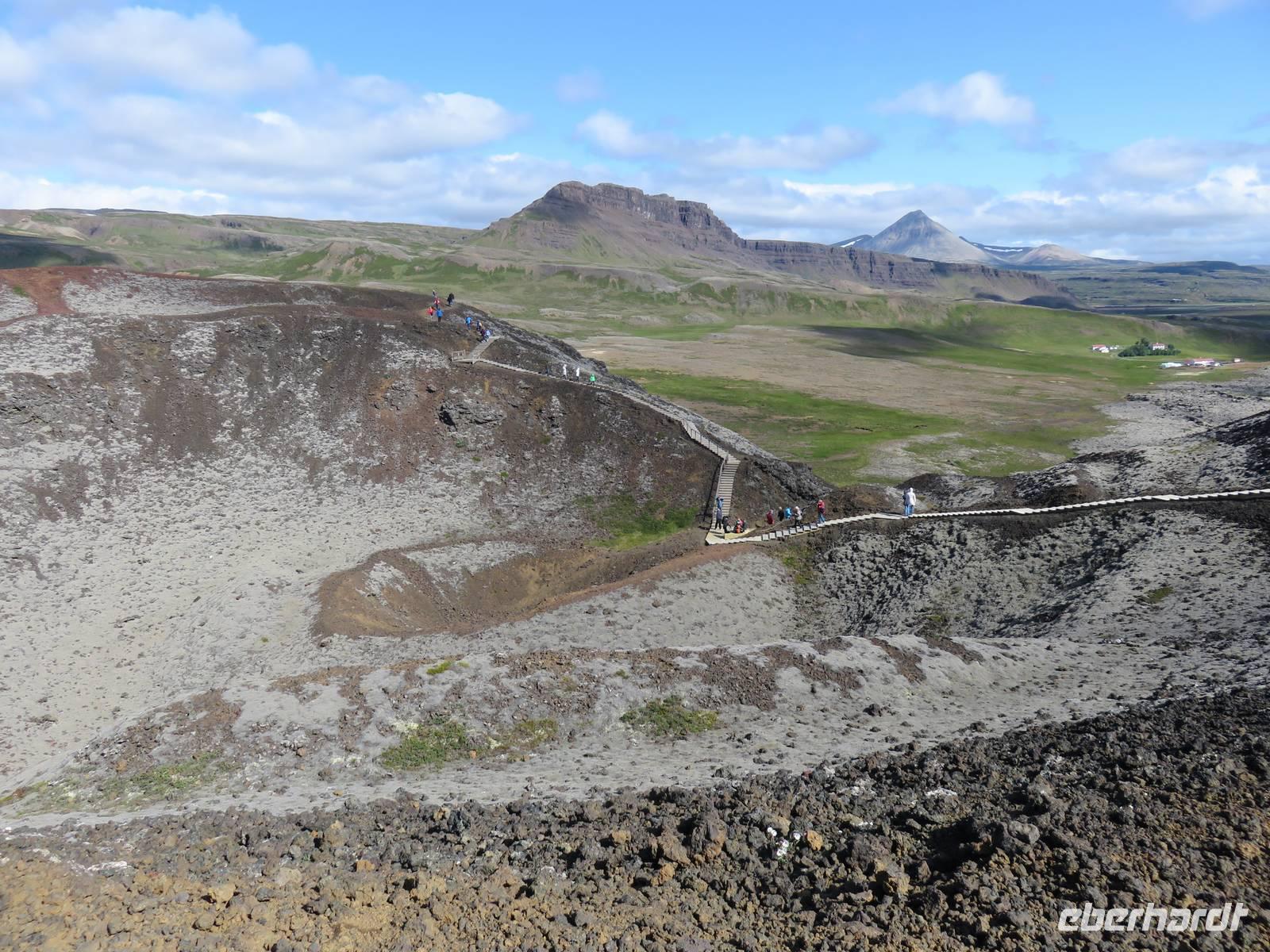 Am Morgen verließen wir Stykkisholmur und fuhren wieder zurück bis Borgarnes. Nach einer kurzen Pause führte uns unsere Route in Richtung Norden. Unser erstes Ziel war der Krater Grabrok. Auf diesen erloschenen Krater eines Spaltenausbruchs konnten wir hinaufsteigen. Wir sahen sehr schön, wie ein erloschener Vulkankrater aussieht und umrundeten seine Krone. Uns eröffnete sich eine tolle Sicht in die Landschaft mit vielfältigsten Gesteins- und Vulkanformationen. Anschließend brachte uns der Bus über die Hochebene Holtavörduheidi durch wiederum ganz unterschiedliche Landschaftsabschnitte. Rosa verkürzte uns die Busfahrt mit Erzählungen von Islandsagas und dem Vortragen einiger Volkslieder. Nach unserer Mittagspause erreichten wir am Nachmittag den Pferdehof Flugumyri. Hier besichtigten wir zunächst den Stall und Anna, die Besitzerin, erläuterte uns die Besonderheiten der Islandpferde. Die Wikinger brachten im 9. Jahrhundert die Pferde mit und daraus entwickelte sich die ganz besondere Rasse der Islandpferde. Sie sind kleiner als normale Pferde, aber sehr robust und intelligent. Sie wachsen die ersten vier Jahre völlig frei in den Bergen auf und erst danach wird mit dem Training der Pferde begonnen. Sie sind sehr gutmütig und haben einen starken Charakter. Islandpferde beherrschen neben den üblichen Gangarten Schritt, Trab, Galopp auch noch Tölt und Rennpass. Anschließend zeigten uns die Kinder von Anna die unterschiedlichen Gangarten der Islandpferde. Nun setzten wir unsere Fahrt nach Akureyri fort. Wir bezogen zunächst im Icelandair Hotel unsere Zimmer und nahmen unser Abendessen ein. Anschließend ging es zum nächsten großen Abenteuer. Fast alle Gäste hatten sich zur Teilnahme an der Walsafari entschieden. Dick eingepackt, denn es war recht kalt geworden, bestiegen wir das Boot mit dem wir in den Eyjafjord fuhren. Hier entdeckten wir schon nach kurzer Zeit einige Buckelwale. Immer wieder sahen wir die Fontänen, mit denen sie die Luft ausstießen, und dann die riesigen Tiere zum Luftholen kurz auftauchen. Es war für alle ein tolles Erlebnis. Kurz vor Mitternacht waren wir im Hotel zurück.