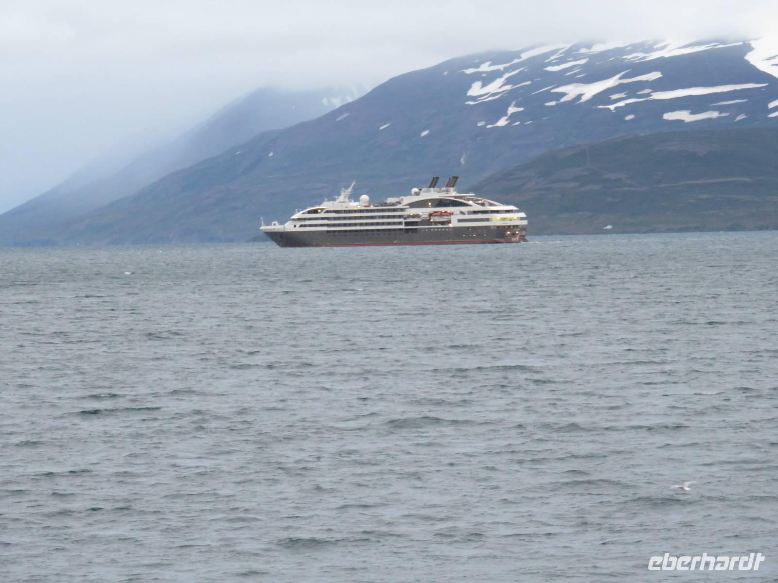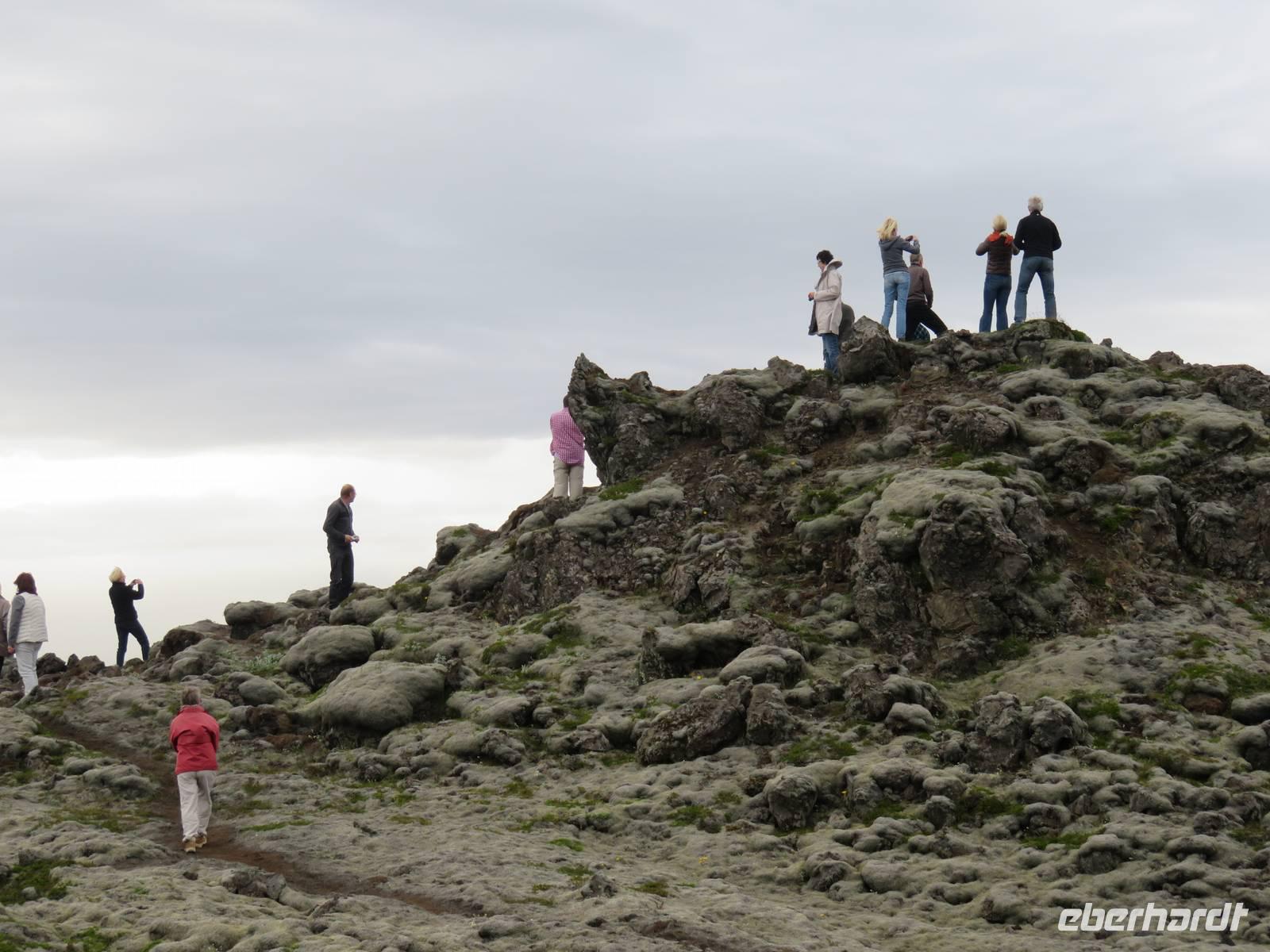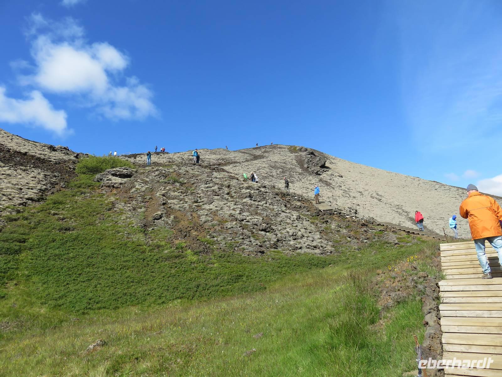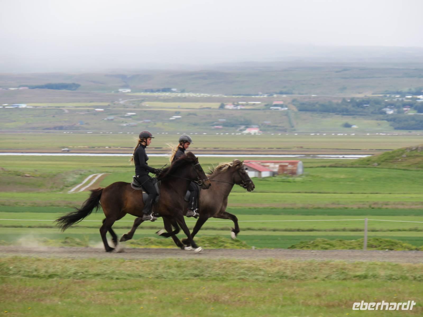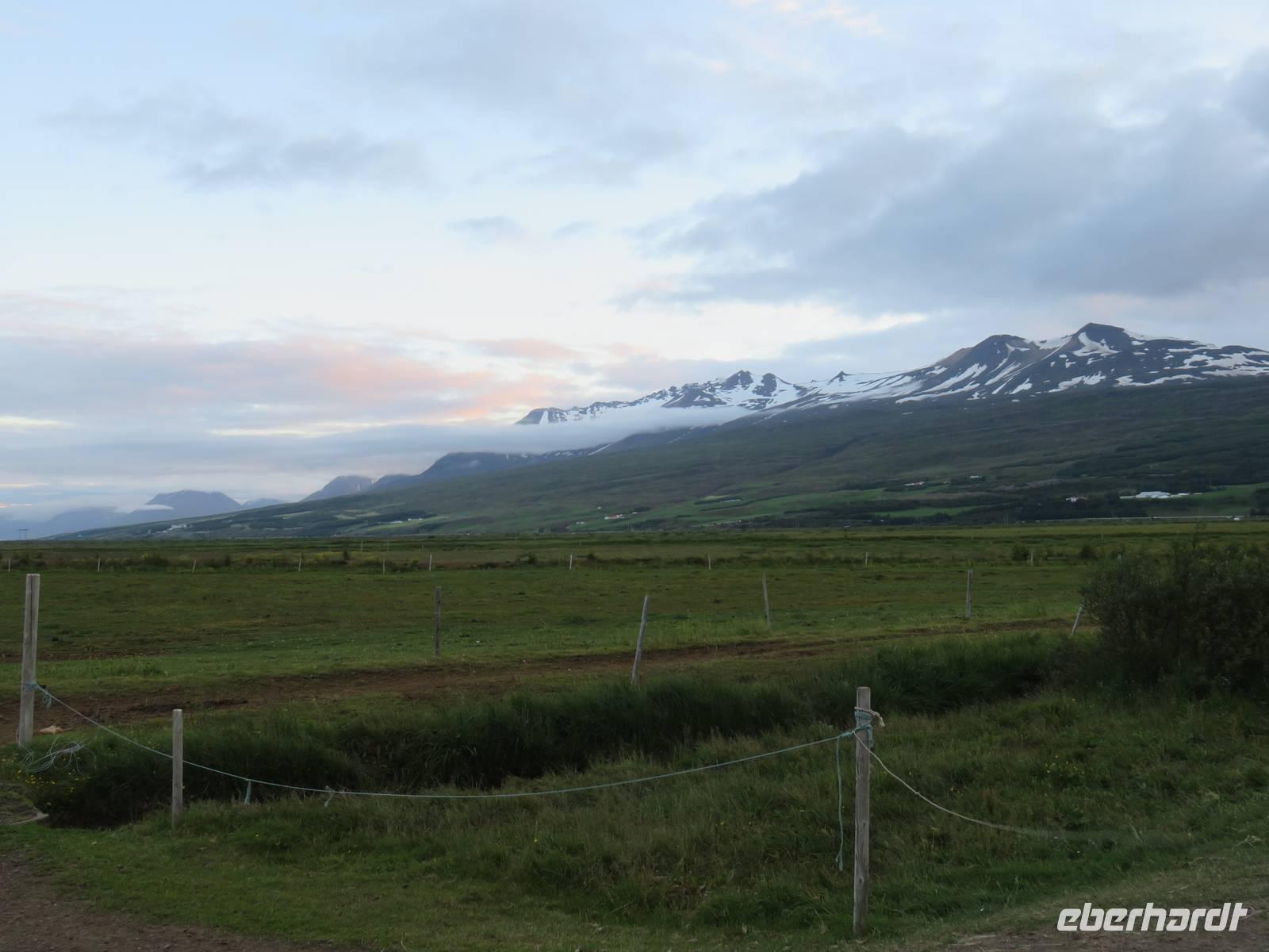 Am Morgen verließen wir Stykkisholmur und fuhren wieder zurück bis Borgarnes. Nach einer kurzen Pause führte uns unsere Route in Richtung Norden. Unser erstes Ziel war der Krater Grabrok. Auf diesen erloschenen Krater eines Spaltenausbruchs konnten wir hinaufsteigen. Wir sahen sehr schön, wie ein erloschener Vulkankrater aussieht und umrundeten seine Krone. Uns eröffnete sich eine tolle Sicht in die Landschaft mit vielfältigsten Gesteins- und Vulkanformationen. Anschließend brachte uns der Bus über die Hochebene Holtavörduheidi durch wiederum ganz unterschiedliche Landschaftsabschnitte. Rosa verkürzte uns die Busfahrt mit Erzählungen von Islandsagas und dem Vortragen einiger Volkslieder. Nach unserer Mittagspause erreichten wir am Nachmittag den Pferdehof Flugumyri. Hier besichtigten wir zunächst den Stall und Anna, die Besitzerin, erläuterte uns die Besonderheiten der Islandpferde. Die Wikinger brachten im 9. Jahrhundert die Pferde mit und daraus entwickelte sich die ganz besondere Rasse der Islandpferde. Sie sind kleiner als normale Pferde, aber sehr robust und intelligent. Sie wachsen die ersten vier Jahre völlig frei in den Bergen auf und erst danach wird mit dem Training der Pferde begonnen. Sie sind sehr gutmütig und haben einen starken Charakter. Islandpferde beherrschen neben den üblichen Gangarten Schritt, Trab, Galopp auch noch Tölt und Rennpass. Anschließend zeigten uns die Kinder von Anna die unterschiedlichen Gangarten der Islandpferde. Nun setzten wir unsere Fahrt nach Akureyri fort. Wir bezogen zunächst im Icelandair Hotel unsere Zimmer und nahmen unser Abendessen ein. Anschließend ging es zum nächsten großen Abenteuer. Fast alle Gäste hatten sich zur Teilnahme an der Walsafari entschieden. Dick eingepackt, denn es war recht kalt geworden, bestiegen wir das Boot mit dem wir in den Eyjafjord fuhren. Hier entdeckten wir schon nach kurzer Zeit einige Buckelwale. Immer wieder sahen wir die Fontänen, mit denen sie die Luft ausstießen, und dann die riesigen Tiere zum Luftholen kurz auftauchen. Es war für alle ein tolles Erlebnis. Kurz vor Mitternacht waren wir im Hotel zurück.