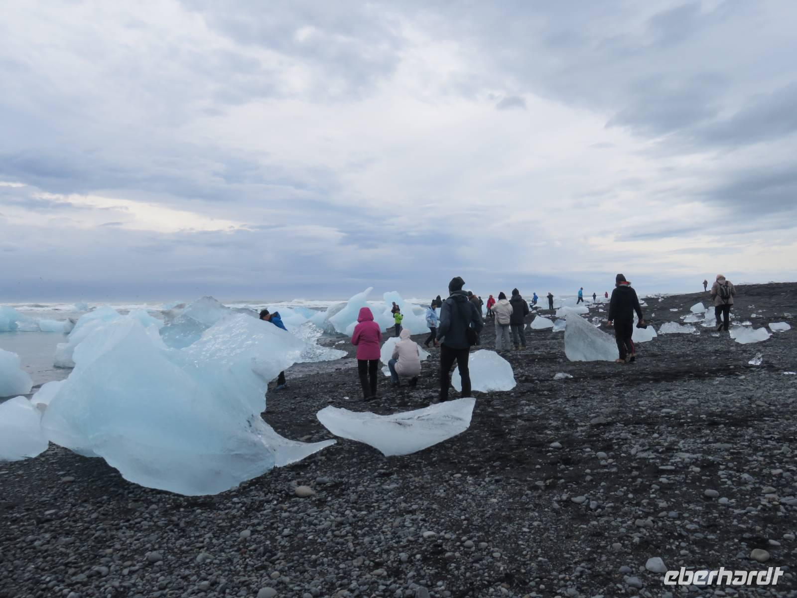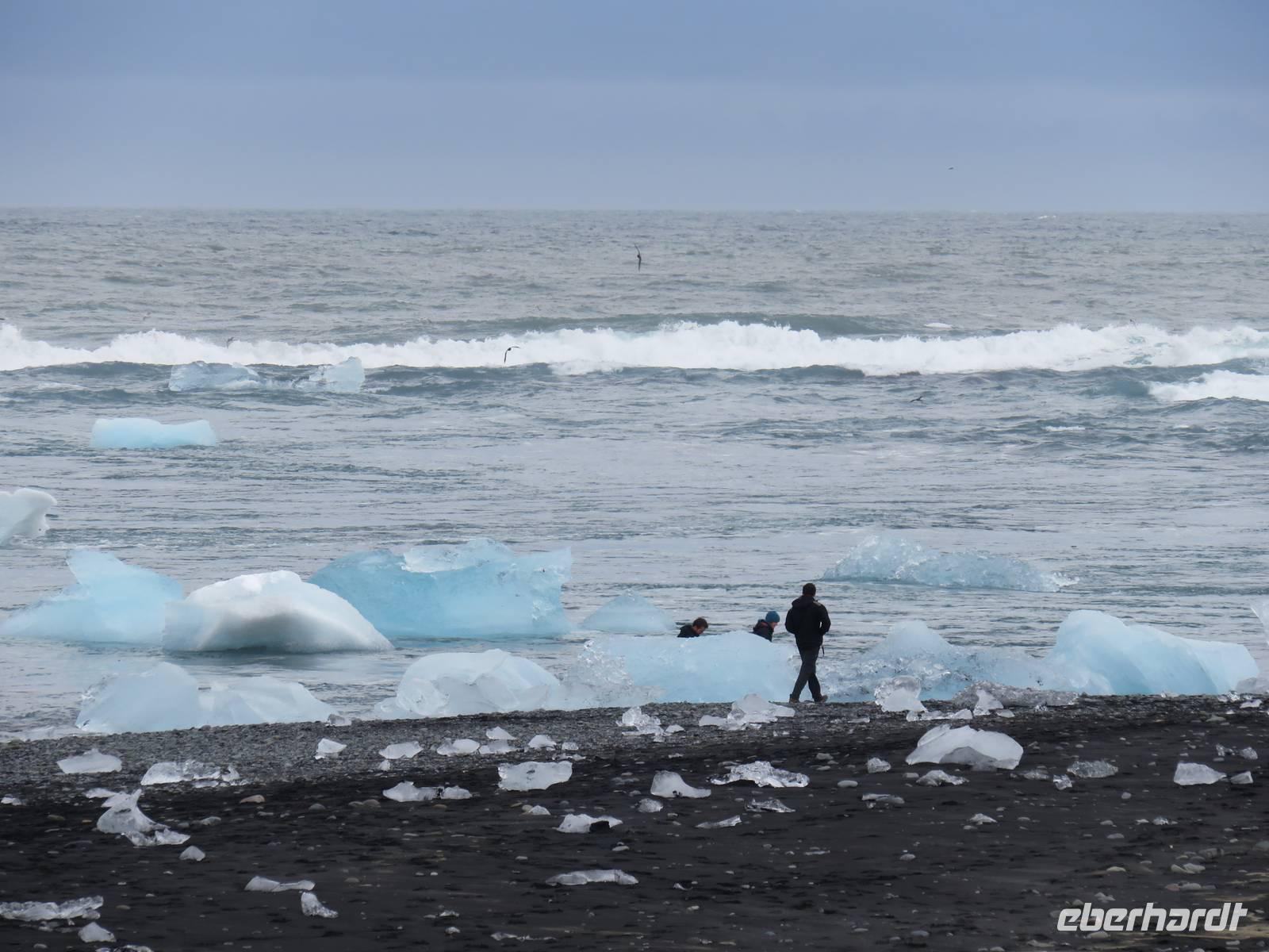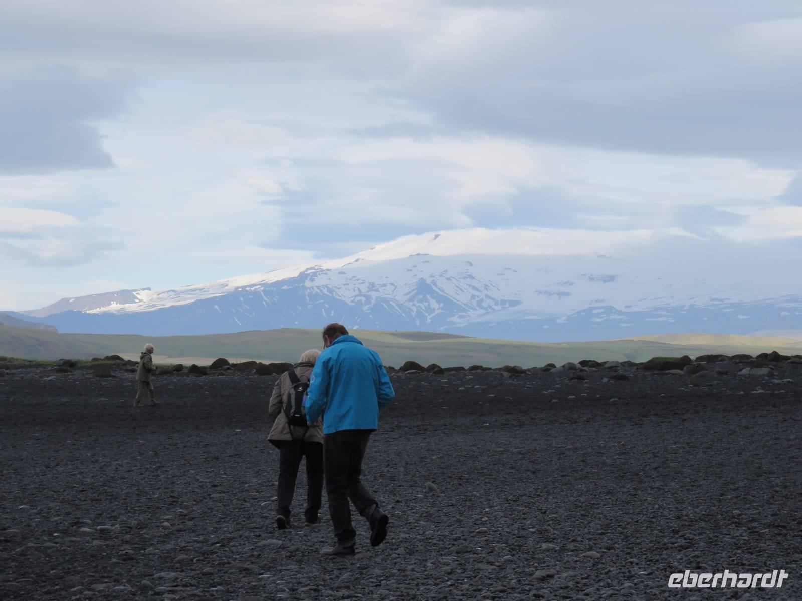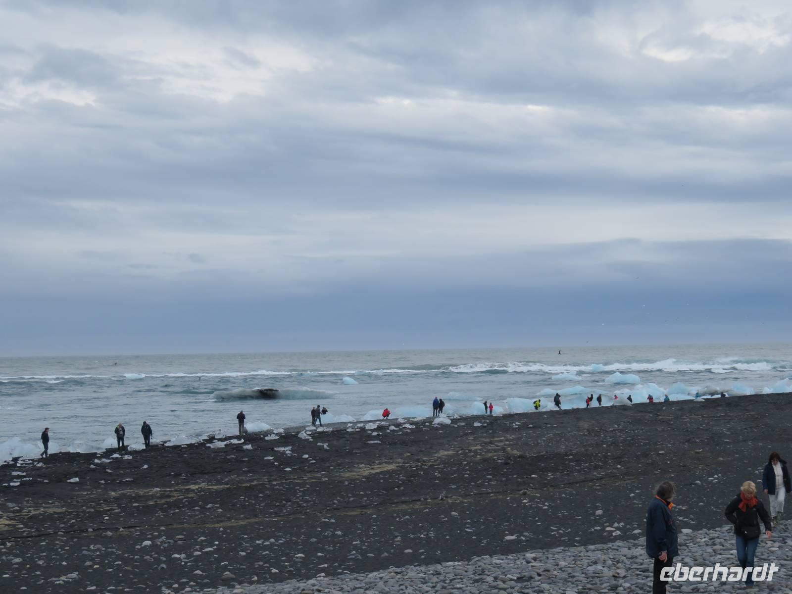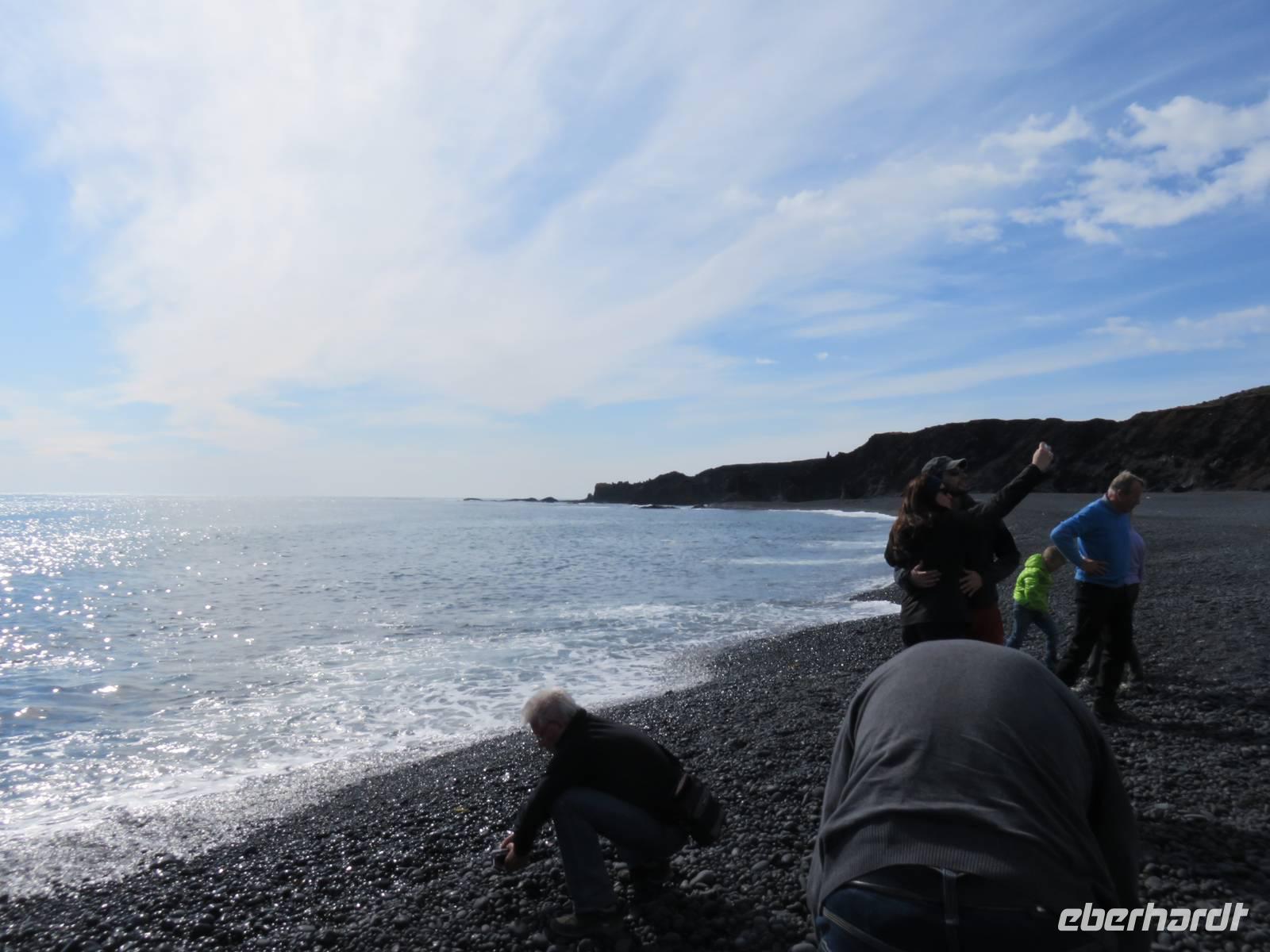 Am Morgen fuhren wir immer im Angesicht des großen Gletschers Vatnajökull und seiner höchsten Erhebung mit 2.110 Metern zur Gletscherlagune Jökulsarlon. Bereits kurz bevor wir den Parkplatz erreichten, sahen wir die großen Eisberge in der Lagune. Wir stiegen in ein Amphibien-Fahrzeug um und es ging direkt in die Lagune. Die Lagune bildete sich seit 1930, als sich der Gletscher zurück zog. Sie ist heute 25 km² groß. Das Eis bricht von der Gletscherzunge ab und landet als Berg oder Scholle in der Lagune. Es ist durch den Druck viel kompakter als anderes Eis und ist transparent. Es benötigt ca. 800 bis 1.200 Jahre bis es an der Gletscherzunge ankommt. So ist das Eis etwa 1.000 Jahre alt, wenn es in der Lagune schwimmt. Die blaue Farbe bekommt das Eis durch die Reflektion des Lichtes, wenn es als transparentes Eis aus dem Wasser kommt. Nach einiger Zeit mit Kontakt zur Luft bilden sich Eiskristalle und das Eis wird weiß. Wir probierten einen Brennevin - den typischen isländischen Schnaps - auf Eis aus der Lagune. Anschließend hatten wir noch etwas Zeit, für Fotos. Wir sahen auch einige Seelöwen. Direkt am Übergang der Lagune ins Meer befindet sich ein schwarzer Strand. Wir sahen die Eisschollen und Eisberge ins Meer schwimmen und an dem Strand lagen die Eisschollen auf dem Sand. Durch Ebbe und Flut ergeben sich diese Naturschauspiele. Ein unglaubliches Erlebnis - Eisschollen am Meeresstrand. Danach haben wir noch an der kleinen Lagune Fjällsarlon, welche sich gerade bildet, einen Fotostopp eingelegt. Hier blies der Wind sehr stark. Nach unserer Mittagspause war Svinafellsjökull unser nächstes Ziel. Die Gletscherzunge kommt sehr weit nach unten und bildet ebenfalls eine kleine Lagune. Wir sahen sehr schön das Eis in verschiedensten Farben und kamen recht nah an die Zunge heran. Am Nationalparkzentrum Skaftafell schauten wir uns einen Film über die Gletscher und den Ausbruch im Jahr 1996 an. Dann ging es durch ein großes Sandfeld, wo inzwischen sehr viel Wind aufgekommen war, weiter Richtung Süden. 1783 kam es zu einem der größten Spaltenausbrüche auf Island. In dessen Folge bildete sich ein 57 km² großes Lavafeld, welches wir durchquerten. Beeindruckende Landschaftformationen, welche heute mit Moos bewachsen sind fingen unsere Blicke ein. Nach einem Fotostopp mit schönem Blick auf Katla, den wohl gefährlichsten, aktiven Vulkan erreichten wir am frühen Abend Vik, wo wir im Hotel unsere Zimmer bezogen. Nach dem Abendessen spazierten wir durch den kleinen Ort zum Strand und einige entdecken sogar noch Papageientaucher - die putzigen Vögel mit den orangen Schäbeln.