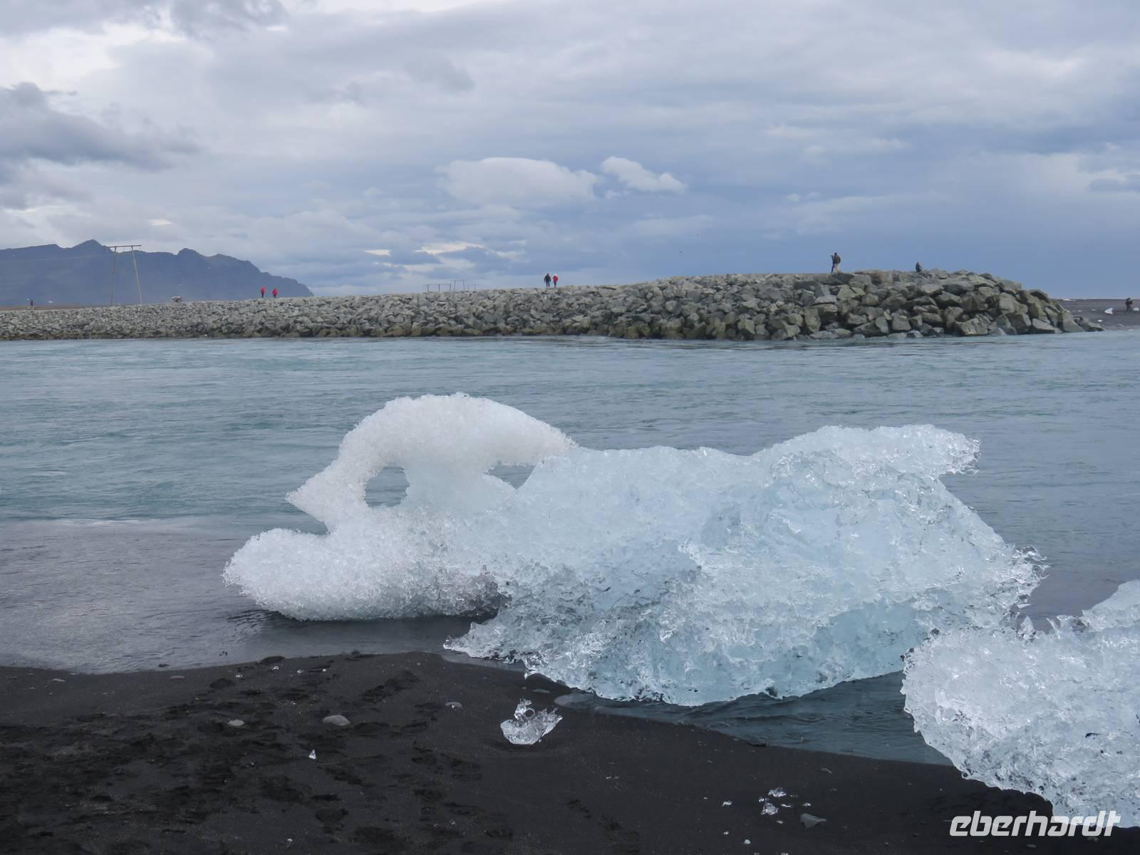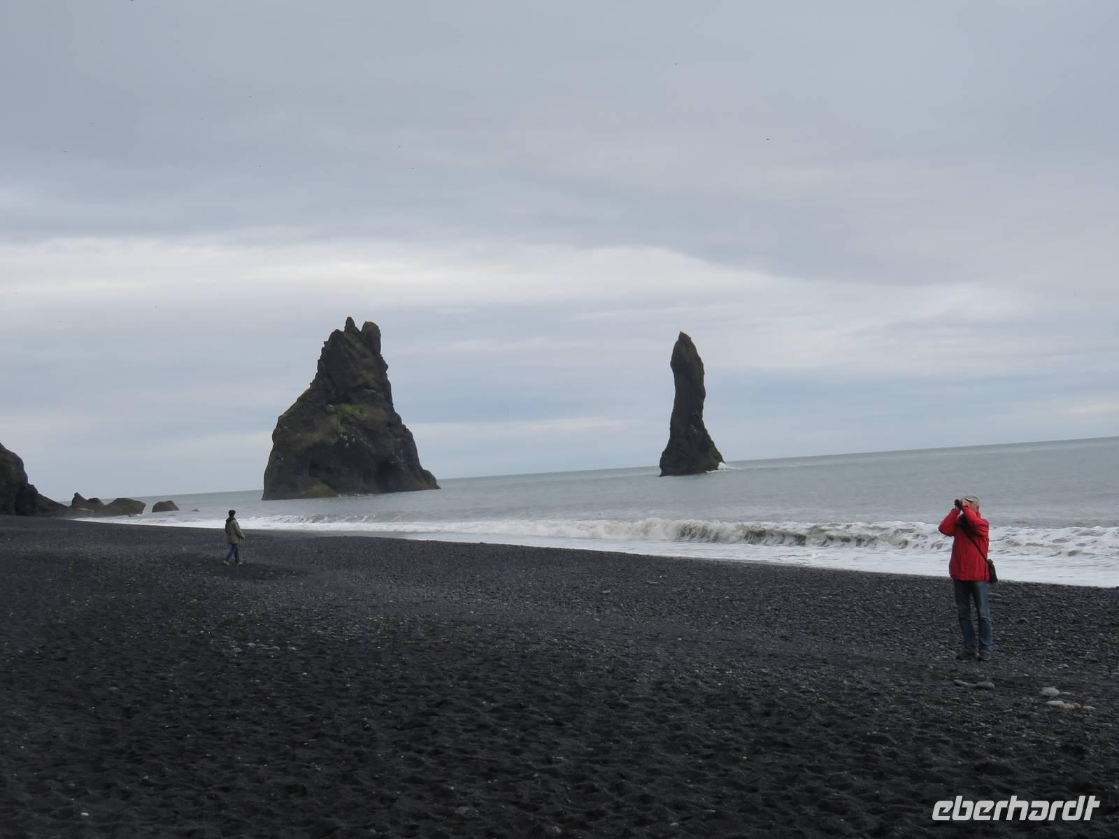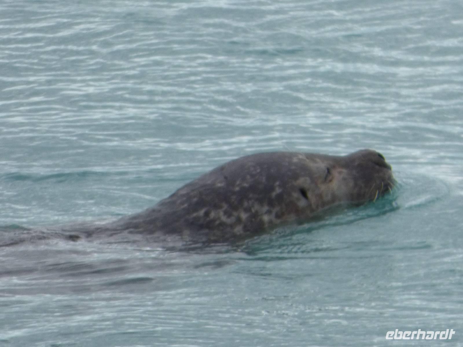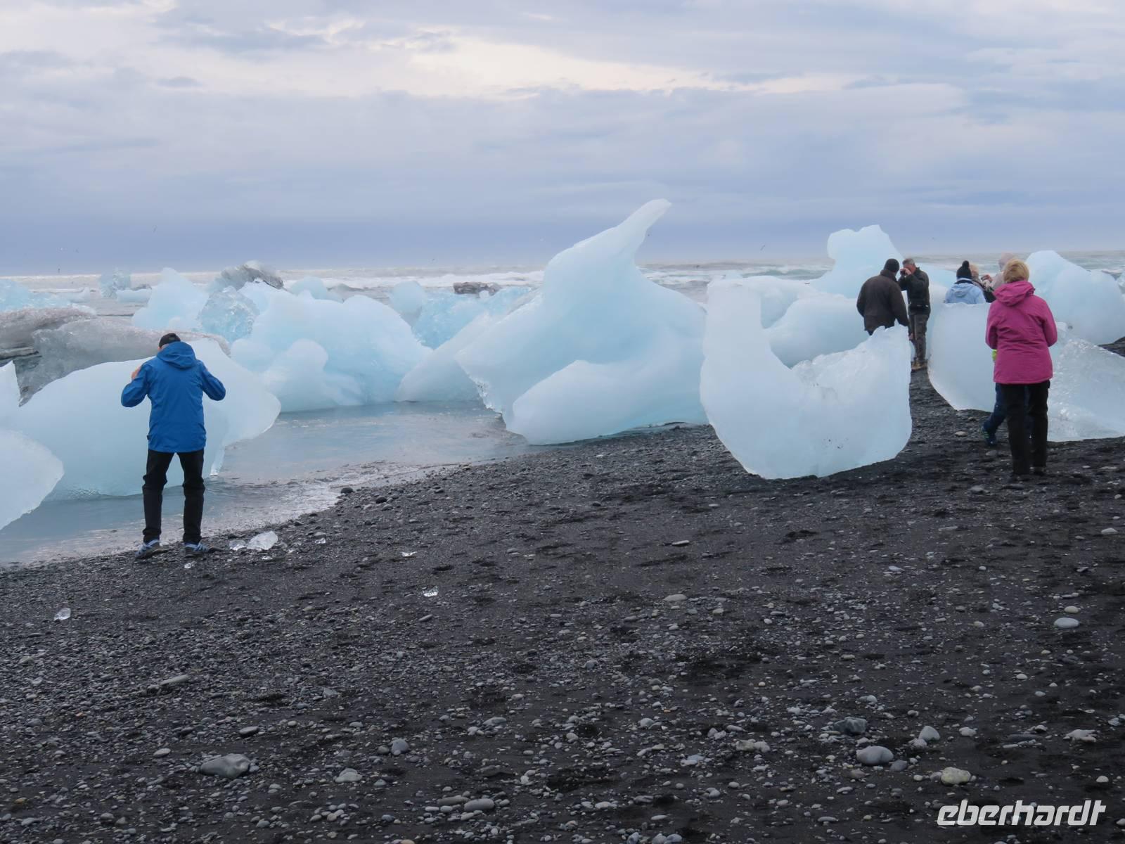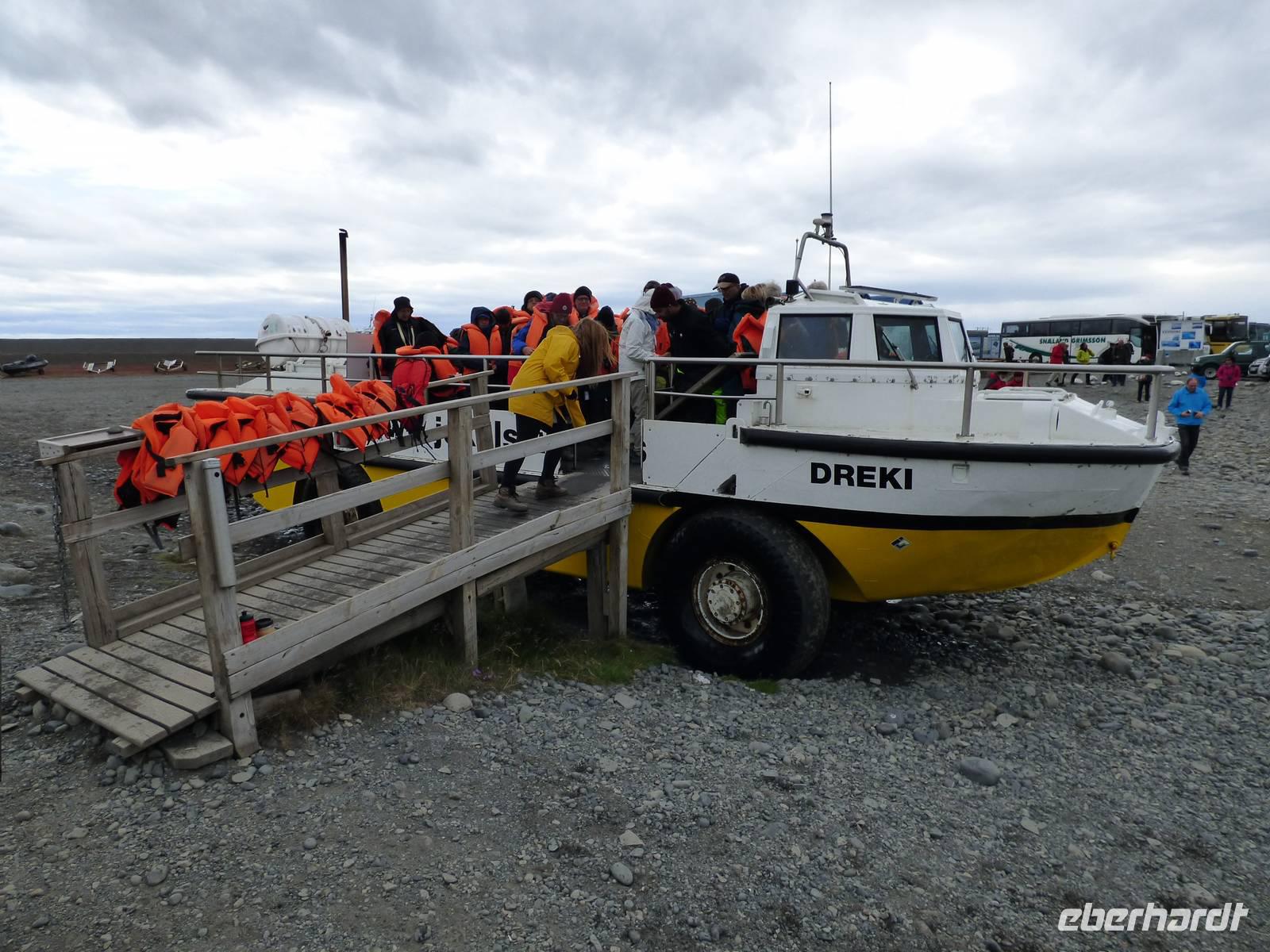 Am Morgen fuhren wir immer im Angesicht des großen Gletschers Vatnajökull und seiner höchsten Erhebung mit 2.110 Metern zur Gletscherlagune Jökulsarlon. Bereits kurz bevor wir den Parkplatz erreichten, sahen wir die großen Eisberge in der Lagune. Wir stiegen in ein Amphibien-Fahrzeug um und es ging direkt in die Lagune. Die Lagune bildete sich seit 1930, als sich der Gletscher zurück zog. Sie ist heute 25 km² groß. Das Eis bricht von der Gletscherzunge ab und landet als Berg oder Scholle in der Lagune. Es ist durch den Druck viel kompakter als anderes Eis und ist transparent. Es benötigt ca. 800 bis 1.200 Jahre bis es an der Gletscherzunge ankommt. So ist das Eis etwa 1.000 Jahre alt, wenn es in der Lagune schwimmt. Die blaue Farbe bekommt das Eis durch die Reflektion des Lichtes, wenn es als transparentes Eis aus dem Wasser kommt. Nach einiger Zeit mit Kontakt zur Luft bilden sich Eiskristalle und das Eis wird weiß. Wir probierten einen Brennevin - den typischen isländischen Schnaps - auf Eis aus der Lagune. Anschließend hatten wir noch etwas Zeit, für Fotos. Wir sahen auch einige Seelöwen. Direkt am Übergang der Lagune ins Meer befindet sich ein schwarzer Strand. Wir sahen die Eisschollen und Eisberge ins Meer schwimmen und an dem Strand lagen die Eisschollen auf dem Sand. Durch Ebbe und Flut ergeben sich diese Naturschauspiele. Ein unglaubliches Erlebnis - Eisschollen am Meeresstrand. Danach haben wir noch an der kleinen Lagune Fjällsarlon, welche sich gerade bildet, einen Fotostopp eingelegt. Hier blies der Wind sehr stark. Nach unserer Mittagspause war Svinafellsjökull unser nächstes Ziel. Die Gletscherzunge kommt sehr weit nach unten und bildet ebenfalls eine kleine Lagune. Wir sahen sehr schön das Eis in verschiedensten Farben und kamen recht nah an die Zunge heran. Am Nationalparkzentrum Skaftafell schauten wir uns einen Film über die Gletscher und den Ausbruch im Jahr 1996 an. Dann ging es durch ein großes Sandfeld, wo inzwischen sehr viel Wind aufgekommen war, weiter Richtung Süden. 1783 kam es zu einem der größten Spaltenausbrüche auf Island. In dessen Folge bildete sich ein 57 km² großes Lavafeld, welches wir durchquerten. Beeindruckende Landschaftformationen, welche heute mit Moos bewachsen sind fingen unsere Blicke ein. Nach einem Fotostopp mit schönem Blick auf Katla, den wohl gefährlichsten, aktiven Vulkan erreichten wir am frühen Abend Vik, wo wir im Hotel unsere Zimmer bezogen. Nach dem Abendessen spazierten wir durch den kleinen Ort zum Strand und einige entdecken sogar noch Papageientaucher - die putzigen Vögel mit den orangen Schäbeln.