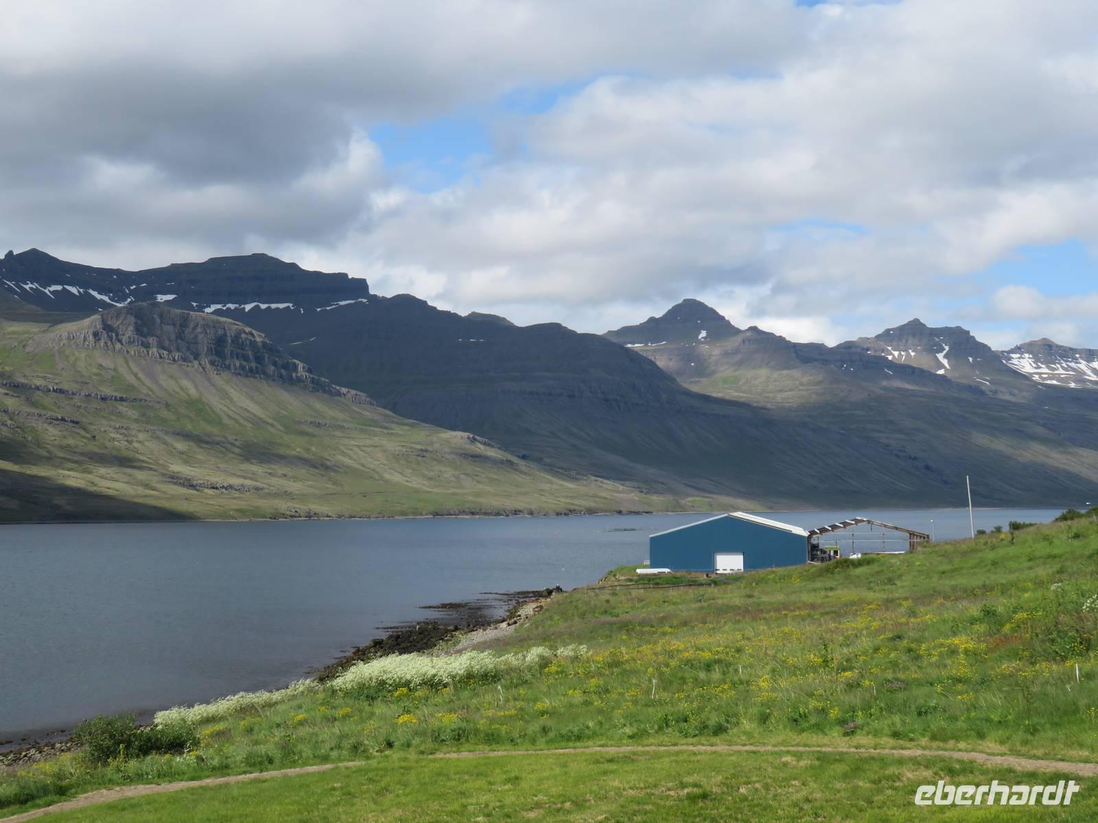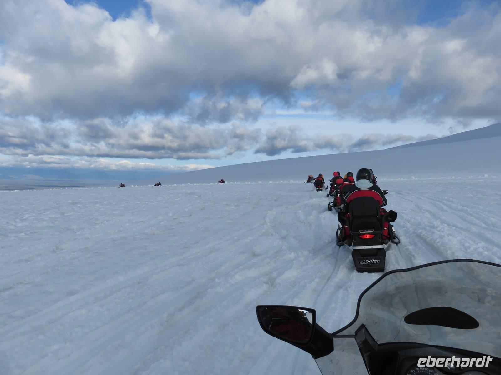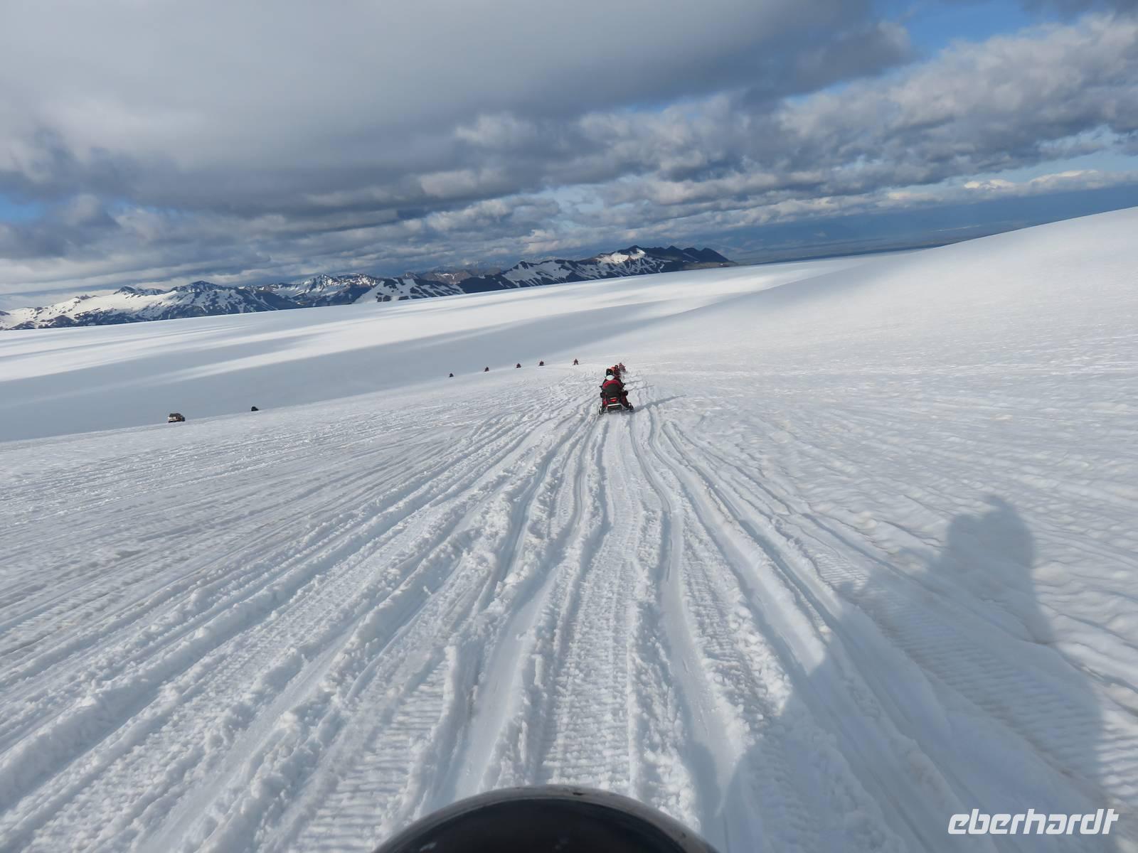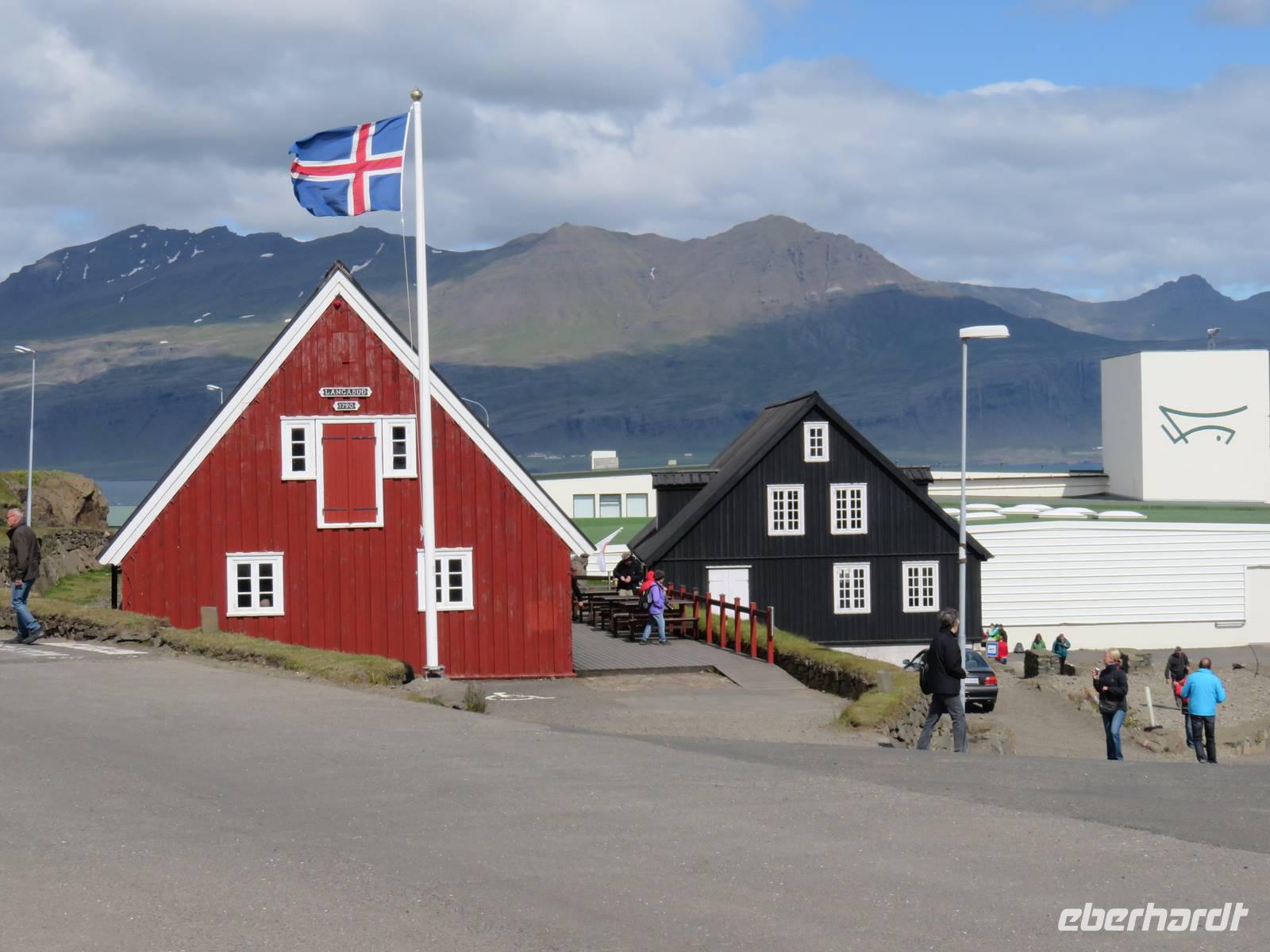 Heute setzten wir unsere Reise in Richtung Osten fort. Wir verließen Egilstadir und es ging zunächst zum Redjarfjord. Nach einem ersten Fotostopp am Fjord erreichten wir Stödvarfjördur. In dem kleinen Ort befindet sich Petras Steinhaus. Die Isländerin sammelte ihr ganzes Leben lang Steine in Island. Von ihren Wanderungen brachte sie diese mit in ihr Haus und legte im Haus und im Garten eine riesige Sammlung von tausenden Steinen an. All diese Kostbarkeiten konnten wir uns ansehen. Petra verstarb vor einigen Jahren, aber ihre Kinder und Enkelkinder führen das Haus weiter und so können sich Touristen aus aller Welt daran erfreuen. Wir waren beeindruckt von der Vielfalt und Farbenpracht der verschiedenen Gesteinsarten, die es in Island gibt. Nun ging es weiter immer entlang der Ostfjorde. Uns eröffneten sich immer wieder einmalig schöne Ausblicke über das Meer und die Küste. Unterwegs legten wir verschiedene Fotostopps ein. Mittags machten wir eine Pause im kleinen Ort Djupivogur. Der Fischerort liegt idyllisch in einer kleinen Bucht. Über die Küstenstraße mit einem weiteren kurzen Fotostopp an einem Leuchtturm fuhren wir Richtung Süden. Am Leuchtturm merkten wir, welche Kraft der Wind hat. Hier blies er besonders stark und wir kamen uns vor, wie im Winter. Am Nachmittag erreichten wir Höfn. Wir bezogen rasch unsere Zimmer im Hotel Höfn und dann erwartete uns schon das nächste Abenteuer. Fast alle Gäste hatten sich zur Teilnahme an einem Ausflug auf den Gletscher Vatnajökull entschieden. Mit zwei Kleinbussen wurden wir am Hotel abgeholt. Zunächst ging es durch eine spektakuläre Landschaft, die der Gletscher geformt hatte, auf 1.400 Meter Höhe zur Basisstation. Nun stiegen wir in Jeeps oder auf Motorschlitten um. Die Motorschlittenfahrer wurden mit einem warmen Overall, Helm und Gummistiefeln ausgerüstet. Nach einer kurzen Einweisung begann der Fahrspaß. Es machte riesigen Spaß mit den Motorschlitten über die Schneefläche zu fahren. Unterwergs legten wir zwei Stopps ein. Unser Guide lieferte uns einige Fakten zum größten Gletscher Europas außerhalb von Grönland: Der Gletscher Vatnajökull hat eine Fläche von über 8.100 km², ist in der Nord-Süd-Ausdehnung 90 km lang und in der Ost-West-Ausdehnung 140 km breit. Wir waren auf einer Höhe von 1.700 Metern und standen auf einer 400 Meter dicken Eisschicht. Die stärkste Eisdecke ist 1.000 Meter dick. Wir genossen bei traumhaftem Wetter den Ausblick über den Gletscher in die Berge und hinunter zum Meer. Es war atemberaubend. Nun hieß es schon wieder umkehren und zurück zur Station zu fahren. Die Rückfahrt ging etwas schneller, denn jeder gab etwas mehr Gas und traute sich etwas mehr Geschwindigkeit zu. Allerdings empfanden wir 45 km/h schon als recht schnell. Begeistert erreichten wir die Station, kleideten uns um und bestiegen wieder die Kleinbusse. Wir fuhren die gleiche Strecke zurück und ließen unsere Blicke nochmals über die einzigartige Landschaft schweifen. Im Hotel wurden wir mit einem fantastische Abendessen erwartet. Ein wunderschöner Tag ging zu Ende!