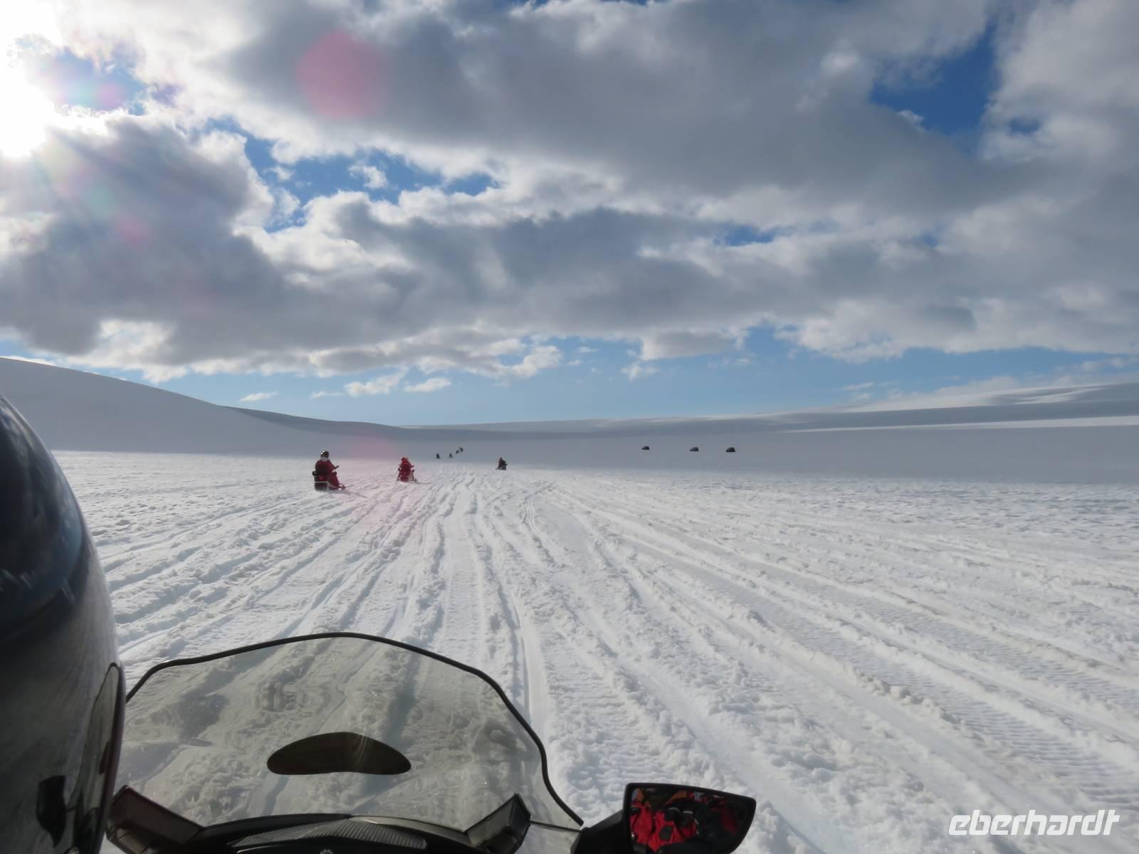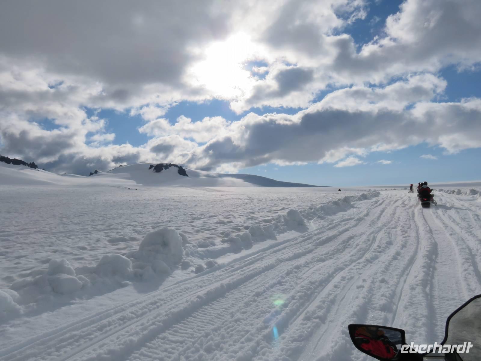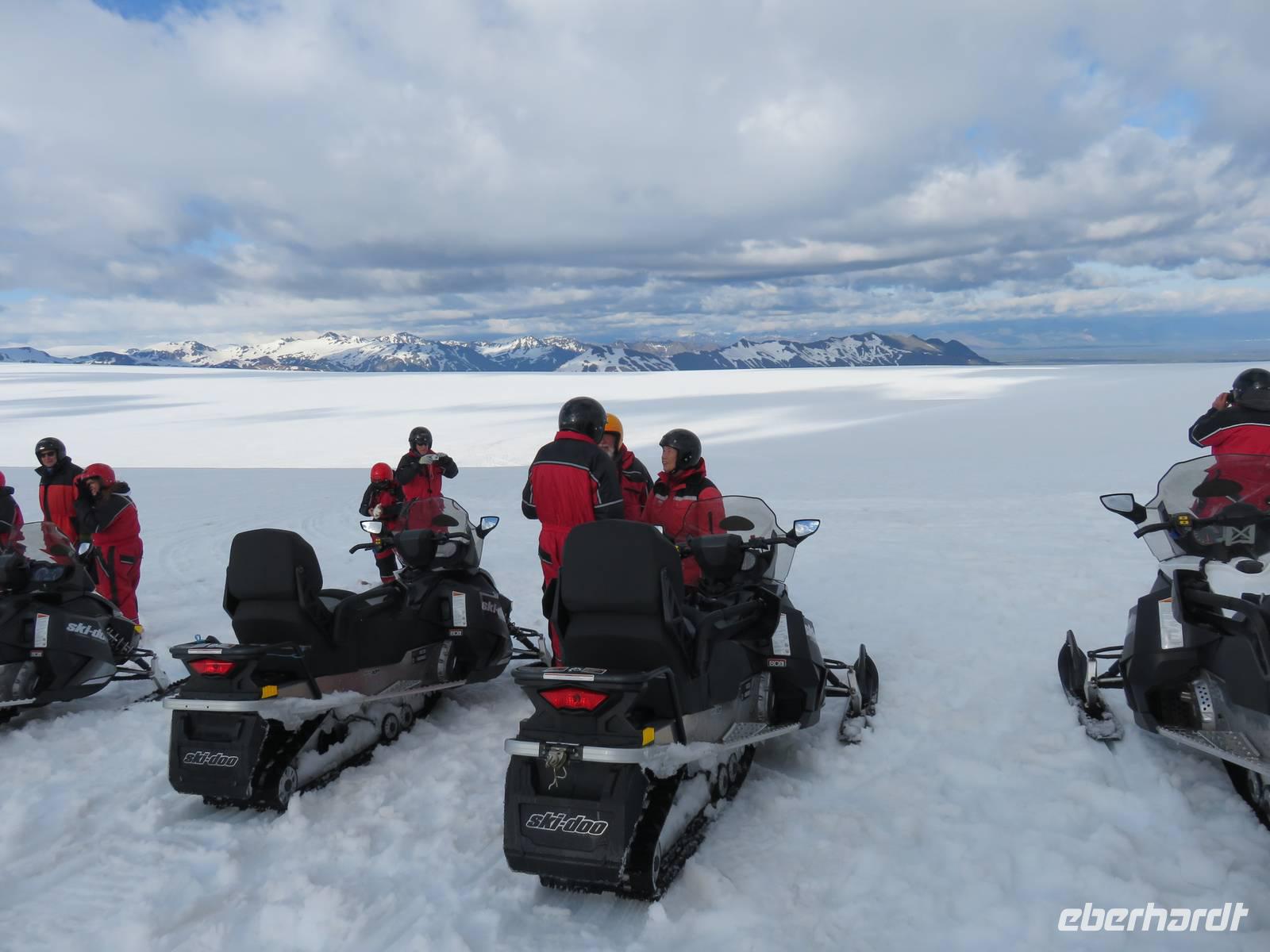Heute setzten wir unsere Reise in Richtung Osten fort. Wir verließen Egilstadir und es ging zunächst zum Redjarfjord. Nach einem ersten Fotostopp am Fjord erreichten wir Stödvarfjördur. In dem kleinen Ort befindet sich Petras Steinhaus. Die Isländerin sammelte ihr ganzes Leben lang Steine in Island. Von ihren Wanderungen brachte sie diese mit in ihr Haus und legte im Haus und im Garten eine riesige Sammlung von tausenden Steinen an. All diese Kostbarkeiten konnten wir uns ansehen. Petra verstarb vor einigen Jahren, aber ihre Kinder und Enkelkinder führen das Haus weiter und so können sich Touristen aus aller Welt daran erfreuen. Wir waren beeindruckt von der Vielfalt und Farbenpracht der verschiedenen Gesteinsarten, die es in Island gibt. Nun ging es weiter immer entlang der Ostfjorde. Uns eröffneten sich immer wieder einmalig schöne Ausblicke über das Meer und die Küste. Unterwegs legten wir verschiedene Fotostopps ein. Mittags machten wir eine Pause im kleinen Ort Djupivogur. Der Fischerort liegt idyllisch in einer kleinen Bucht. Über die Küstenstraße mit einem weiteren kurzen Fotostopp an einem Leuchtturm fuhren wir Richtung Süden. Am Leuchtturm merkten wir, welche Kraft der Wind hat. Hier blies er besonders stark und wir kamen uns vor, wie im Winter. Am Nachmittag erreichten wir Höfn. Wir bezogen rasch unsere Zimmer im Hotel Höfn und dann erwartete uns schon das nächste Abenteuer. Fast alle Gäste hatten sich zur Teilnahme an einem Ausflug auf den Gletscher Vatnajökull entschieden. Mit zwei Kleinbussen wurden wir am Hotel abgeholt. Zunächst ging es durch eine spektakuläre Landschaft, die der Gletscher geformt hatte, auf 1.400 Meter Höhe zur Basisstation. Nun stiegen wir in Jeeps oder auf Motorschlitten um. Die Motorschlittenfahrer wurden mit einem warmen Overall, Helm und Gummistiefeln ausgerüstet. Nach einer kurzen Einweisung begann der Fahrspaß. Es machte riesigen Spaß mit den Motorschlitten über die Schneefläche zu fahren. Unterwergs legten wir zwei Stopps ein. Unser Guide lieferte uns einige Fakten zum größten Gletscher Europas außerhalb von Grönland: Der Gletscher Vatnajökull hat eine Fläche von über 8.100 km², ist in der Nord-Süd-Ausdehnung 90 km lang und in der Ost-West-Ausdehnung 140 km breit. Wir waren auf einer Höhe von 1.700 Metern und standen auf einer 400 Meter dicken Eisschicht. Die stärkste Eisdecke ist 1.000 Meter dick. Wir genossen bei traumhaftem Wetter den Ausblick über den Gletscher in die Berge und hinunter zum Meer. Es war atemberaubend. Nun hieß es schon wieder umkehren und zurück zur Station zu fahren. Die Rückfahrt ging etwas schneller, denn jeder gab etwas mehr Gas und traute sich etwas mehr Geschwindigkeit zu. Allerdings empfanden wir 45 km/h schon als recht schnell. Begeistert erreichten wir die Station, kleideten uns um und bestiegen wieder die Kleinbusse. Wir fuhren die gleiche Strecke zurück und ließen unsere Blicke nochmals über die einzigartige Landschaft schweifen. Im Hotel wurden wir mit einem fantastische Abendessen erwartet. Ein wunderschöner Tag ging zu Ende!