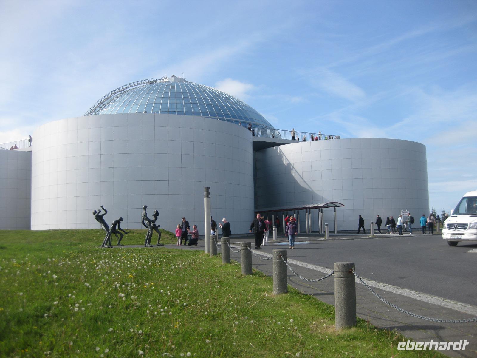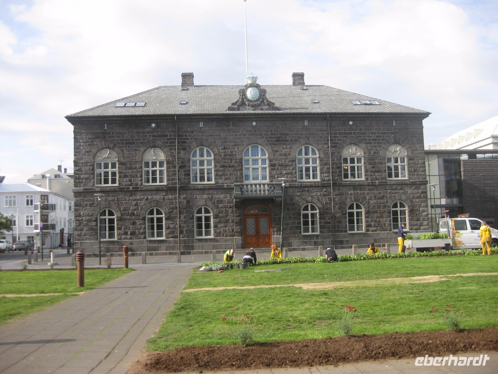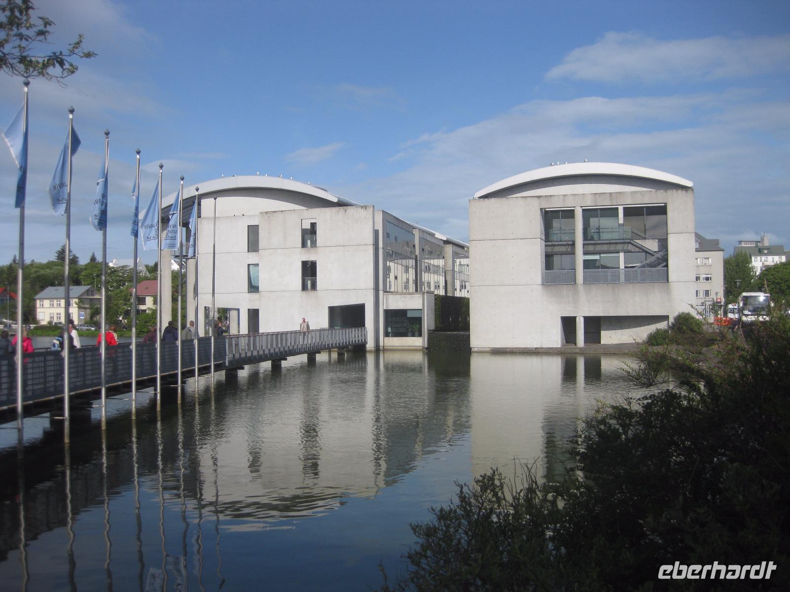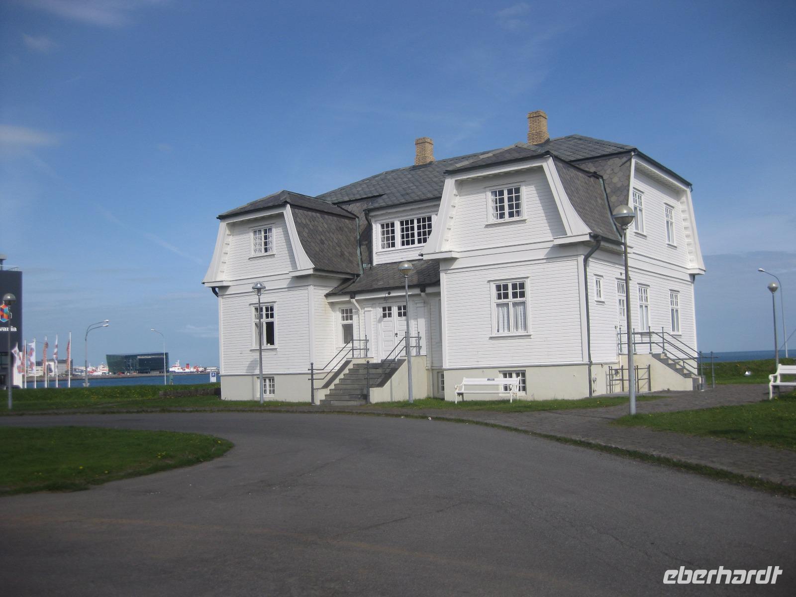 Nach dem Frühstück treffen wir Berglind und wir starten zu einem kleinen ersten Stadtrundgang zu Fuß. Wir sehen das älteste Haus Reykjaviks, Statuen berühmter Isländer, das Parlamentsgebäude, die evangelisch-lutherische Domkirche und das Rathaus und wir tauschen auf der Bank unsere Euro in Isländische Kronen. Dann erwartet uns der Bus und wir starten zu unserer Fahrt auf dem "Goldenen Kreis". Ehe wir Reykjavik verlassen besuchen wir noch das kleine weiße Gästehaus "Höfdi". Hier trafen sich im Jahr 1986 Gorbatschow und Reagan und läuteten das Ende des Kalten Krieges ein.