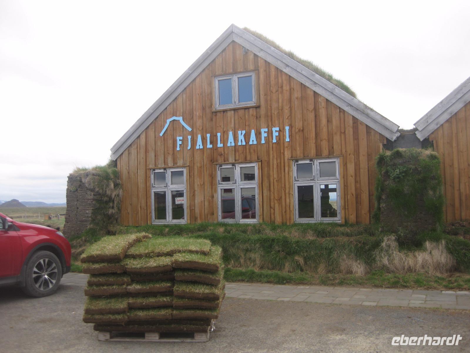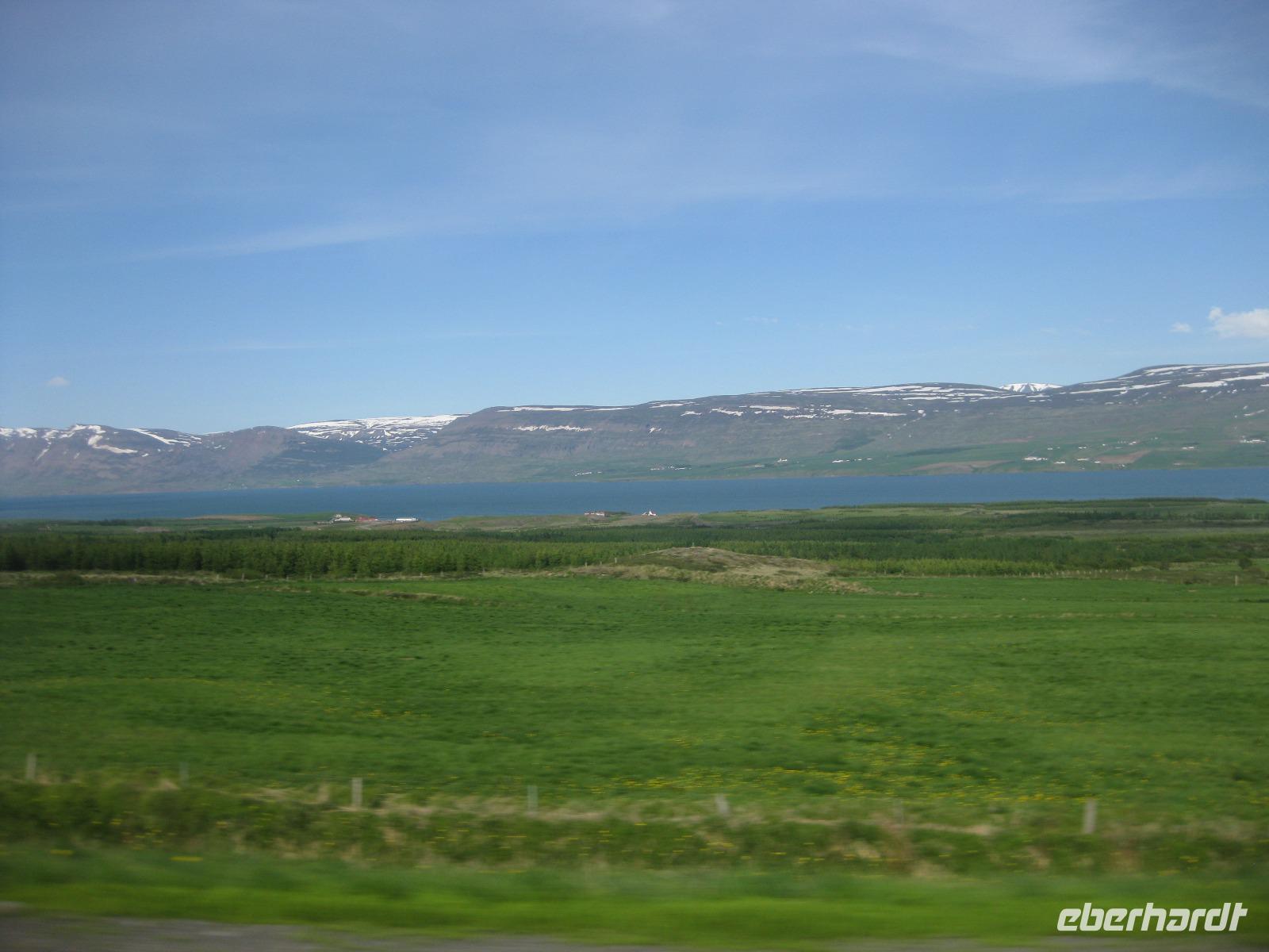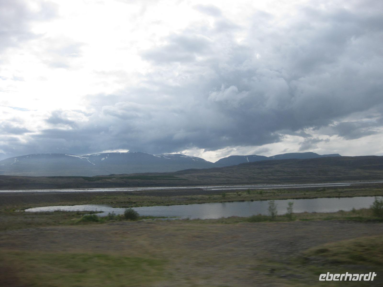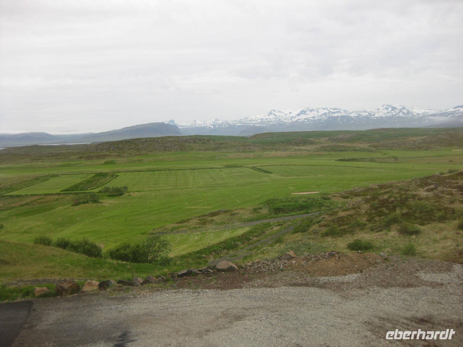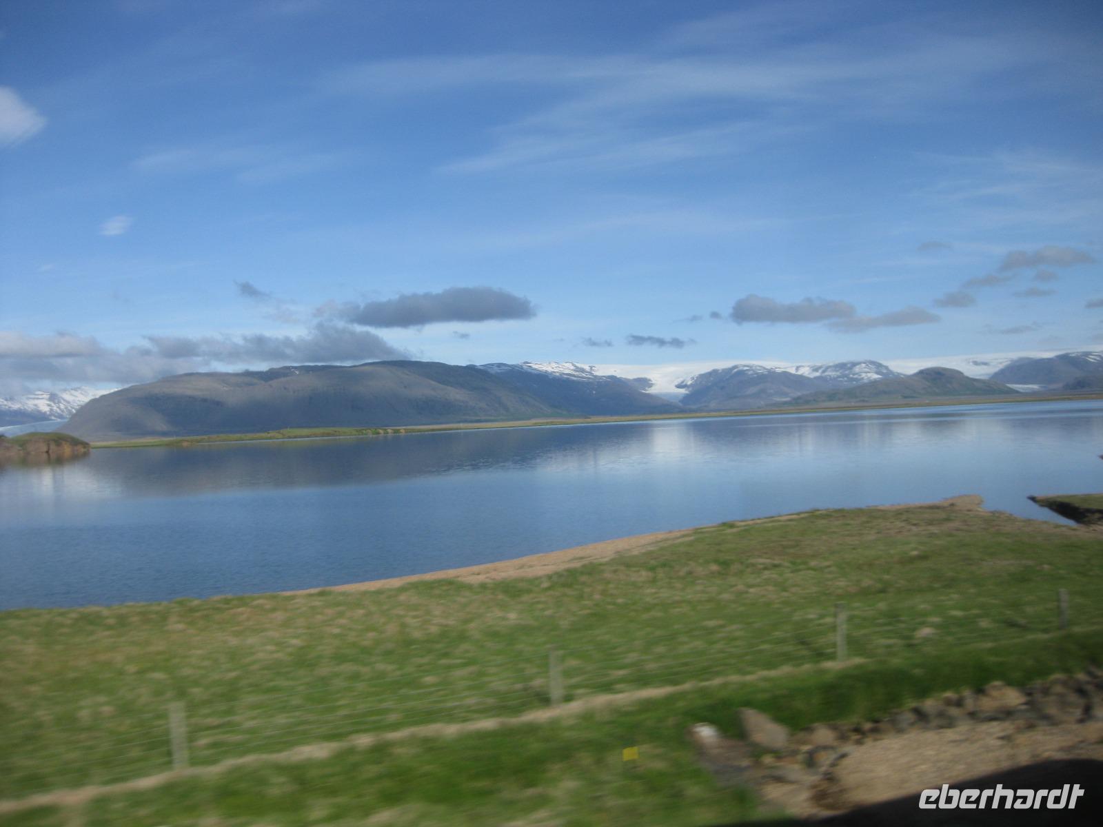 Weiter geht unsere Fahrt über die Hochebene. Und je weiter wir nach Norden kommen um so besser wird das Wetter. Es ist kühl, aber die Sonne scheint. Die Welt sieht gleich viel freundlicher aus. In der Raststätte am Hrutafjördur machen wir Mittagspause. Hier gibt es unter anderem sehr leckere frische Lachsbrötchen. Gut gestärkt setzen wir unsere Fahrt fort.