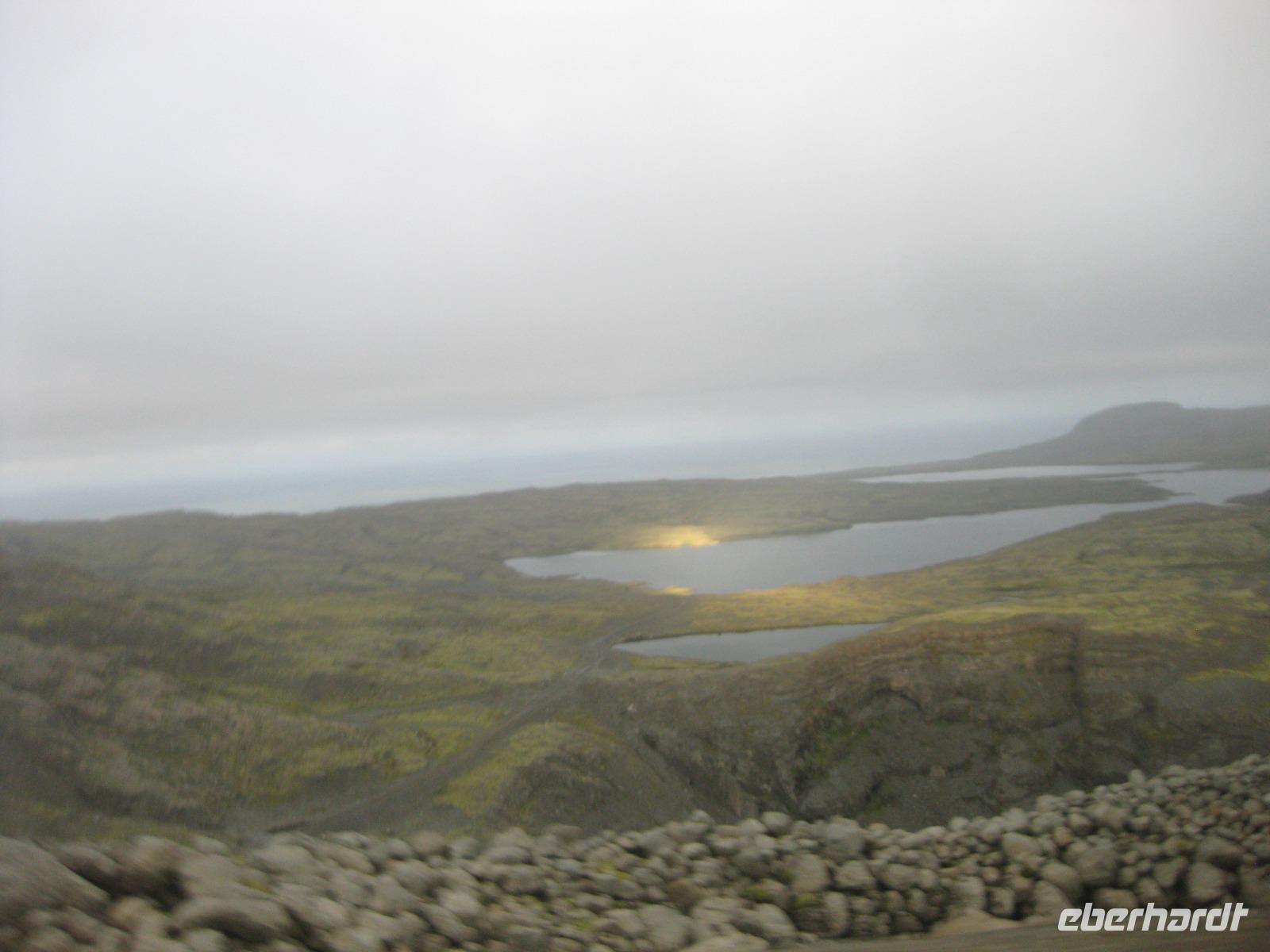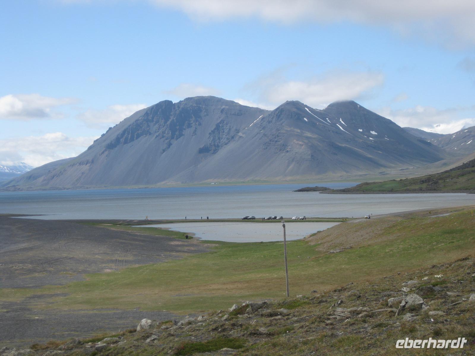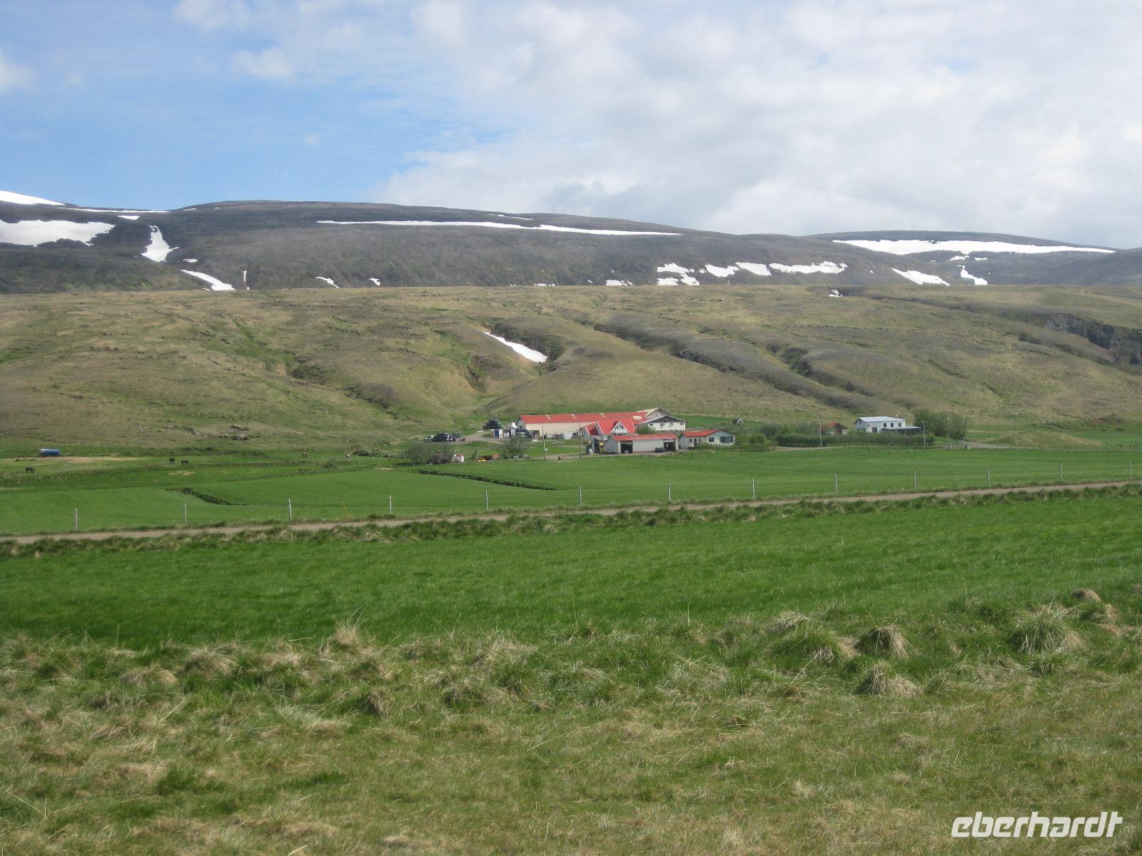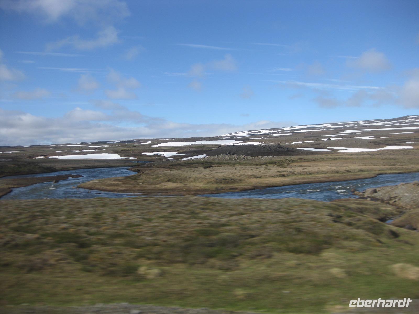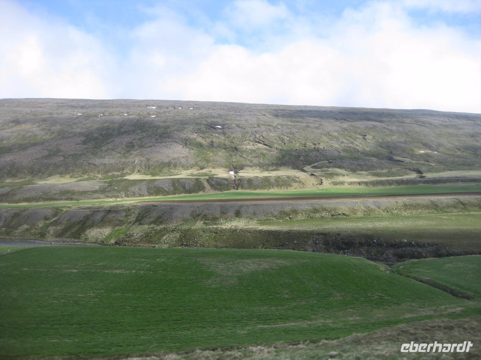 Weiter geht unsere Fahrt über die Hochebene. Und je weiter wir nach Norden kommen um so besser wird das Wetter. Es ist kühl, aber die Sonne scheint. Die Welt sieht gleich viel freundlicher aus. In der Raststätte am Hrutafjördur machen wir Mittagspause. Hier gibt es unter anderem sehr leckere frische Lachsbrötchen. Gut gestärkt setzen wir unsere Fahrt fort.