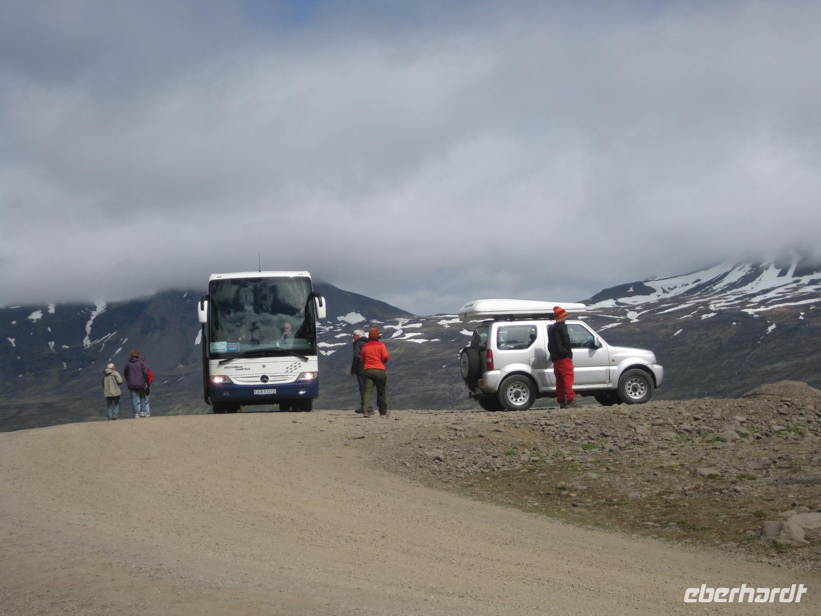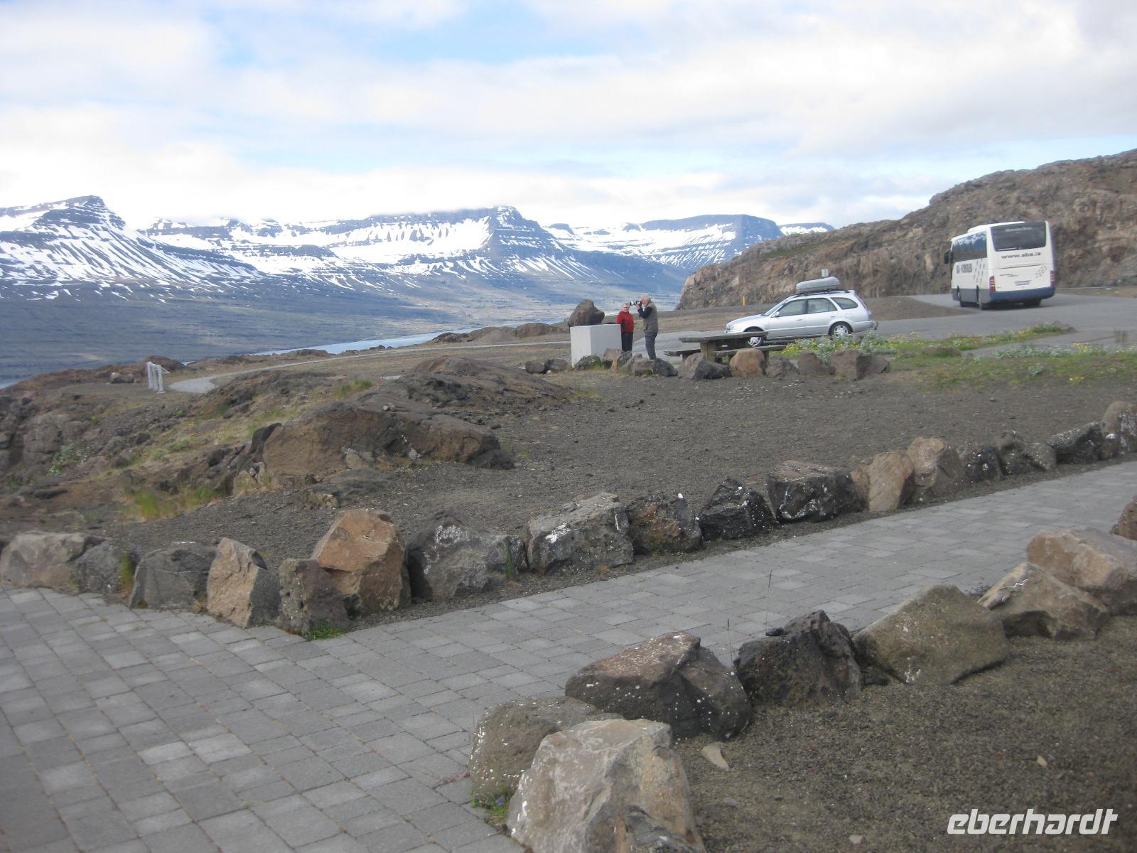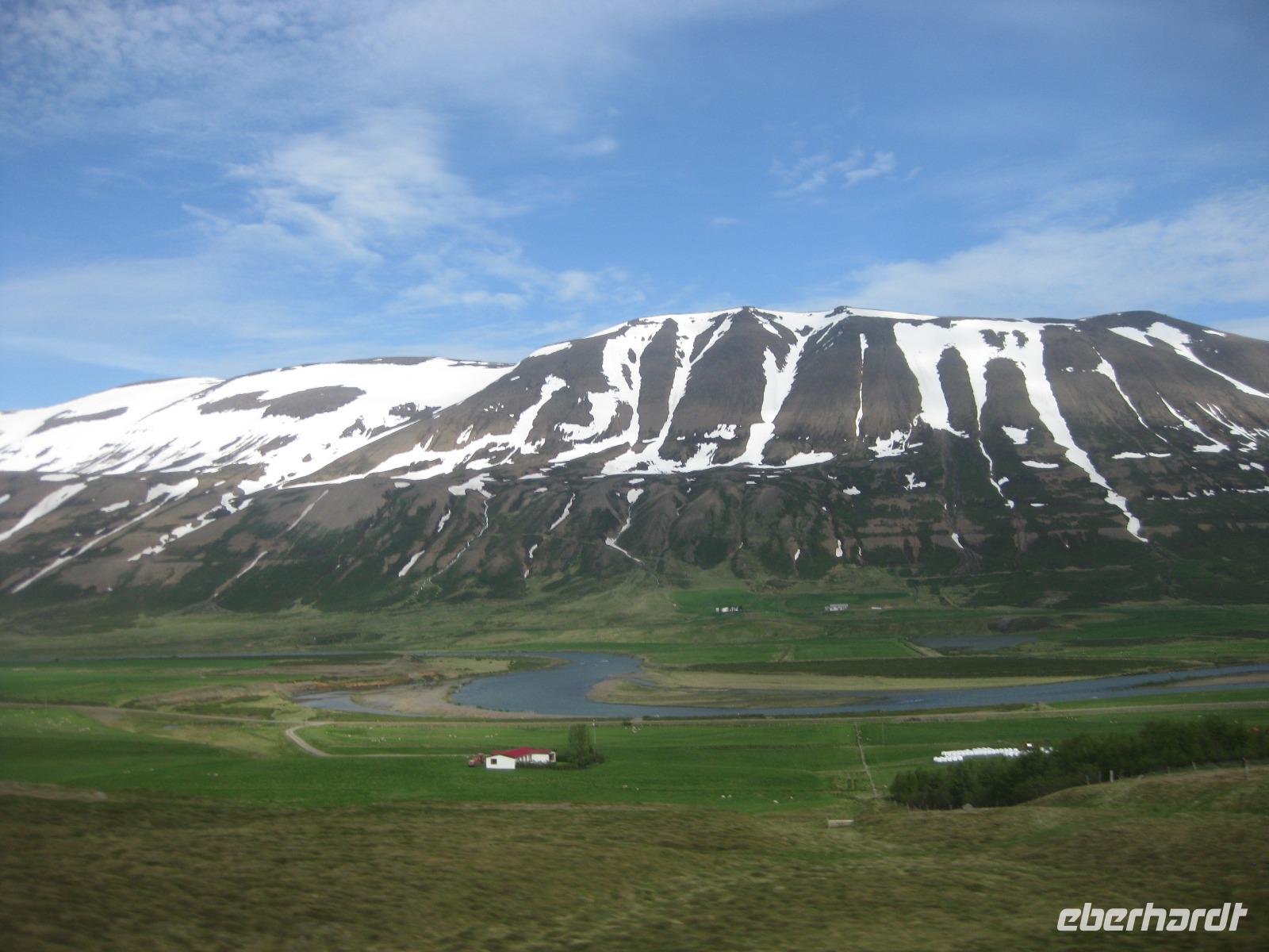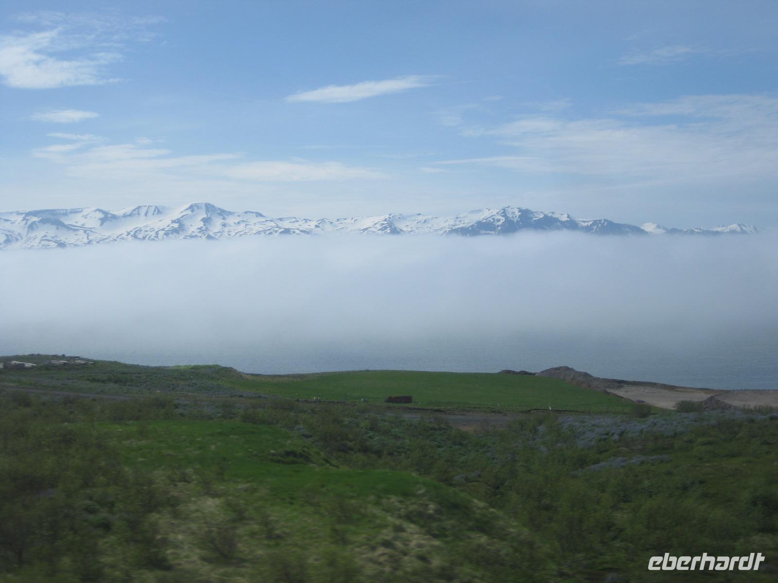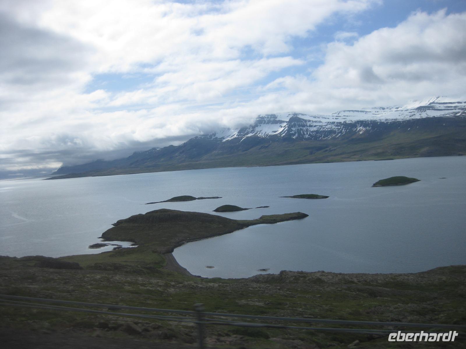 Weiter geht unsere Fahrt über die Hochebene. Und je weiter wir nach Norden kommen um so besser wird das Wetter. Es ist kühl, aber die Sonne scheint. Die Welt sieht gleich viel freundlicher aus. In der Raststätte am Hrutafjördur machen wir Mittagspause. Hier gibt es unter anderem sehr leckere frische Lachsbrötchen. Gut gestärkt setzen wir unsere Fahrt fort.