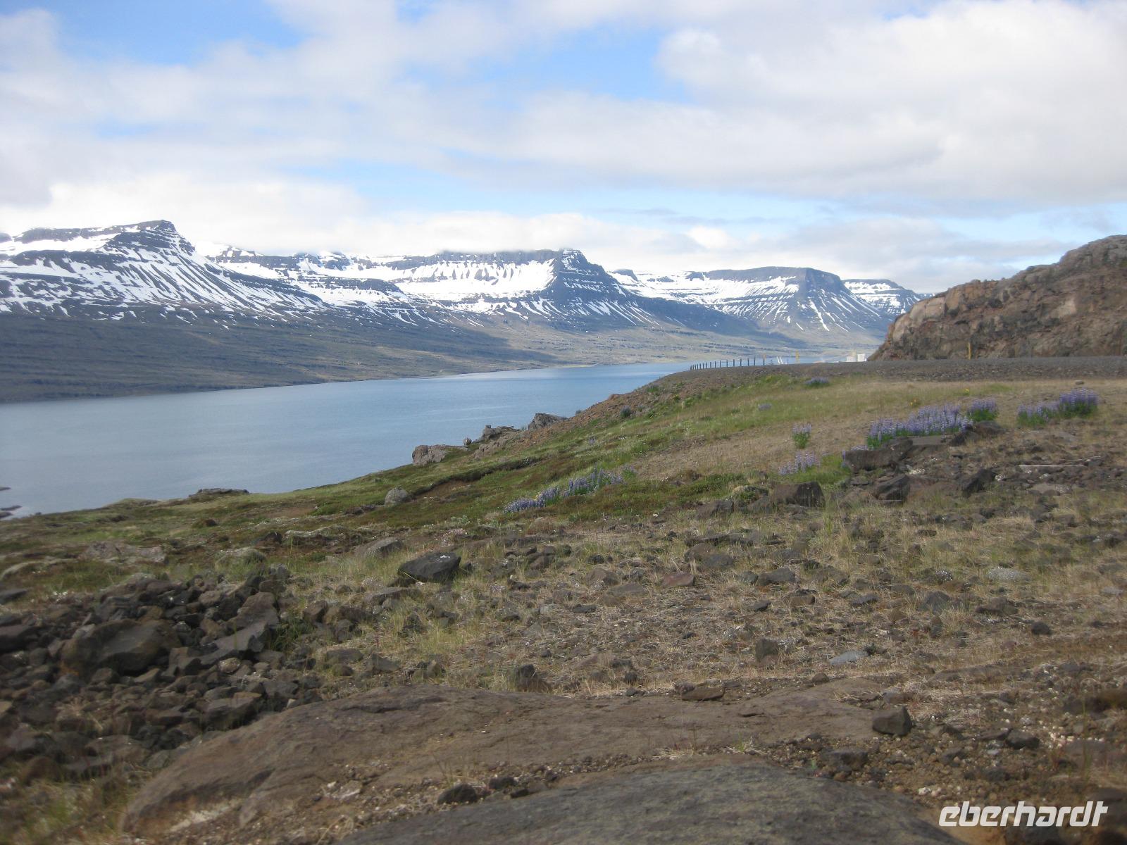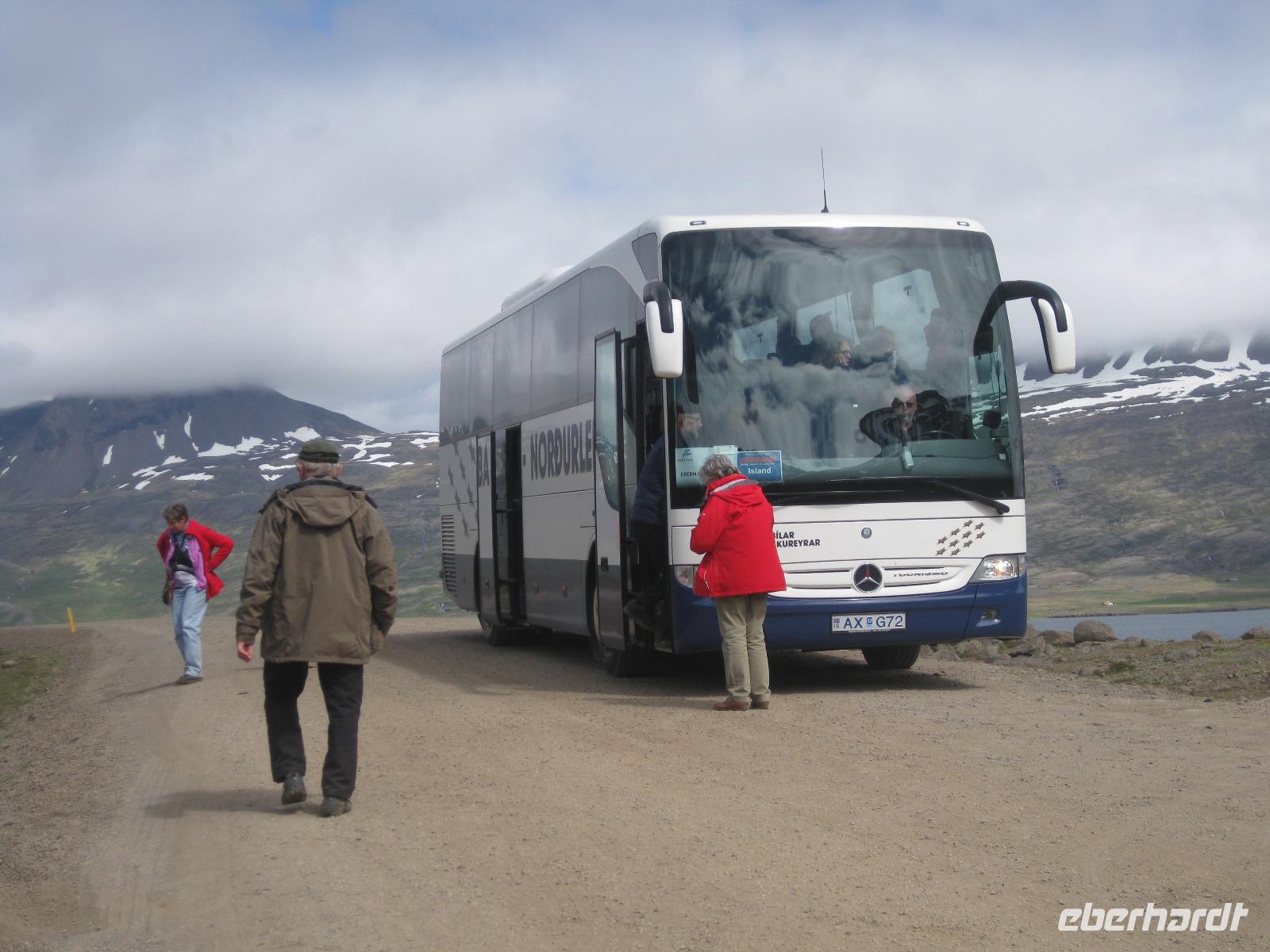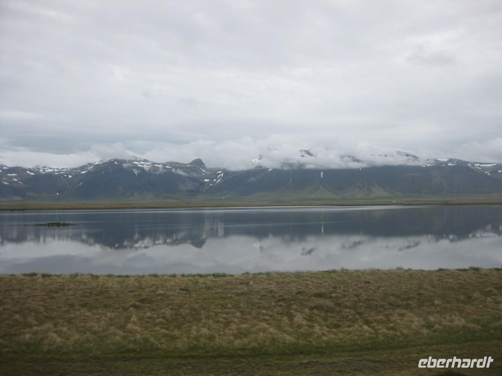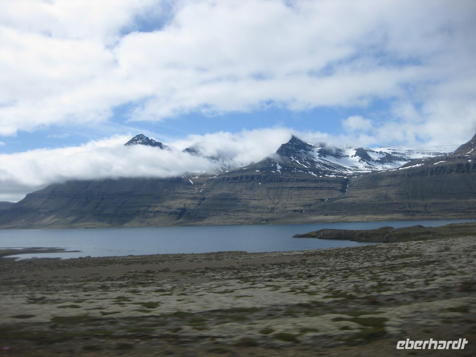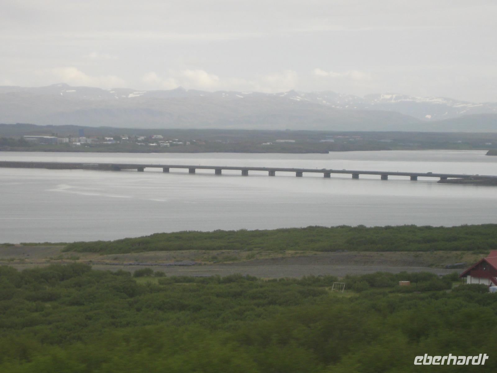 Weiter geht unsere Fahrt über die Hochebene. Und je weiter wir nach Norden kommen um so besser wird das Wetter. Es ist kühl, aber die Sonne scheint. Die Welt sieht gleich viel freundlicher aus. In der Raststätte am Hrutafjördur machen wir Mittagspause. Hier gibt es unter anderem sehr leckere frische Lachsbrötchen. Gut gestärkt setzen wir unsere Fahrt fort.