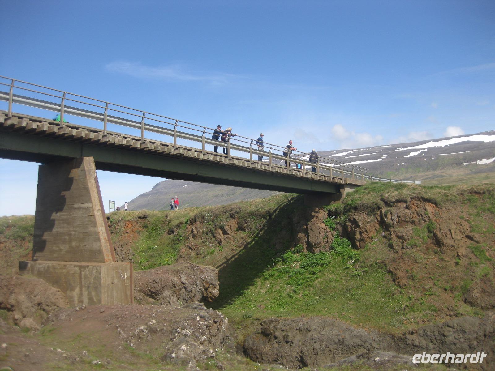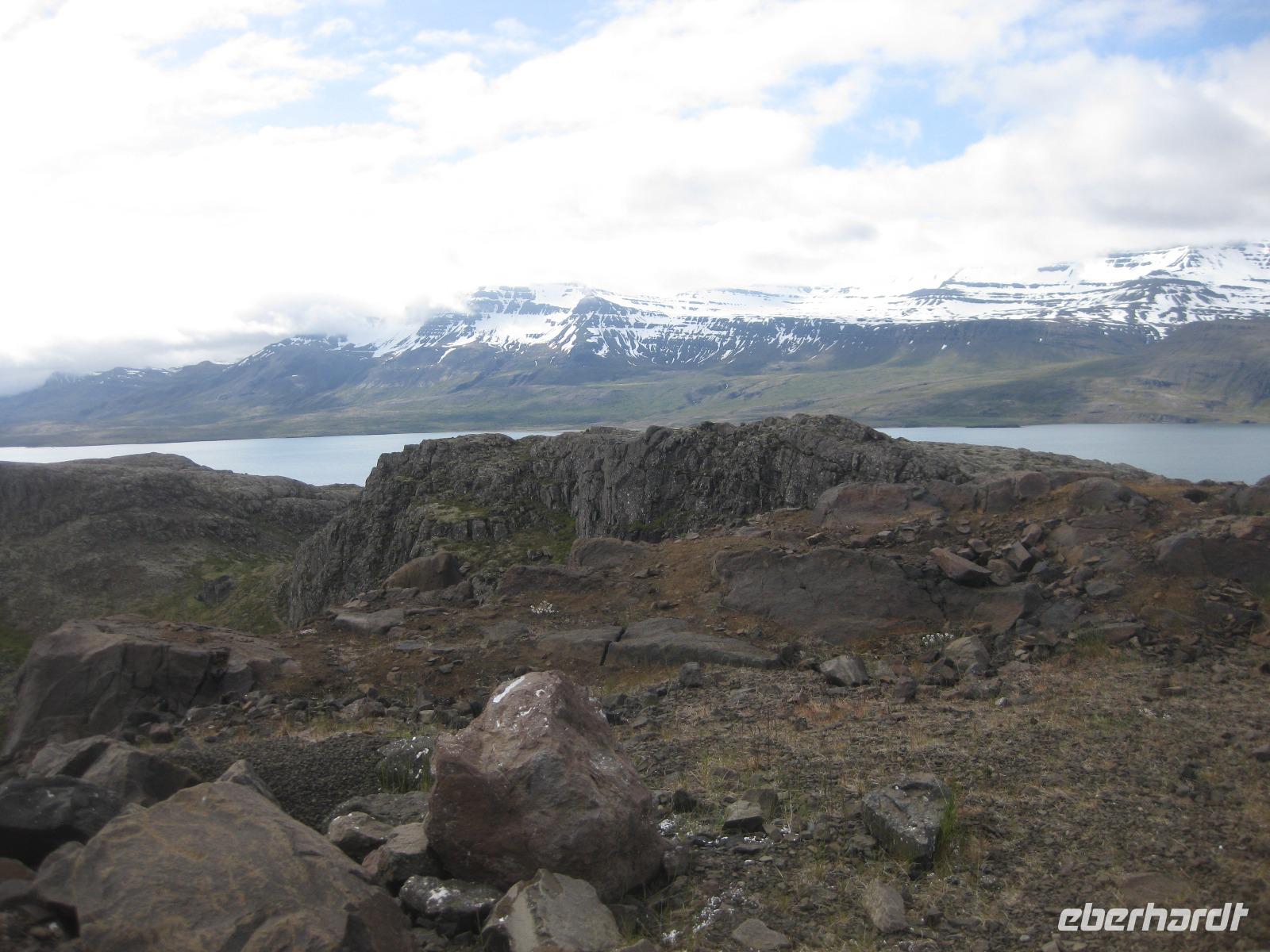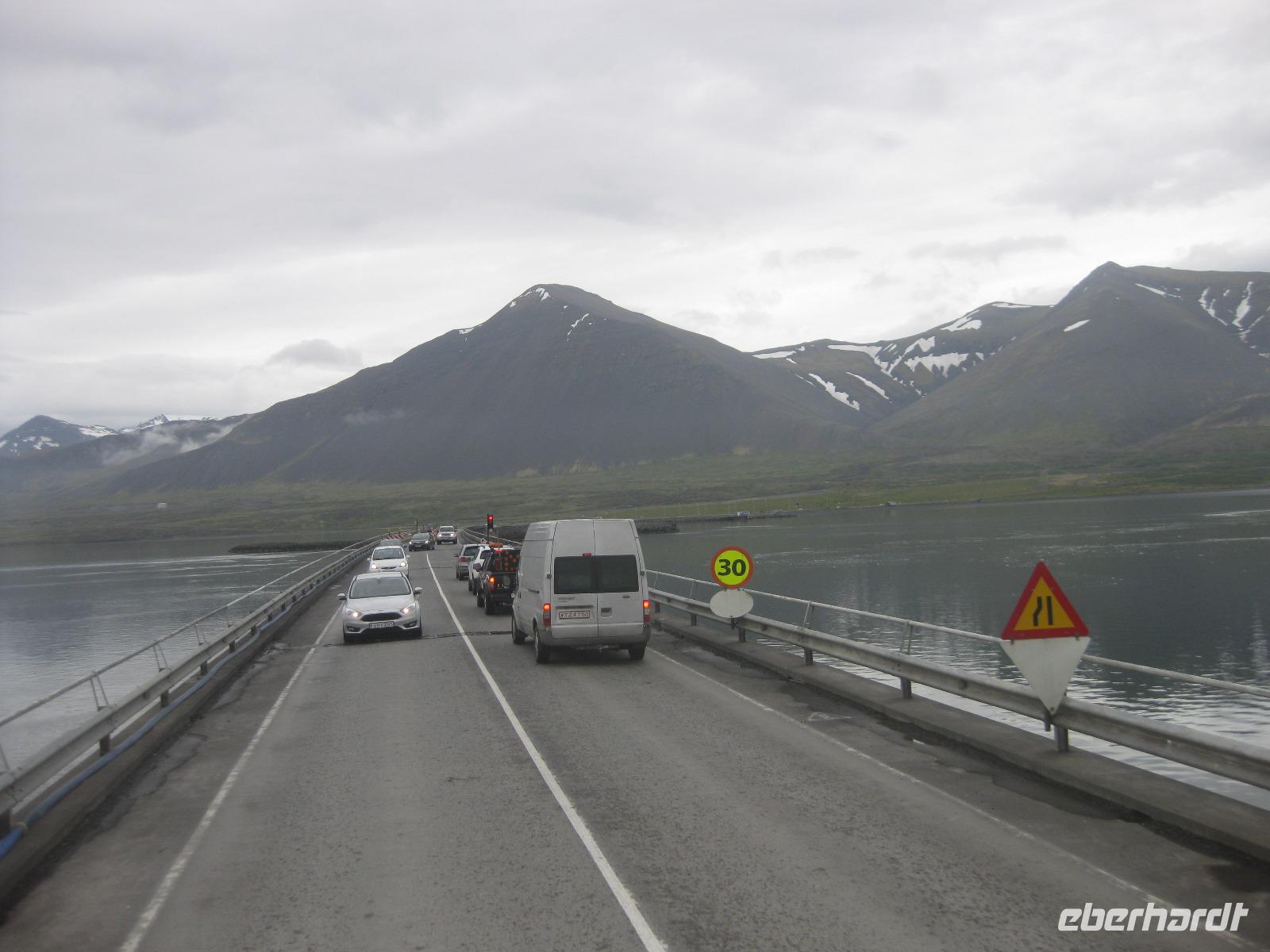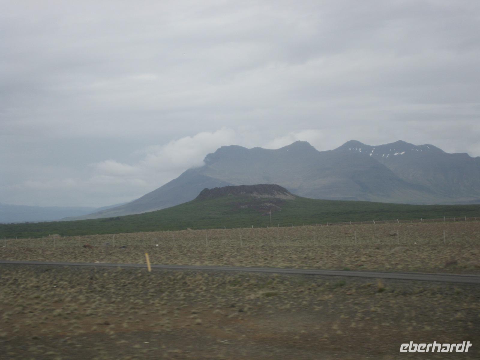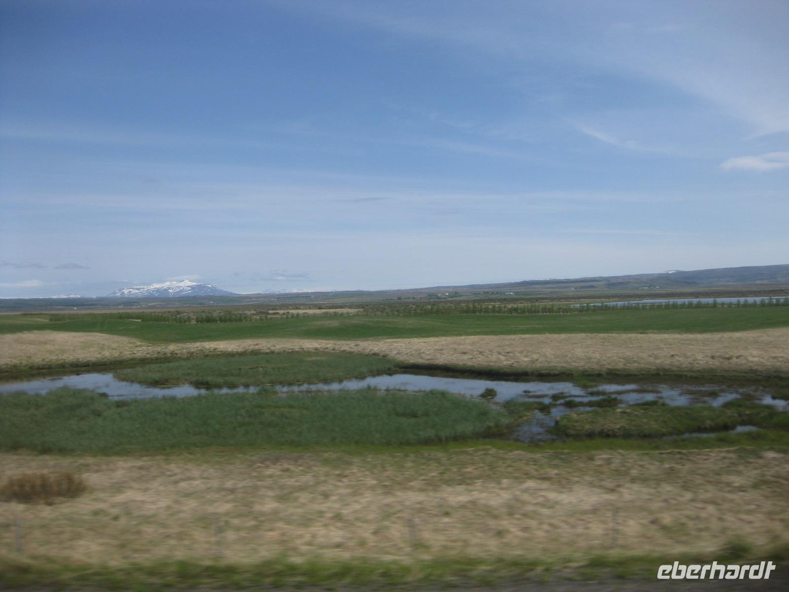 Weiter geht unsere Fahrt über die Hochebene. Und je weiter wir nach Norden kommen um so besser wird das Wetter. Es ist kühl, aber die Sonne scheint. Die Welt sieht gleich viel freundlicher aus. In der Raststätte am Hrutafjördur machen wir Mittagspause. Hier gibt es unter anderem sehr leckere frische Lachsbrötchen. Gut gestärkt setzen wir unsere Fahrt fort.