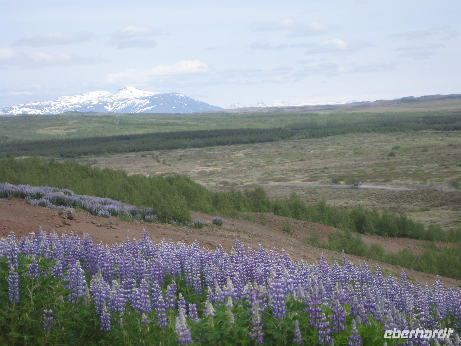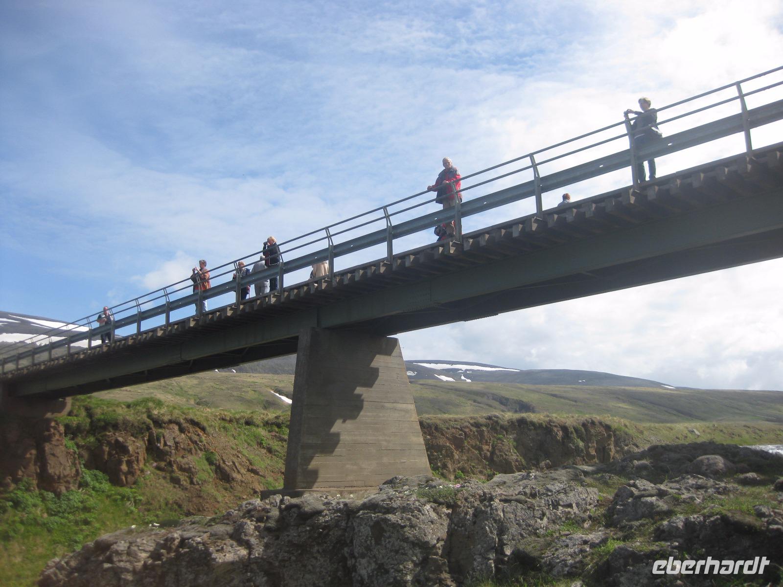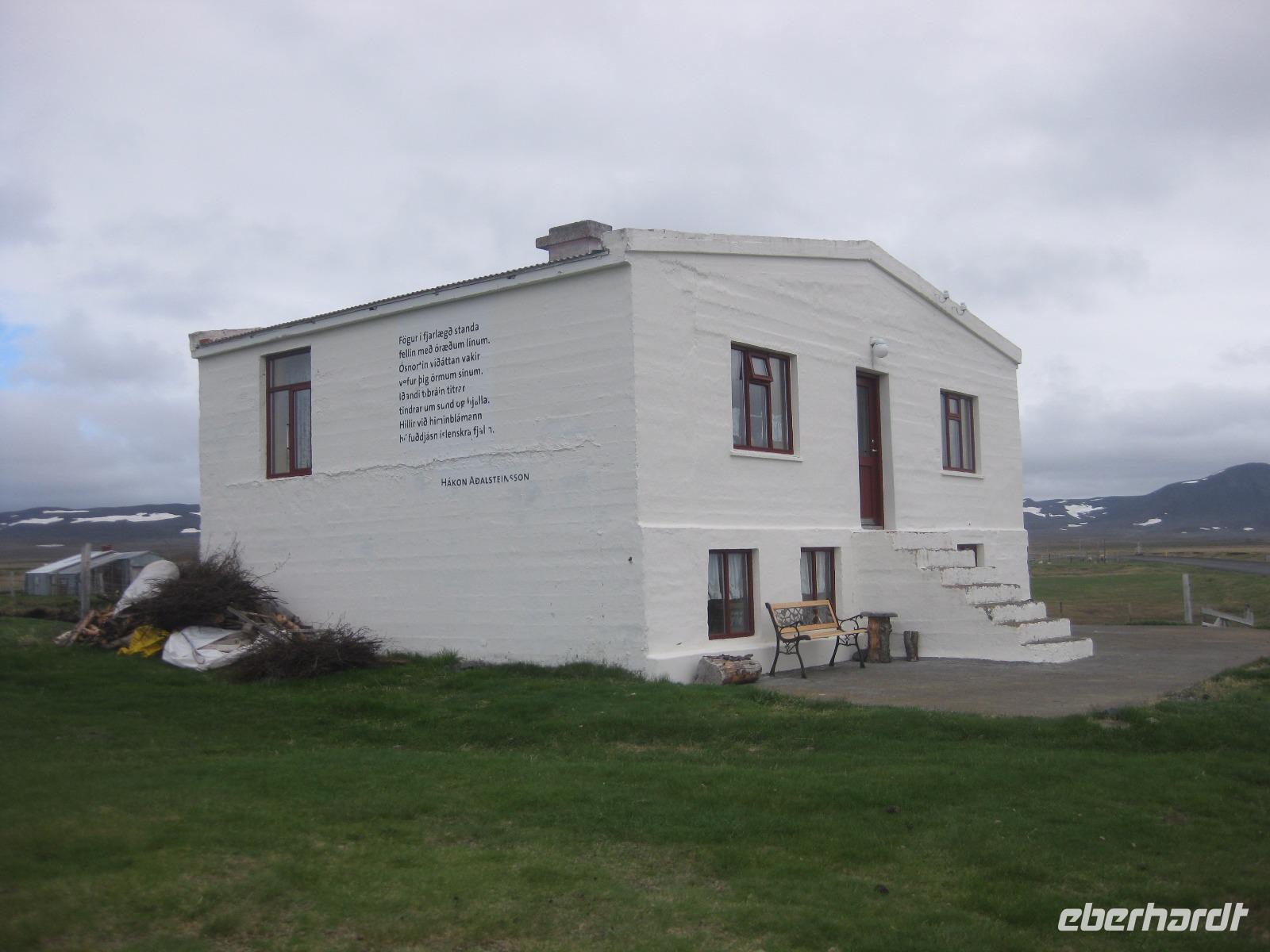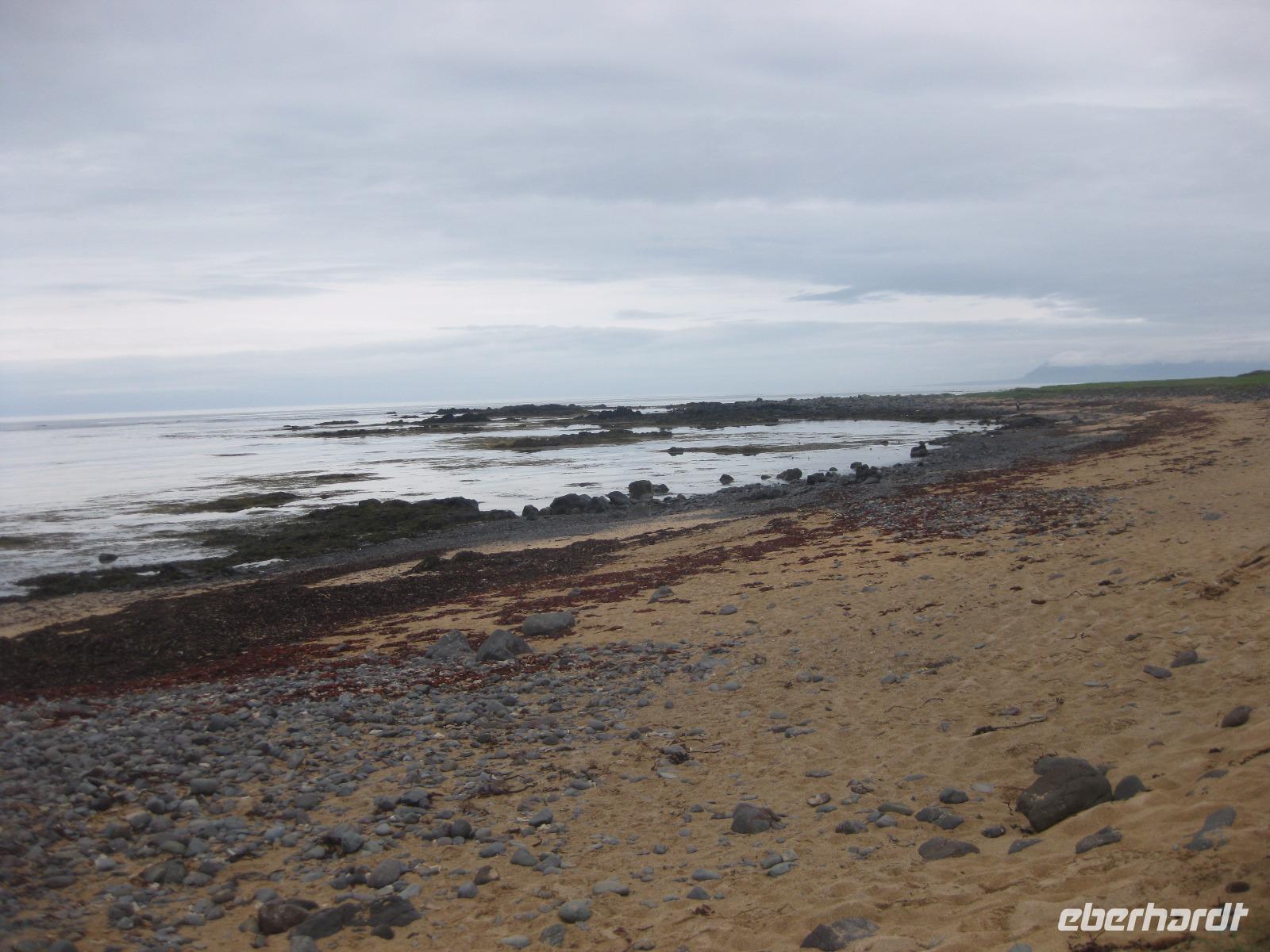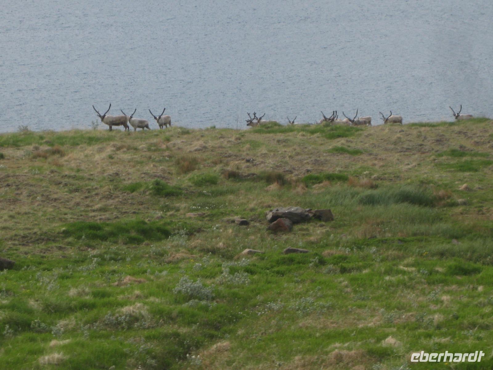 Weiter geht unsere Fahrt über die Hochebene. Und je weiter wir nach Norden kommen um so besser wird das Wetter. Es ist kühl, aber die Sonne scheint. Die Welt sieht gleich viel freundlicher aus. In der Raststätte am Hrutafjördur machen wir Mittagspause. Hier gibt es unter anderem sehr leckere frische Lachsbrötchen. Gut gestärkt setzen wir unsere Fahrt fort.