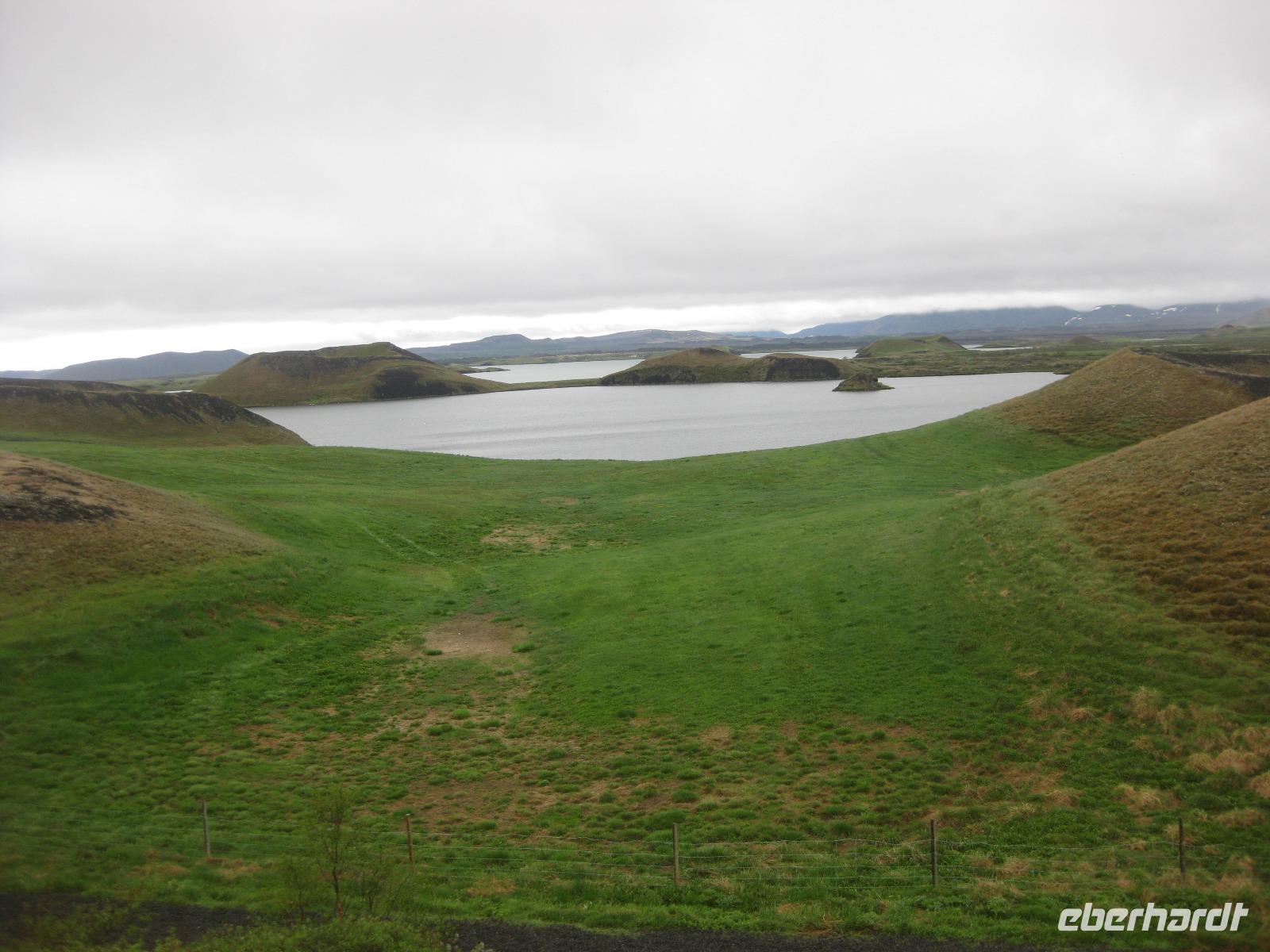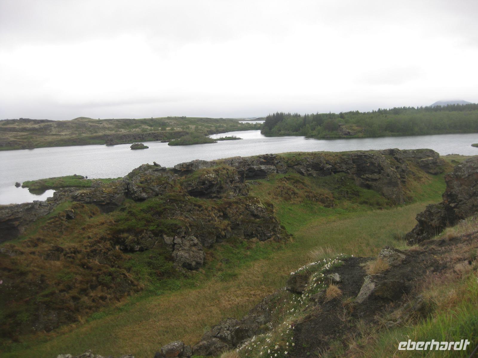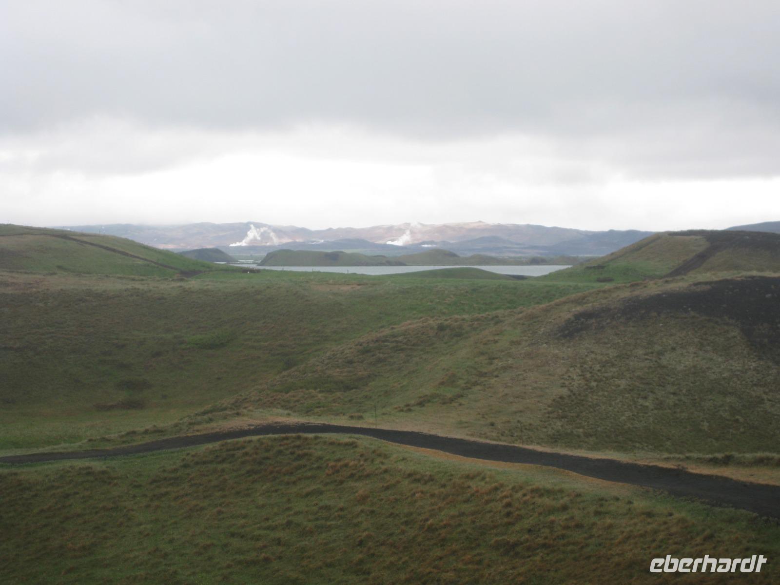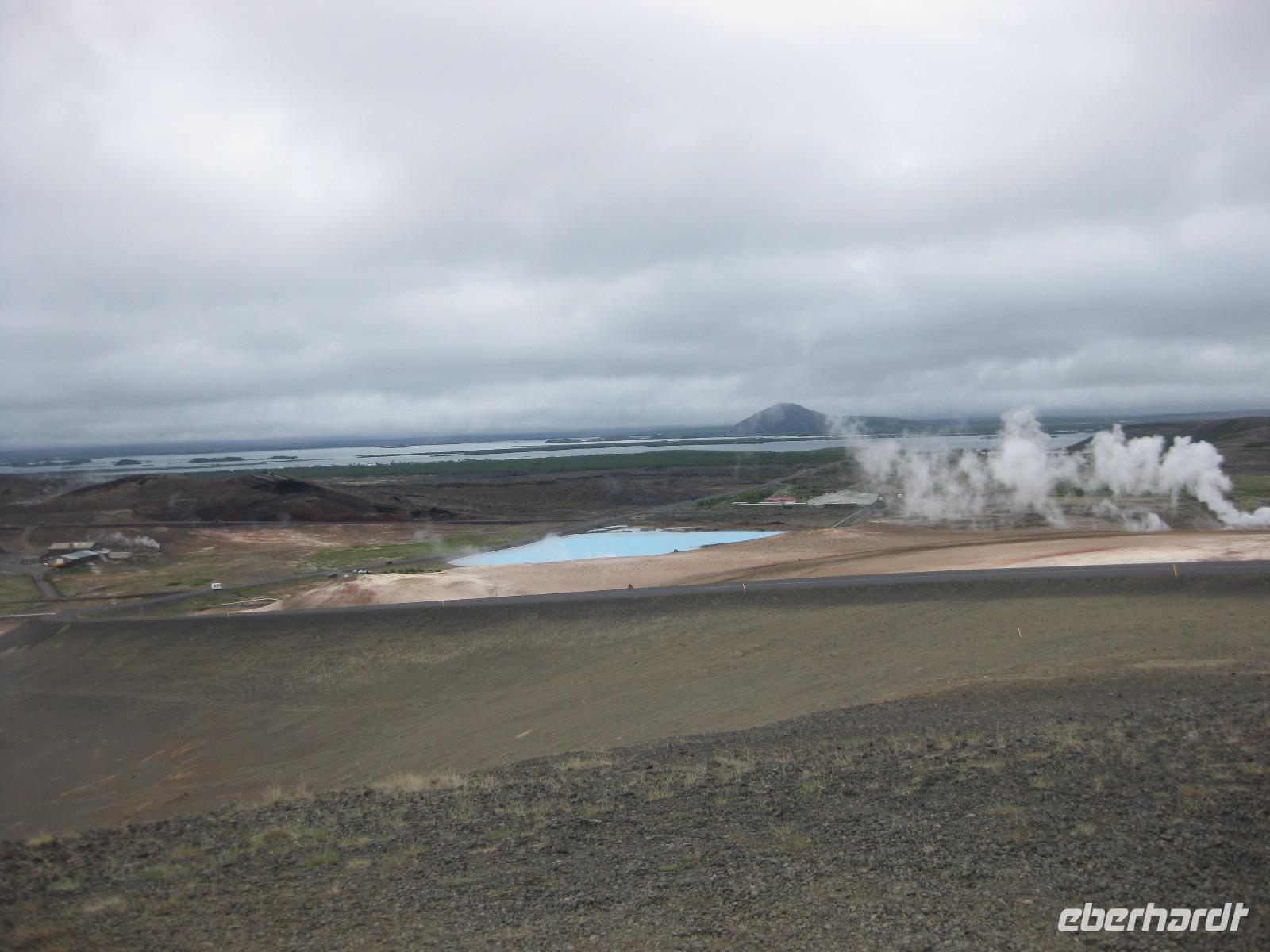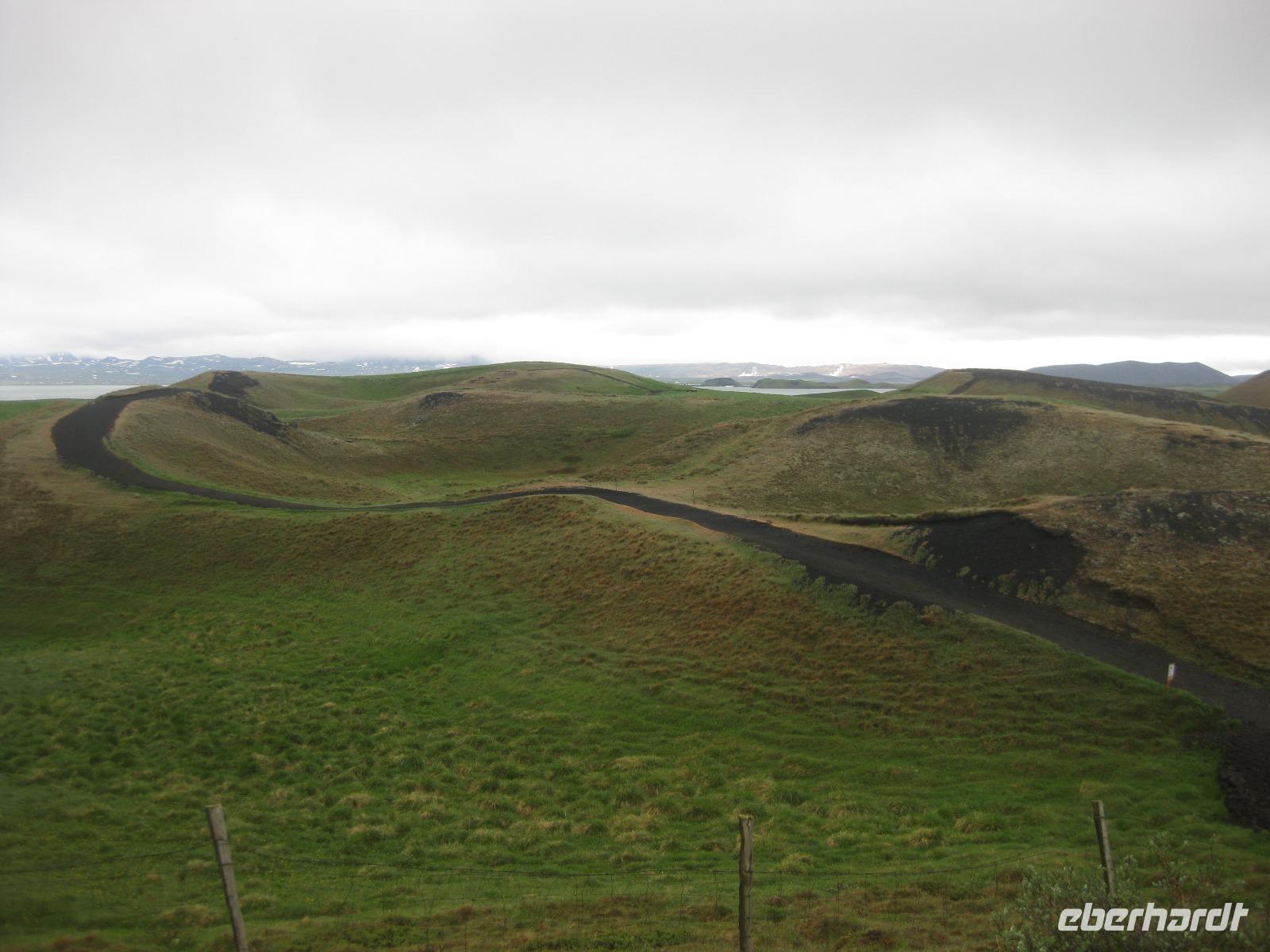 Wir müssen wieder an das andere Ufer des Eyjafjördur und fahren erst einmal ein ganzes Stück die Strecke von gestern. In Höhe des "Godafoss" biegen wir ab und fahren in Richtung Myvatn. Unsere Fahrt geht am "Laxa", einem der besten Lachsflüsse Islands entlang und dann haben wir schon das Myvatn-Gebiet erreicht. Die Landschaft ist hier so grandios, deshalb ein Muss für jeden Islandbesucher.