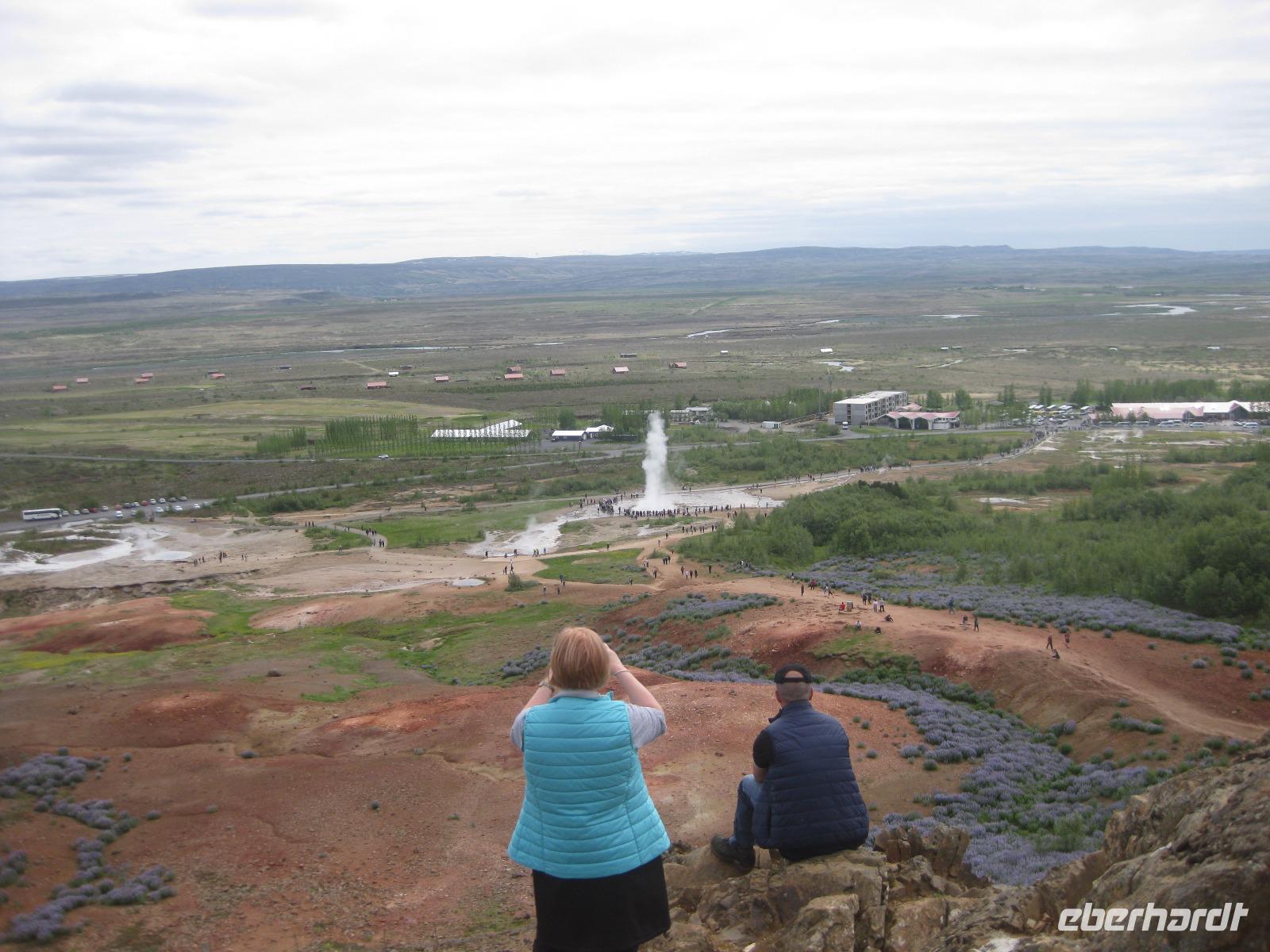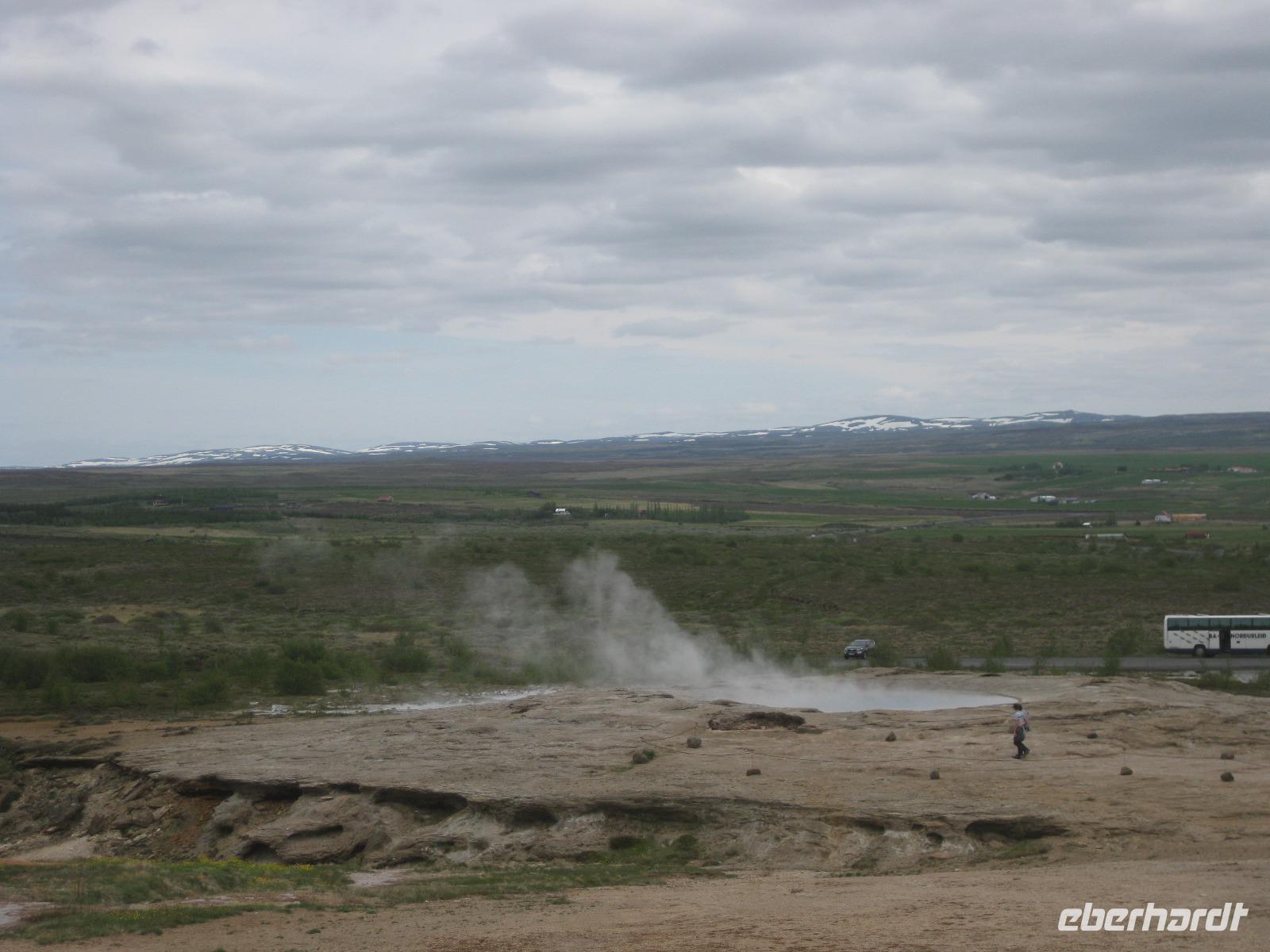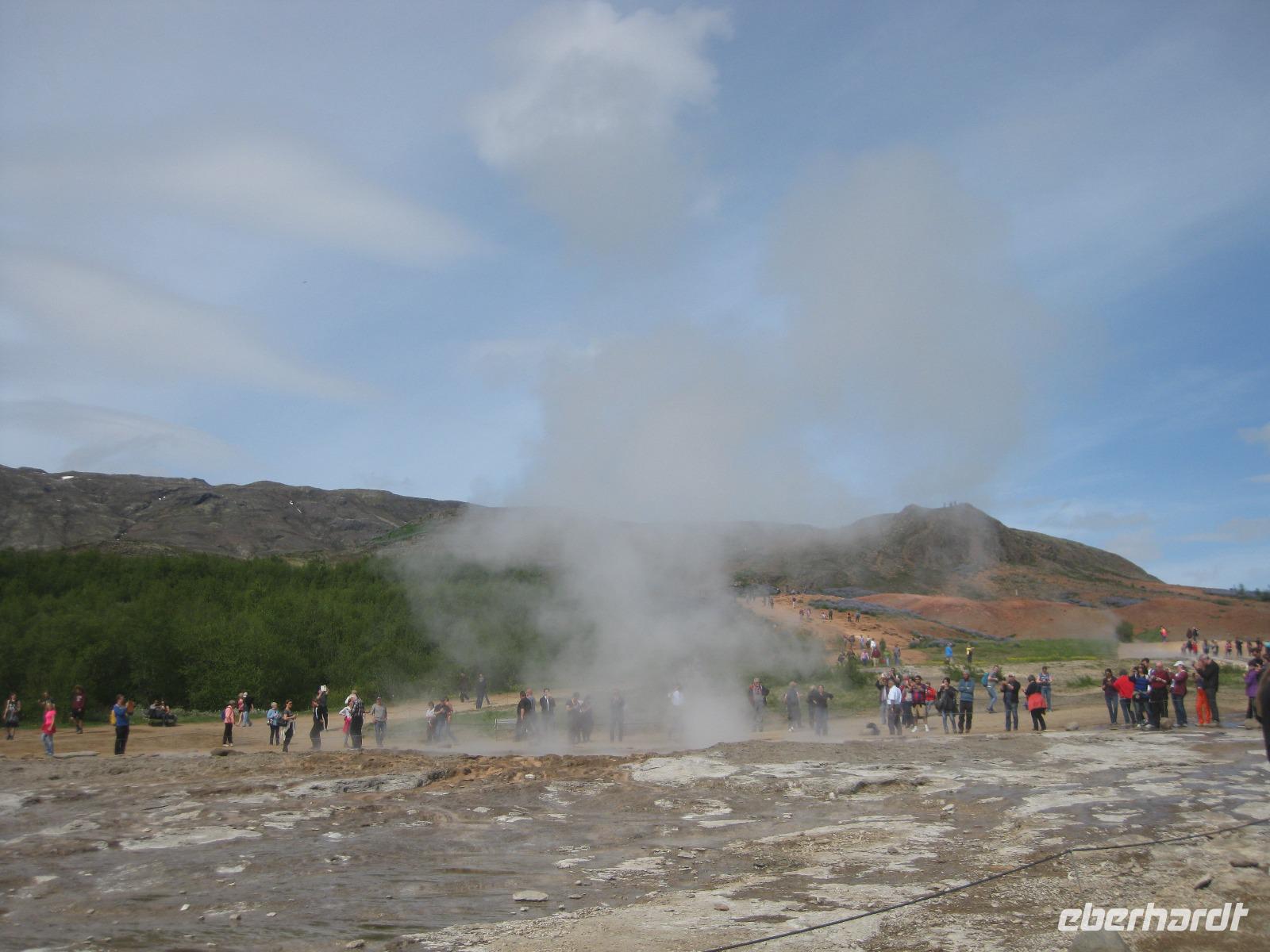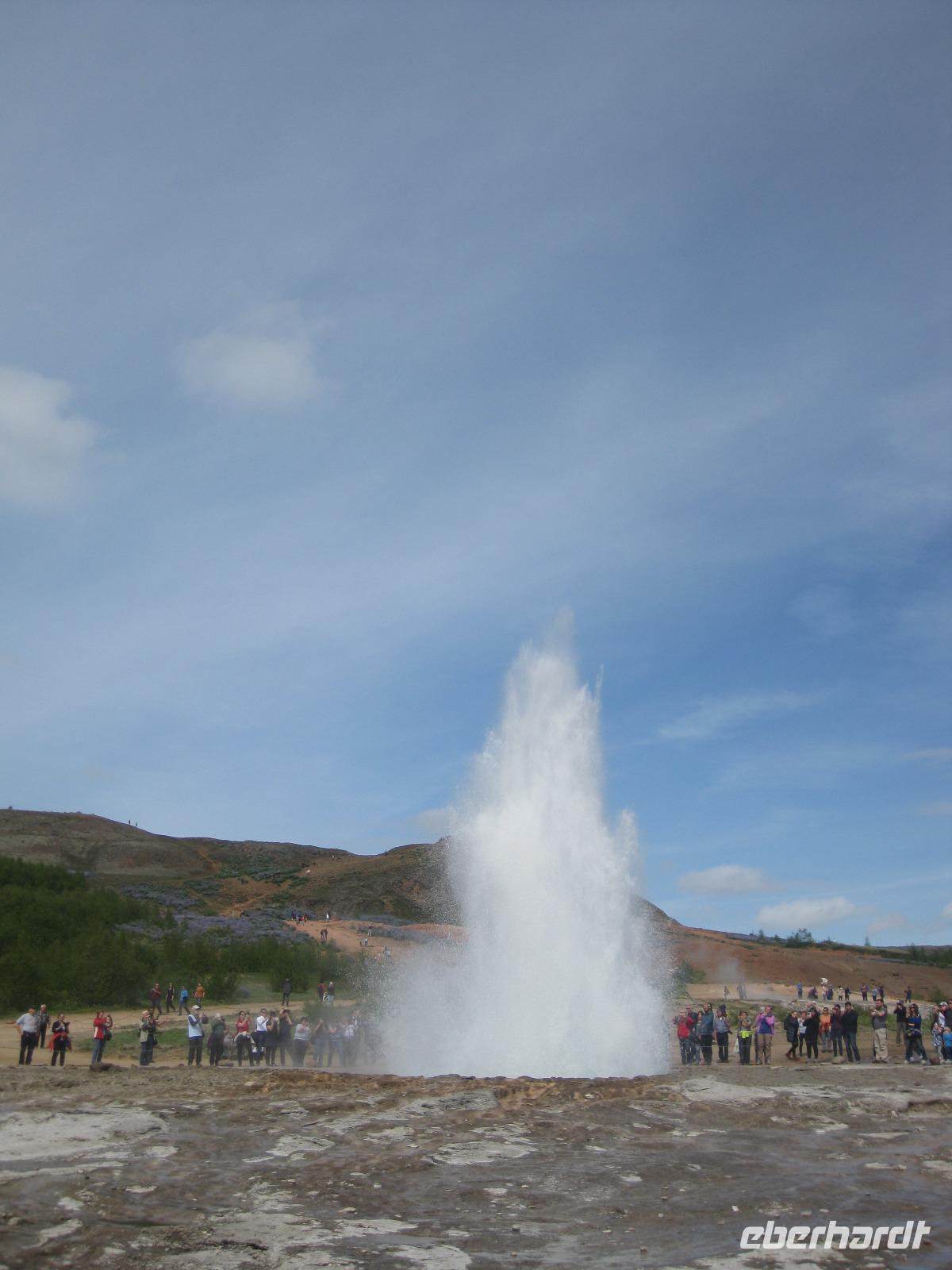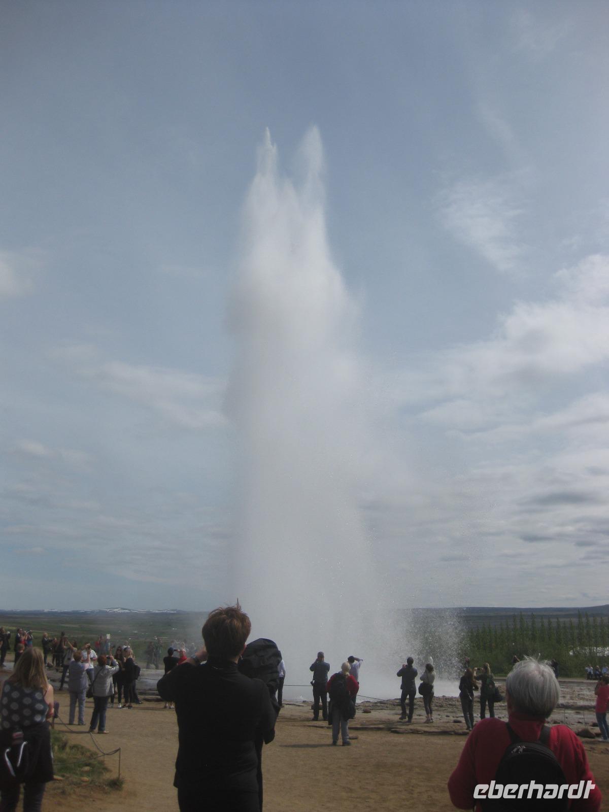 Jetzt verlassen wir Reykjavik. Wir erleben gleich die für Island typische Landschaft. Wir fahren durch Lavagebiete, sehen von weitem das größte Geokraftwerk Islands und natürlich auch schon schneebedeckte Berge und Gletscher in der Ferne. In der Blumenstadt Hveragerdi haben wir einen Stopp. Hier können wir die Spuren eines Erdbebens sehen. Nach einer Stunde Fahrt erreichen wir das Feld der heißen Quellen Haukadalur. Hier dampft und brodelt es. Der Geysir "Strokkur" schießt aller paar Minuten sein kochend heißes Wasser als Fontäne bis zu 20 Meter in die Luft. Es ist gar nicht so einfach, dieses Naturschauspiel auf dem Foto festzuhalten.