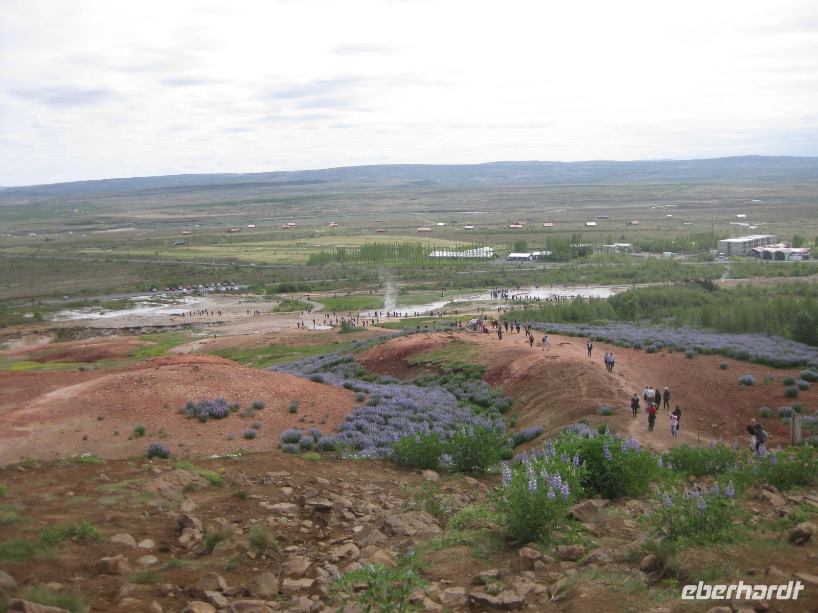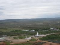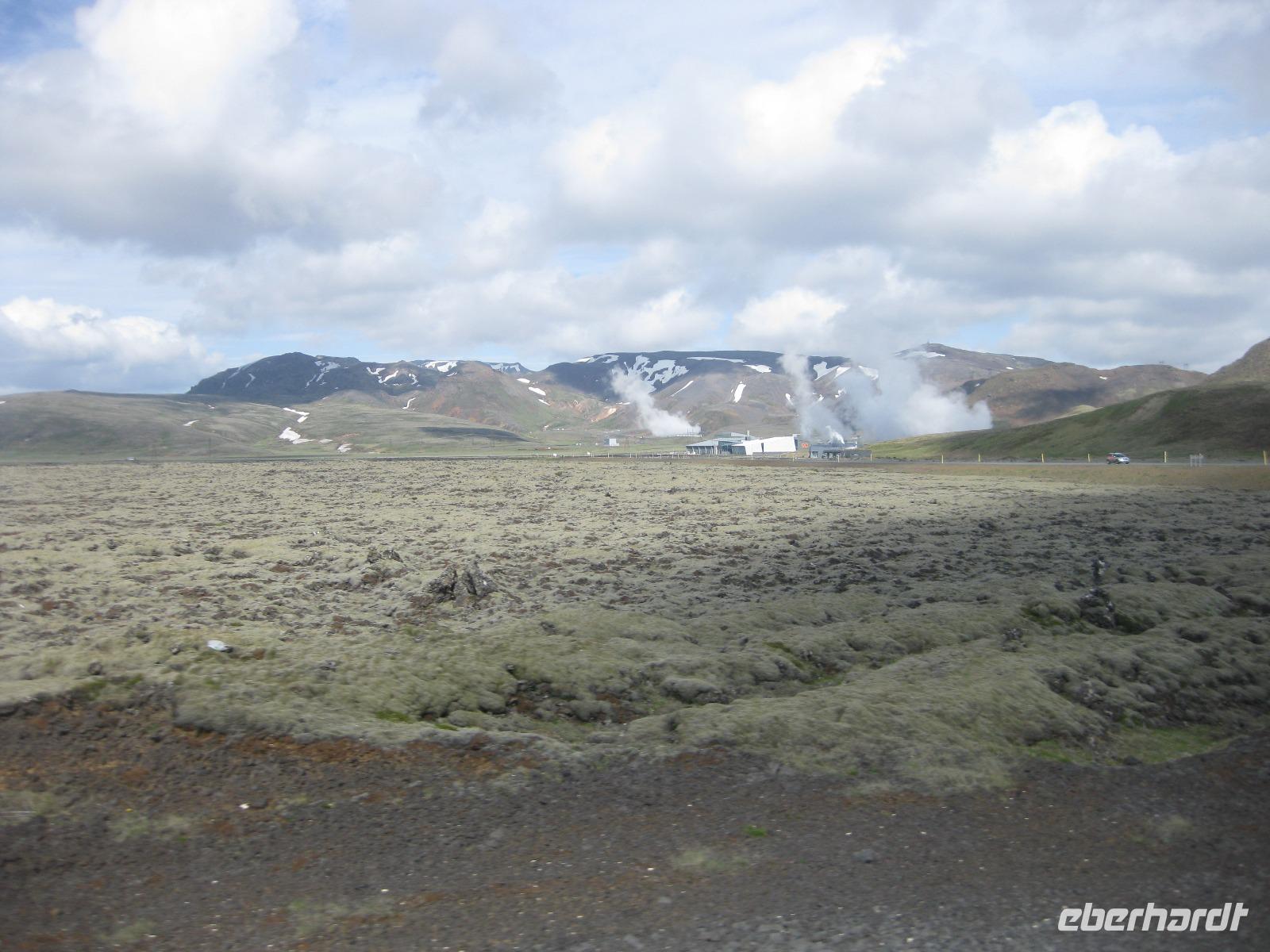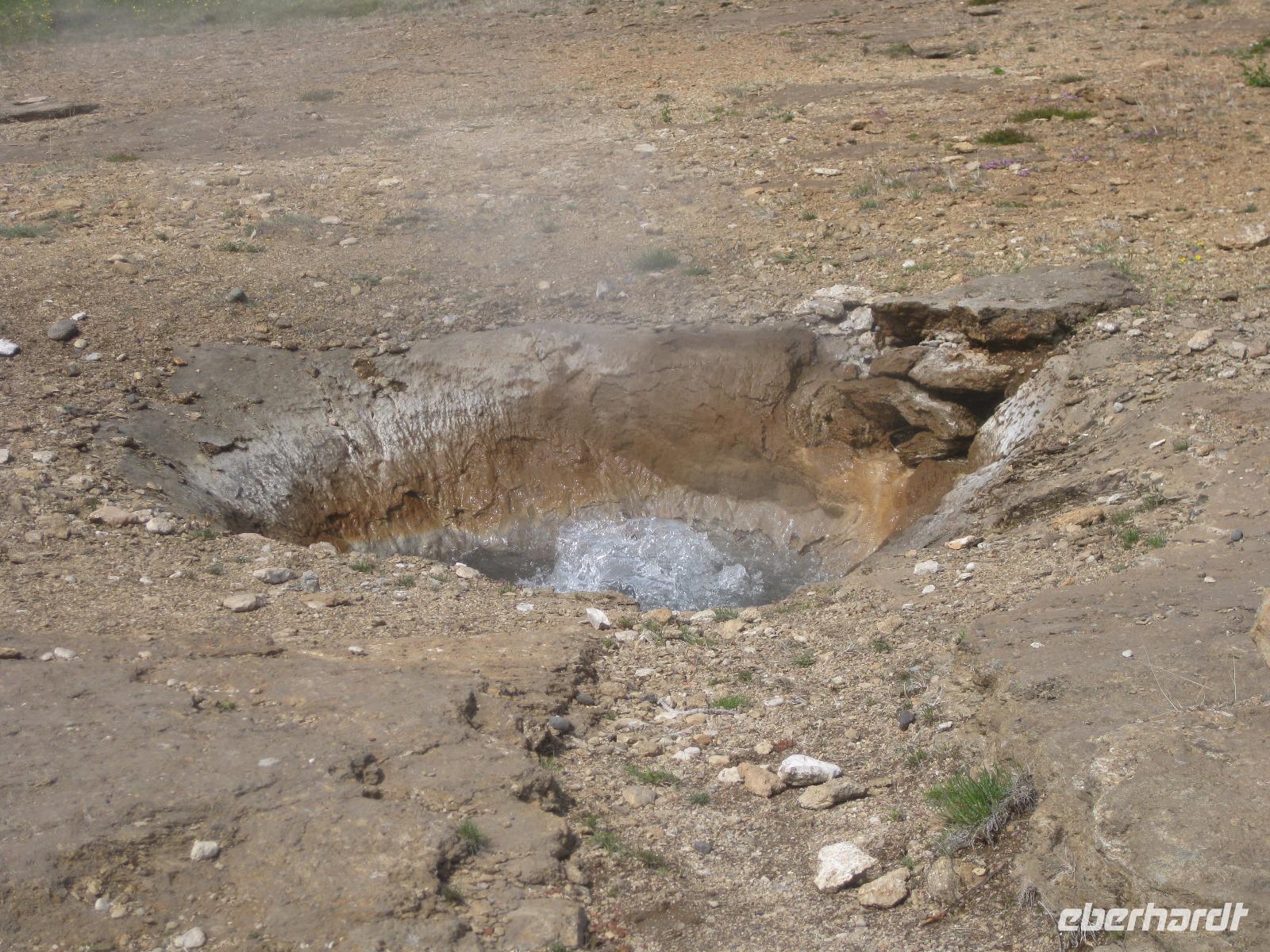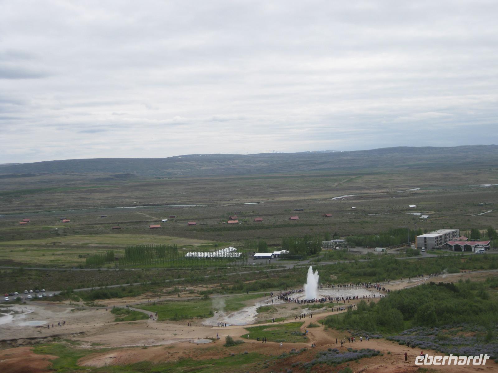 Jetzt verlassen wir Reykjavik. Wir erleben gleich die für Island typische Landschaft. Wir fahren durch Lavagebiete, sehen von weitem das größte Geokraftwerk Islands und natürlich auch schon schneebedeckte Berge und Gletscher in der Ferne. In der Blumenstadt Hveragerdi haben wir einen Stopp. Hier können wir die Spuren eines Erdbebens sehen. Nach einer Stunde Fahrt erreichen wir das Feld der heißen Quellen Haukadalur. Hier dampft und brodelt es. Der Geysir "Strokkur" schießt aller paar Minuten sein kochend heißes Wasser als Fontäne bis zu 20 Meter in die Luft. Es ist gar nicht so einfach, dieses Naturschauspiel auf dem Foto festzuhalten.