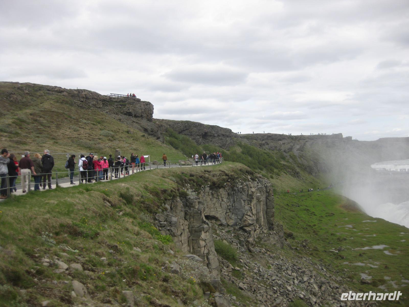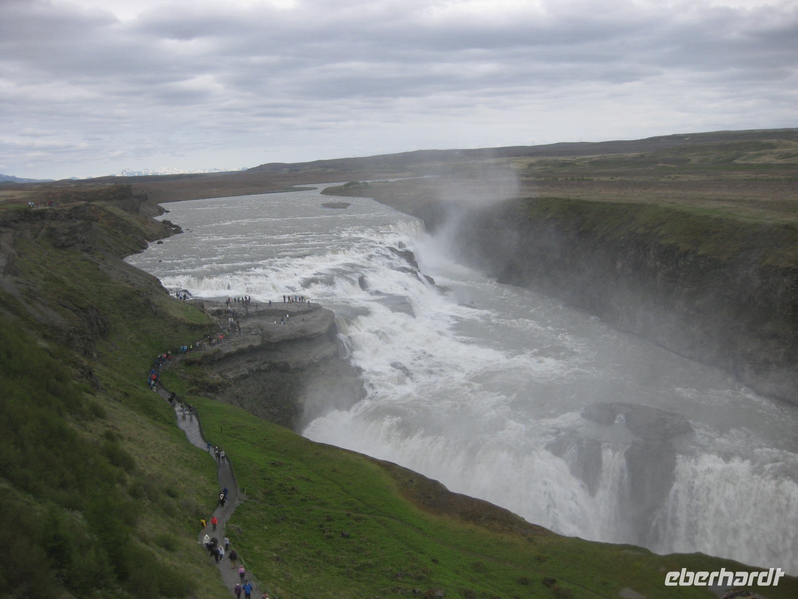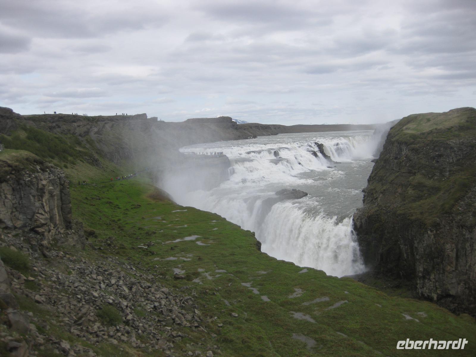 Nachdem wir uns satt gesehen haben und die Fotos im Kasten sind, fahren wir nur wenige Kilometer weiter bis zum Wasserfall "Gullfoss", "Goldener Wasserfall". Hier stürzt das Wasser der Hvita über zwei große Fallstufen ca. 30 Meter tief in einen engen Canon. Leider ist der Himmel bedeckt, so dass wir den goldenen Glanz des Wasserfalls nur ahnen können.
