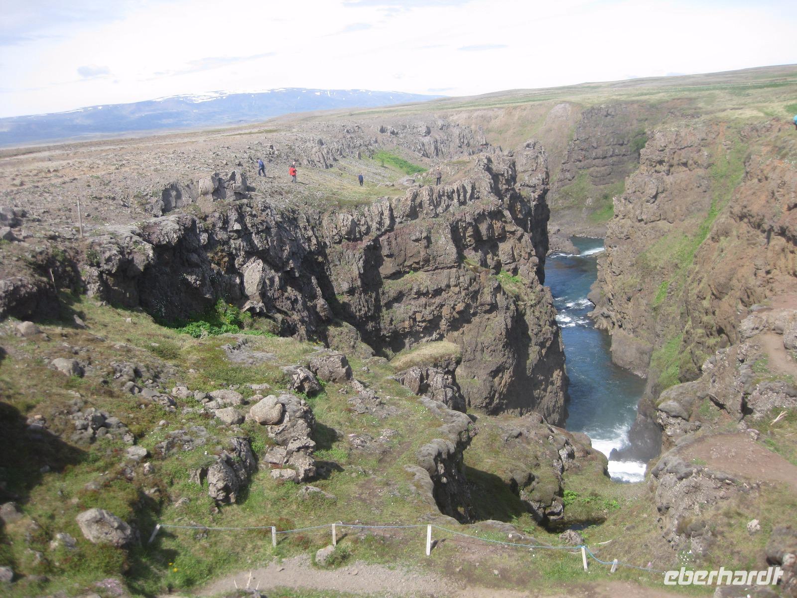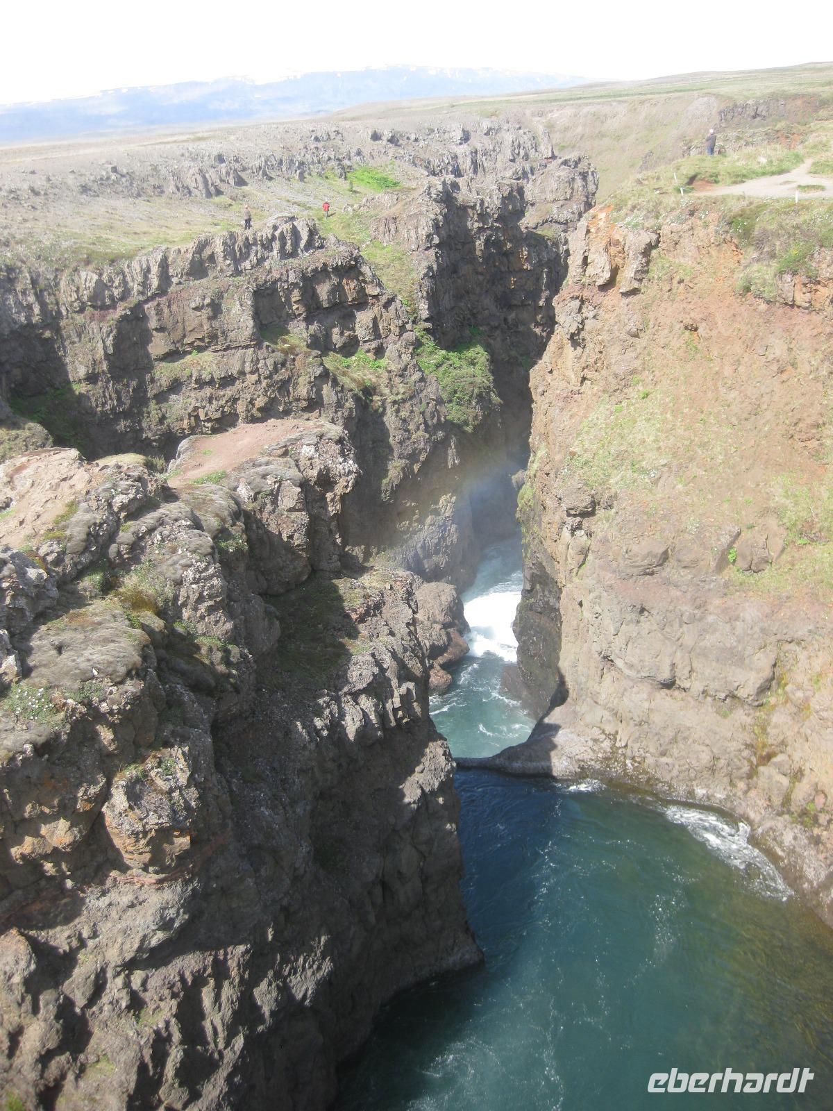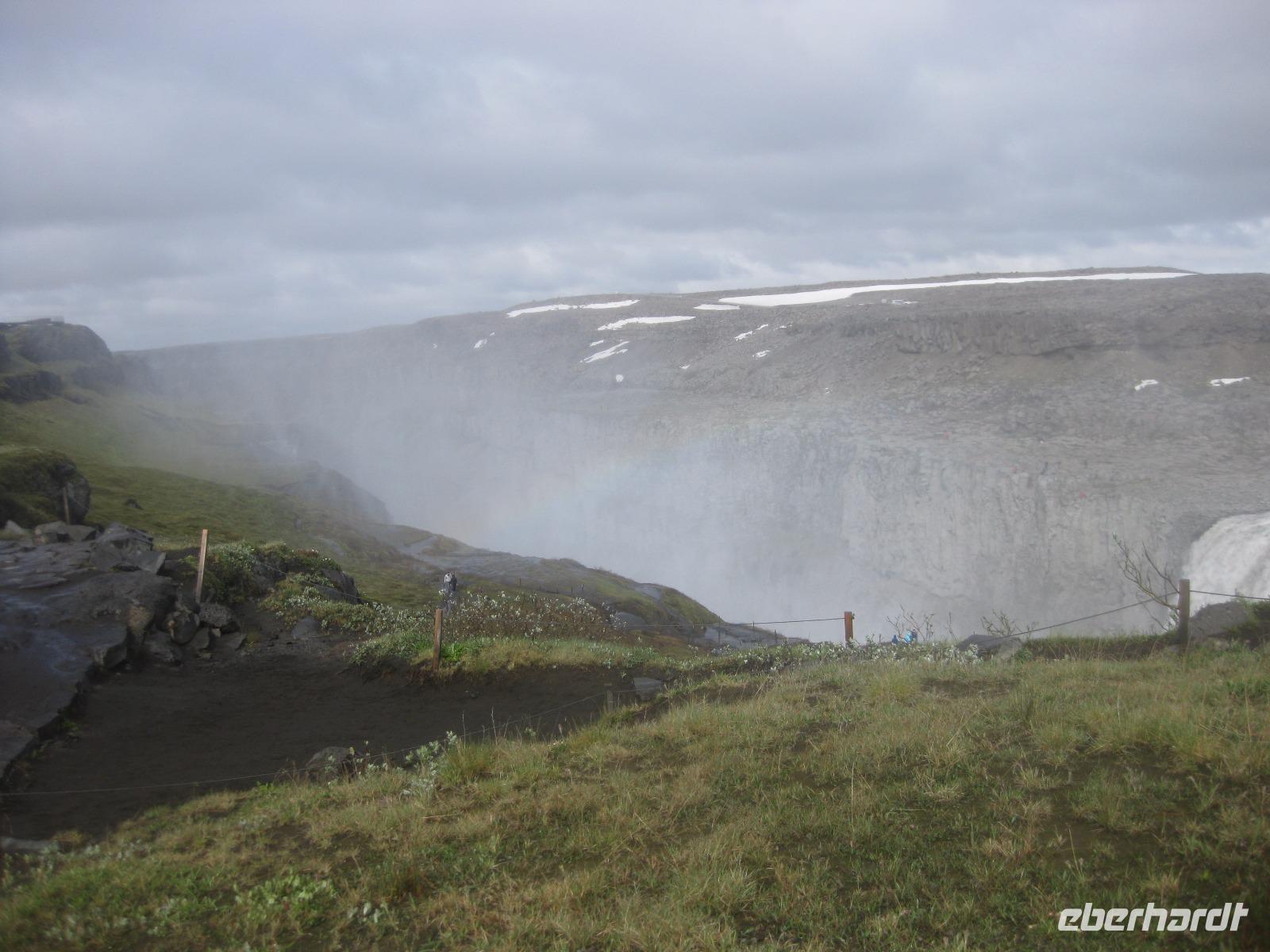 Nachdem wir uns satt gesehen haben und die Fotos im Kasten sind, fahren wir nur wenige Kilometer weiter bis zum Wasserfall "Gullfoss", "Goldener Wasserfall". Hier stürzt das Wasser der Hvita über zwei große Fallstufen ca. 30 Meter tief in einen engen Canon. Leider ist der Himmel bedeckt, so dass wir den goldenen Glanz des Wasserfalls nur ahnen können.