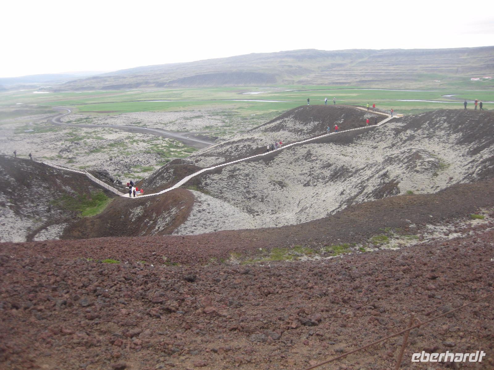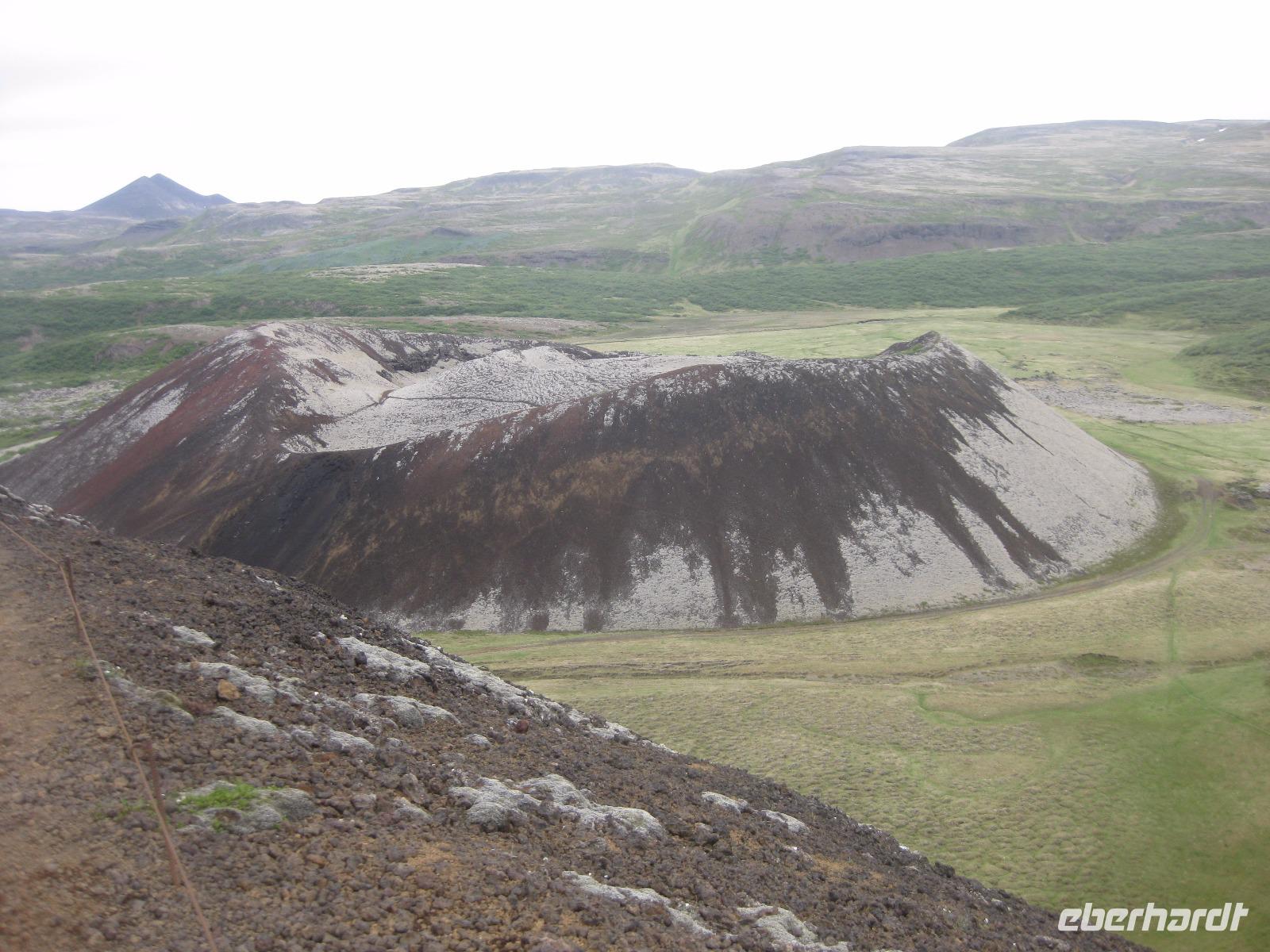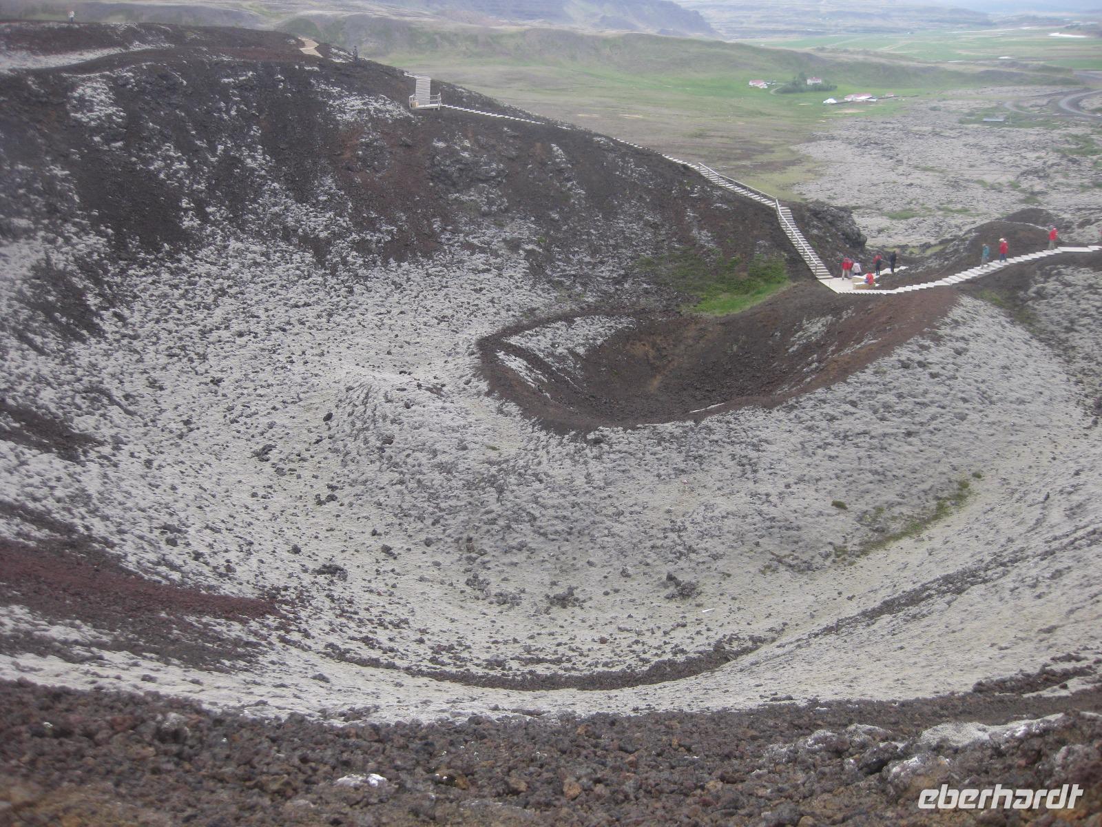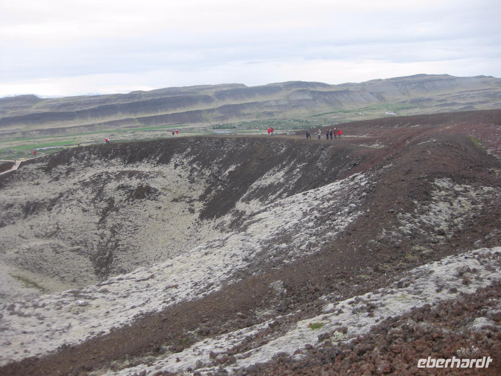 Gleich nach dem Frühstück starten wir zu unserer Tagesetappe. Wir haben heute eine längere Fahrt in den Norden Islands bis nach Akureyri vor uns. Leider ist das Wetter noch nicht viel besser geworden, so dass wir auch heute morgen den Snaefellsjökull nicht sehen können. Aber es regnet nicht. Wir verlassen die Nordküste und fahren in Richtung Osten über die Halbinsel bis nach Borgarnes. Hier stoppen wir heute nur kurz. Gar nicht weit von Borgarnes entfernt befindet sich direkt an der Ringstraße der vor langer Zeit erloschene Krater "Grabrok". Man kann ihn ganz bequem besteigen. Vom Kraterrand aus bietet sich ein grandioser Blick in die Umgebung und auch in den Krater hinein. Alle steigen hinauf und genießen die Aussicht.
