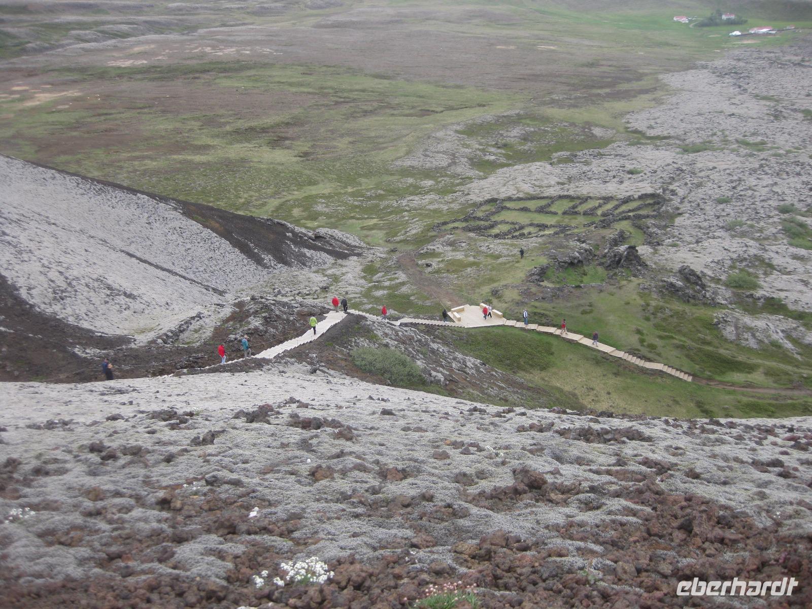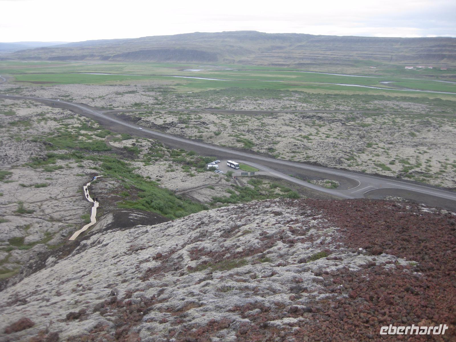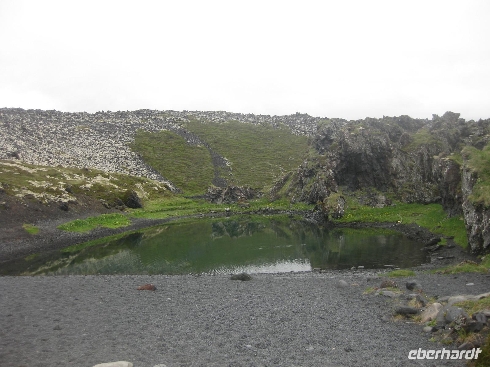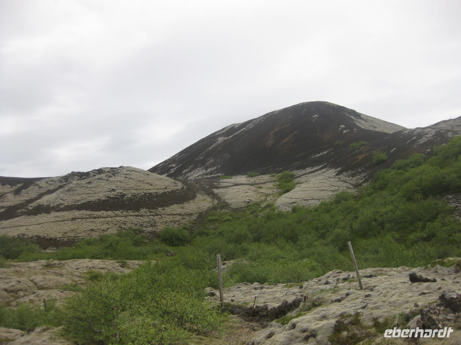 Gleich nach dem Frühstück starten wir zu unserer Tagesetappe. Wir haben heute eine längere Fahrt in den Norden Islands bis nach Akureyri vor uns. Leider ist das Wetter noch nicht viel besser geworden, so dass wir auch heute morgen den Snaefellsjökull nicht sehen können. Aber es regnet nicht. Wir verlassen die Nordküste und fahren in Richtung Osten über die Halbinsel bis nach Borgarnes. Hier stoppen wir heute nur kurz. Gar nicht weit von Borgarnes entfernt befindet sich direkt an der Ringstraße der vor langer Zeit erloschene Krater "Grabrok". Man kann ihn ganz bequem besteigen. Vom Kraterrand aus bietet sich ein grandioser Blick in die Umgebung und auch in den Krater hinein. Alle steigen hinauf und genießen die Aussicht.