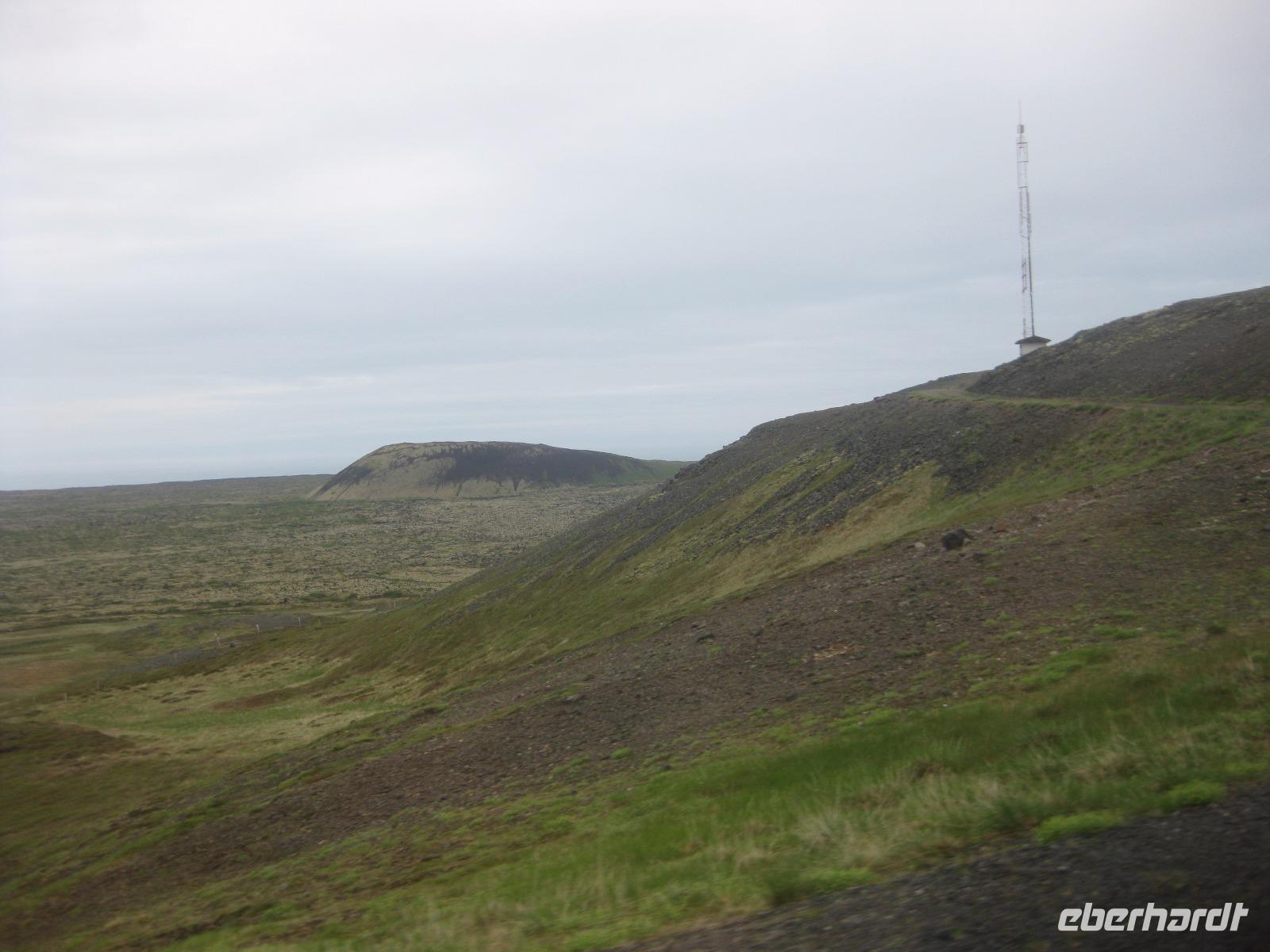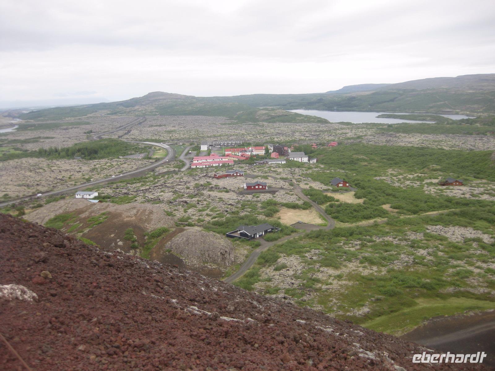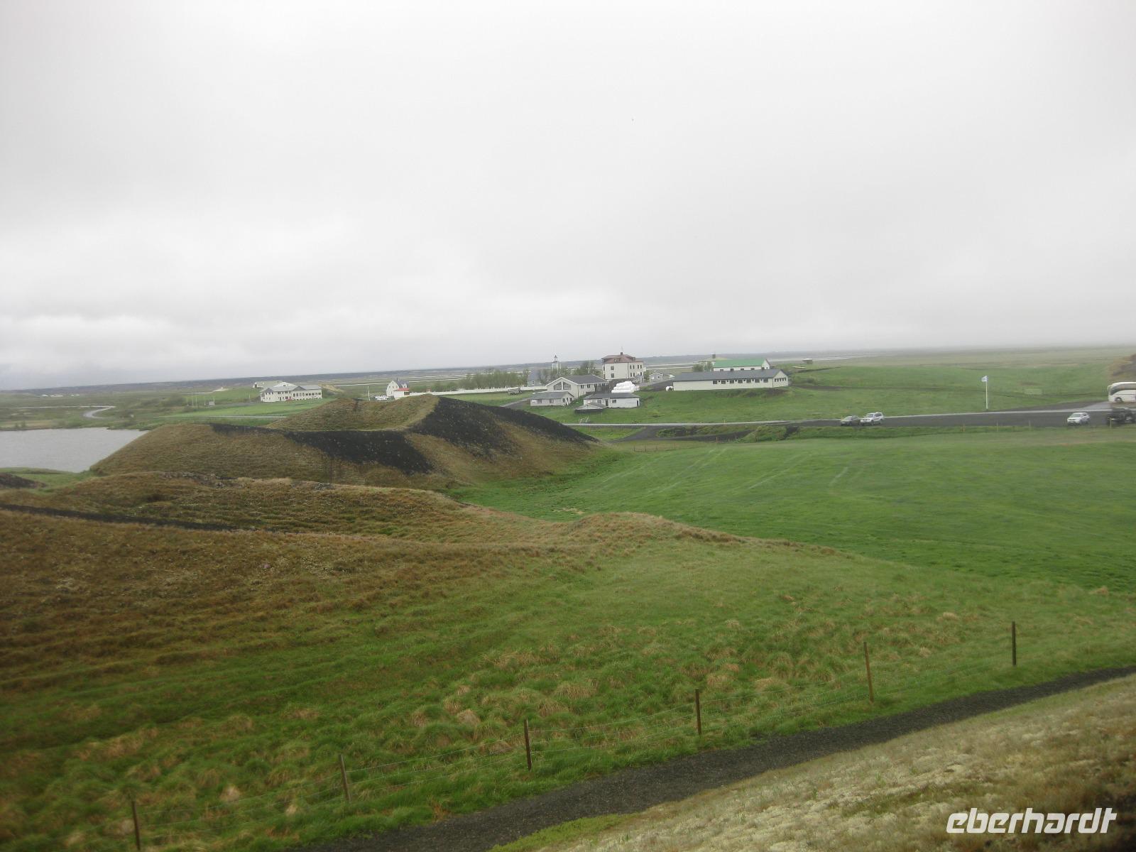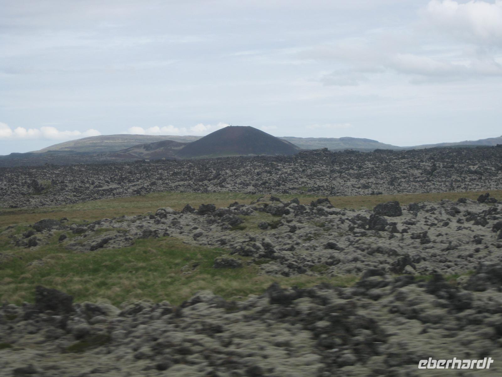 Gleich nach dem Frühstück starten wir zu unserer Tagesetappe. Wir haben heute eine längere Fahrt in den Norden Islands bis nach Akureyri vor uns. Leider ist das Wetter noch nicht viel besser geworden, so dass wir auch heute morgen den Snaefellsjökull nicht sehen können. Aber es regnet nicht. Wir verlassen die Nordküste und fahren in Richtung Osten über die Halbinsel bis nach Borgarnes. Hier stoppen wir heute nur kurz. Gar nicht weit von Borgarnes entfernt befindet sich direkt an der Ringstraße der vor langer Zeit erloschene Krater "Grabrok". Man kann ihn ganz bequem besteigen. Vom Kraterrand aus bietet sich ein grandioser Blick in die Umgebung und auch in den Krater hinein. Alle steigen hinauf und genießen die Aussicht.