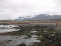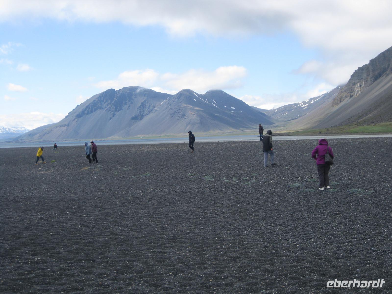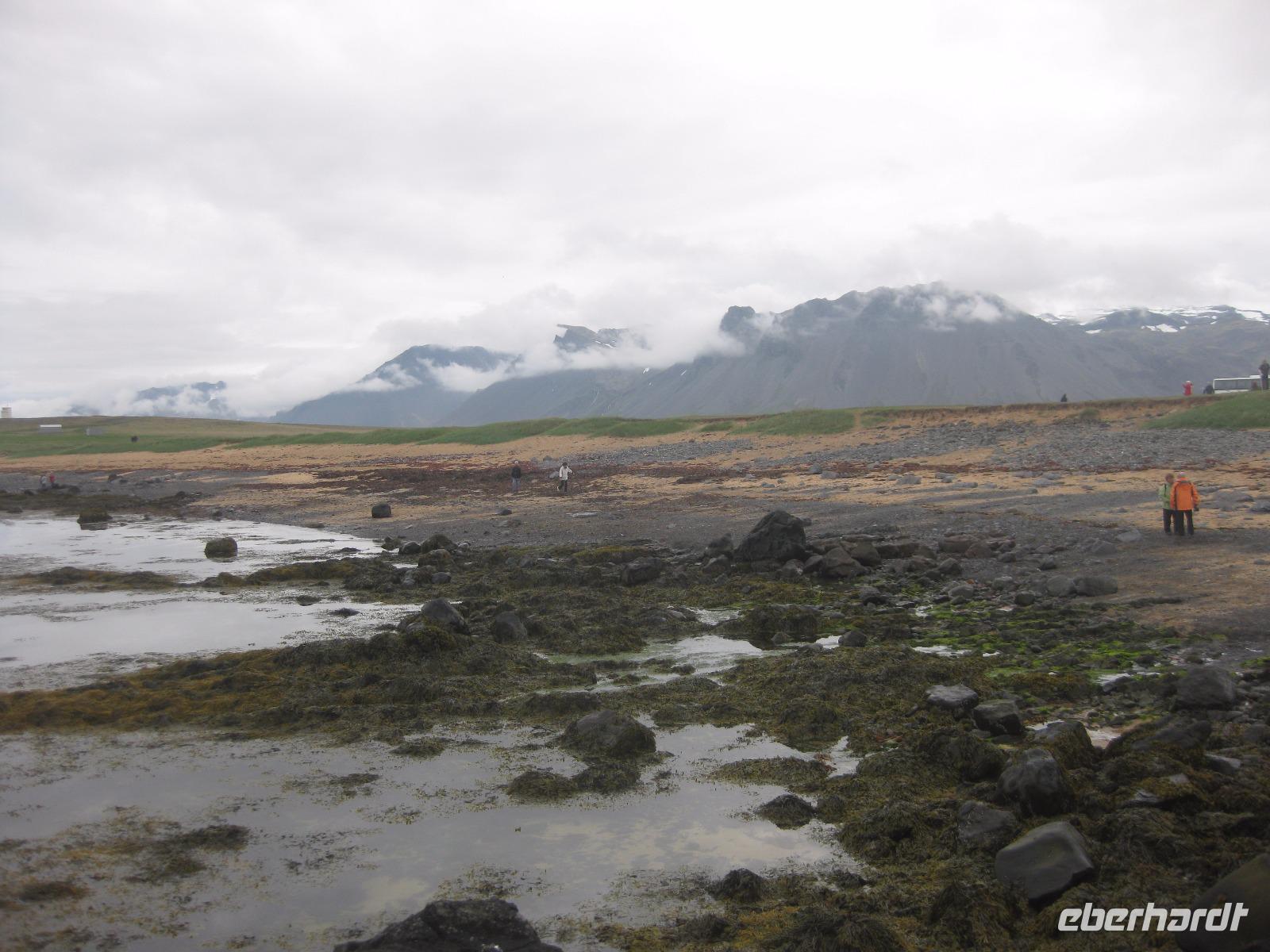 Dann kommen wir zum mit zerklüfteten Felsen gesämten Berufjördur, einem der schönsten Fjorde Islands. Und bei Sonnenschein und blauem Himmel, so wie heute, sieht alles noch viel schöner aus. Hier halten wir noch mal an einem Wasserfall ehe wir in Djupivogur an der Öffnung des Berufjördurs zum Meer Mittagspause machen. In Djupivogur kehren wir in der "Langabud", einer restaurierten Handelsstation aus dem 18. Jh. ein. Es gibt eine typische isländische Suppe, Lachsbrote, selbstgebackene frische Kuchen und Torten zur Auswahl. Alles sehr lecker. Dann geht die Fahrt weiter an der Küste entlang mit mehreren Fotostopps und tollen Ausblicken.