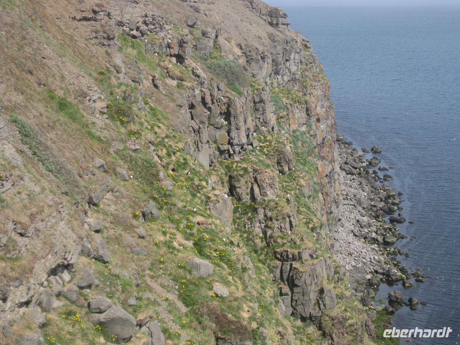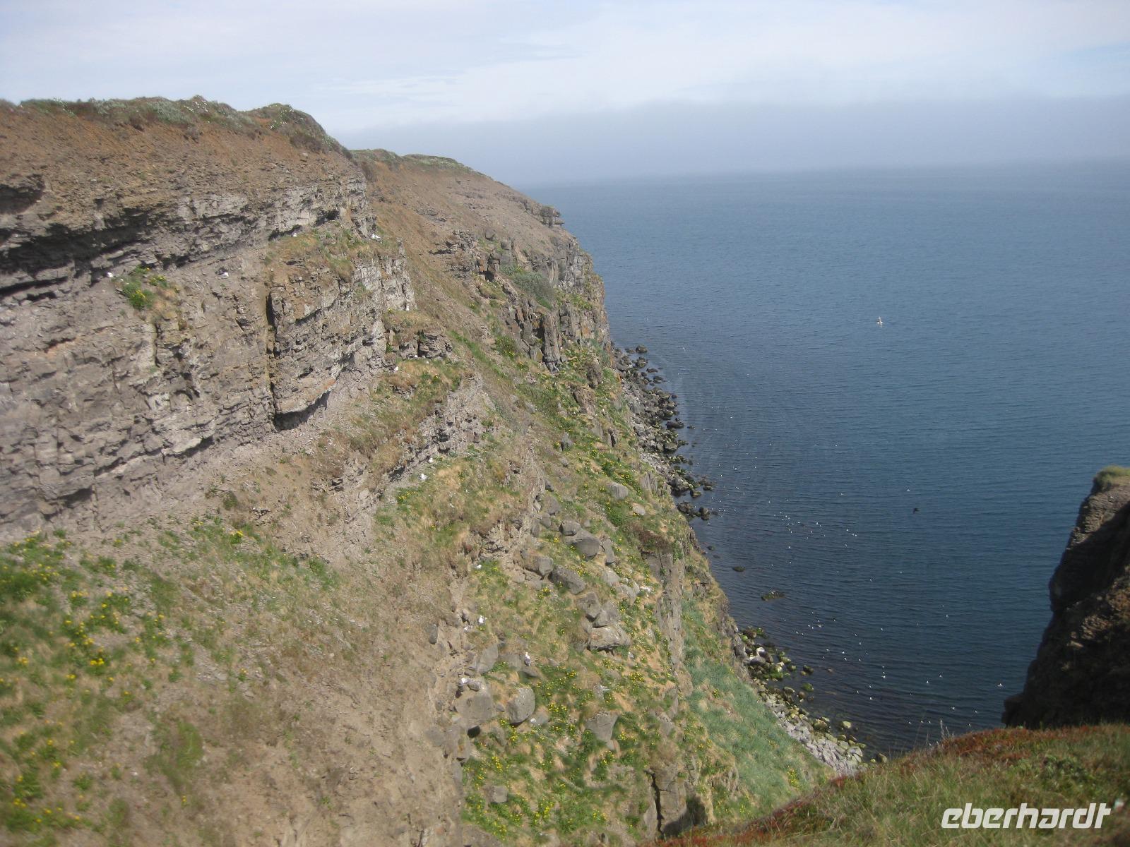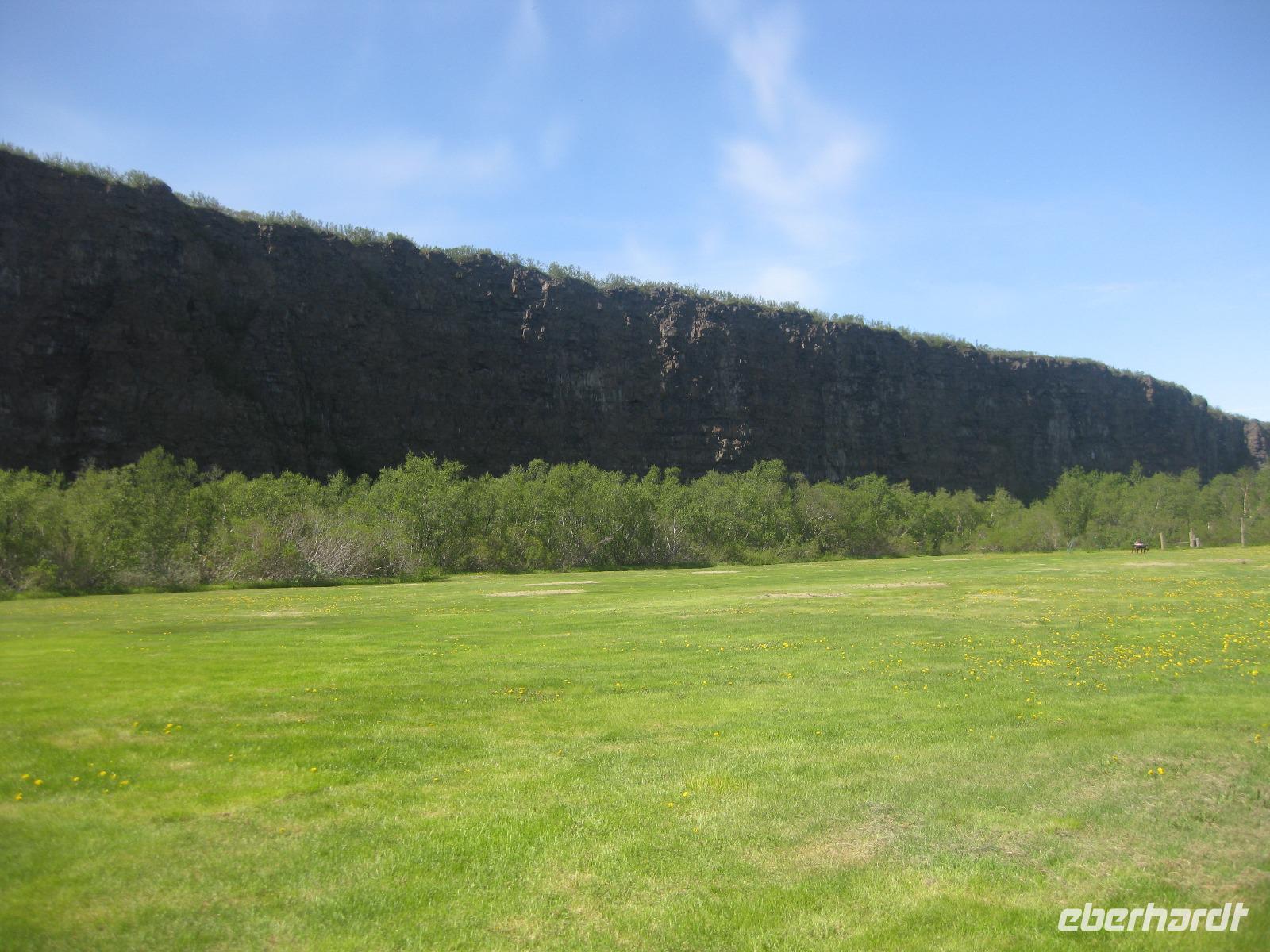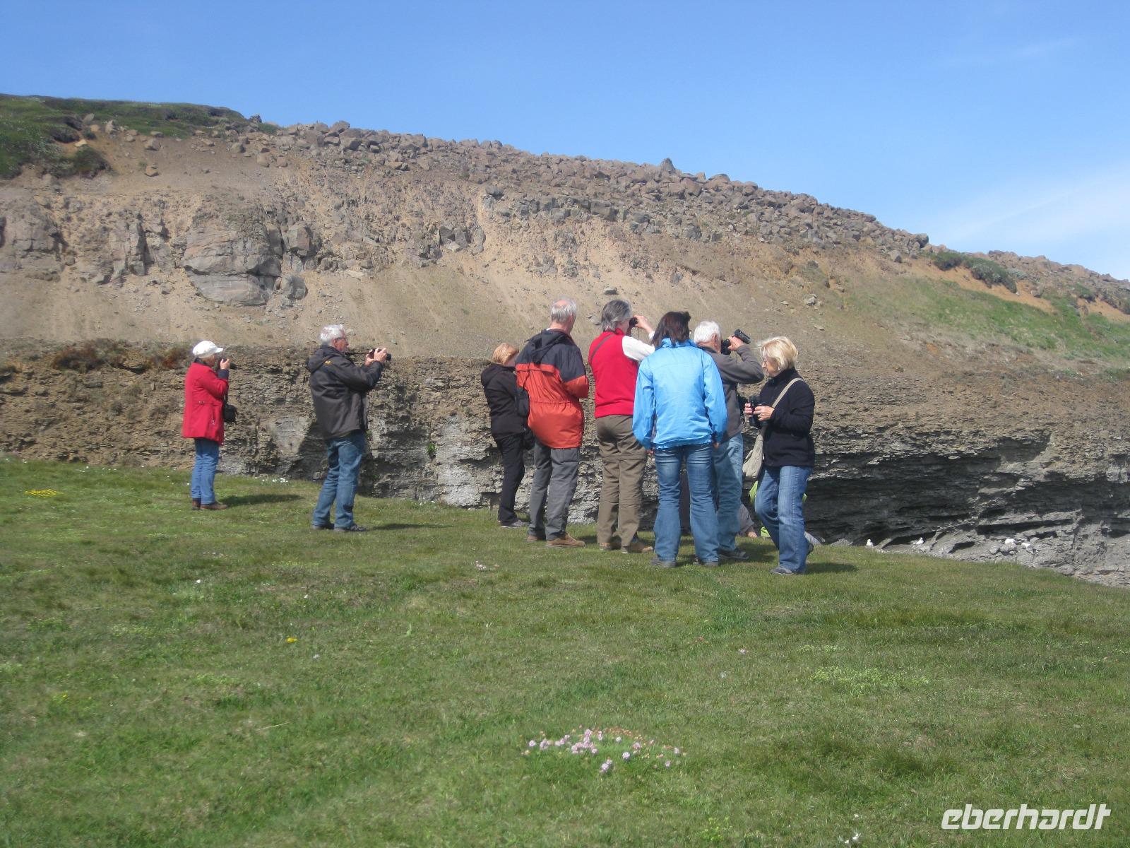 Erst einmal ist der Himmel wieder in Nebel eingehüllt. Wir fahren nach dem Frühstück los in Richtung Husavik. Der Himmel wird immer freier und schließlich zeigt sich die Sonne. Es ist bestes Wetter. Nach ca. 1,5 Stunden Fahrt erreichen wir das kleine Fischerstädtchen Husavik. Hier machen wir heute unseren ersten Stopp. Es ist ein gemütliches kleines Fischreistädtchen mit einem bunten Hafen, einer schönen Holzkirche, einigen Souvenirgeschäften und Restarants. Wir haben Zeit für einen kleinen Bummel. Von hier aus werden auch Touren zur Walbeobachtung angeboten. Das haben wir heute nicht vor. Wir fahren an der Küste weiter und kommen an den nördlichsten Punkt unserer Reise. Die Küstenfelsen hier, in denen eine Unzahl von Möwen und Papageientauchern nisten, sind ein wahres Vogelparadies. Natürlich machen wir hier einen Fotostopp. Alle sind begeistert. Die Fahrt hier an der Küste entlang ist auch deshalb so interessant, weil wir bei schönstem blauen Himmel und Sonnenschein fahren und wenige Meter weiter fahren wir durch dichte Nebelschwaden, die vom Meer kommen. Einfach unglaublich. Und das wechselt ständig so. Bald erreichen wir Asbyrgi, ein hufeisenförmiges Tal, das mit bis zu 100 m hohen Felswänden begrenzt ist. Hier machen wir einen wunderbaren kleinen Spaziergang und anschließend picknicken wir auf der großen Wiese im Inneren des "Hufeisens".