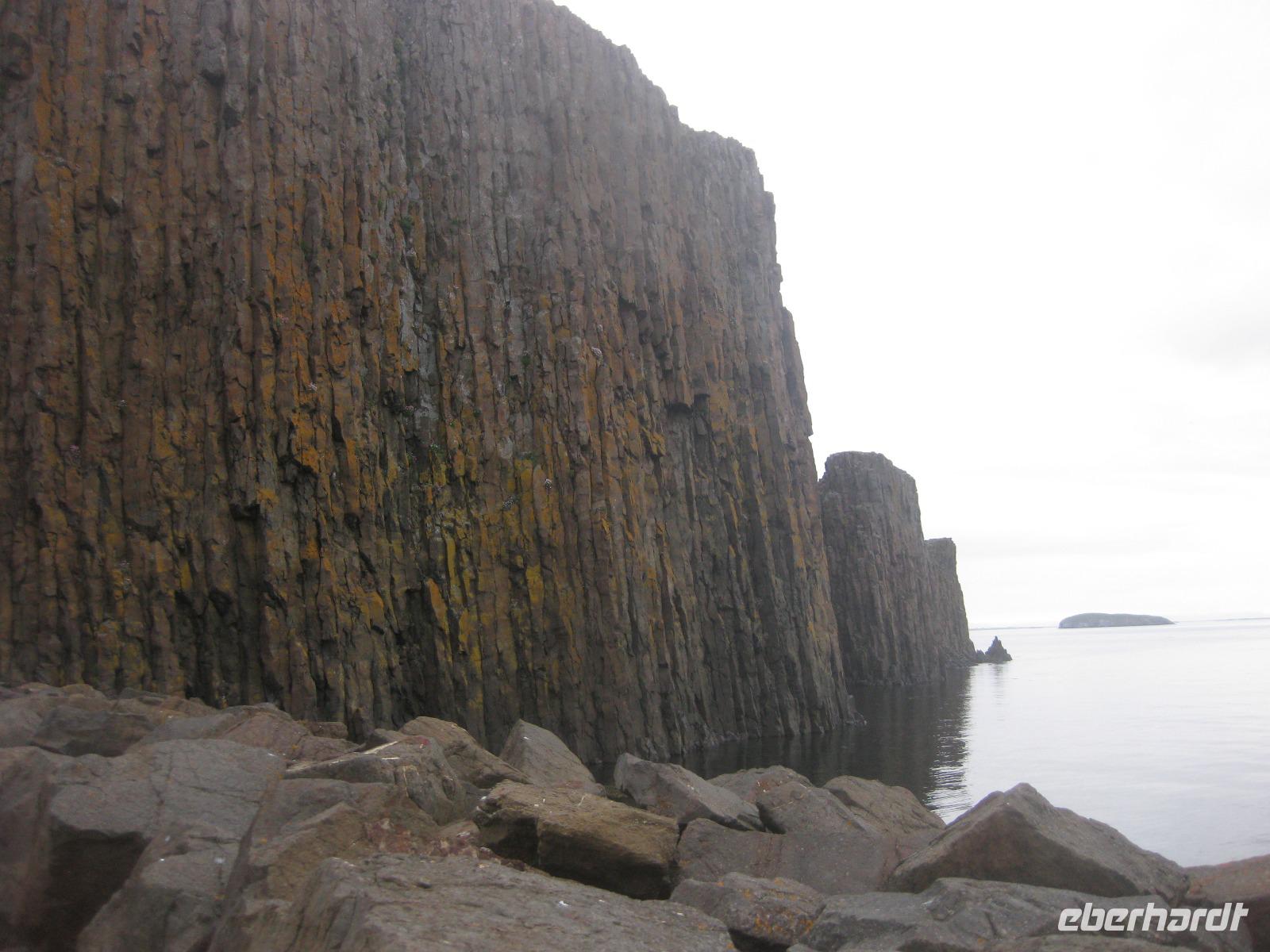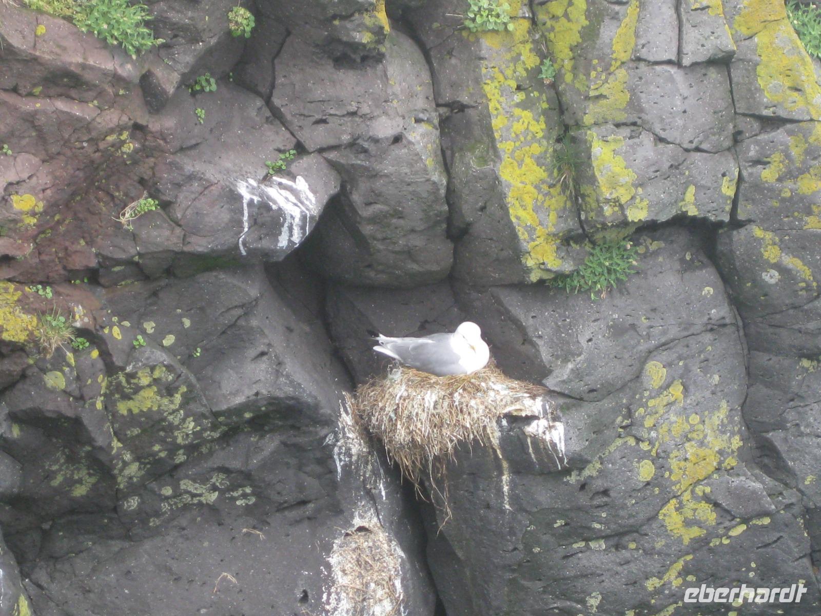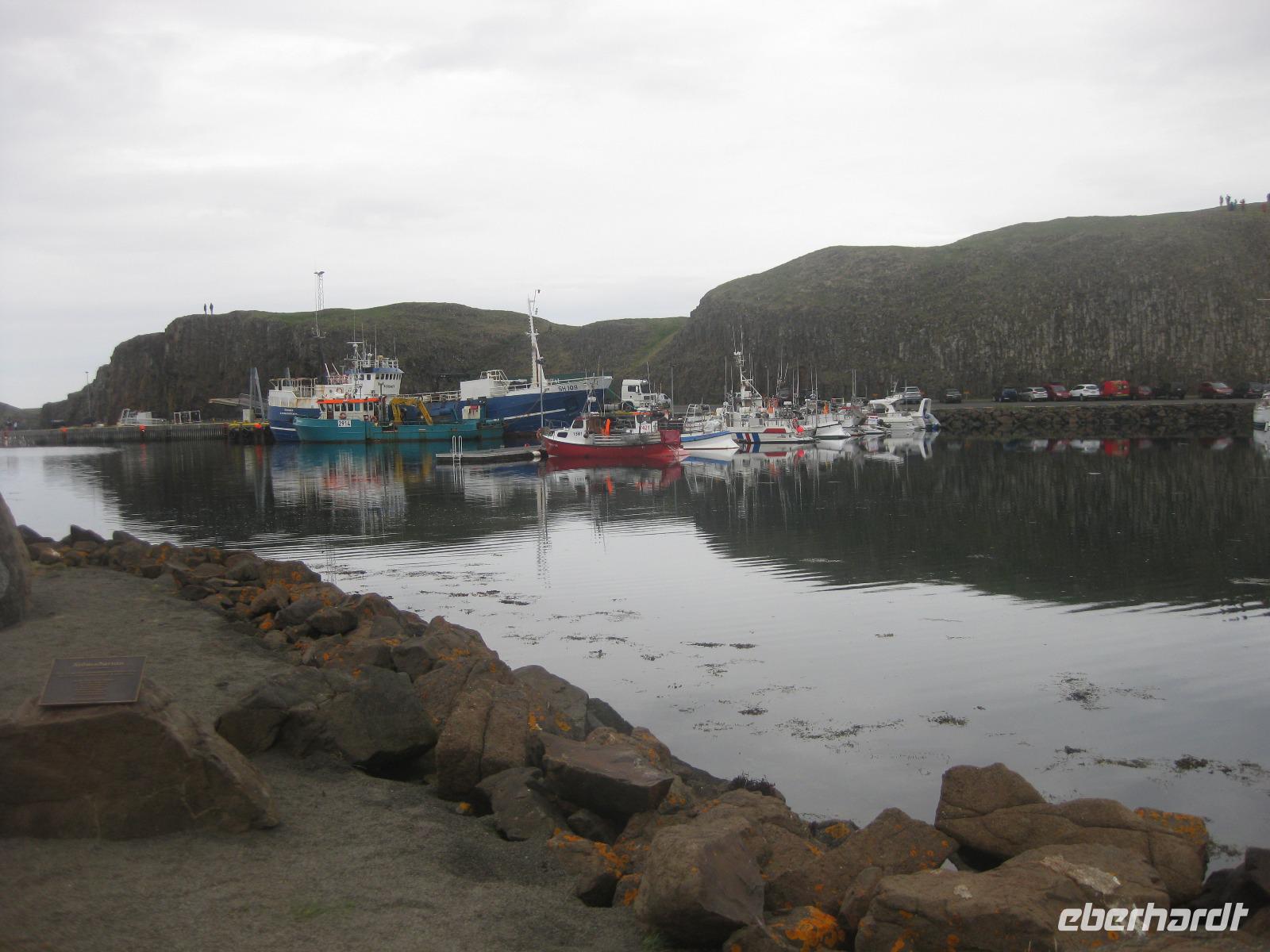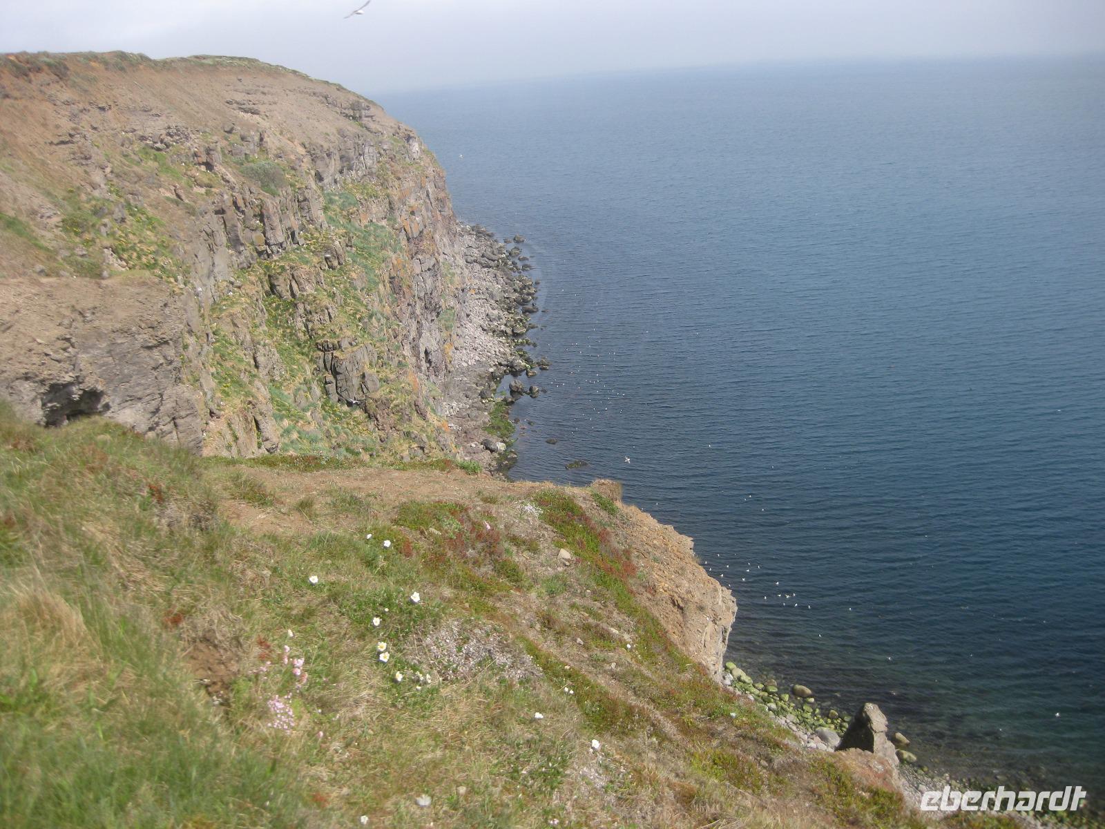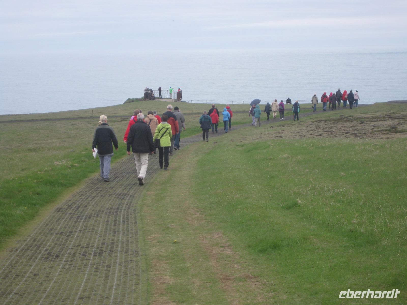 Erst einmal ist der Himmel wieder in Nebel eingehüllt. Wir fahren nach dem Frühstück los in Richtung Husavik. Der Himmel wird immer freier und schließlich zeigt sich die Sonne. Es ist bestes Wetter. Nach ca. 1,5 Stunden Fahrt erreichen wir das kleine Fischerstädtchen Husavik. Hier machen wir heute unseren ersten Stopp. Es ist ein gemütliches kleines Fischreistädtchen mit einem bunten Hafen, einer schönen Holzkirche, einigen Souvenirgeschäften und Restarants. Wir haben Zeit für einen kleinen Bummel. Von hier aus werden auch Touren zur Walbeobachtung angeboten. Das haben wir heute nicht vor. Wir fahren an der Küste weiter und kommen an den nördlichsten Punkt unserer Reise. Die Küstenfelsen hier, in denen eine Unzahl von Möwen und Papageientauchern nisten, sind ein wahres Vogelparadies. Natürlich machen wir hier einen Fotostopp. Alle sind begeistert. Die Fahrt hier an der Küste entlang ist auch deshalb so interessant, weil wir bei schönstem blauen Himmel und Sonnenschein fahren und wenige Meter weiter fahren wir durch dichte Nebelschwaden, die vom Meer kommen. Einfach unglaublich. Und das wechselt ständig so. Bald erreichen wir Asbyrgi, ein hufeisenförmiges Tal, das mit bis zu 100 m hohen Felswänden begrenzt ist. Hier machen wir einen wunderbaren kleinen Spaziergang und anschließend picknicken wir auf der großen Wiese im Inneren des "Hufeisens".