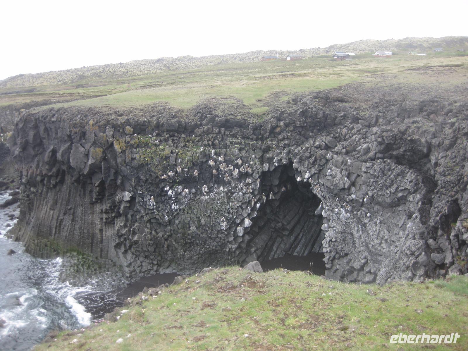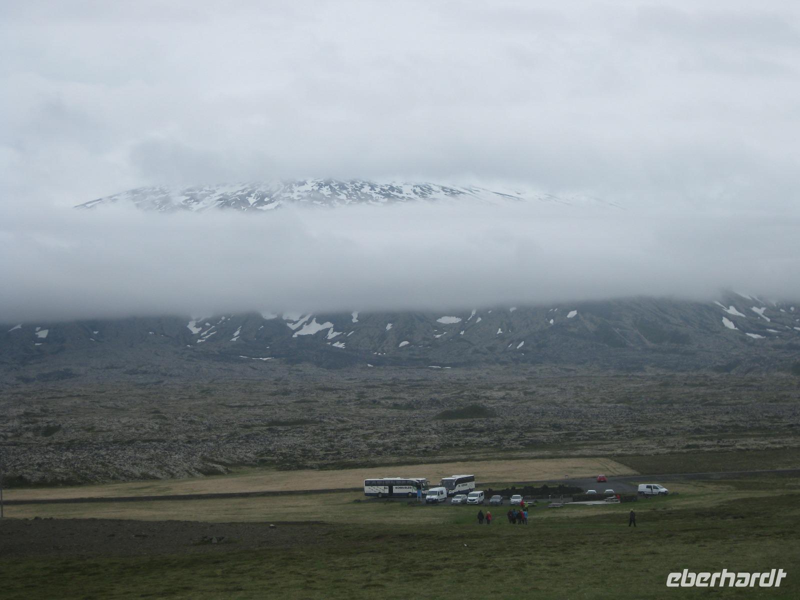 Wir verlassen die Stadt und fahren in Richtung Norden durch den Hvalfjördur-Tunnel und dann ab Borgarnes in Richtung Westen auf die Halbinsel Snaefellsnes. In Borgarnes machen wir Stopp. Hier können wir einen Kaffee trinken, Souvenire kaufen und uns etwas für unterwegs zum Essen und Trinken mitnehmen. Dann fahren wir weiter auf die Halbinsel Snaefellsnes. Überall können wir die Spuren vulkanischen Ursprungs entdecken. Ganz im Westen befindet sich der schon lange nicht mehr aktive, inzwischen vergletscherte Vulkan Snaefellsjökull. Er soll einer der schönsten Berge der Welt sein und er erlangte auch literarische Berühmtheit durch Jules Verne und Halldor Laxness. Leider zeigt er sich uns nicht, er versteckt sich in den Wolken.