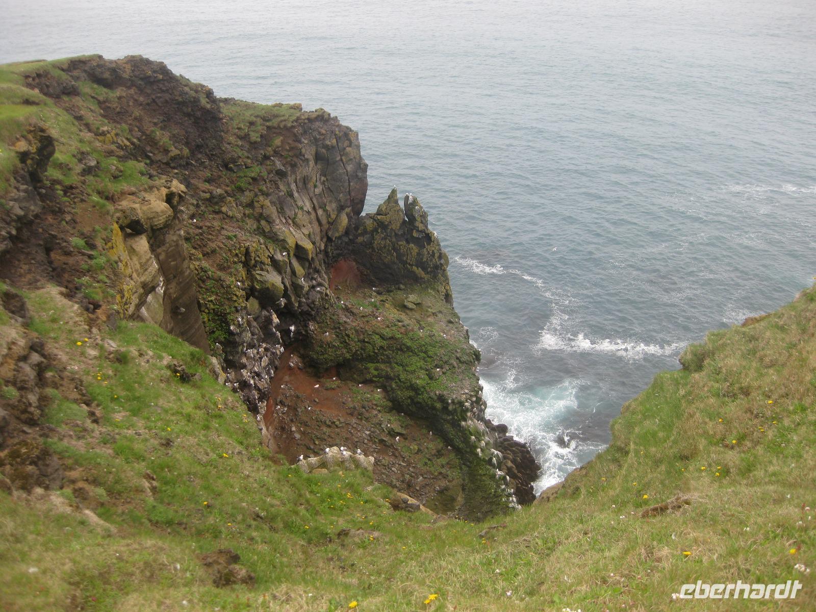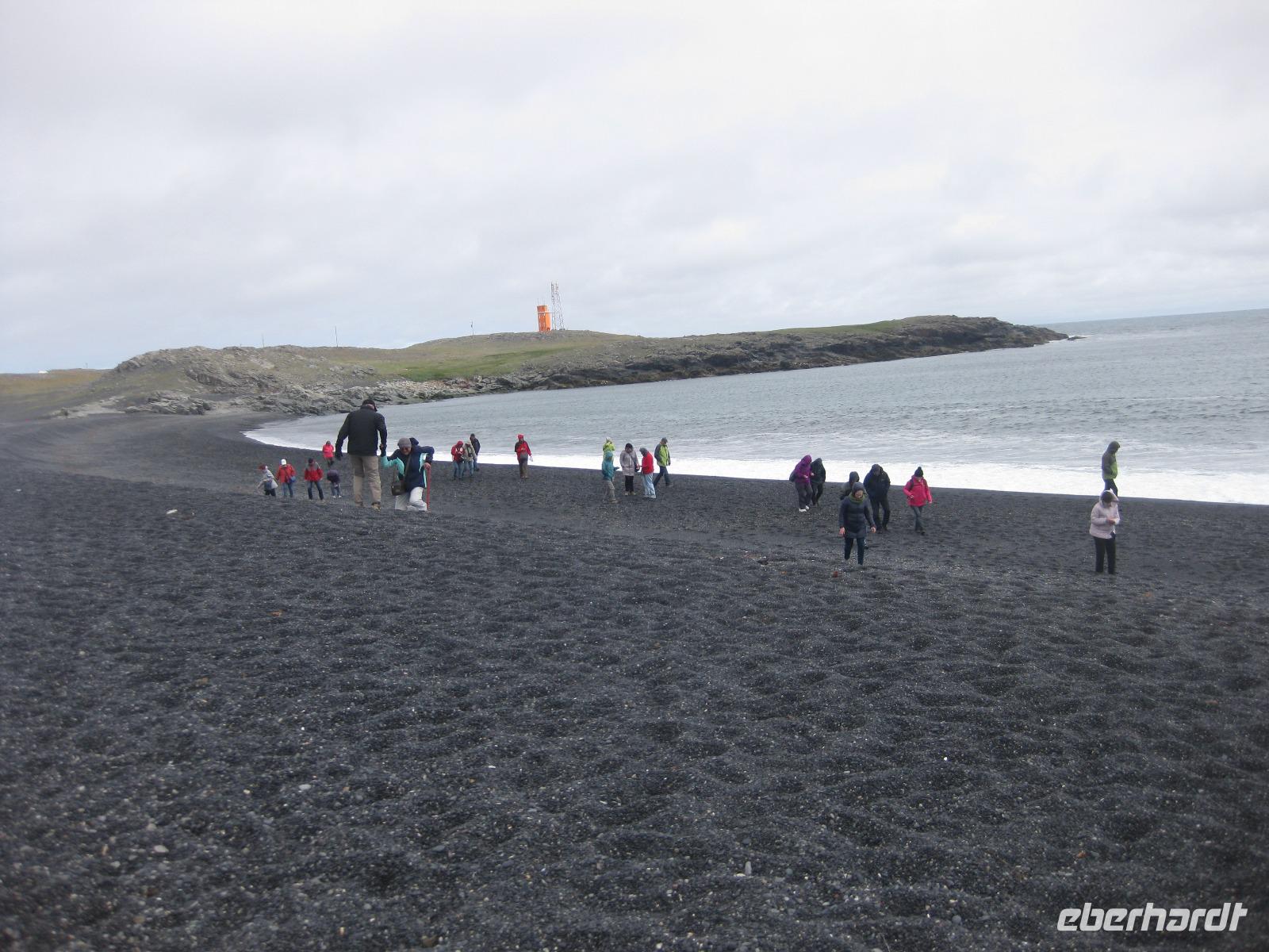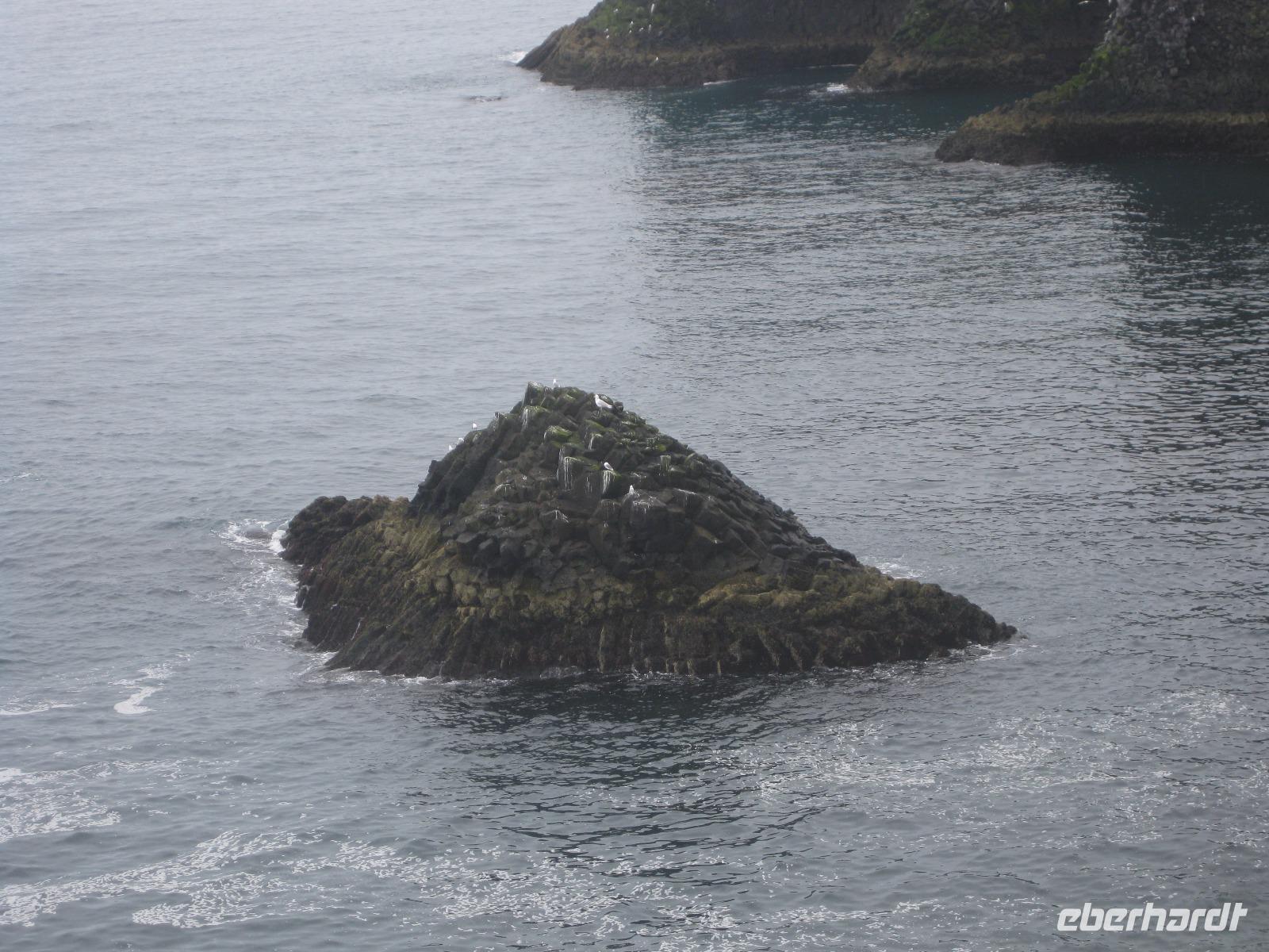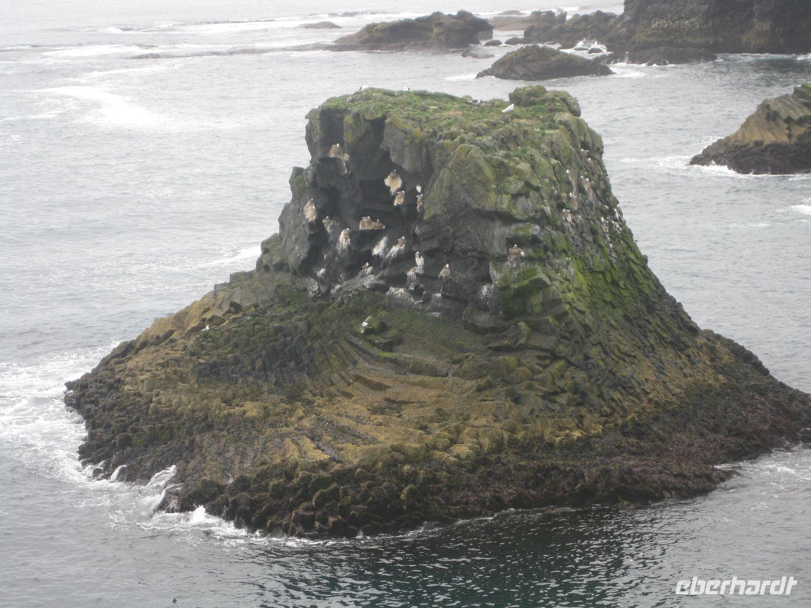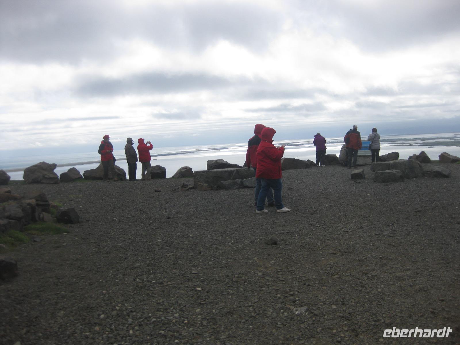 Heute ist nun schon der vorletzte Tag unserer Reise. Wie schnell doch die Zeit vergeht. Nach dem Frühstück starten wir zur letzten Etappe unserer Rundreise. Unser erstes Ziel am heutigen Tag ist die südlichste Landspitze Islands "Durholaey", das Südkap. Von dieser Felsklippe aus hat man bei gutem Wetter einen grandiosen Blick auf den Gletscher Myrdal mit dem Vulkan Katla im Inneren und auf den Vulkan Eyjafjallajökull, der im Jahr 2010 die Welt in Atem hielt. Leider haben sich die Gletscher heute in den Wolken versteckt. Und von "Durholaey" aus bietet sich auch ein faszinierender Blick auf das Felsentor "Tönni" und beiderseits auf die schwarze Sanderküste. Außerdem wird die Felsenklippe von unzähligen Seevögeln bewohnt, unter anderem auch von den Papageientauchern. Heute haben sie sich leider versteckt, sie zeigen sich uns nicht.