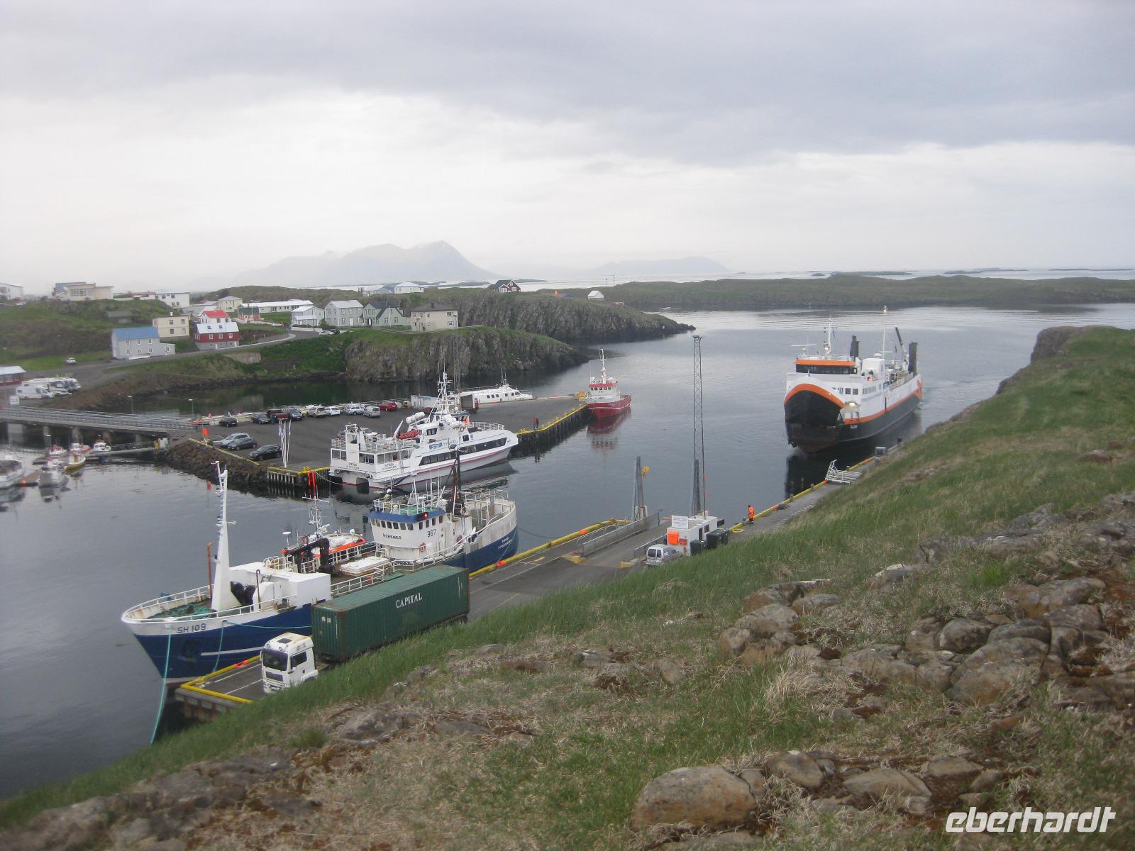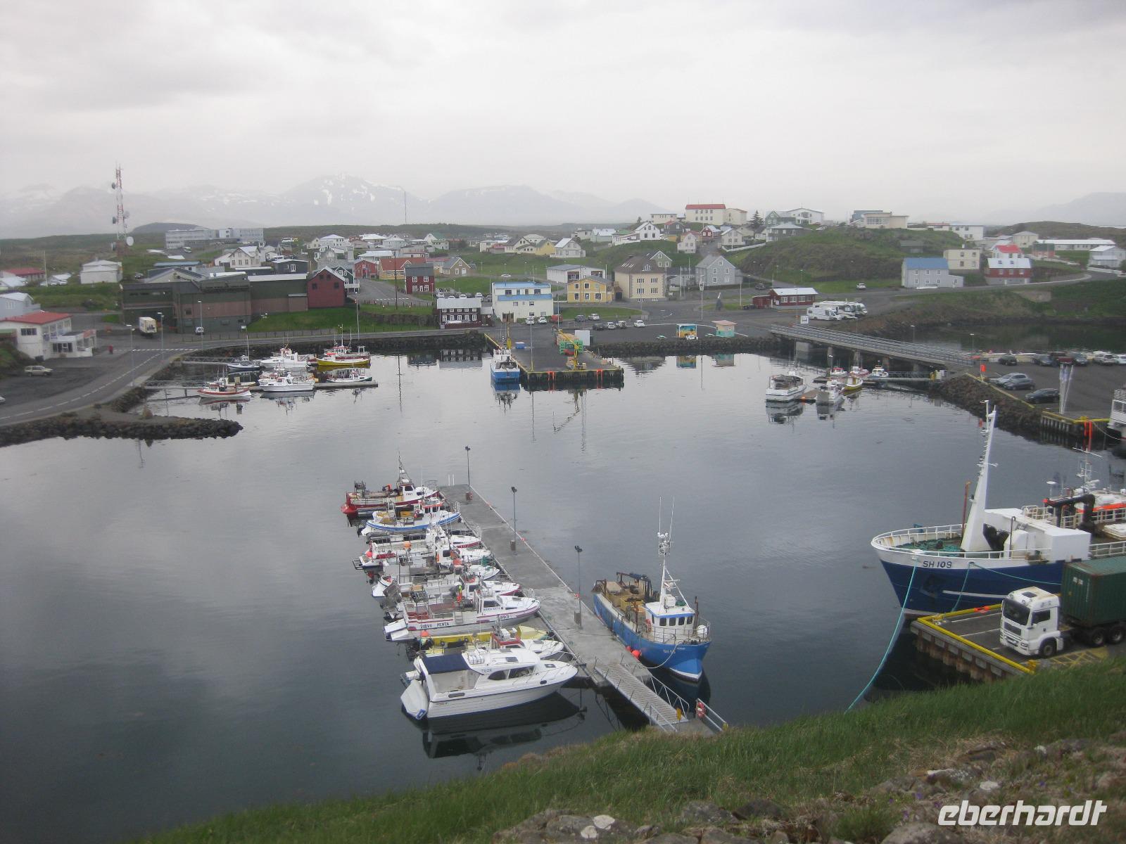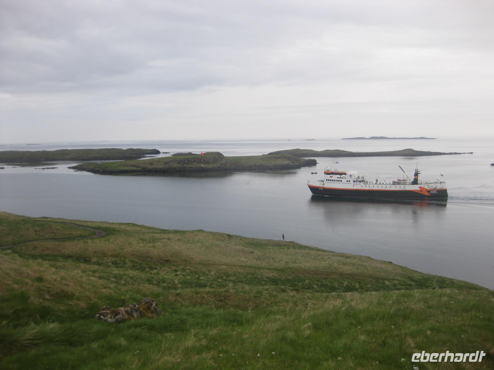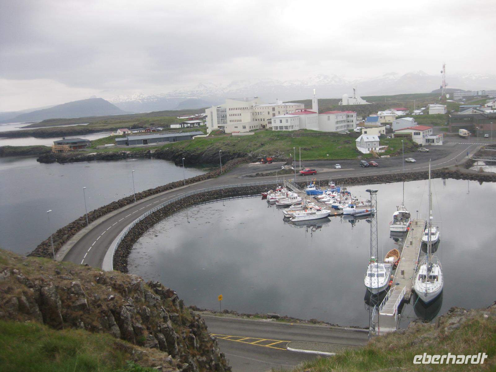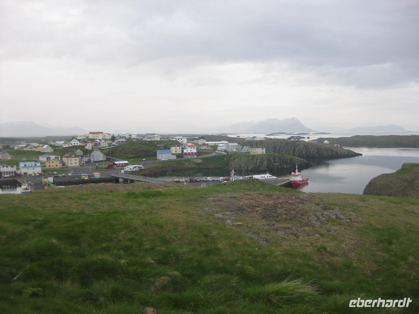 Am Abend erreichen wir das Städtchen Stykkisholmur an der Nordküste der Halbinsel. Hier übernachten wir im Hotel Stykkisholmur. Und da wir ja die Zeit der ganz langen Tage haben, das heißt, es wird eigentlich überhaupt nicht richtig dunkel, erkunden wir nach dem Abendessen noch ein wenig das Städtchen. Ein Fährschiff legt an. Mit diesem kann man zur Insel Flatey im Breidafjördur fahren. Von dem Hügel am Hafen hat man einen fantastischen Blick über den Breidafjördur mit seinen Schären und auch über das Städtchen Stykkisholmur. Ein besonder beeindruckender Tag geht zu Ende.