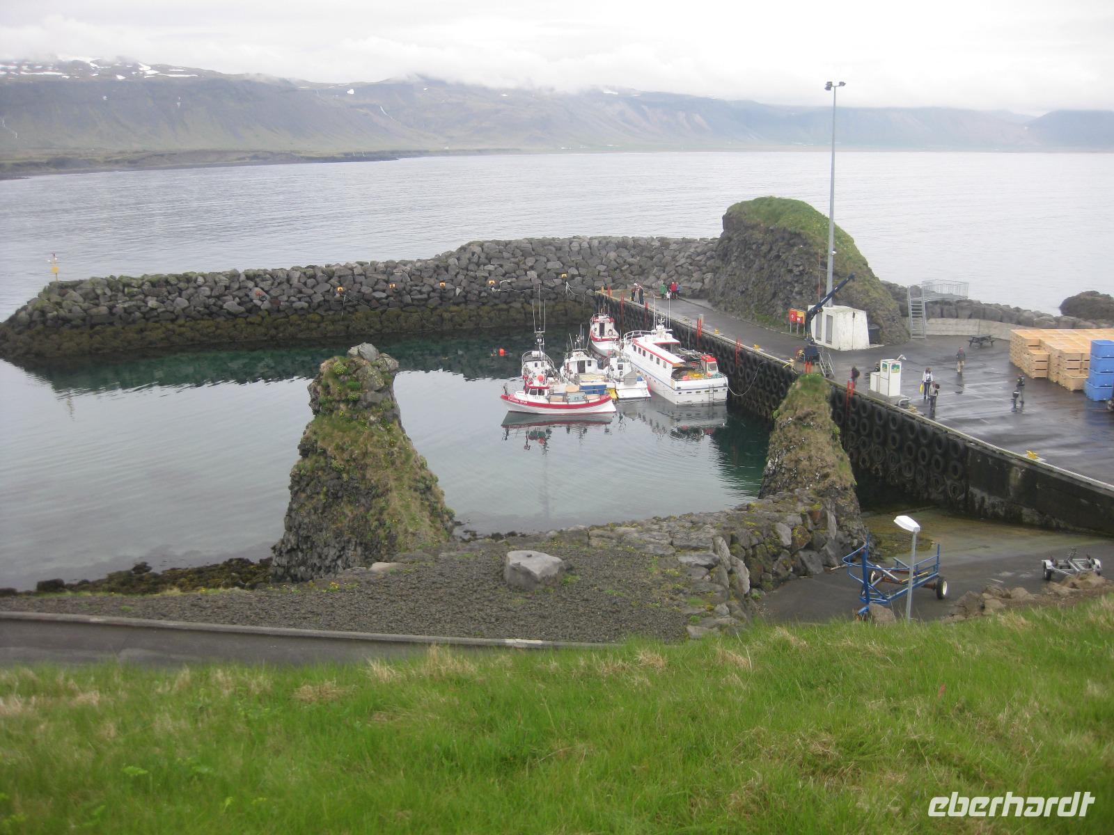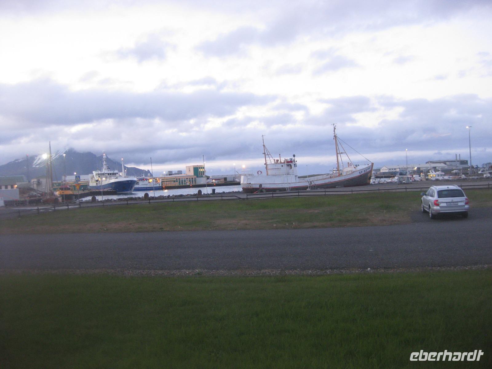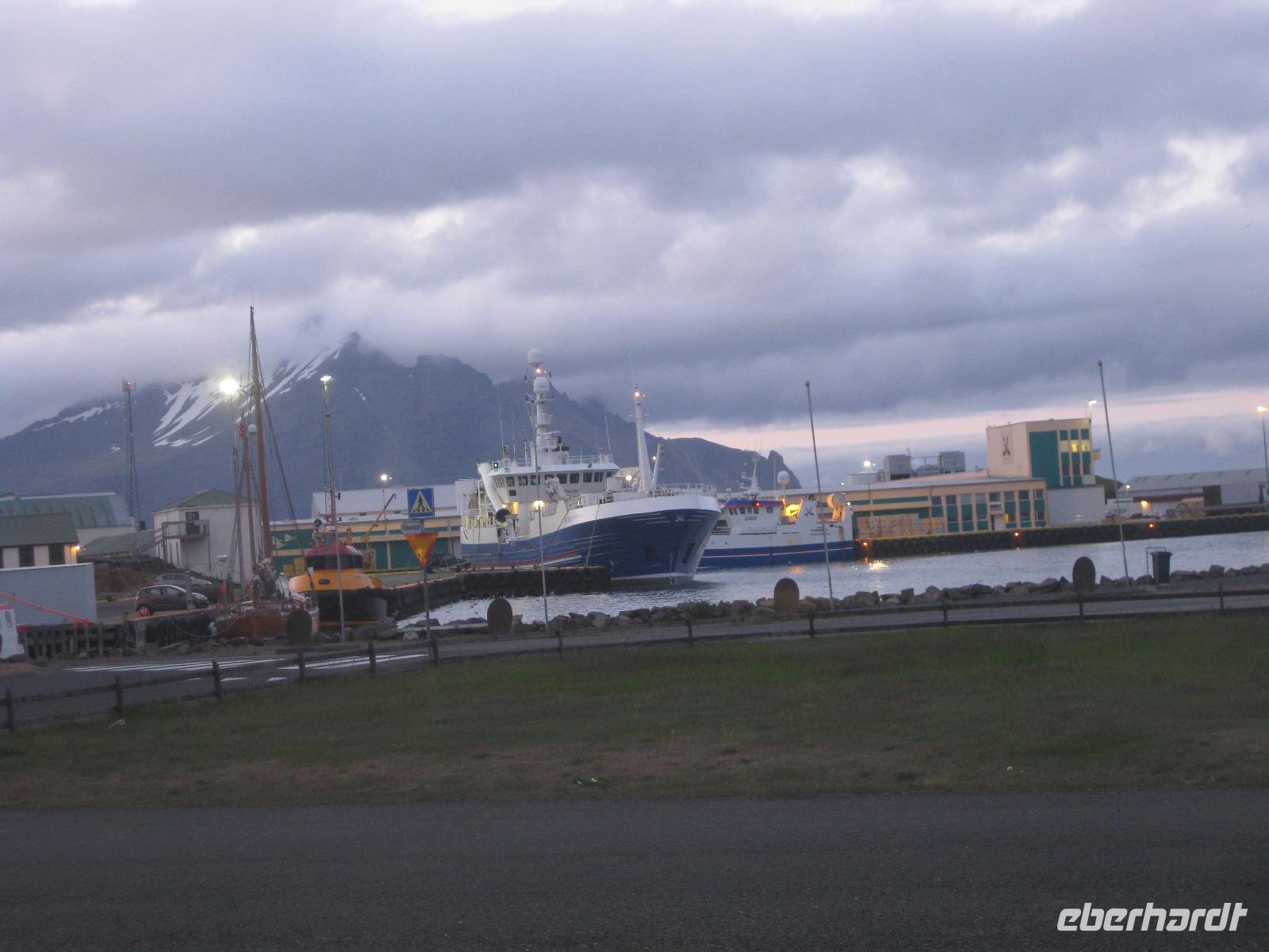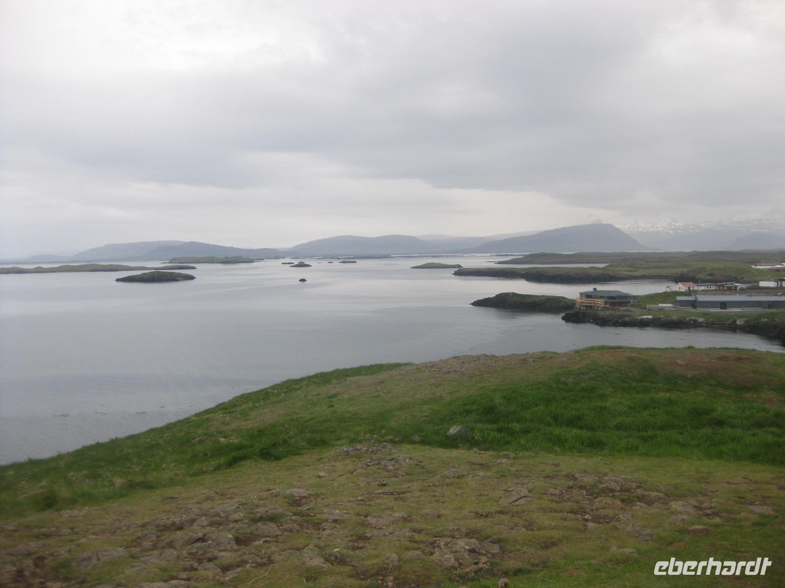 Am Abend erreichen wir das Städtchen Stykkisholmur an der Nordküste der Halbinsel. Hier übernachten wir im Hotel Stykkisholmur. Und da wir ja die Zeit der ganz langen Tage haben, das heißt, es wird eigentlich überhaupt nicht richtig dunkel, erkunden wir nach dem Abendessen noch ein wenig das Städtchen. Ein Fährschiff legt an. Mit diesem kann man zur Insel Flatey im Breidafjördur fahren. Von dem Hügel am Hafen hat man einen fantastischen Blick über den Breidafjördur mit seinen Schären und auch über das Städtchen Stykkisholmur. Ein besonder beeindruckender Tag geht zu Ende.