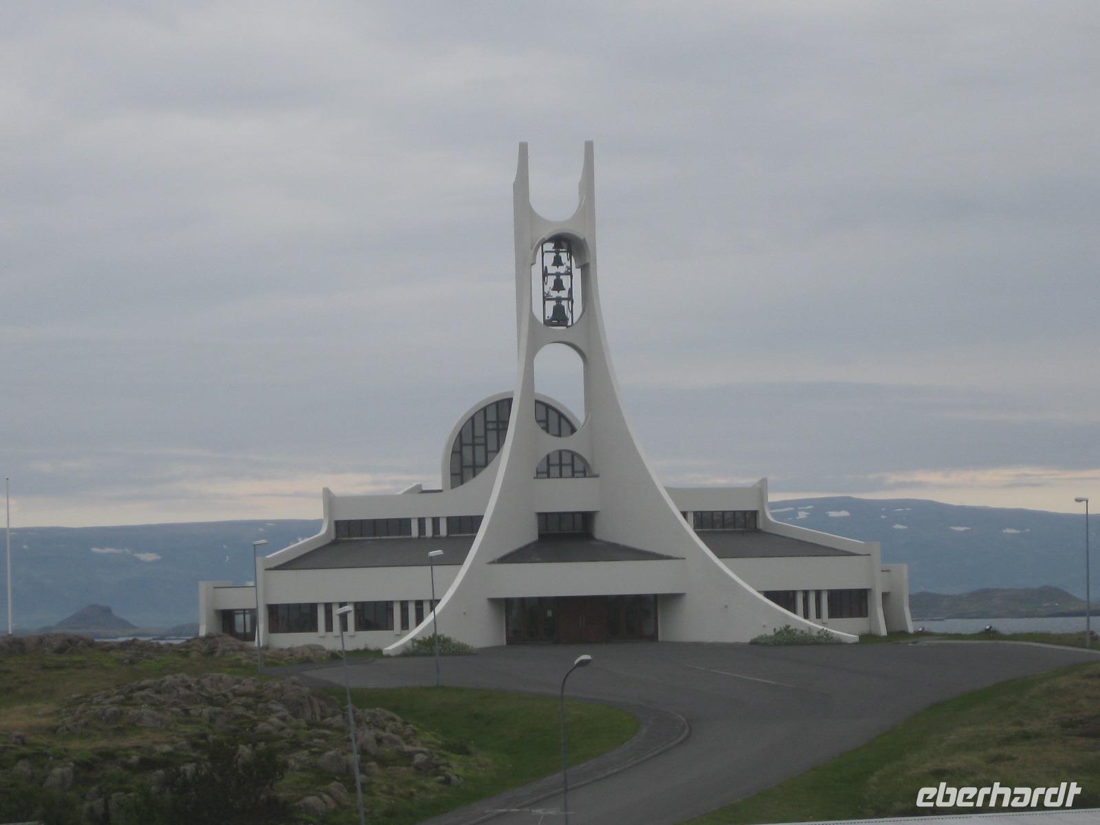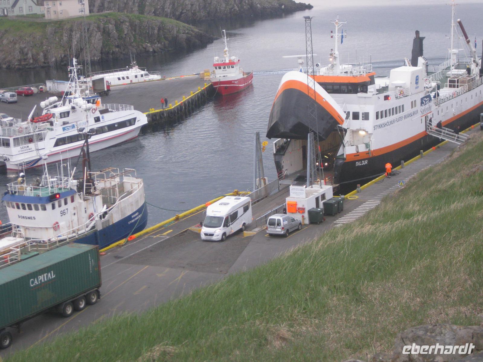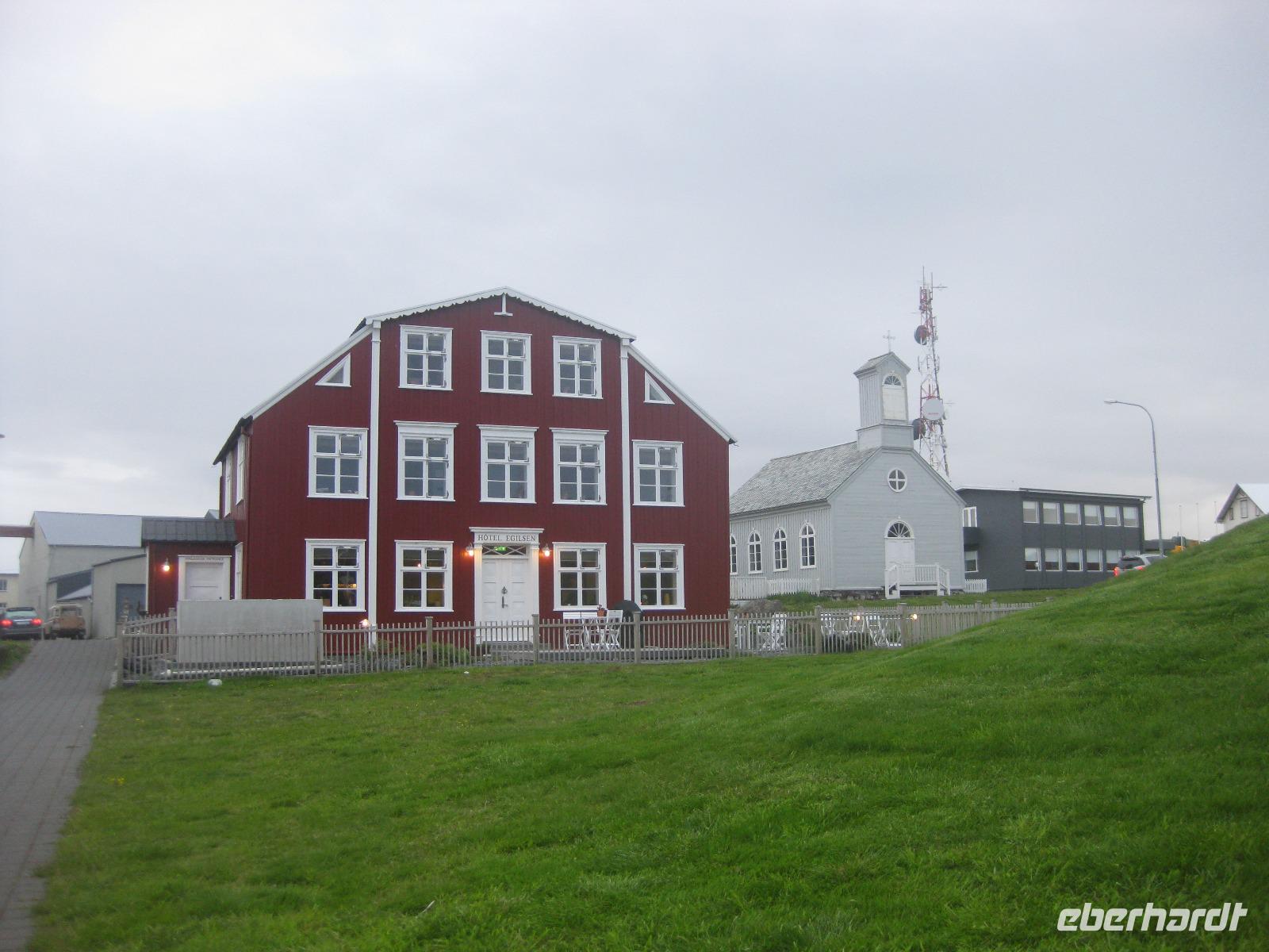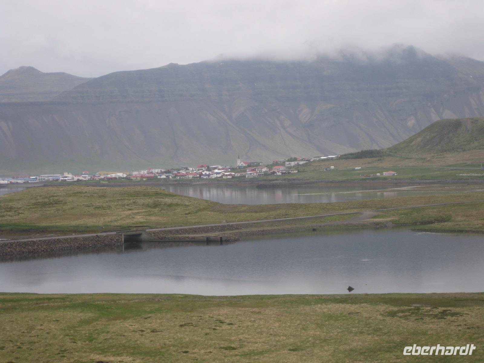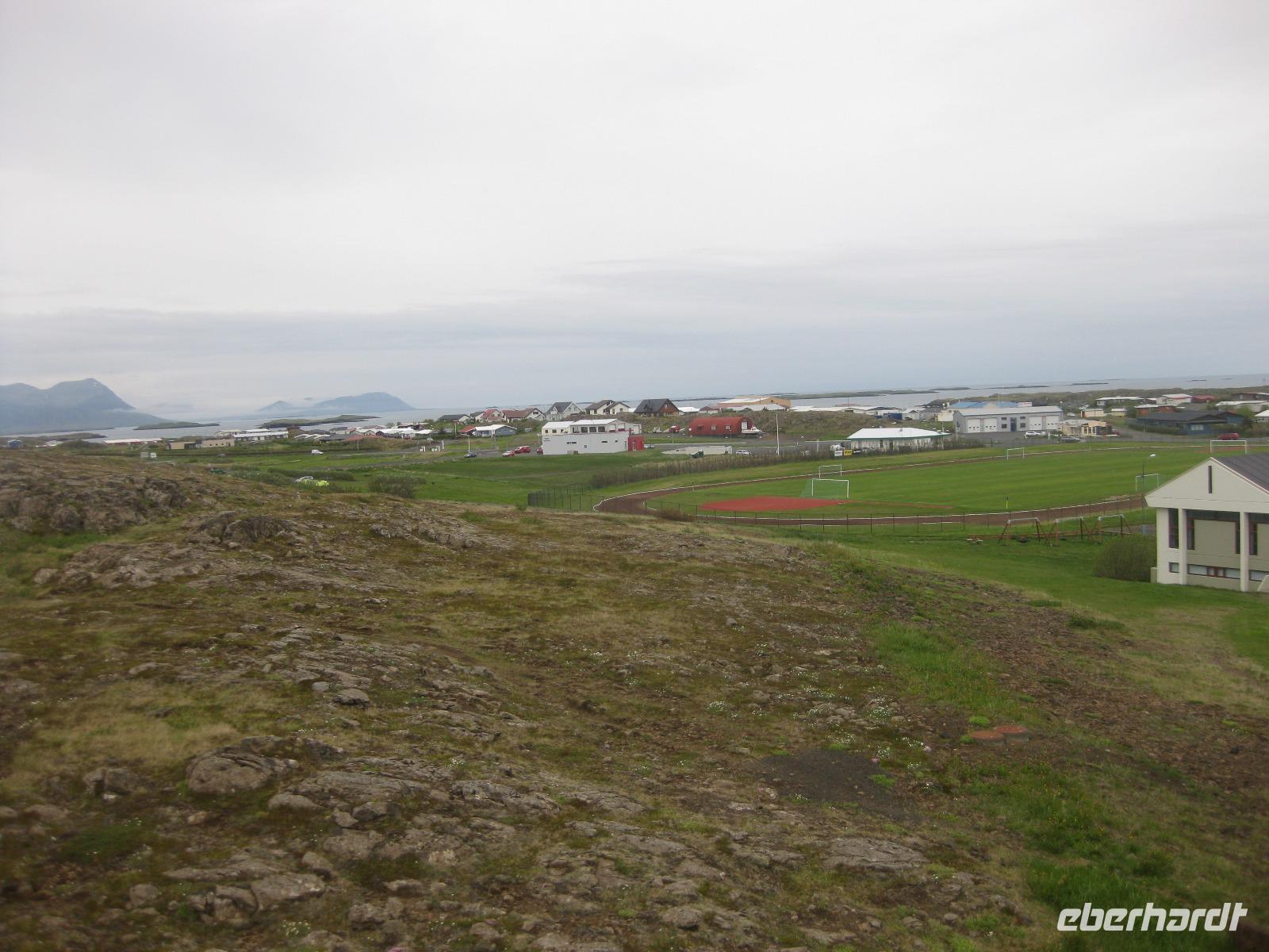 Am Abend erreichen wir das Städtchen Stykkisholmur an der Nordküste der Halbinsel. Hier übernachten wir im Hotel Stykkisholmur. Und da wir ja die Zeit der ganz langen Tage haben, das heißt, es wird eigentlich überhaupt nicht richtig dunkel, erkunden wir nach dem Abendessen noch ein wenig das Städtchen. Ein Fährschiff legt an. Mit diesem kann man zur Insel Flatey im Breidafjördur fahren. Von dem Hügel am Hafen hat man einen fantastischen Blick über den Breidafjördur mit seinen Schären und auch über das Städtchen Stykkisholmur. Ein besonder beeindruckender Tag geht zu Ende.