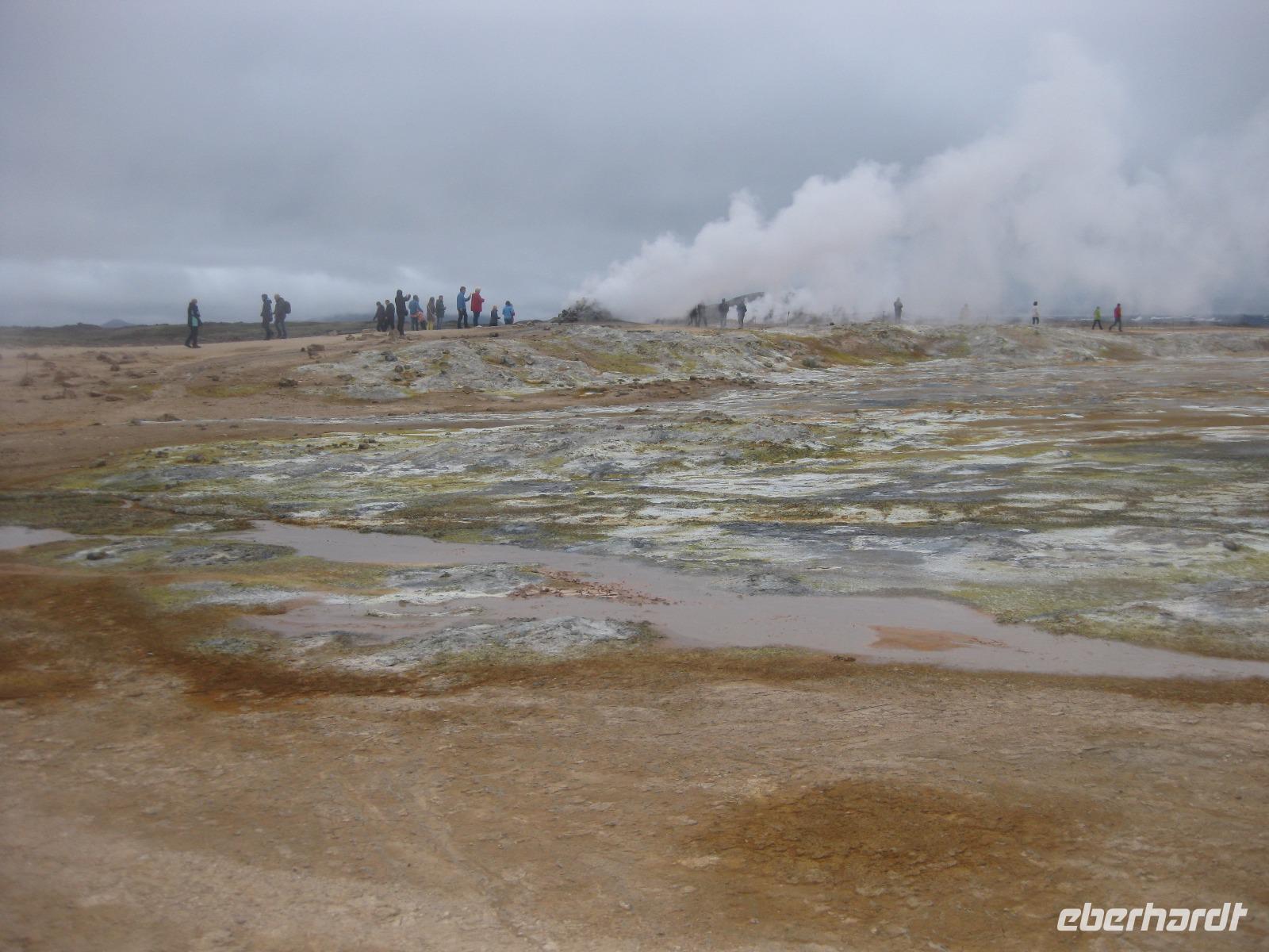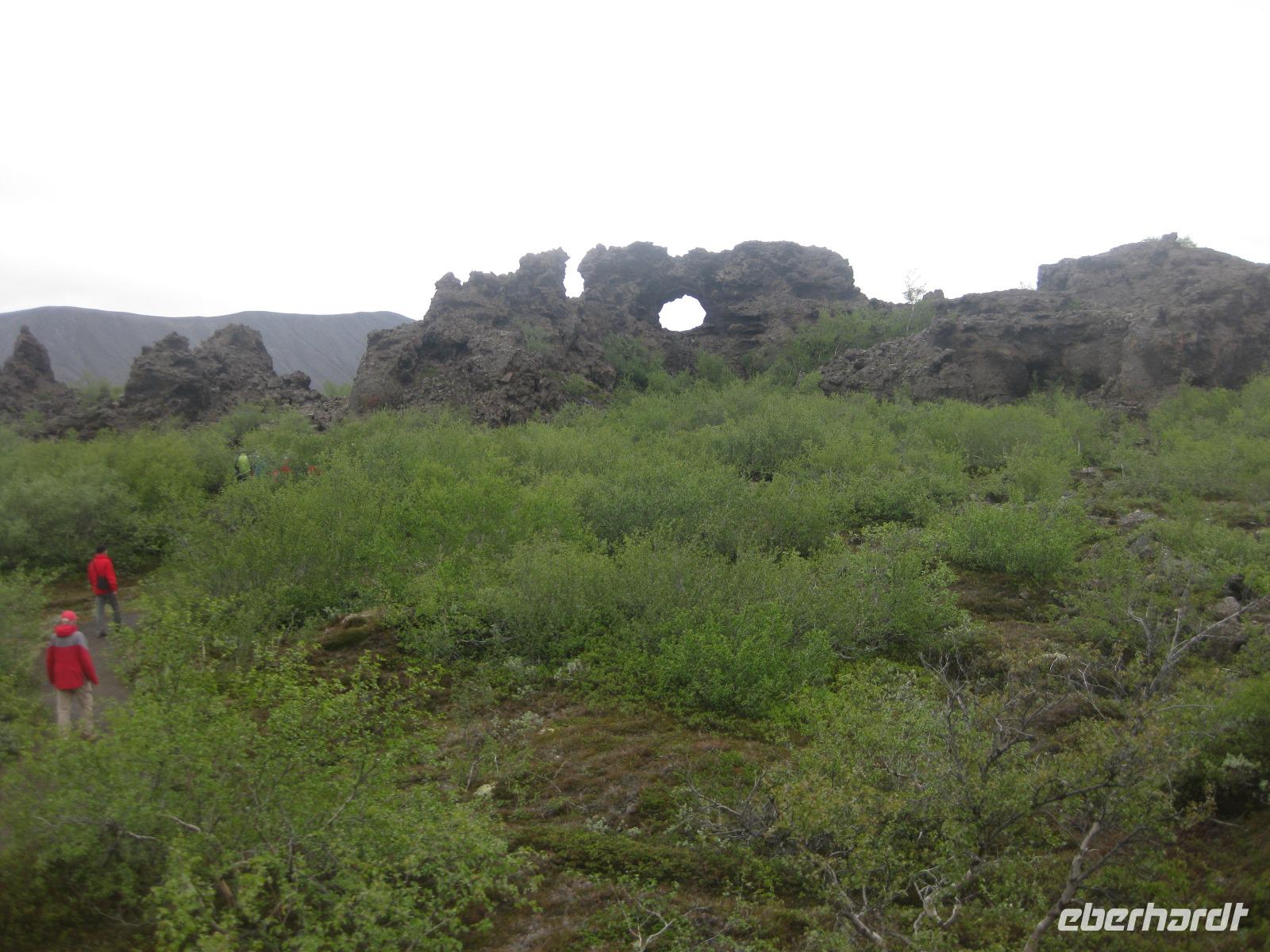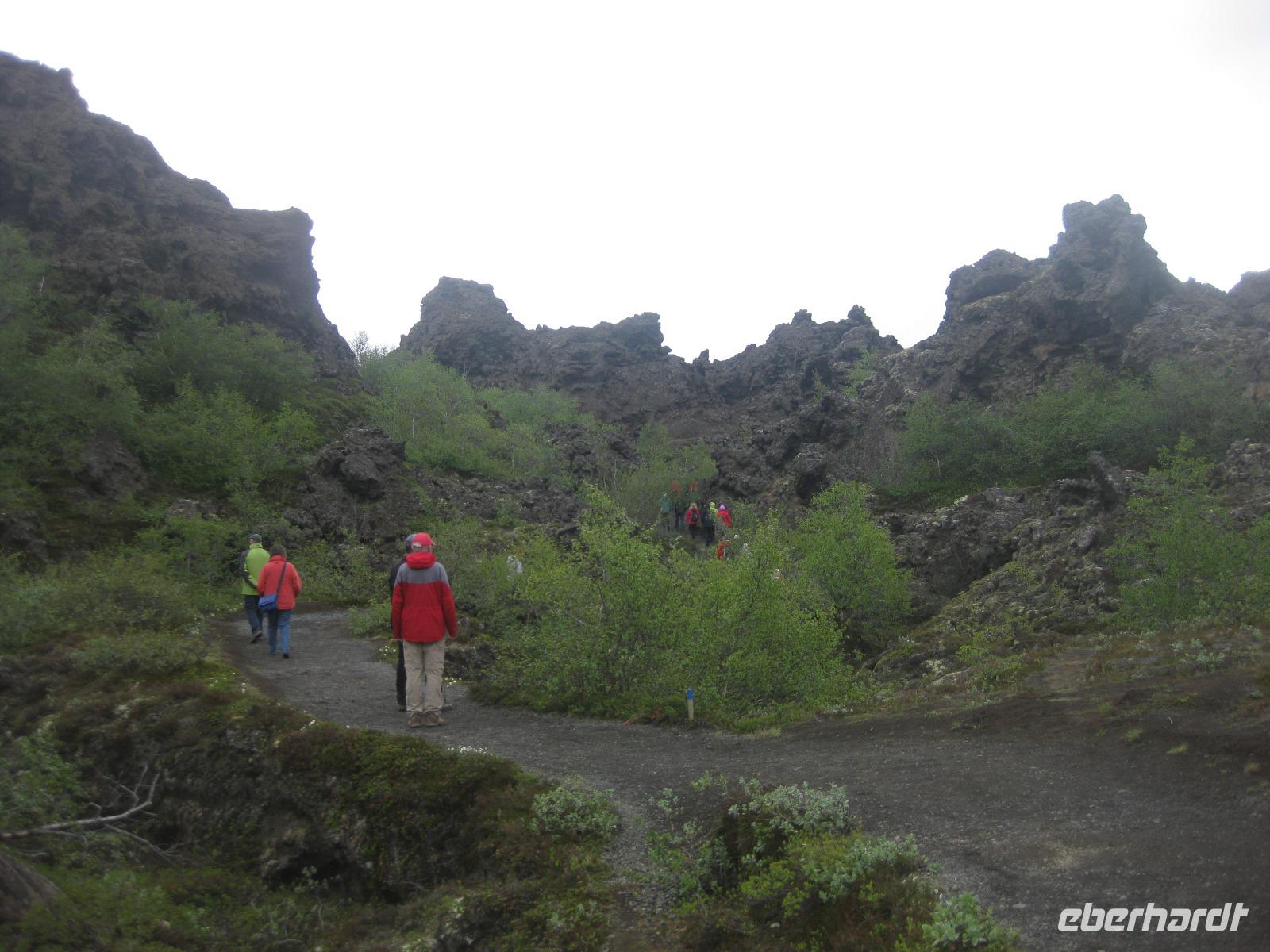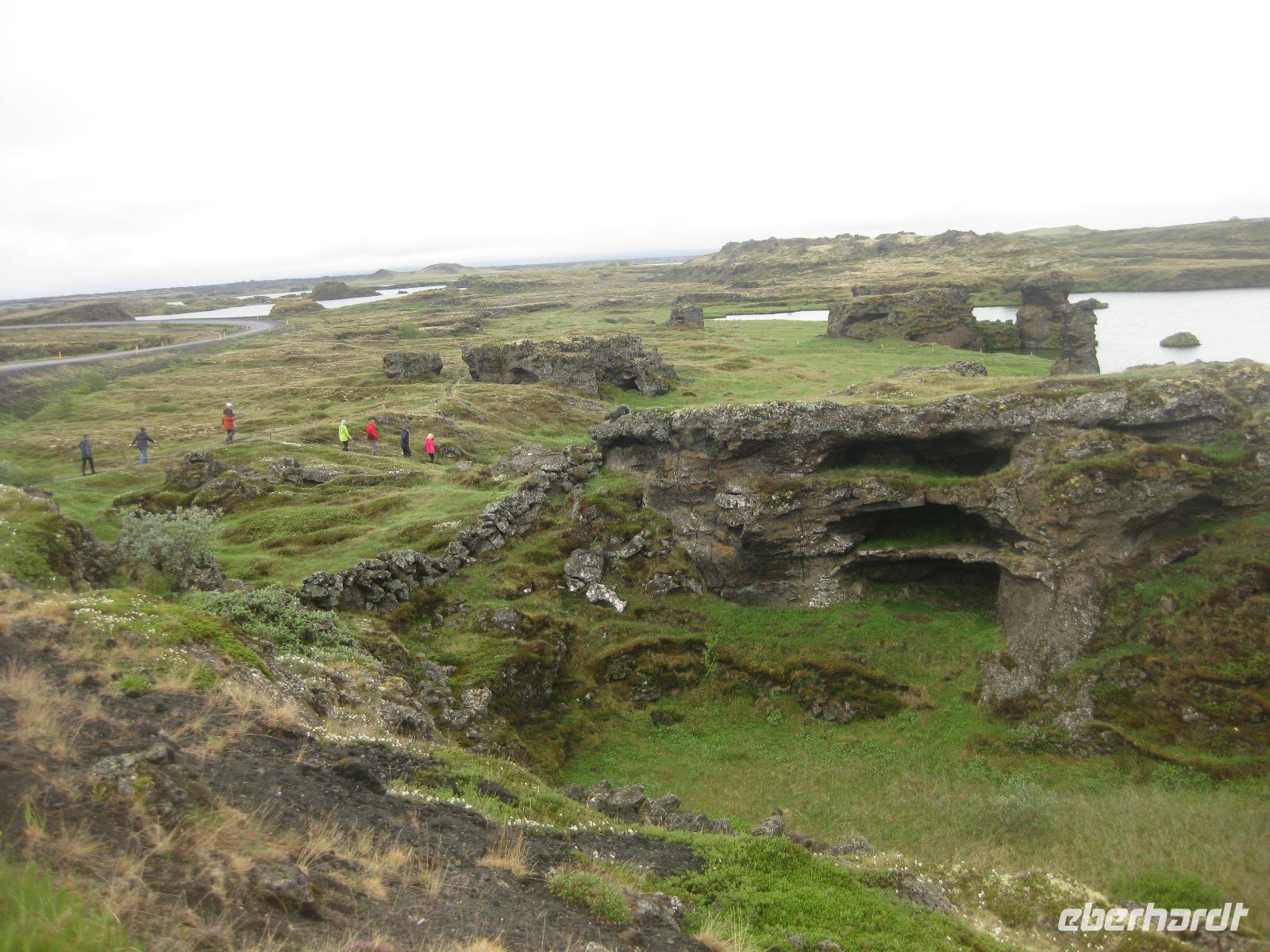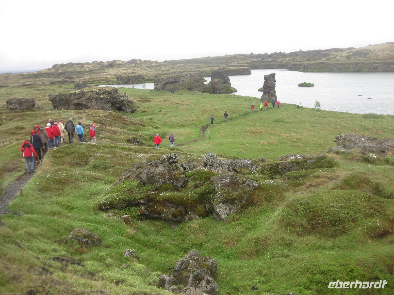 In Skutustadir halten wir. Hier sind die Pseudokrater am besten zugänglich und zu überblicken. Wir steigen aus dem Bus und es hat aufgehört zu regnen! Die Wolken sind wieder etwas höher, so dass wir gut über das ganze Gebiet schauen können. Bevor wir in Dimmuborgir einen Rundgang machen, stoppen wir erst noch mal am Myvatn-See, um die Lavasäulen von Kalvaströnd zu bestaunen - sehr eindrucksvoll. Der Rundgang durch Dimmuborgir, die "Dunklen Burgen" entpuppt sich als ein Spaziergang durch einen Irrgarten aus Lava. Wir müssen alle gut zusammen bleiben. Und hier könnte das zu Hause der 13 Weihnachtsmänner von Island sein, berichtet uns Berglind. Gleich neben Dimmuborgir befindet sich der gleichmäßig geformte Ringwallkrater des Hverfjall. Er ist weithin sichtbar. Wir fahren nur ein kleines Stück weiter in das Solfatarengebiet Hverarönd. Vorher stoppen wir noch an einem Aussichtspunkt, wo wir einen atemberaubenden Blick über das ganze Gebiet genießen können. Hverarönd ist wieder ganz anders als das bisher Gesehene. Hier brodelt und dampfen die Schwefel-, Schlamm- und Dampfquellen. Man kommt sich vor wie in des "Teufels Küche".