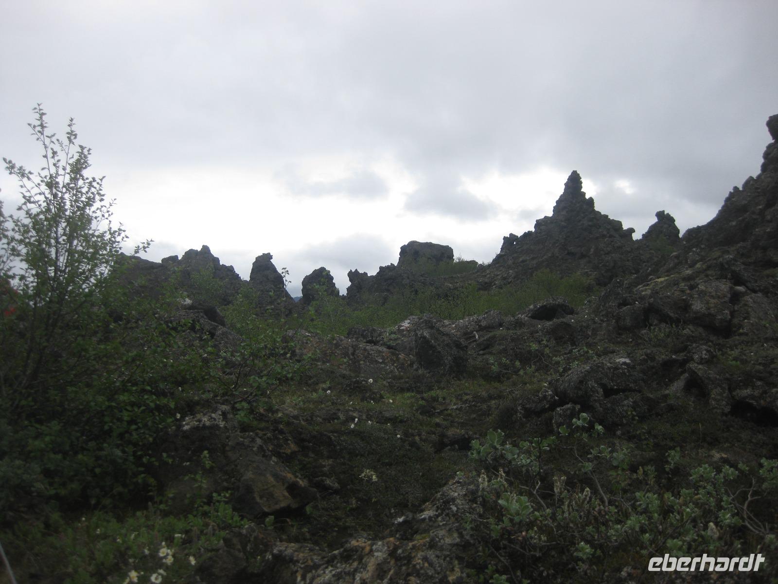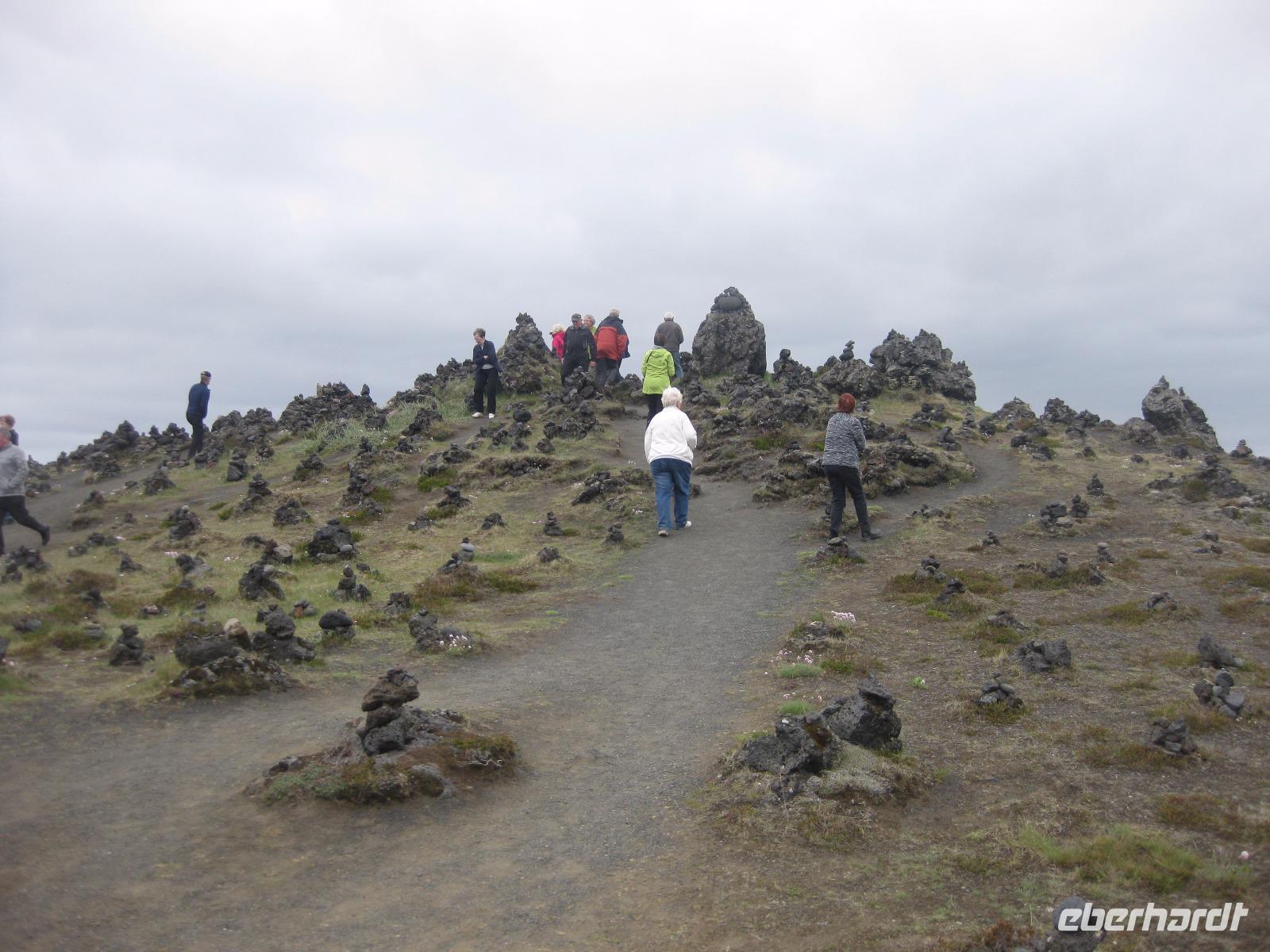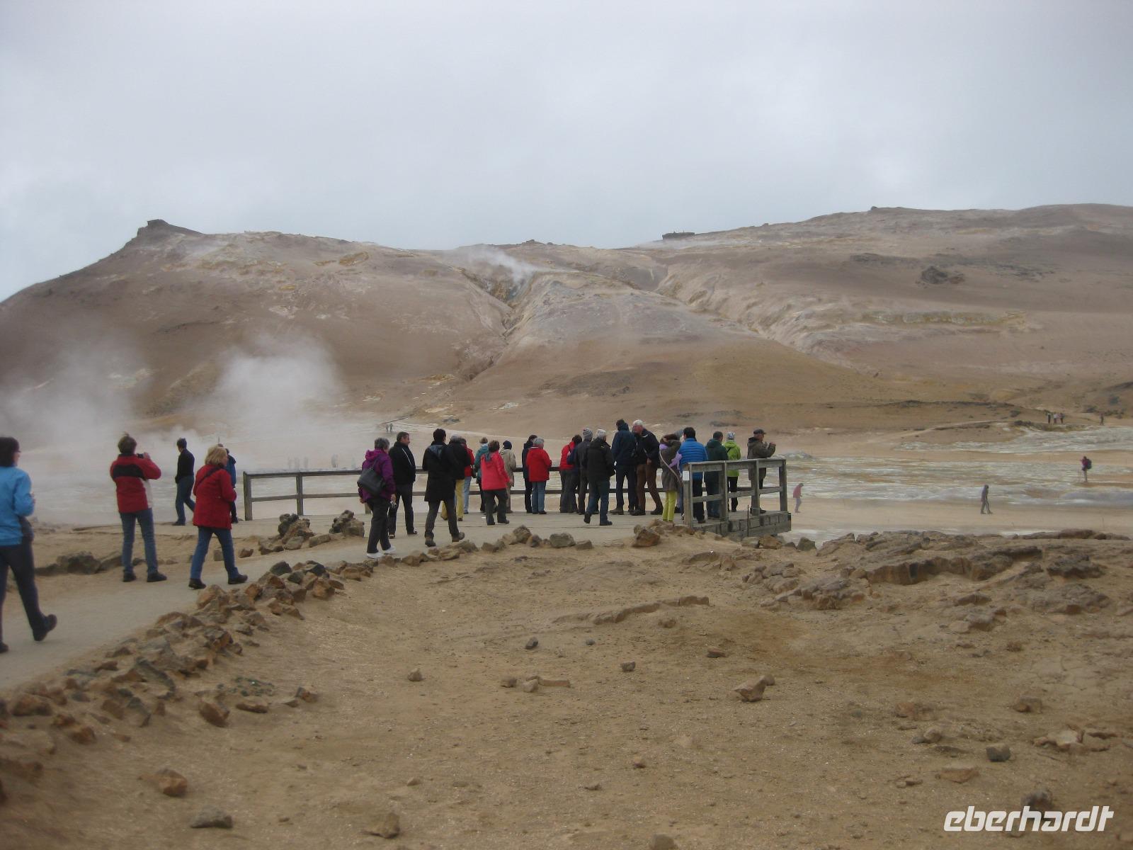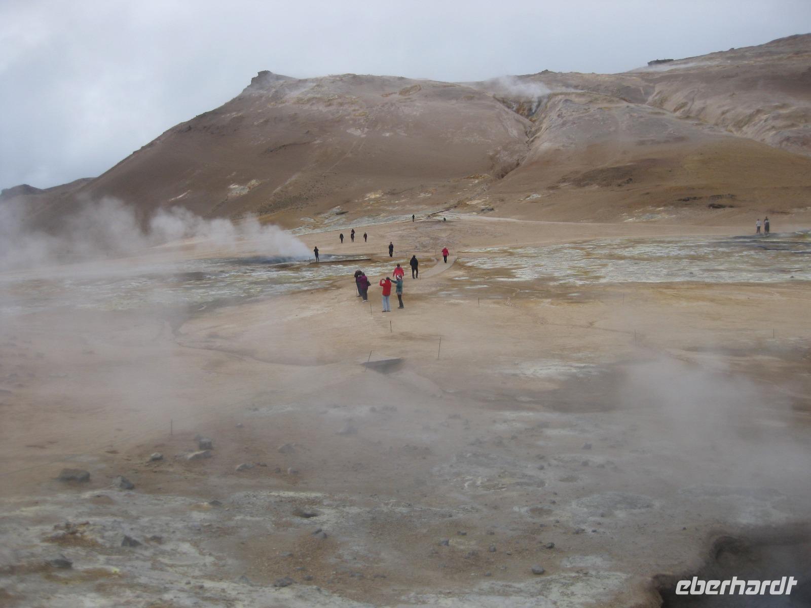 In Skutustadir halten wir. Hier sind die Pseudokrater am besten zugänglich und zu überblicken. Wir steigen aus dem Bus und es hat aufgehört zu regnen! Die Wolken sind wieder etwas höher, so dass wir gut über das ganze Gebiet schauen können. Bevor wir in Dimmuborgir einen Rundgang machen, stoppen wir erst noch mal am Myvatn-See, um die Lavasäulen von Kalvaströnd zu bestaunen - sehr eindrucksvoll. Der Rundgang durch Dimmuborgir, die "Dunklen Burgen" entpuppt sich als ein Spaziergang durch einen Irrgarten aus Lava. Wir müssen alle gut zusammen bleiben. Und hier könnte das zu Hause der 13 Weihnachtsmänner von Island sein, berichtet uns Berglind. Gleich neben Dimmuborgir befindet sich der gleichmäßig geformte Ringwallkrater des Hverfjall. Er ist weithin sichtbar. Wir fahren nur ein kleines Stück weiter in das Solfatarengebiet Hverarönd. Vorher stoppen wir noch an einem Aussichtspunkt, wo wir einen atemberaubenden Blick über das ganze Gebiet genießen können. Hverarönd ist wieder ganz anders als das bisher Gesehene. Hier brodelt und dampfen die Schwefel-, Schlamm- und Dampfquellen. Man kommt sich vor wie in des "Teufels Küche".