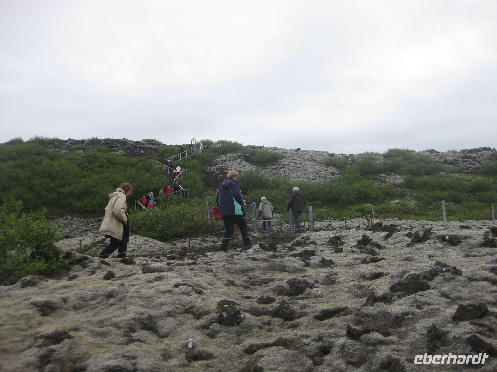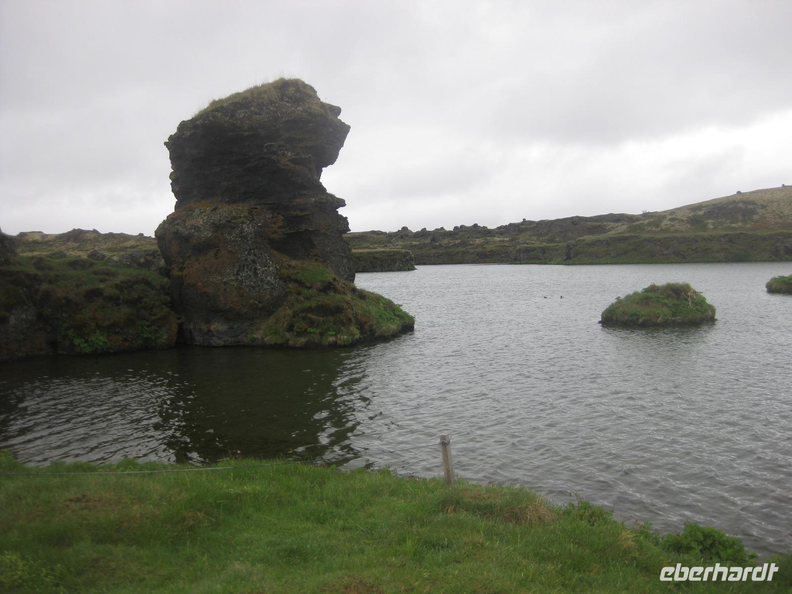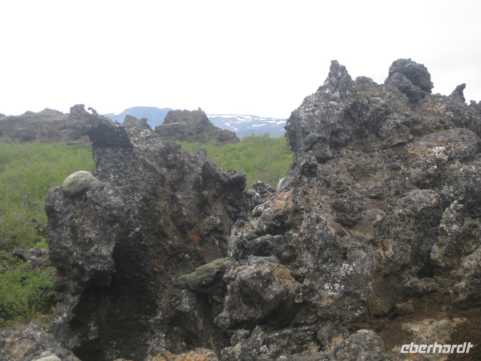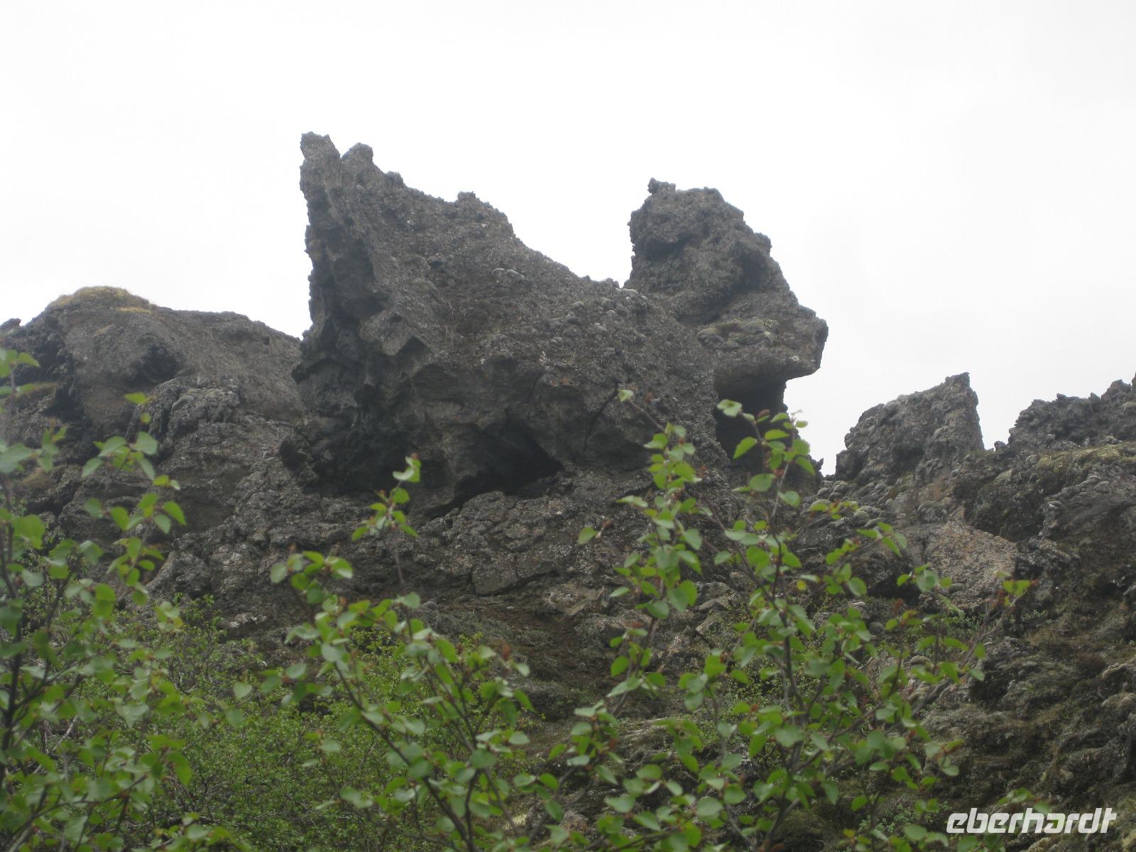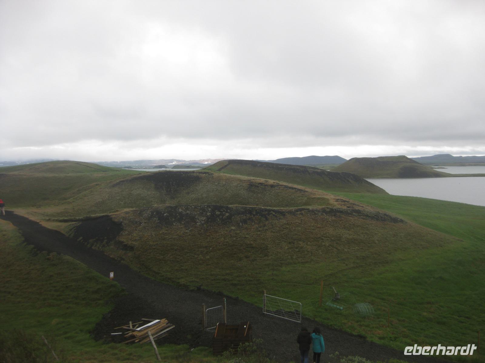In Skutustadir halten wir. Hier sind die Pseudokrater am besten zugänglich und zu überblicken. Wir steigen aus dem Bus und es hat aufgehört zu regnen! Die Wolken sind wieder etwas höher, so dass wir gut über das ganze Gebiet schauen können. Bevor wir in Dimmuborgir einen Rundgang machen, stoppen wir erst noch mal am Myvatn-See, um die Lavasäulen von Kalvaströnd zu bestaunen - sehr eindrucksvoll. Der Rundgang durch Dimmuborgir, die "Dunklen Burgen" entpuppt sich als ein Spaziergang durch einen Irrgarten aus Lava. Wir müssen alle gut zusammen bleiben. Und hier könnte das zu Hause der 13 Weihnachtsmänner von Island sein, berichtet uns Berglind. Gleich neben Dimmuborgir befindet sich der gleichmäßig geformte Ringwallkrater des Hverfjall. Er ist weithin sichtbar. Wir fahren nur ein kleines Stück weiter in das Solfatarengebiet Hverarönd. Vorher stoppen wir noch an einem Aussichtspunkt, wo wir einen atemberaubenden Blick über das ganze Gebiet genießen können. Hverarönd ist wieder ganz anders als das bisher Gesehene. Hier brodelt und dampfen die Schwefel-, Schlamm- und Dampfquellen. Man kommt sich vor wie in des "Teufels Küche".