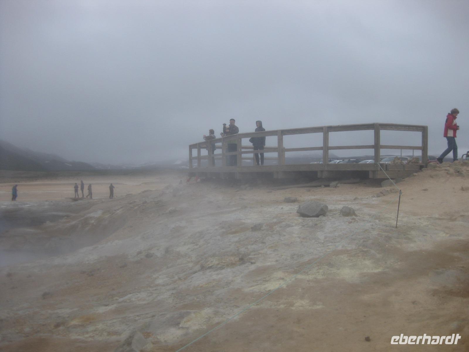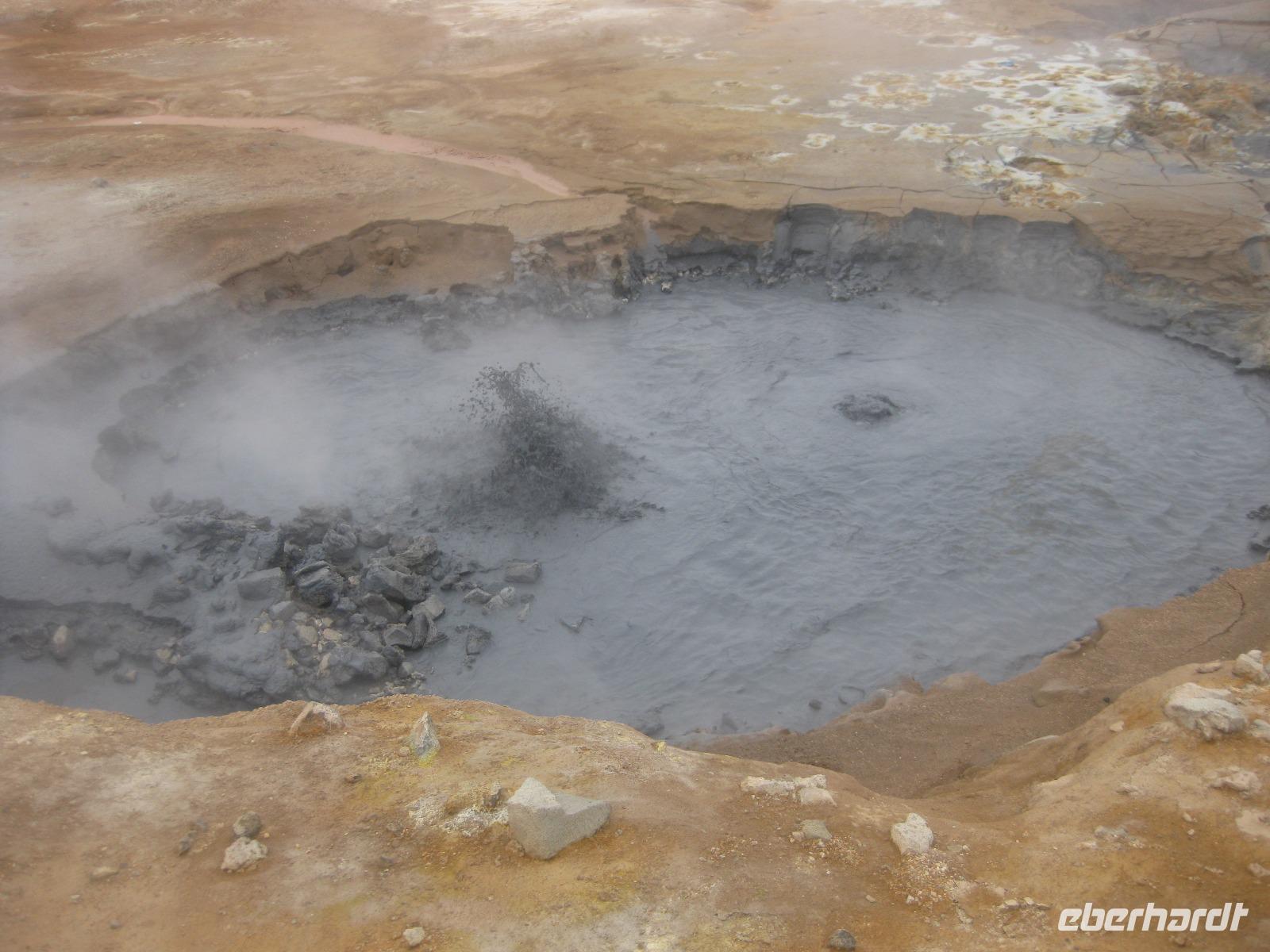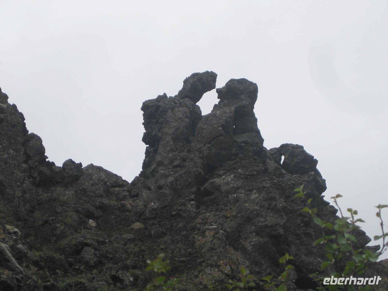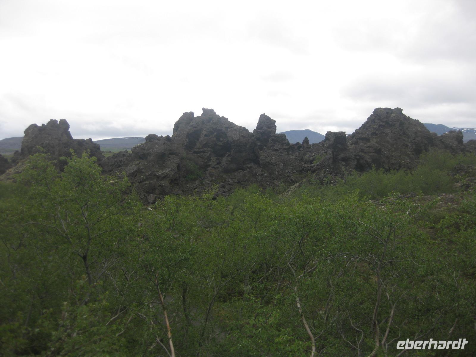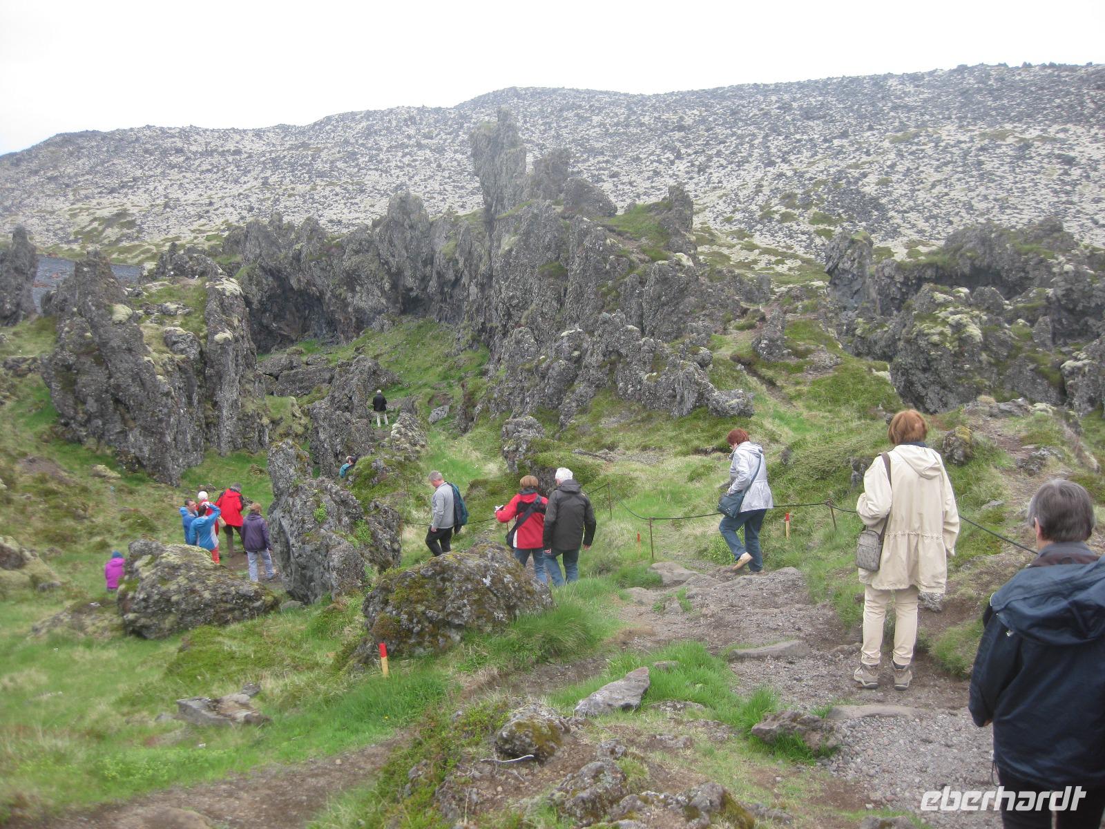 In Skutustadir halten wir. Hier sind die Pseudokrater am besten zugänglich und zu überblicken. Wir steigen aus dem Bus und es hat aufgehört zu regnen! Die Wolken sind wieder etwas höher, so dass wir gut über das ganze Gebiet schauen können. Bevor wir in Dimmuborgir einen Rundgang machen, stoppen wir erst noch mal am Myvatn-See, um die Lavasäulen von Kalvaströnd zu bestaunen - sehr eindrucksvoll. Der Rundgang durch Dimmuborgir, die "Dunklen Burgen" entpuppt sich als ein Spaziergang durch einen Irrgarten aus Lava. Wir müssen alle gut zusammen bleiben. Und hier könnte das zu Hause der 13 Weihnachtsmänner von Island sein, berichtet uns Berglind. Gleich neben Dimmuborgir befindet sich der gleichmäßig geformte Ringwallkrater des Hverfjall. Er ist weithin sichtbar. Wir fahren nur ein kleines Stück weiter in das Solfatarengebiet Hverarönd. Vorher stoppen wir noch an einem Aussichtspunkt, wo wir einen atemberaubenden Blick über das ganze Gebiet genießen können. Hverarönd ist wieder ganz anders als das bisher Gesehene. Hier brodelt und dampfen die Schwefel-, Schlamm- und Dampfquellen. Man kommt sich vor wie in des "Teufels Küche".