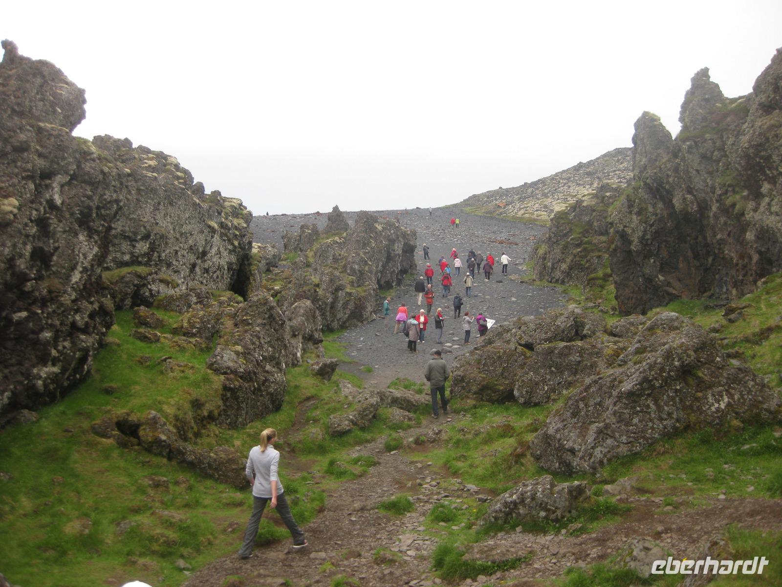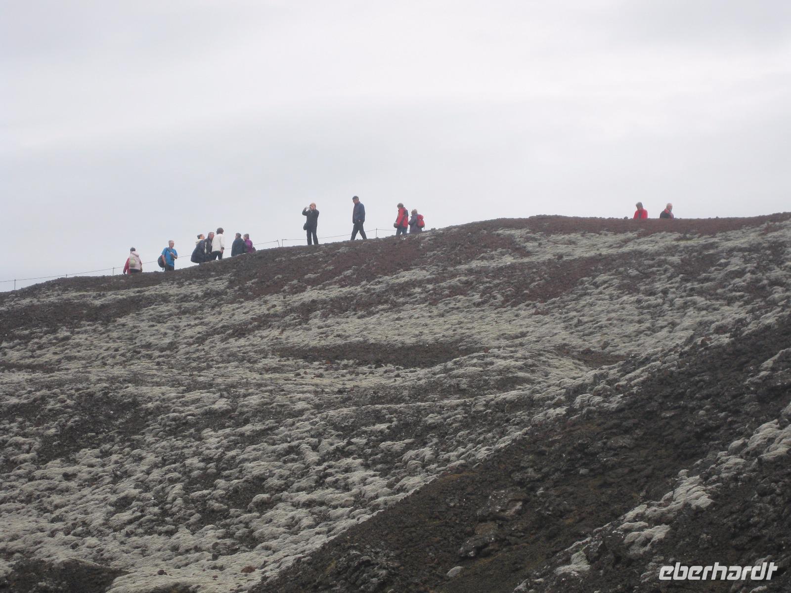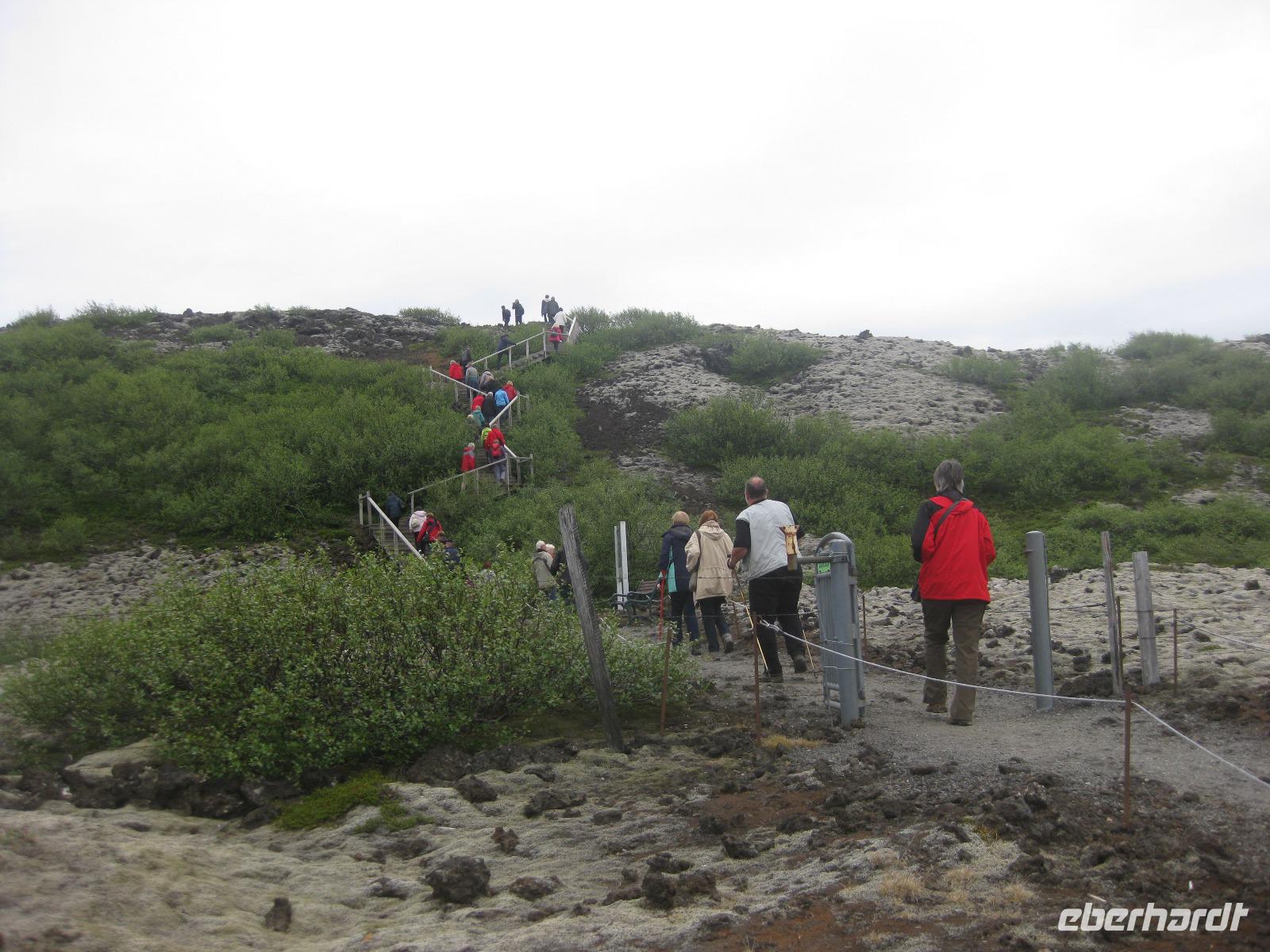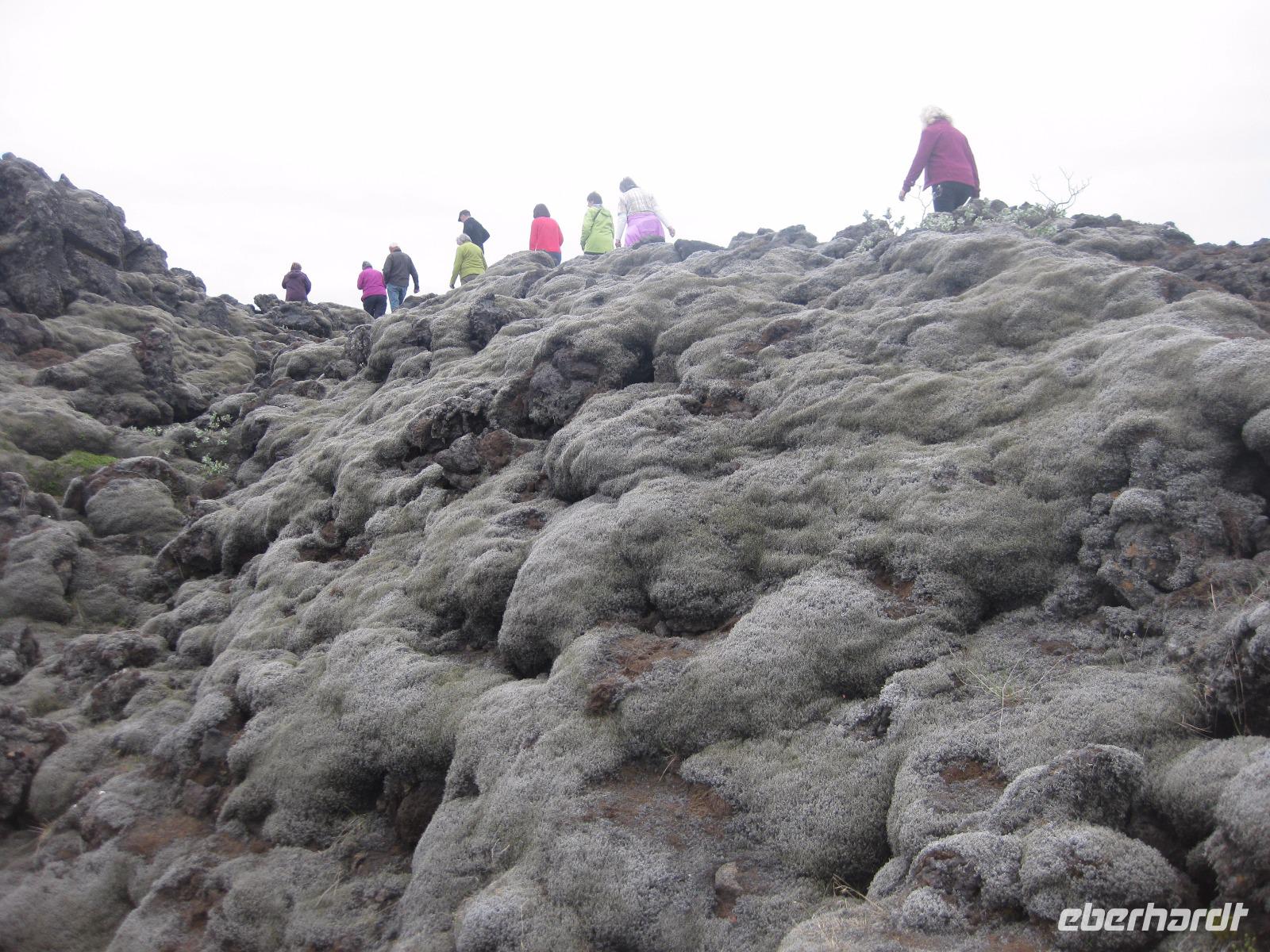 In Skutustadir halten wir. Hier sind die Pseudokrater am besten zugänglich und zu überblicken. Wir steigen aus dem Bus und es hat aufgehört zu regnen! Die Wolken sind wieder etwas höher, so dass wir gut über das ganze Gebiet schauen können. Bevor wir in Dimmuborgir einen Rundgang machen, stoppen wir erst noch mal am Myvatn-See, um die Lavasäulen von Kalvaströnd zu bestaunen - sehr eindrucksvoll. Der Rundgang durch Dimmuborgir, die "Dunklen Burgen" entpuppt sich als ein Spaziergang durch einen Irrgarten aus Lava. Wir müssen alle gut zusammen bleiben. Und hier könnte das zu Hause der 13 Weihnachtsmänner von Island sein, berichtet uns Berglind. Gleich neben Dimmuborgir befindet sich der gleichmäßig geformte Ringwallkrater des Hverfjall. Er ist weithin sichtbar. Wir fahren nur ein kleines Stück weiter in das Solfatarengebiet Hverarönd. Vorher stoppen wir noch an einem Aussichtspunkt, wo wir einen atemberaubenden Blick über das ganze Gebiet genießen können. Hverarönd ist wieder ganz anders als das bisher Gesehene. Hier brodelt und dampfen die Schwefel-, Schlamm- und Dampfquellen. Man kommt sich vor wie in des "Teufels Küche".