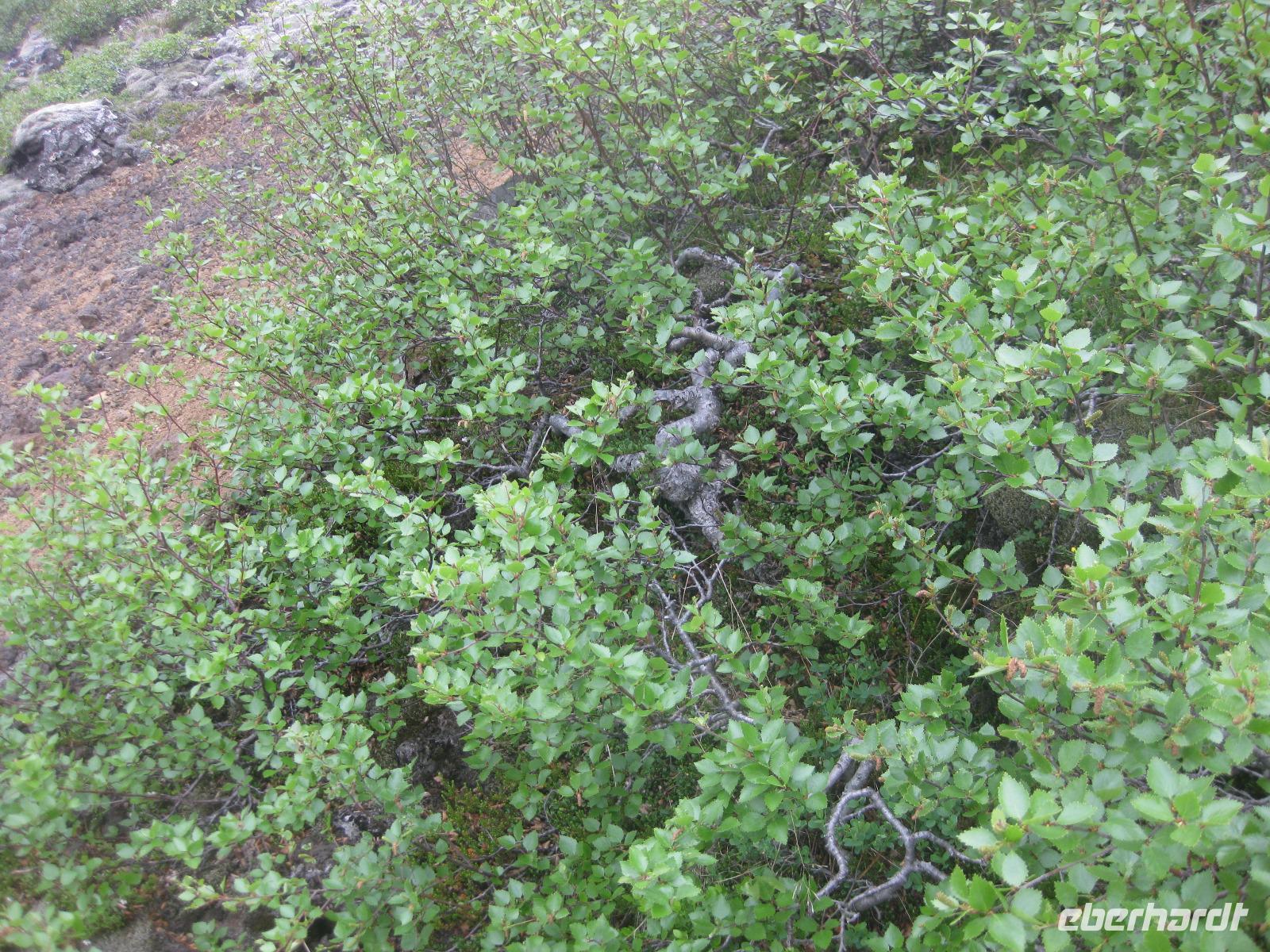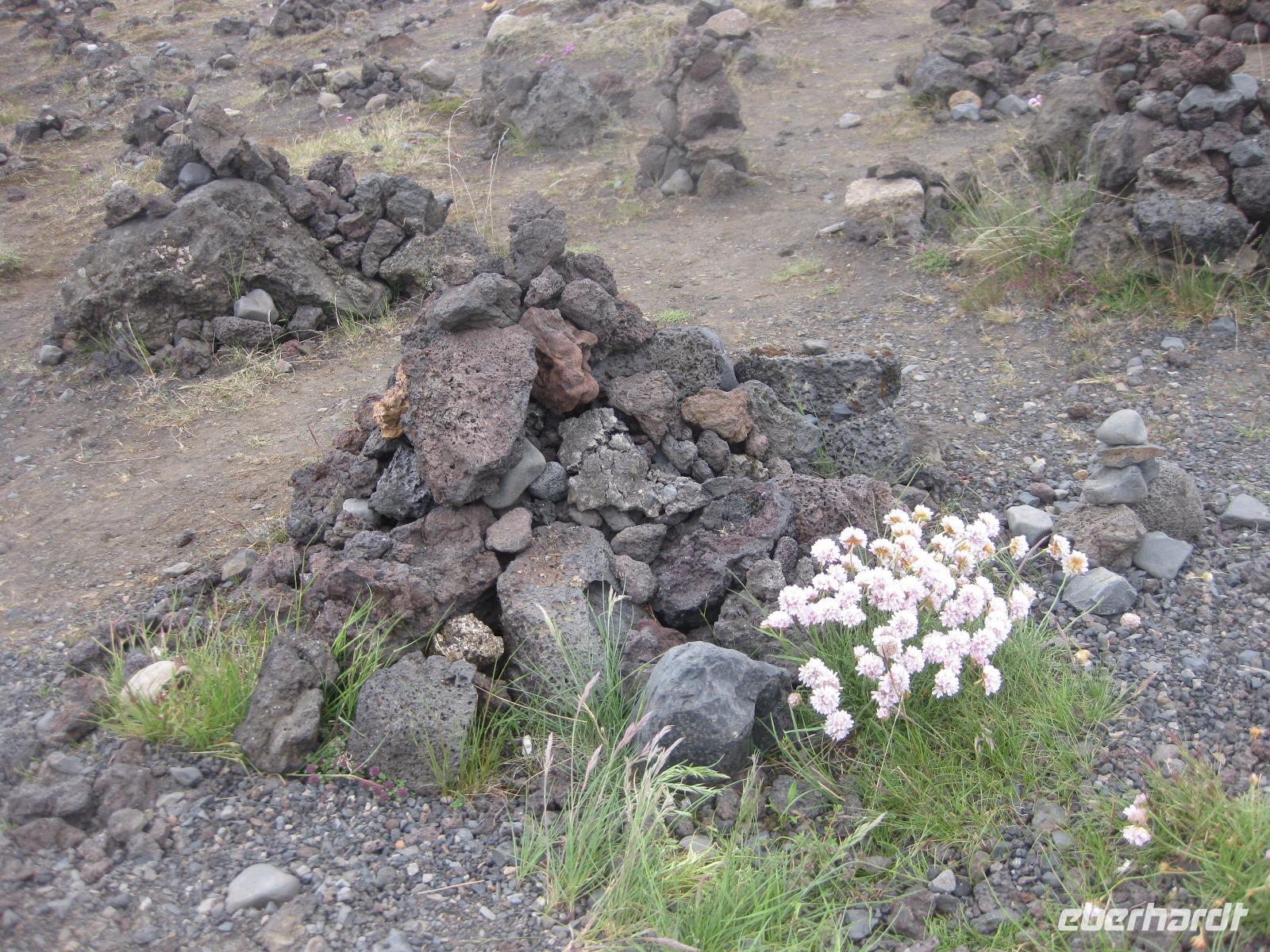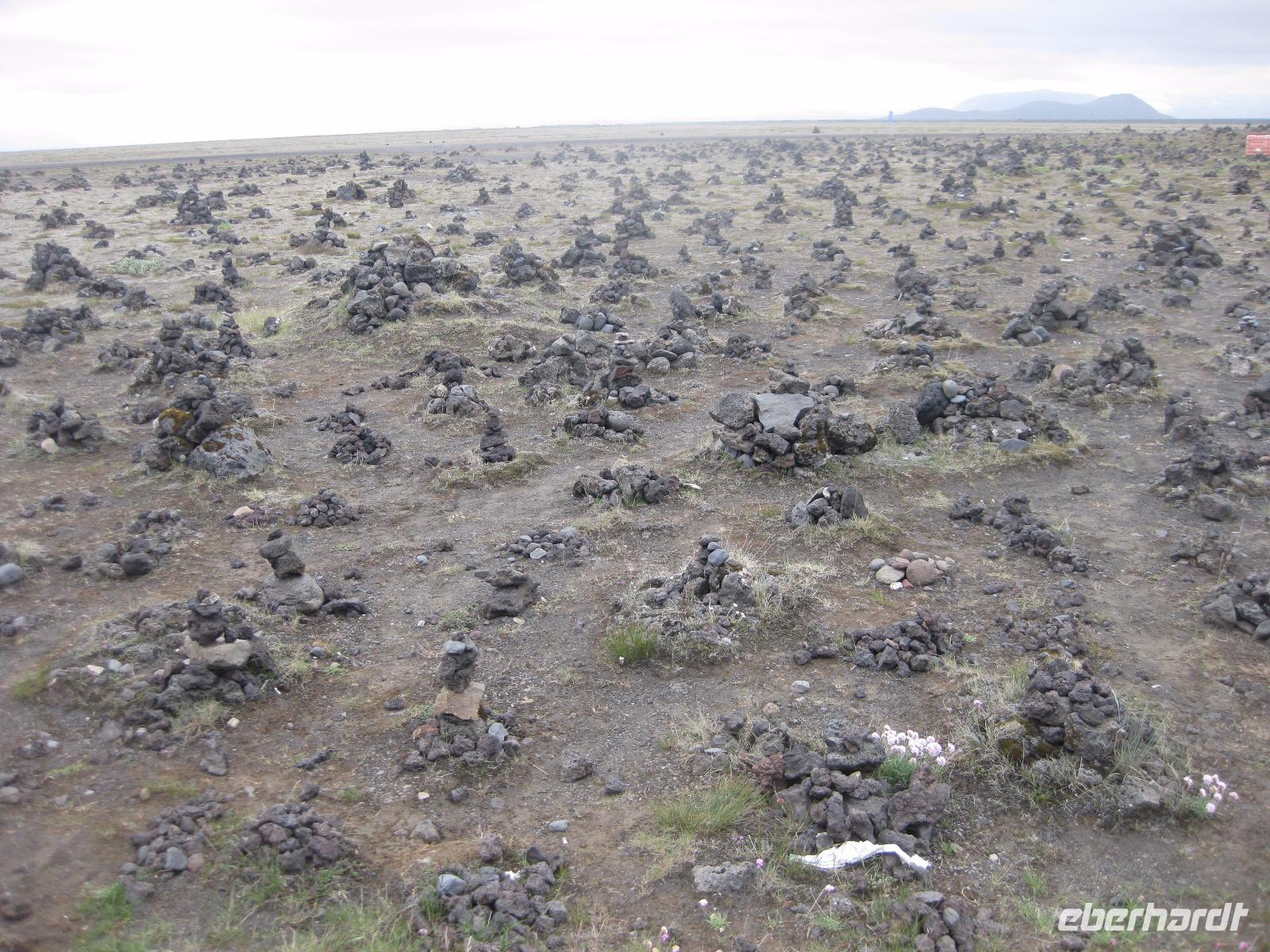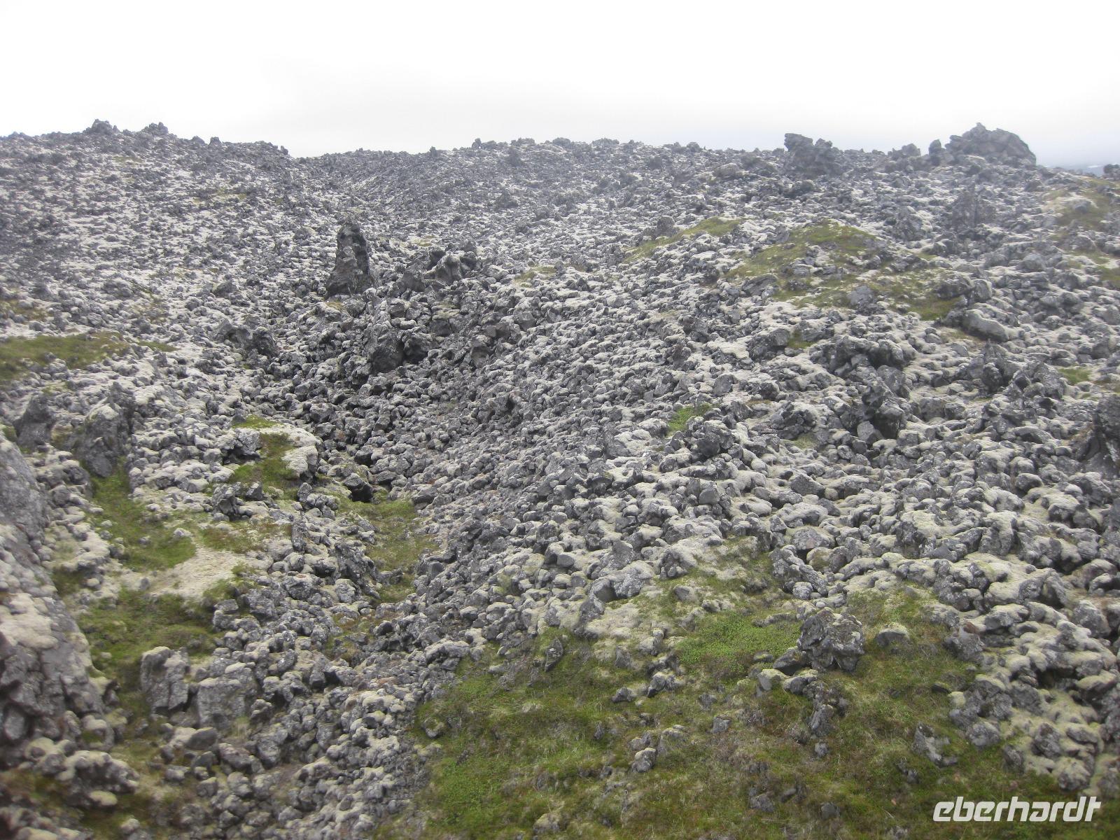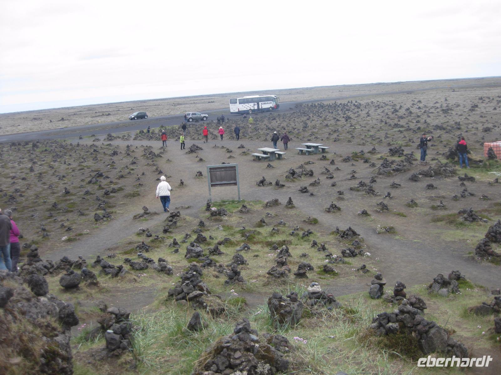 In Skutustadir halten wir. Hier sind die Pseudokrater am besten zugänglich und zu überblicken. Wir steigen aus dem Bus und es hat aufgehört zu regnen! Die Wolken sind wieder etwas höher, so dass wir gut über das ganze Gebiet schauen können. Bevor wir in Dimmuborgir einen Rundgang machen, stoppen wir erst noch mal am Myvatn-See, um die Lavasäulen von Kalvaströnd zu bestaunen - sehr eindrucksvoll. Der Rundgang durch Dimmuborgir, die "Dunklen Burgen" entpuppt sich als ein Spaziergang durch einen Irrgarten aus Lava. Wir müssen alle gut zusammen bleiben. Und hier könnte das zu Hause der 13 Weihnachtsmänner von Island sein, berichtet uns Berglind. Gleich neben Dimmuborgir befindet sich der gleichmäßig geformte Ringwallkrater des Hverfjall. Er ist weithin sichtbar. Wir fahren nur ein kleines Stück weiter in das Solfatarengebiet Hverarönd. Vorher stoppen wir noch an einem Aussichtspunkt, wo wir einen atemberaubenden Blick über das ganze Gebiet genießen können. Hverarönd ist wieder ganz anders als das bisher Gesehene. Hier brodelt und dampfen die Schwefel-, Schlamm- und Dampfquellen. Man kommt sich vor wie in des "Teufels Küche".