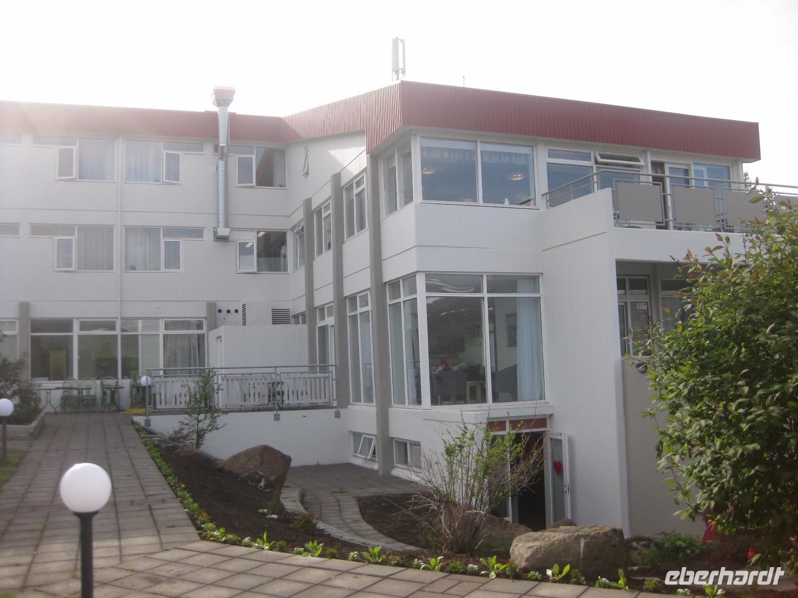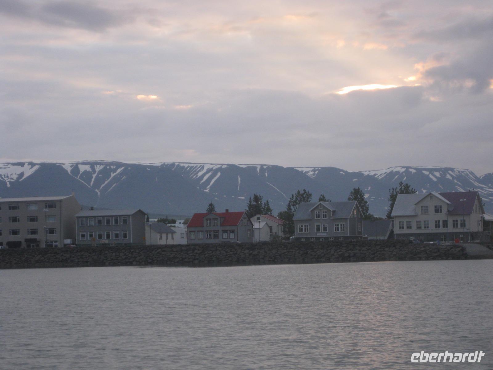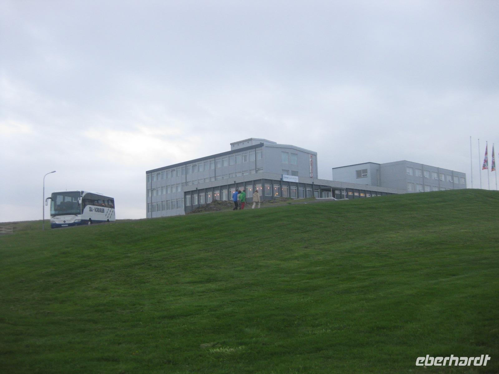 Dann setzen wir unsere Fahrt fort. Die Straße führt durch die Berge, wo die Trolle und Elfen wohnen. Berglind berichtet uns von ihnen. Dann geht es hinunter an den Eyjafjördur (Inselfjord) nach Akureyri. Unser Hotel befindet sich etwas außerhalb der Stadt. Hier bleiben wir zwei Nächte. Zum Abendessen gibt es heute den lang ersehnten Fisch und für die Nichtfischesser Hähnchenbrust.