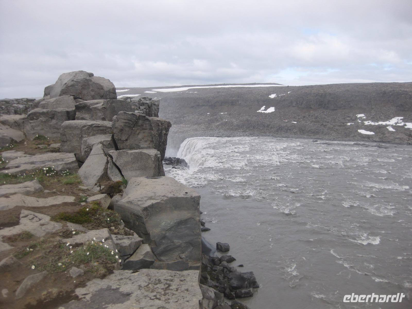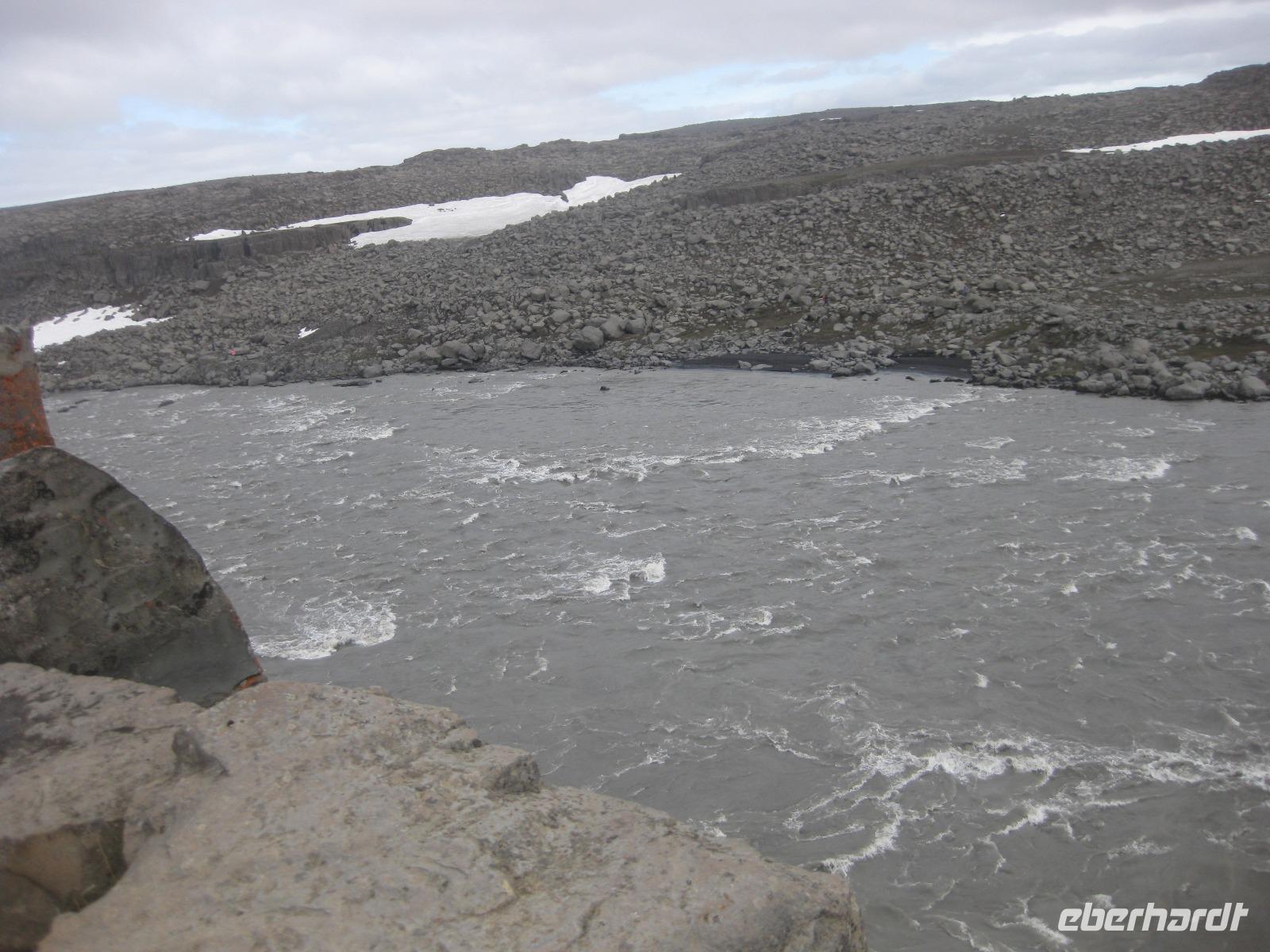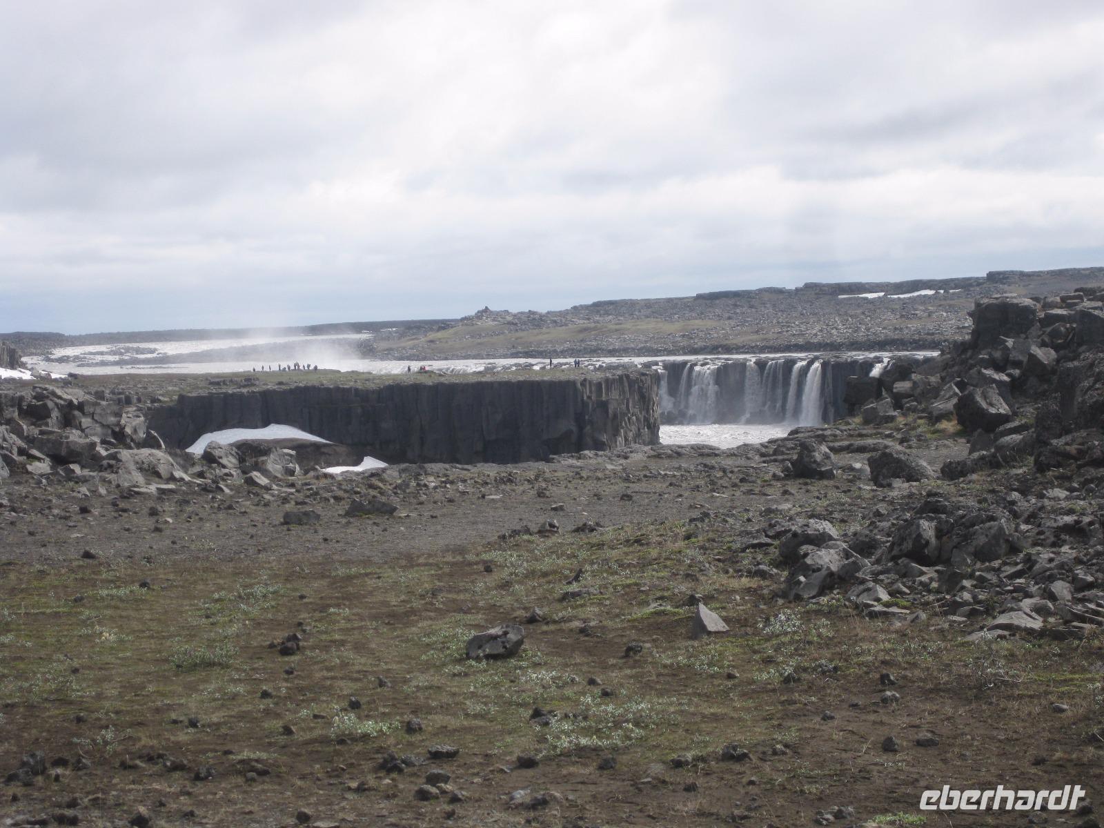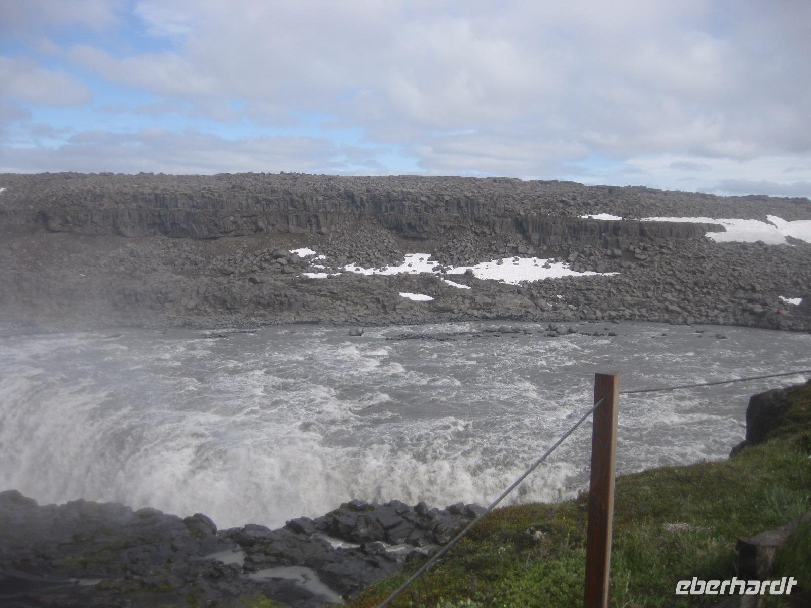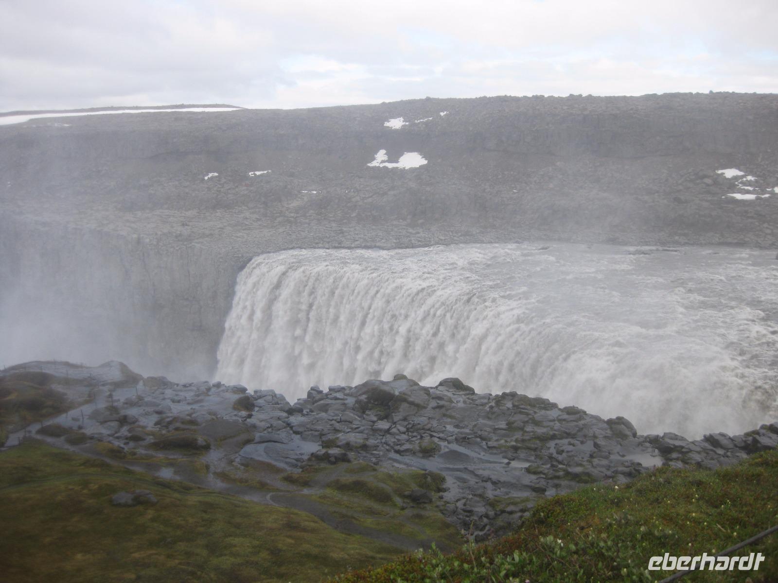 Und schon geht es weiter. Unser nächstes Ziel ist der "Dettifoss", einer der mächtigsten Wasserfälle Europas. Die Fahrt dorthin geht durch die Steinwüste am Fluß Jökulsa entlang. Am "Dettifoss" stürzt dieser mit einer riesigen Gischtwolke in die Tiefe, Fallhöhe 44 Meter. Man kann an den oberen Rand des Wasserfalls heran treten, um das Naturschauspiel zu sehen, muss aber eine kräftige Dusche in Kauf nehmen.