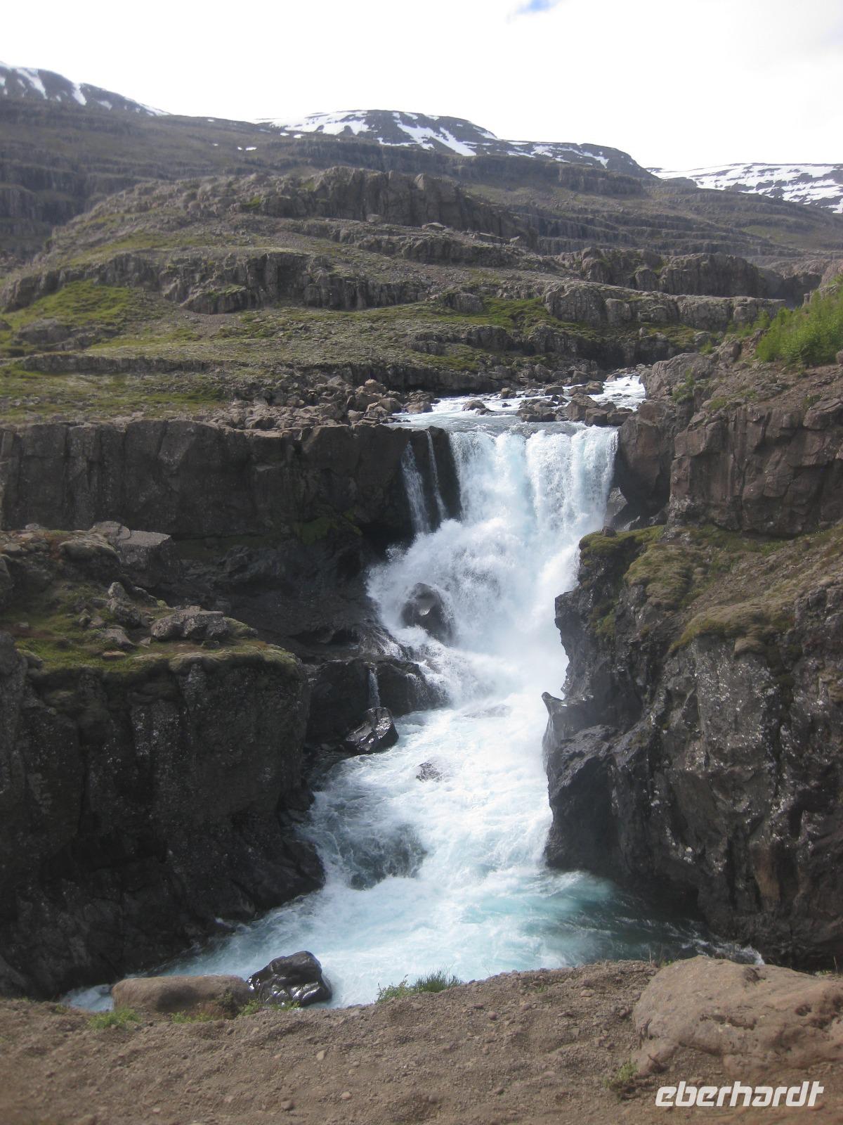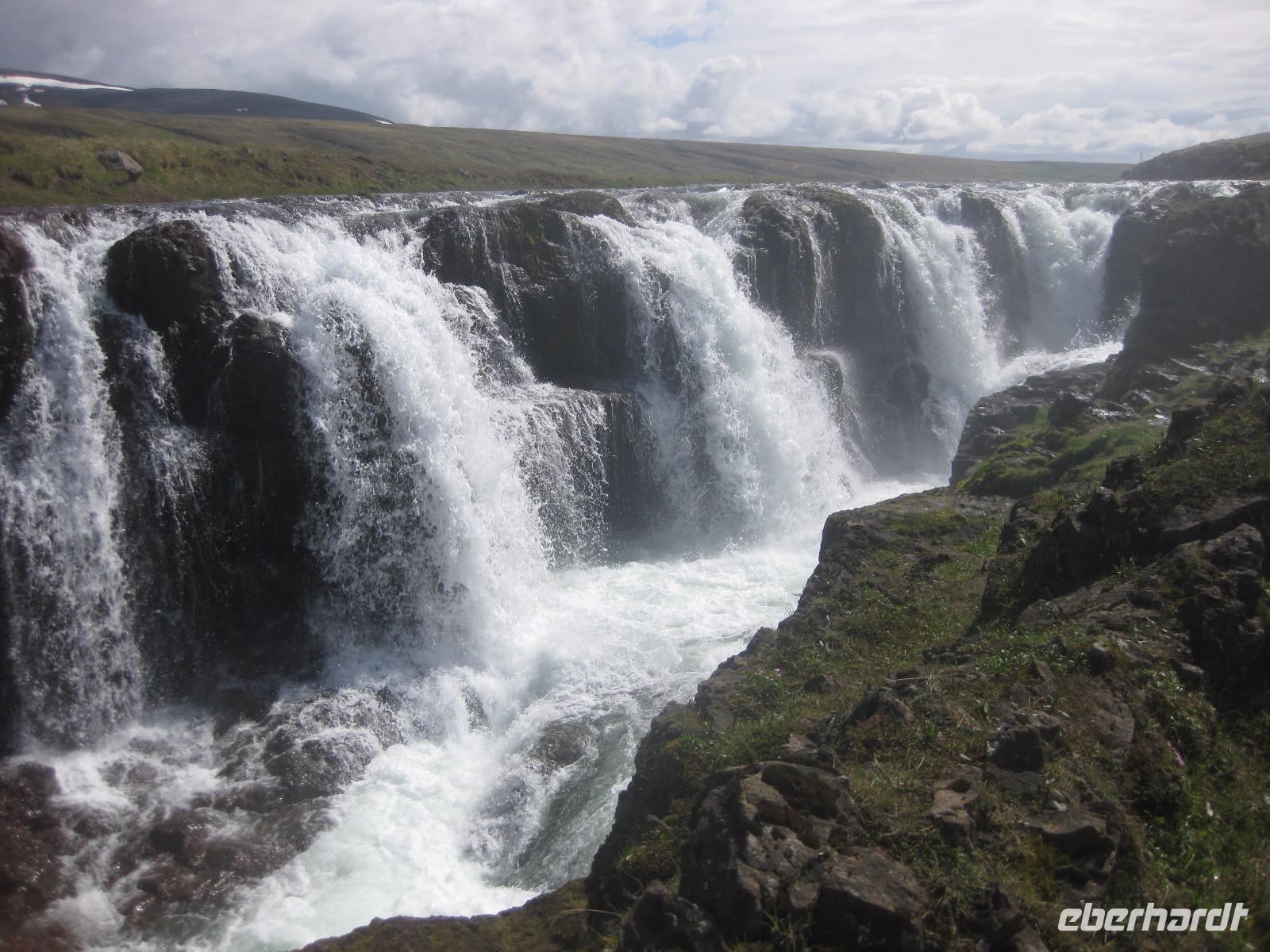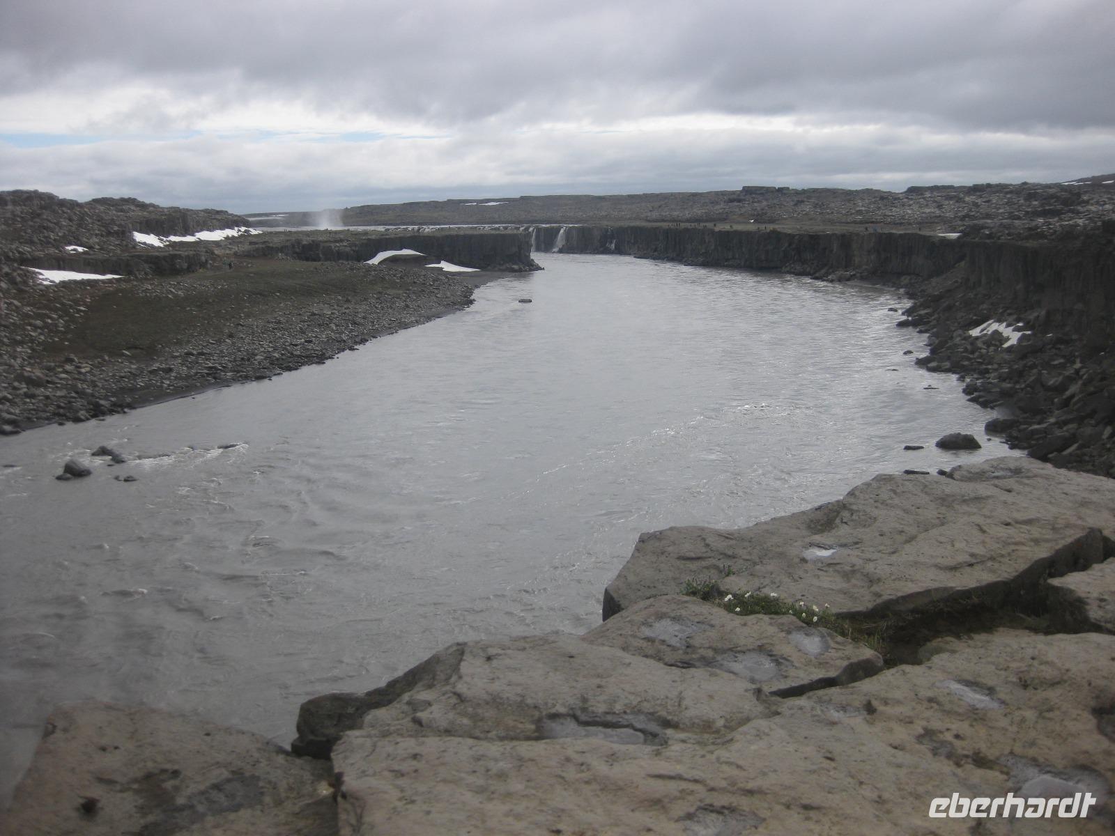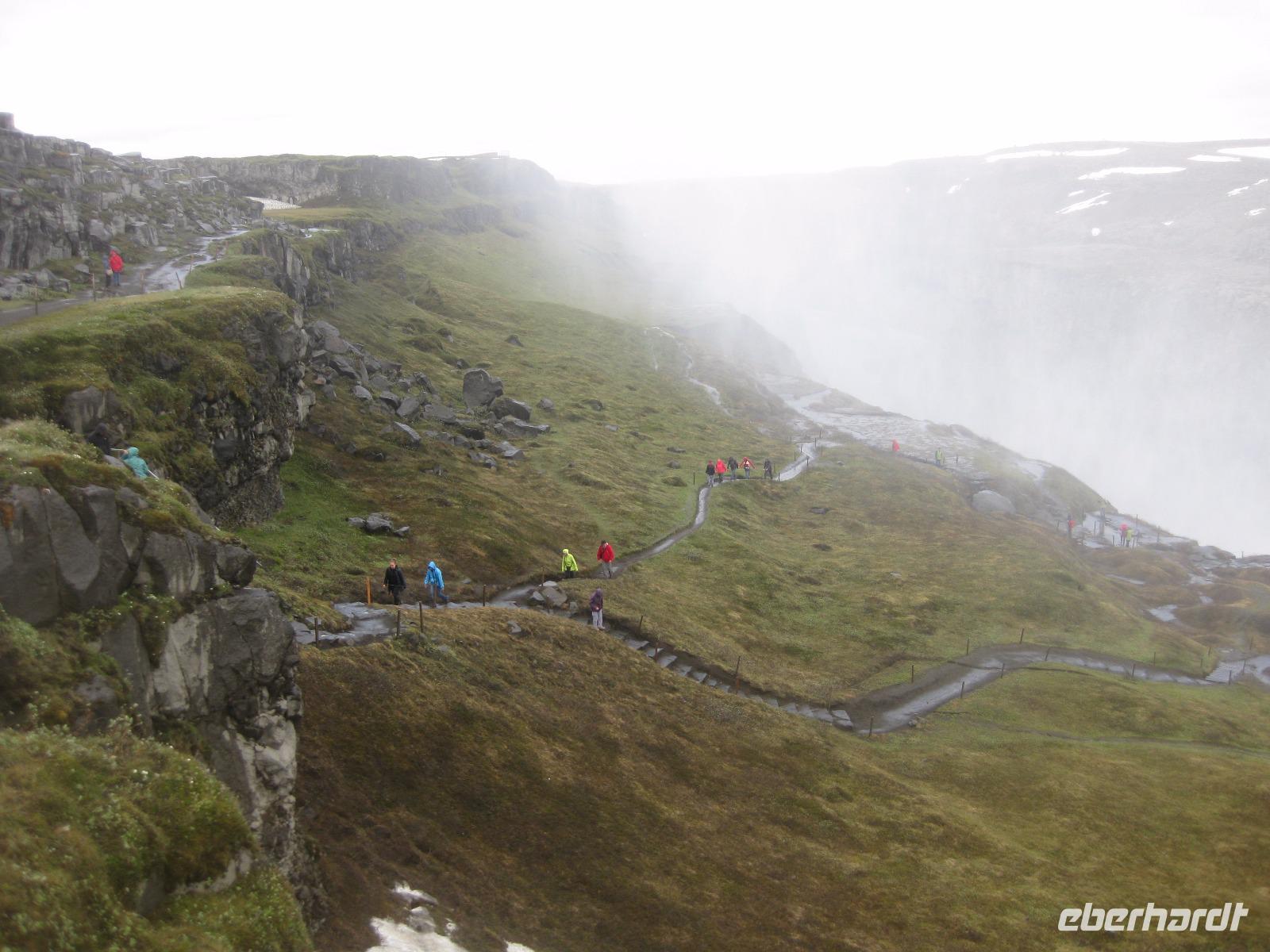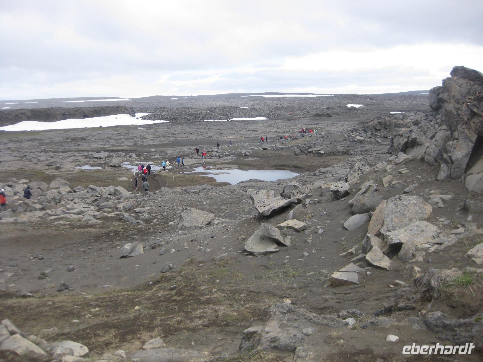 Und schon geht es weiter. Unser nächstes Ziel ist der "Dettifoss", einer der mächtigsten Wasserfälle Europas. Die Fahrt dorthin geht durch die Steinwüste am Fluß Jökulsa entlang. Am "Dettifoss" stürzt dieser mit einer riesigen Gischtwolke in die Tiefe, Fallhöhe 44 Meter. Man kann an den oberen Rand des Wasserfalls heran treten, um das Naturschauspiel zu sehen, muss aber eine kräftige Dusche in Kauf nehmen.