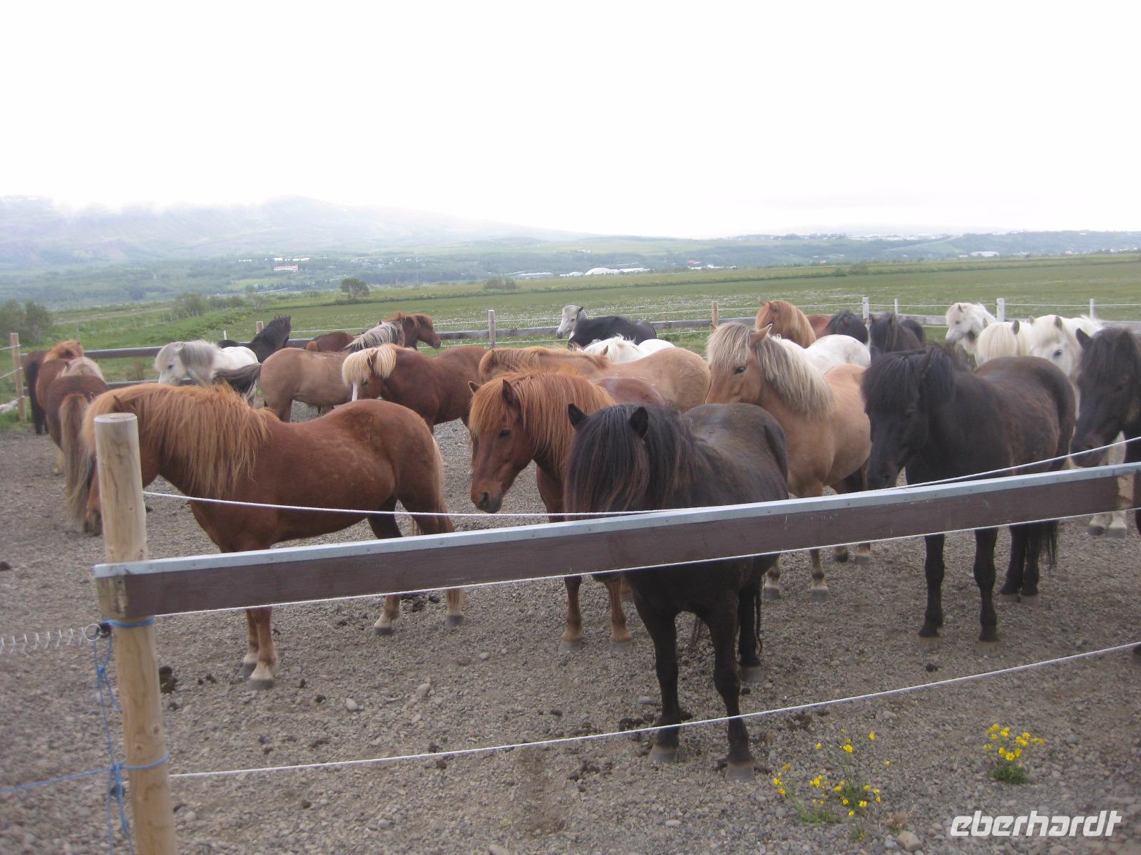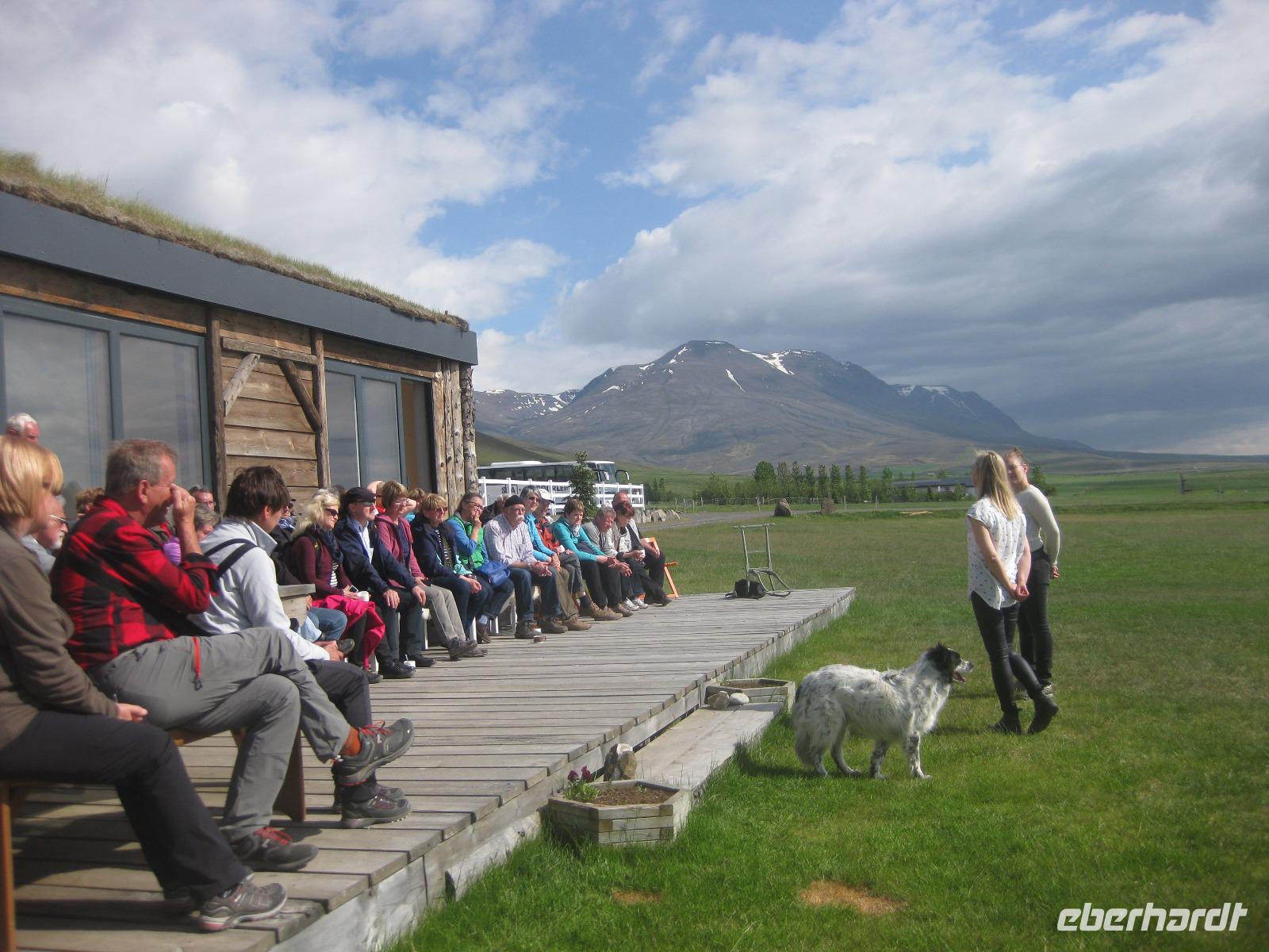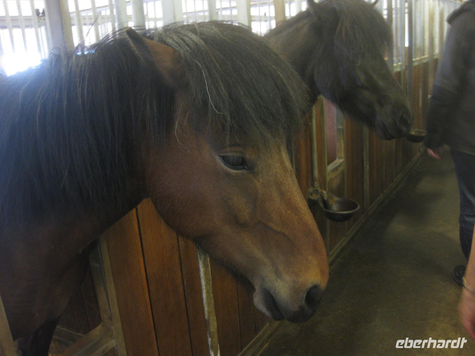 Am Nachmittag erwartet uns ein besonderes Erlebnis, der Besuch des Pferdehofes "Flugumyri" unweit von Akureyri. Das ist ein Familienbetrieb. Hier werden Islandpferde gezüchtet und ausgebildet. Wir dürfen die Pferde in ihren Ställen besuchen und wir bekommen eine extra Vorführung, auch die fünfte Gangart, den Tjöld. Und wir erfahren viel Interessantes über die Pferde.