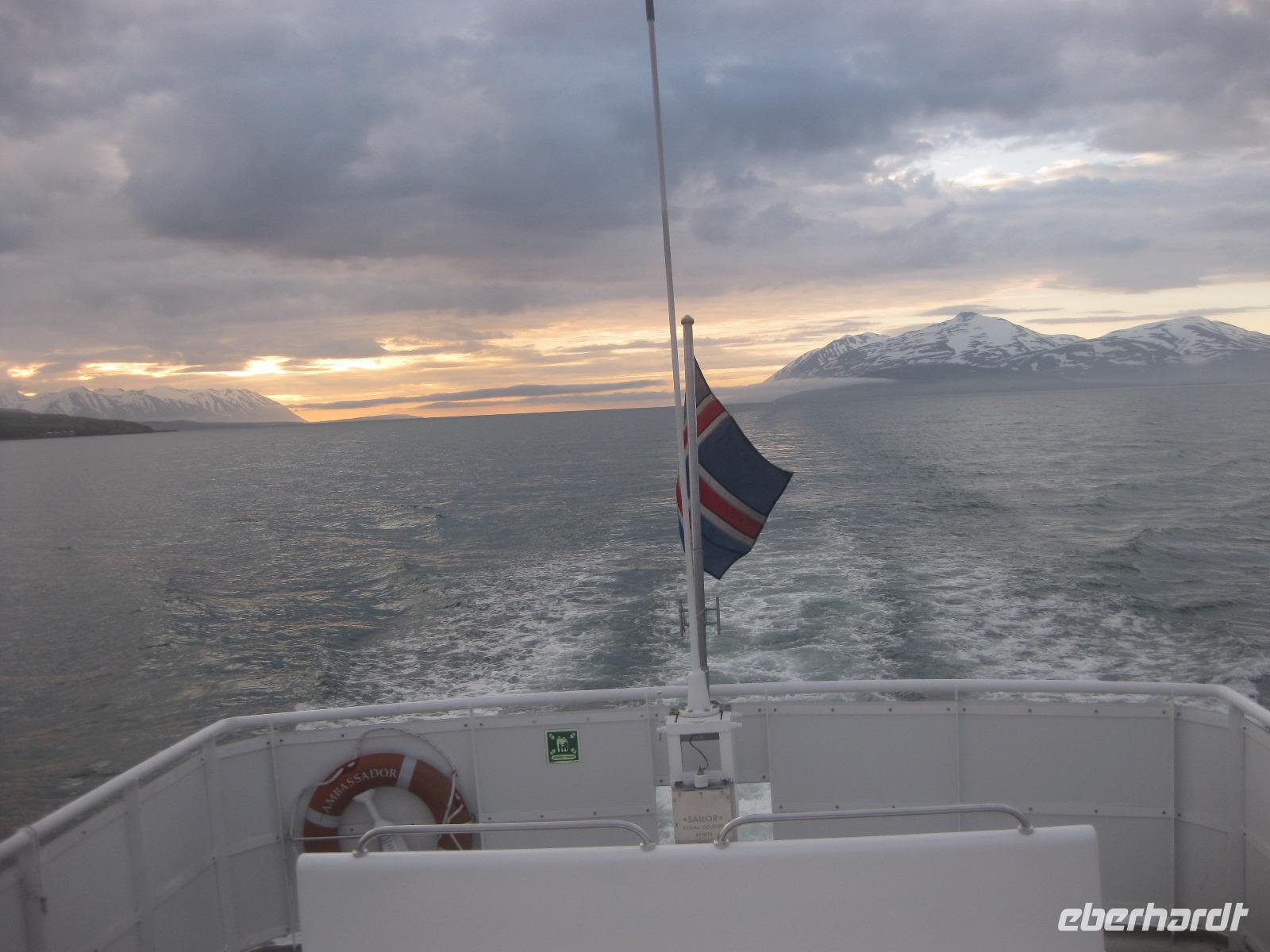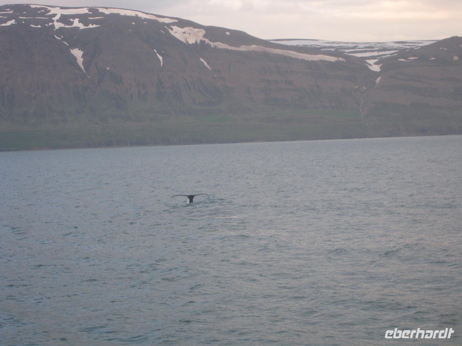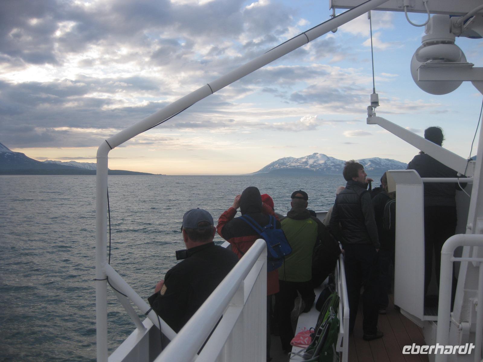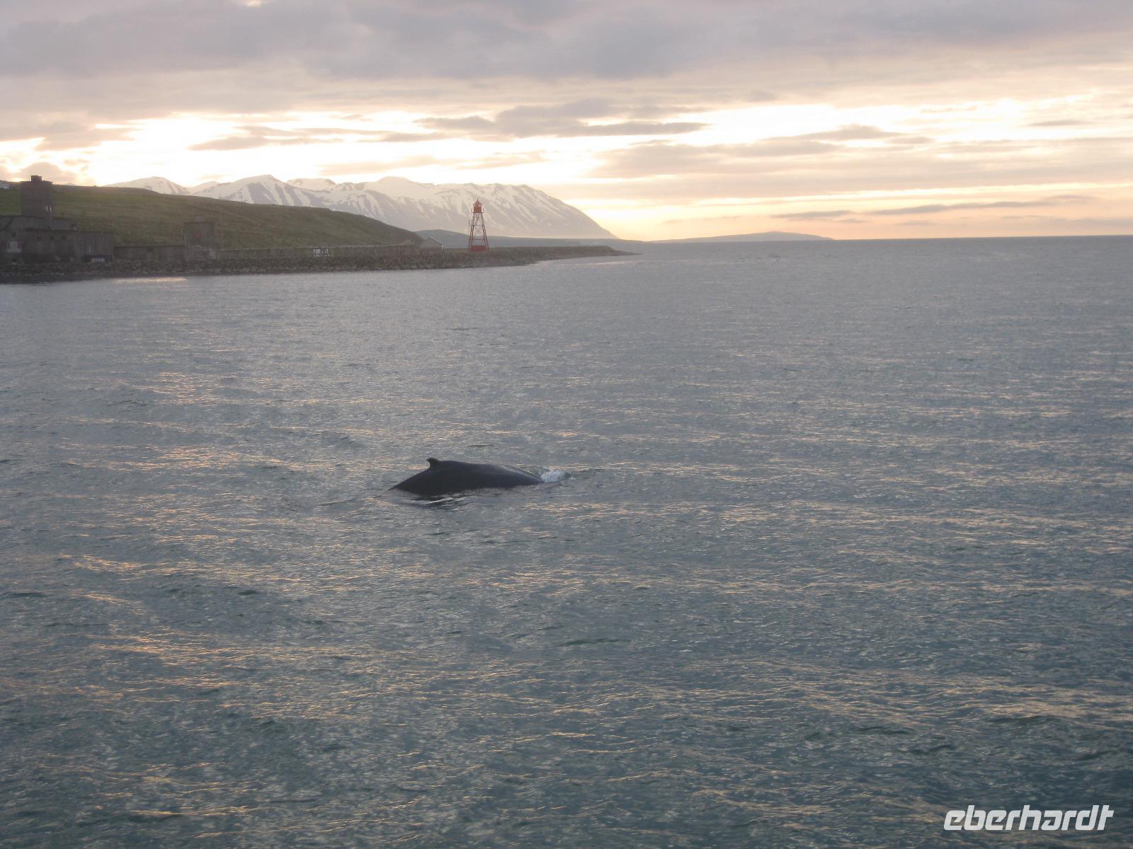 Nach dem Abendessen begeben sich 12 Gäste mit mir zur Walbeobachtung. Wir werden vom Hotel abgeholt und zum Hafen gebracht. Dann geht es per Schiff im Fjord entlang. Und noch im Fjord zeigt sich der erste Wal. Wir halten ein und beobachten ihn. 22.30 Uhr fahren wir wieder zurück und sind gegen 23.00 Uhr wieder im Hotel. Ein schöner erlebnisreicher Tag geht zu Ende.