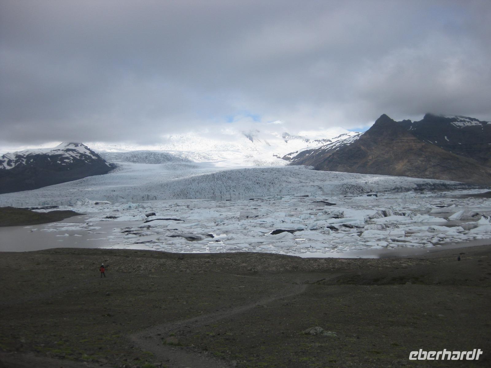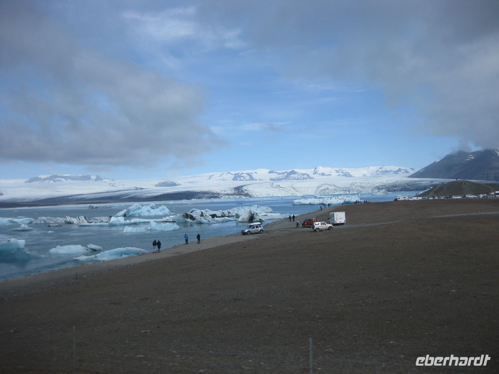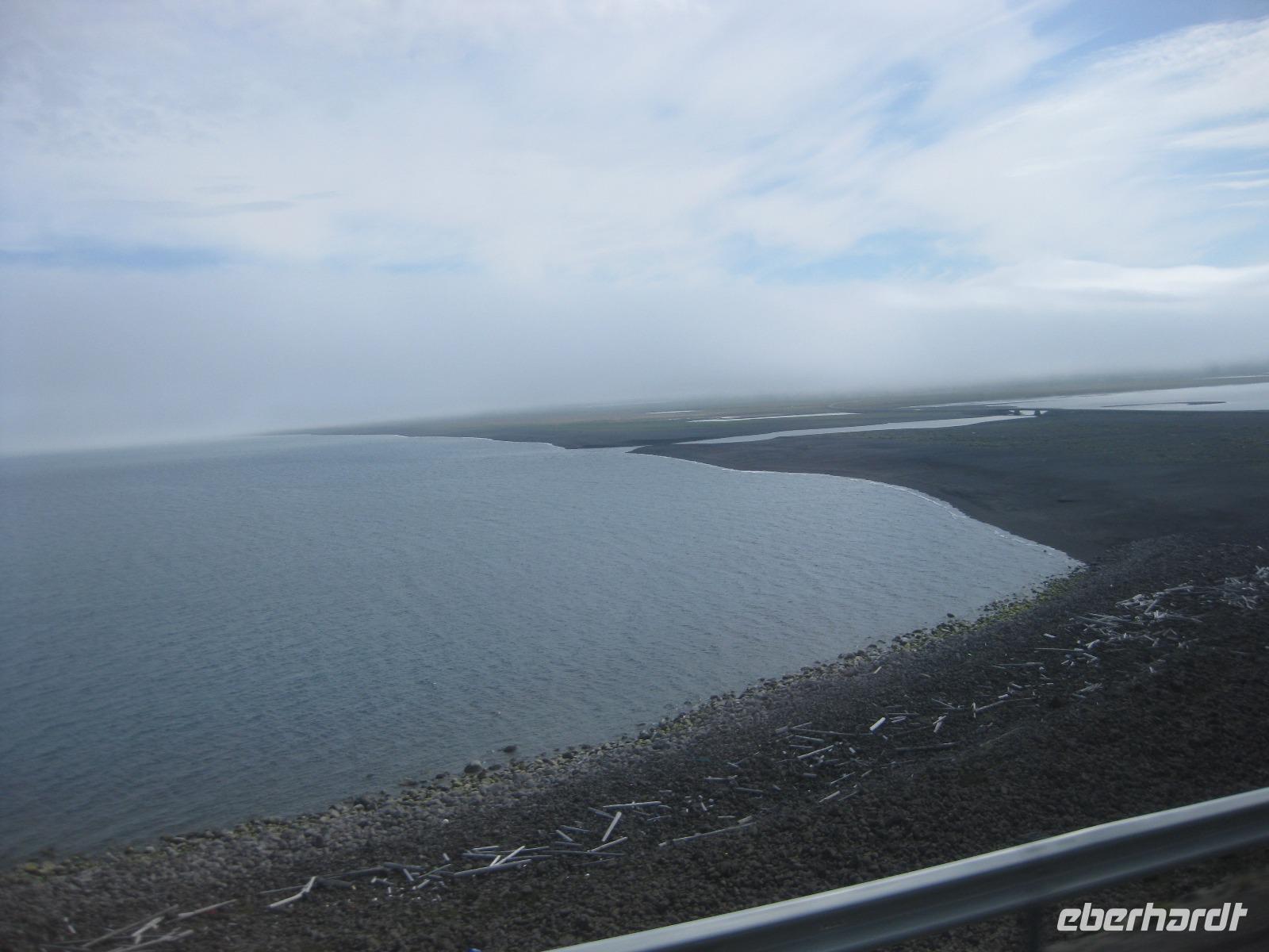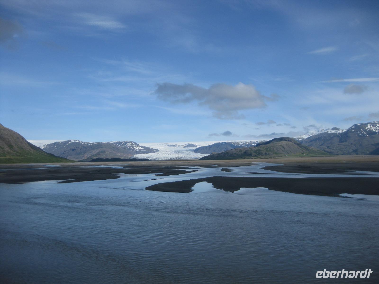 Es ist wieder bestes Wetter, Sonnenschein und strahlend blauer Himmel - gerade richtig. In der Ferne zeigen sich die Gletscherzungen des Vatnajökull. Sie reichen fast bis an's Meer hinunter - faszinierend.