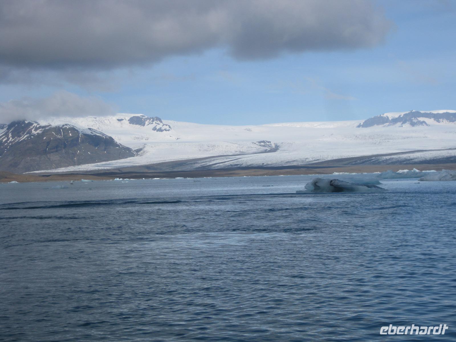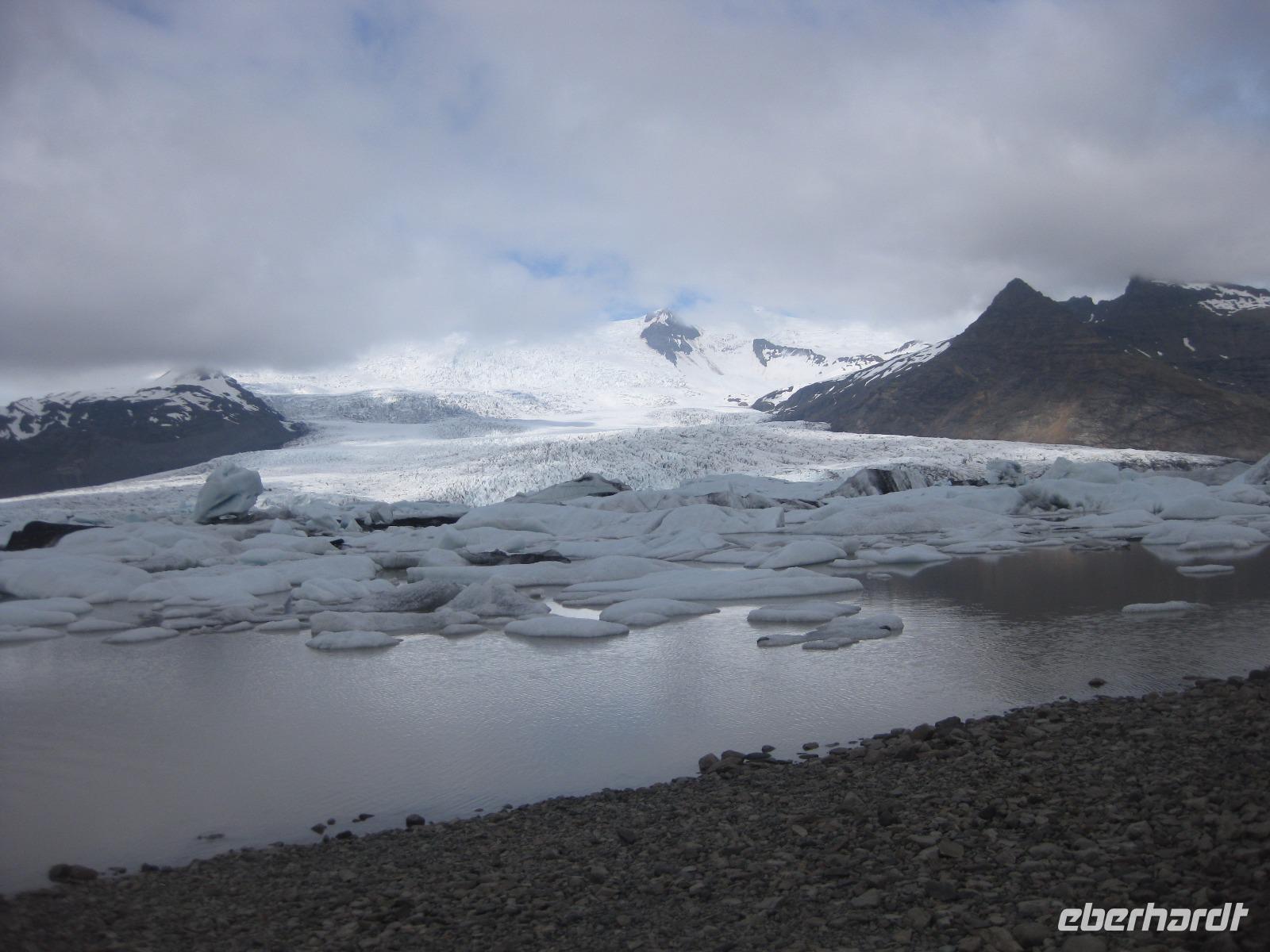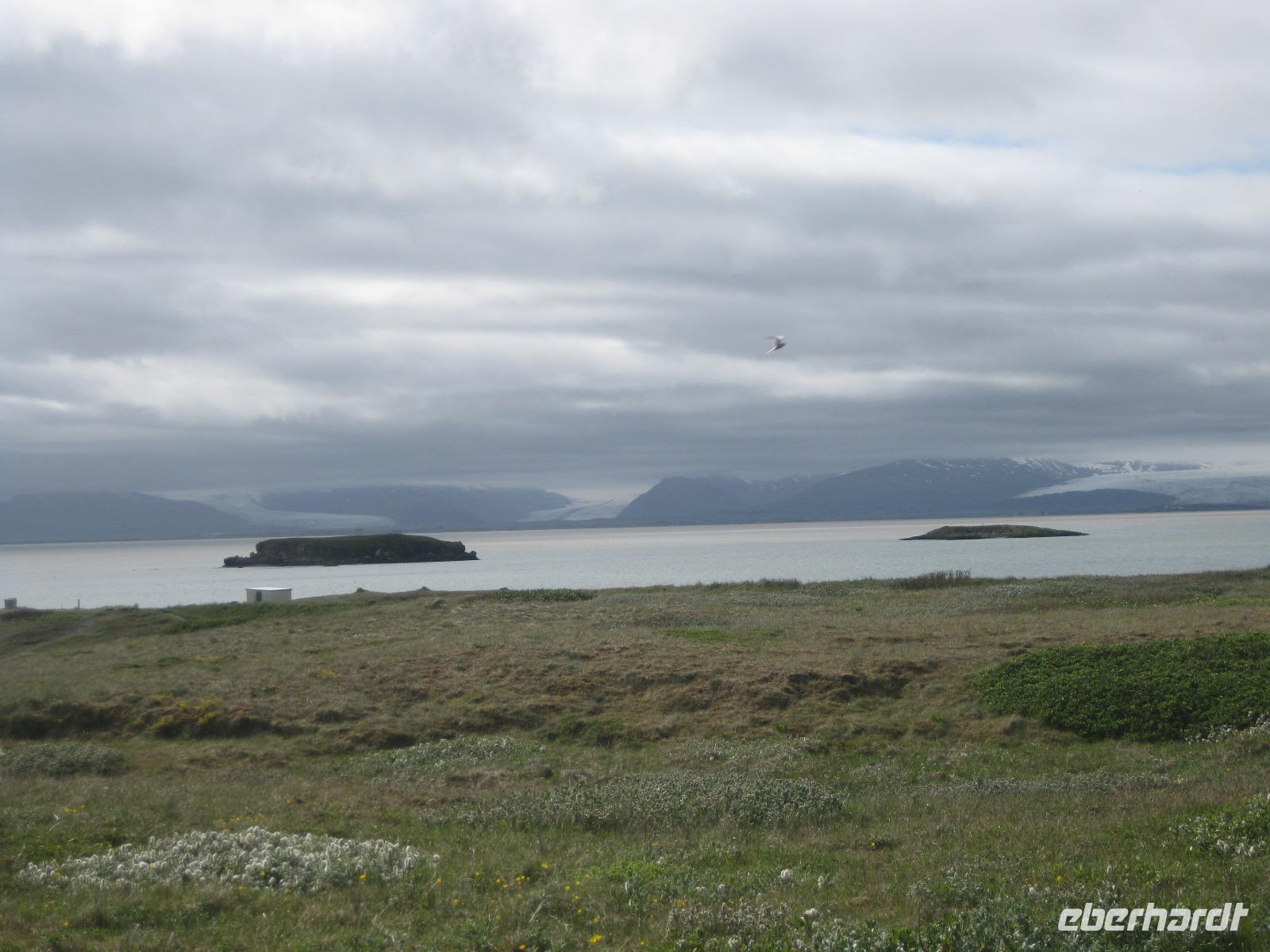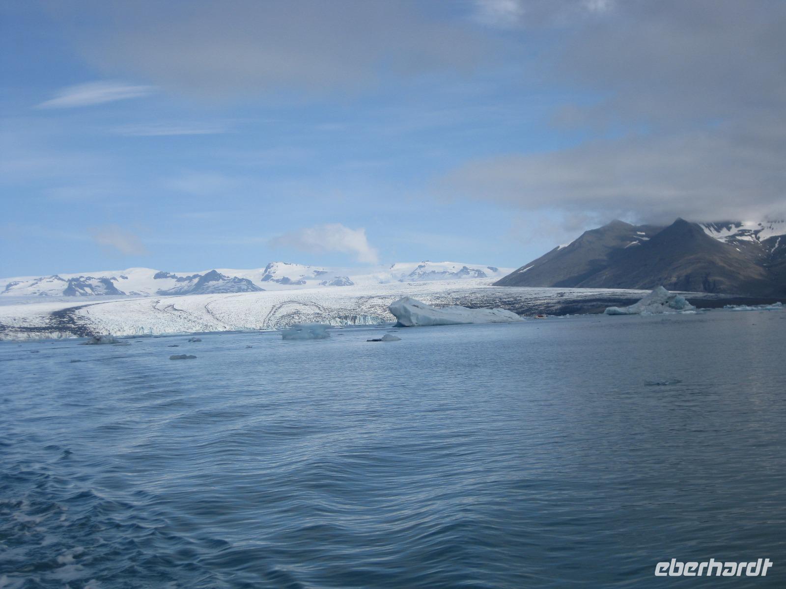 Es ist wieder bestes Wetter, Sonnenschein und strahlend blauer Himmel - gerade richtig. In der Ferne zeigen sich die Gletscherzungen des Vatnajökull. Sie reichen fast bis an's Meer hinunter - faszinierend.