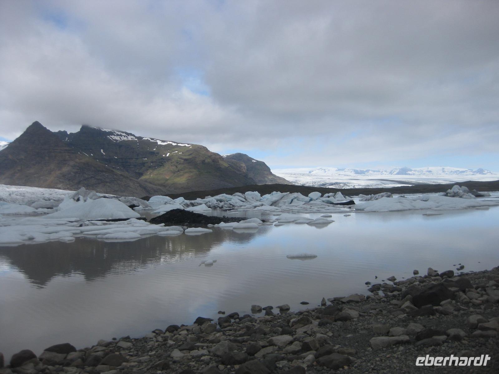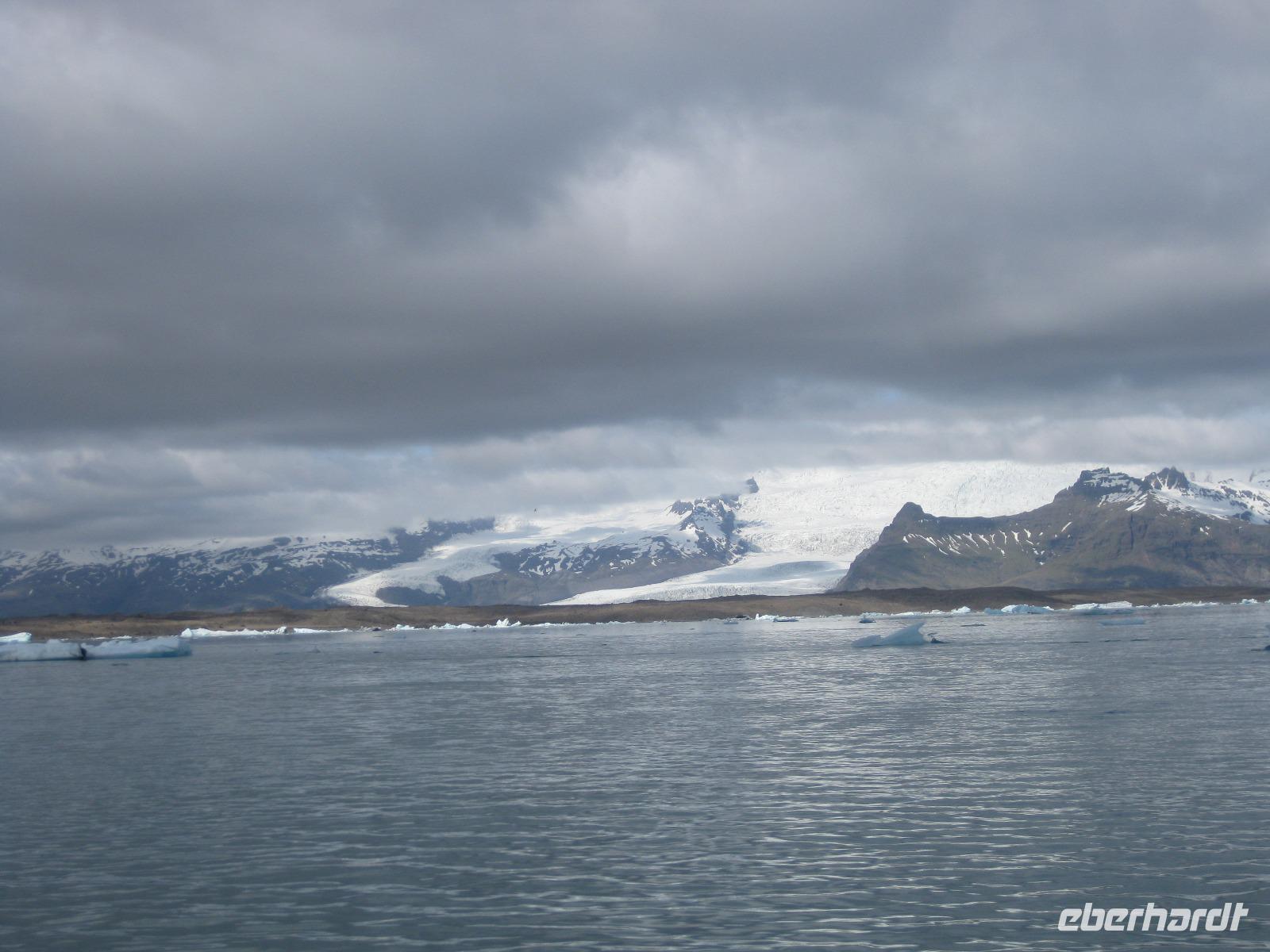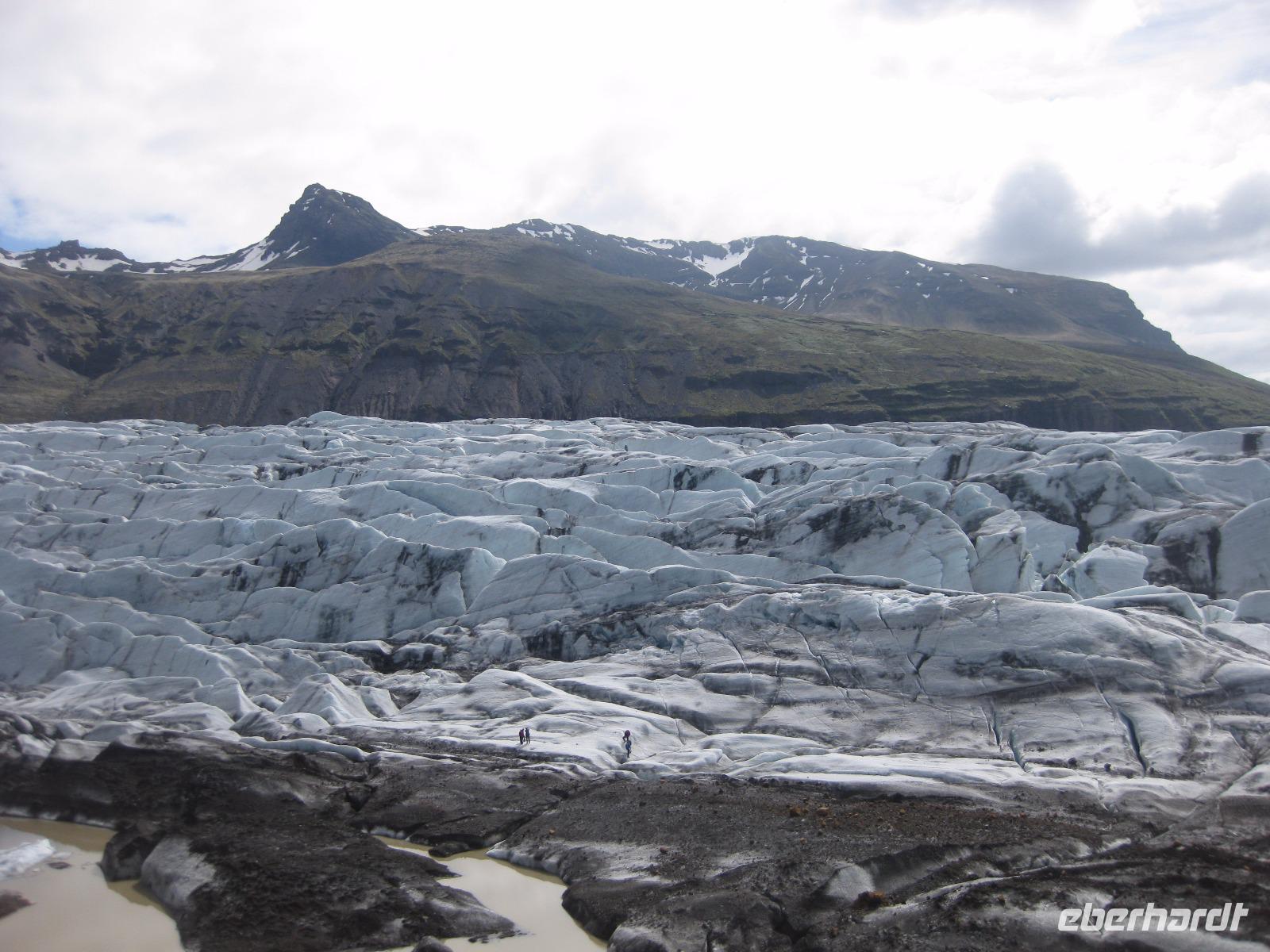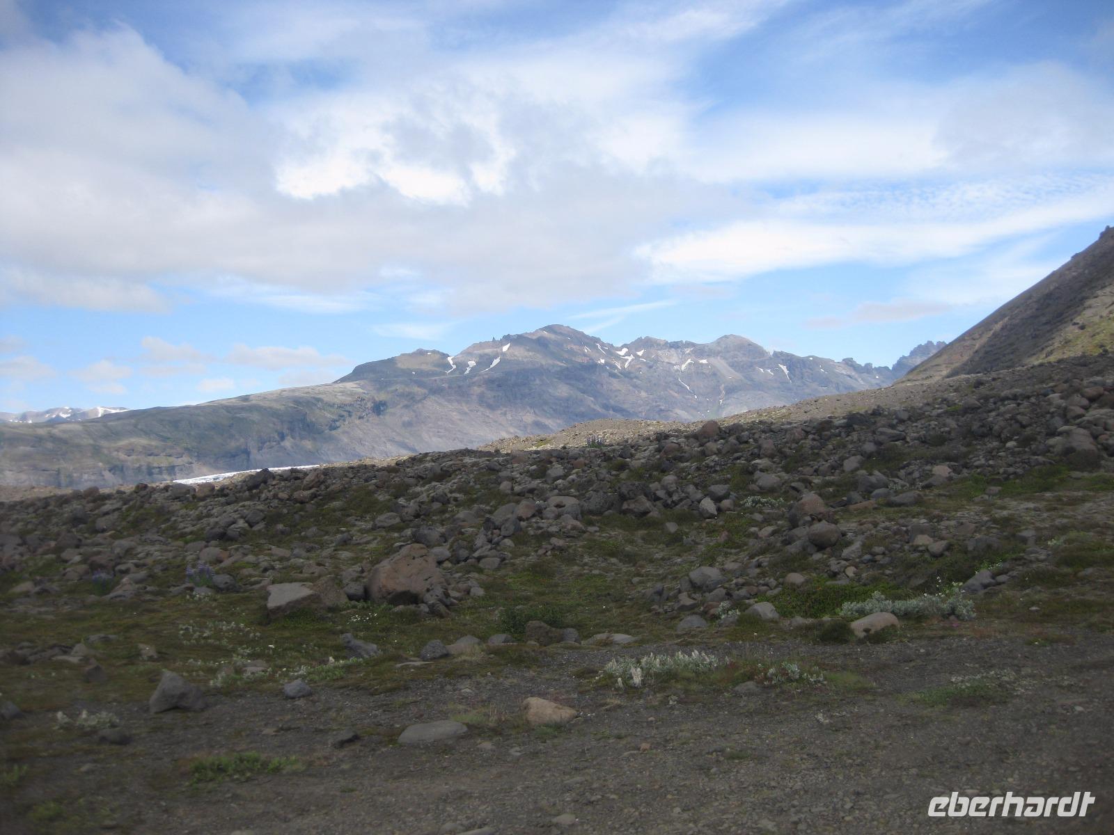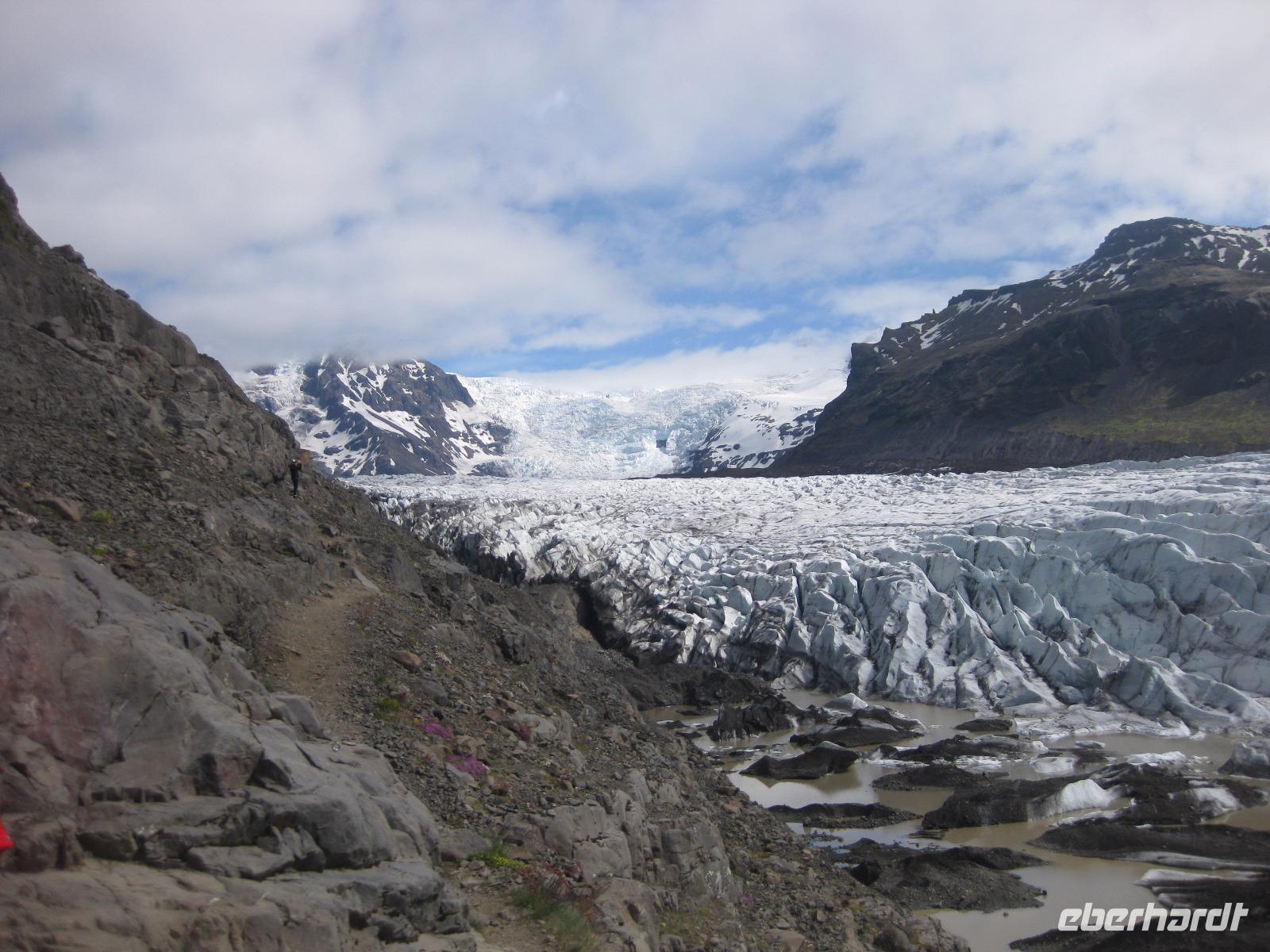 Es ist wieder bestes Wetter, Sonnenschein und strahlend blauer Himmel - gerade richtig. In der Ferne zeigen sich die Gletscherzungen des Vatnajökull. Sie reichen fast bis an's Meer hinunter - faszinierend.