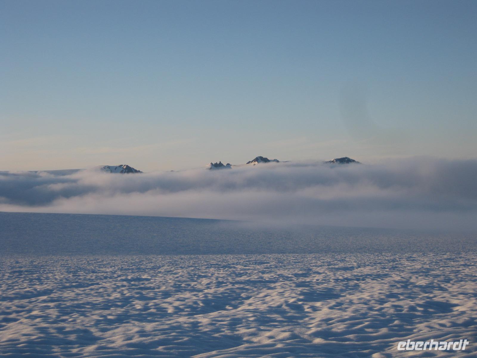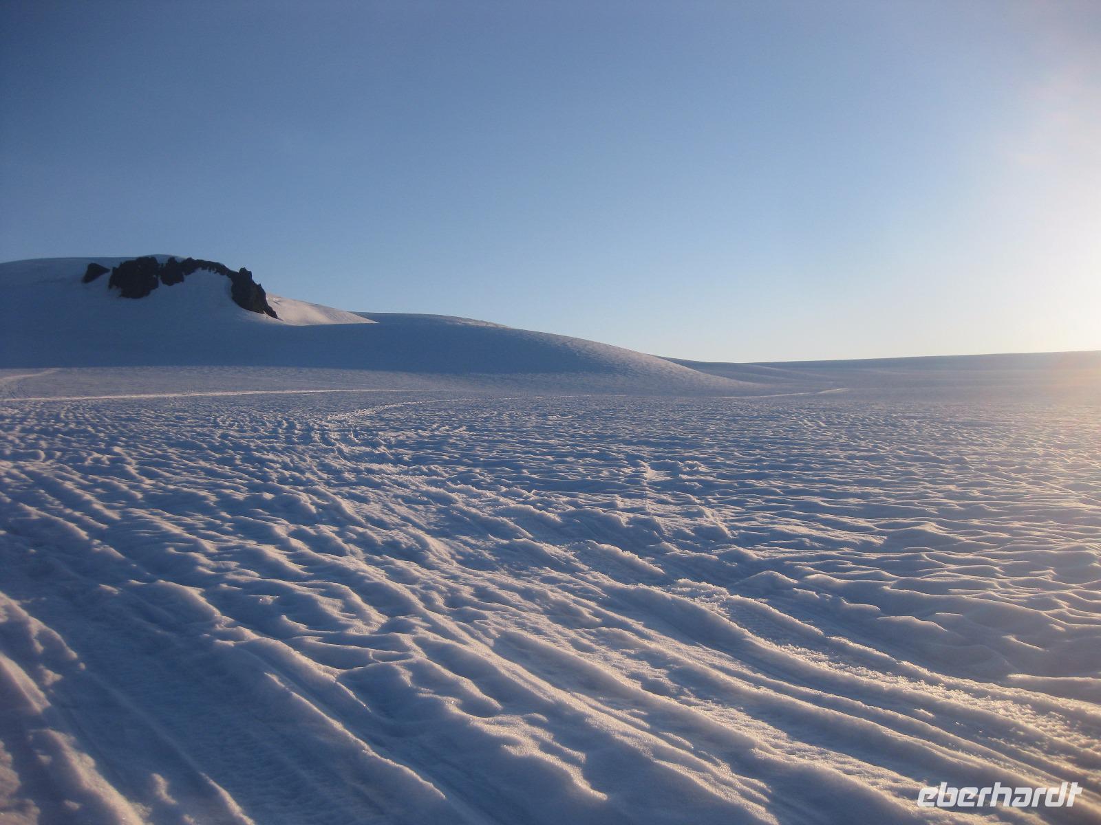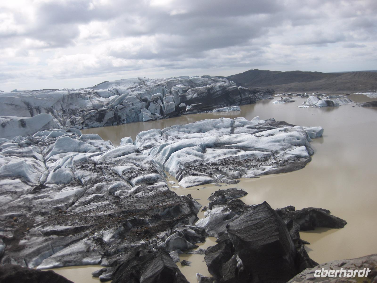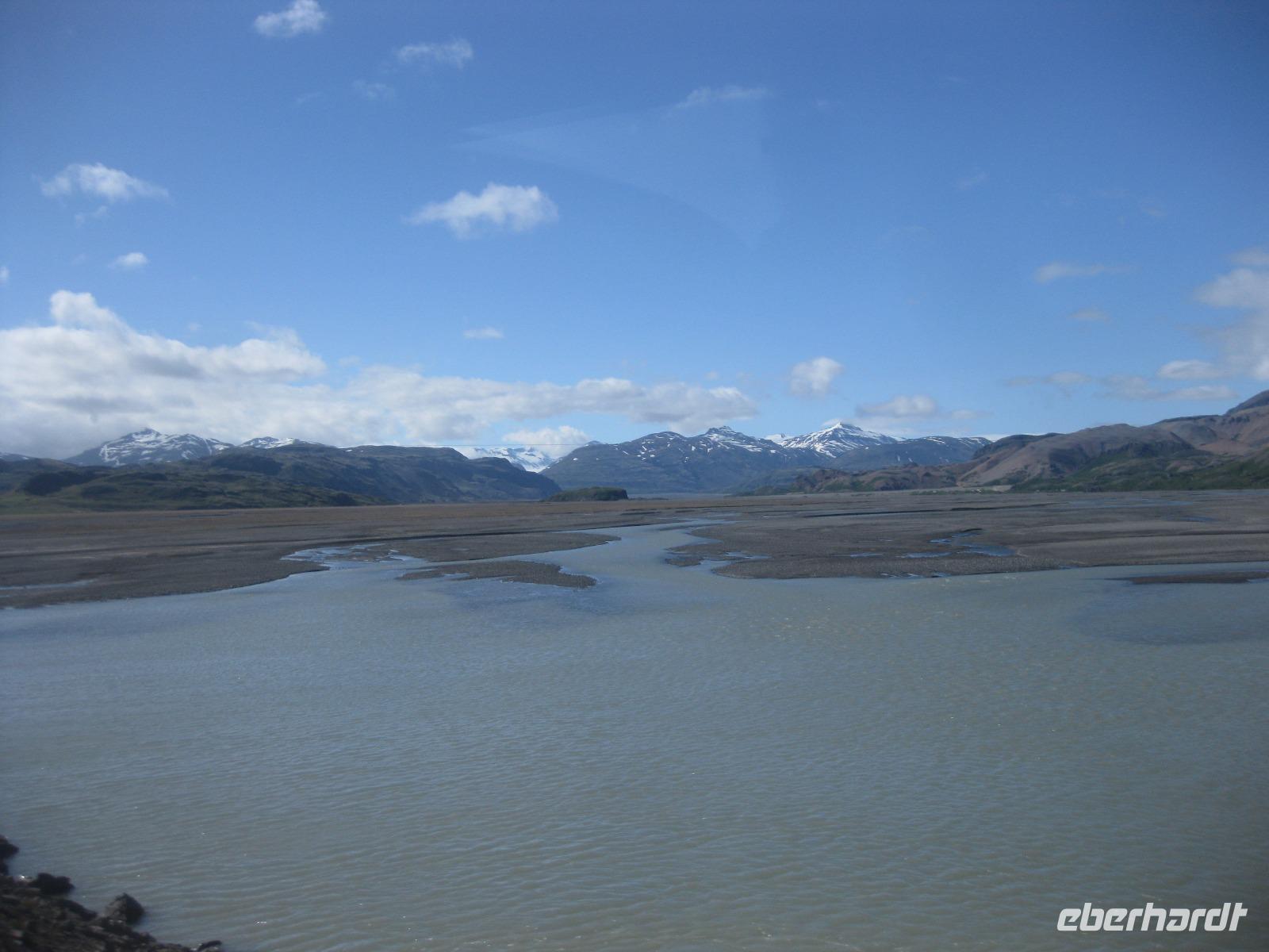 Es ist wieder bestes Wetter, Sonnenschein und strahlend blauer Himmel - gerade richtig. In der Ferne zeigen sich die Gletscherzungen des Vatnajökull. Sie reichen fast bis an's Meer hinunter - faszinierend.